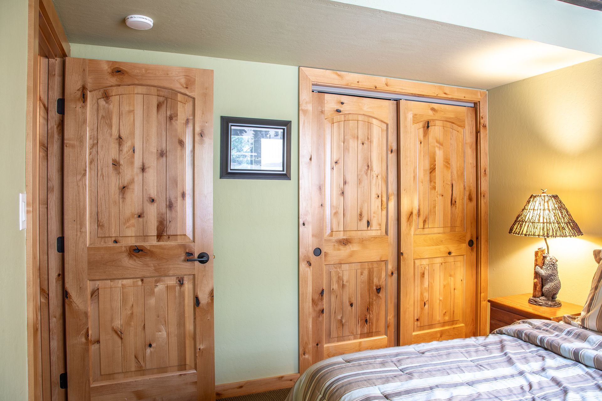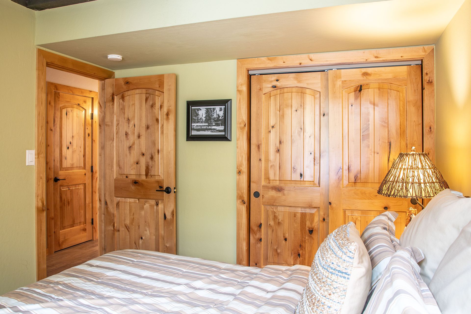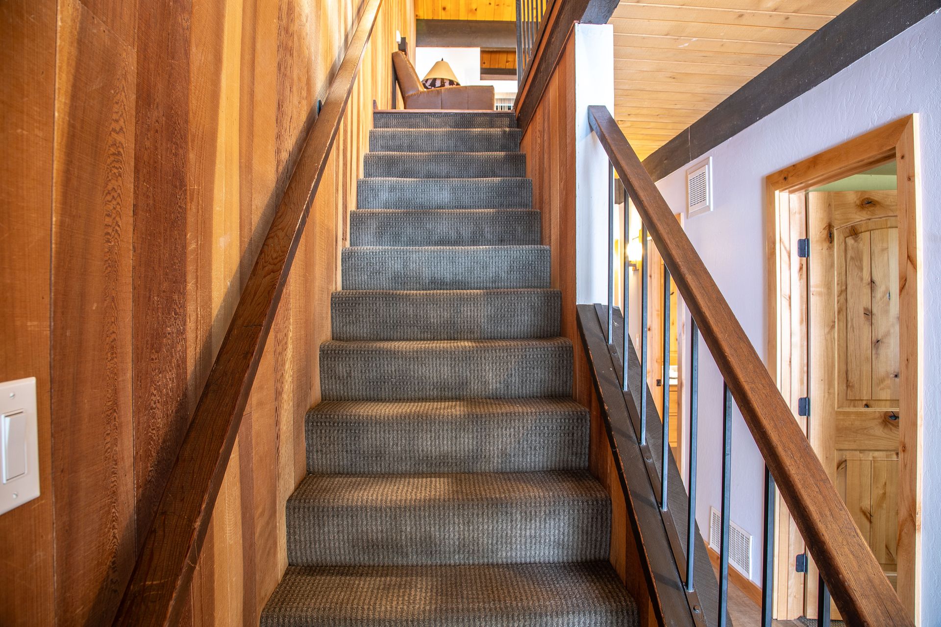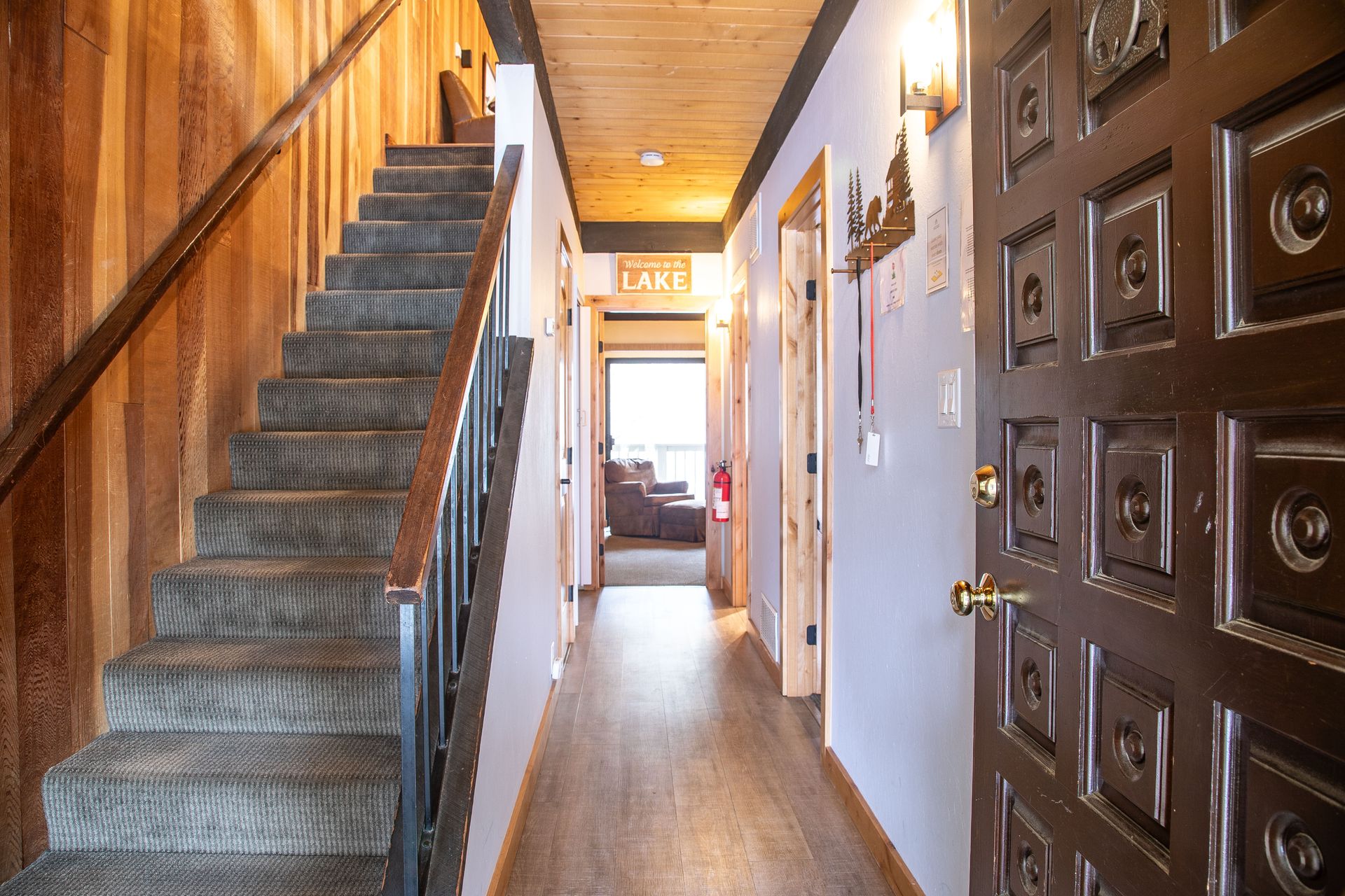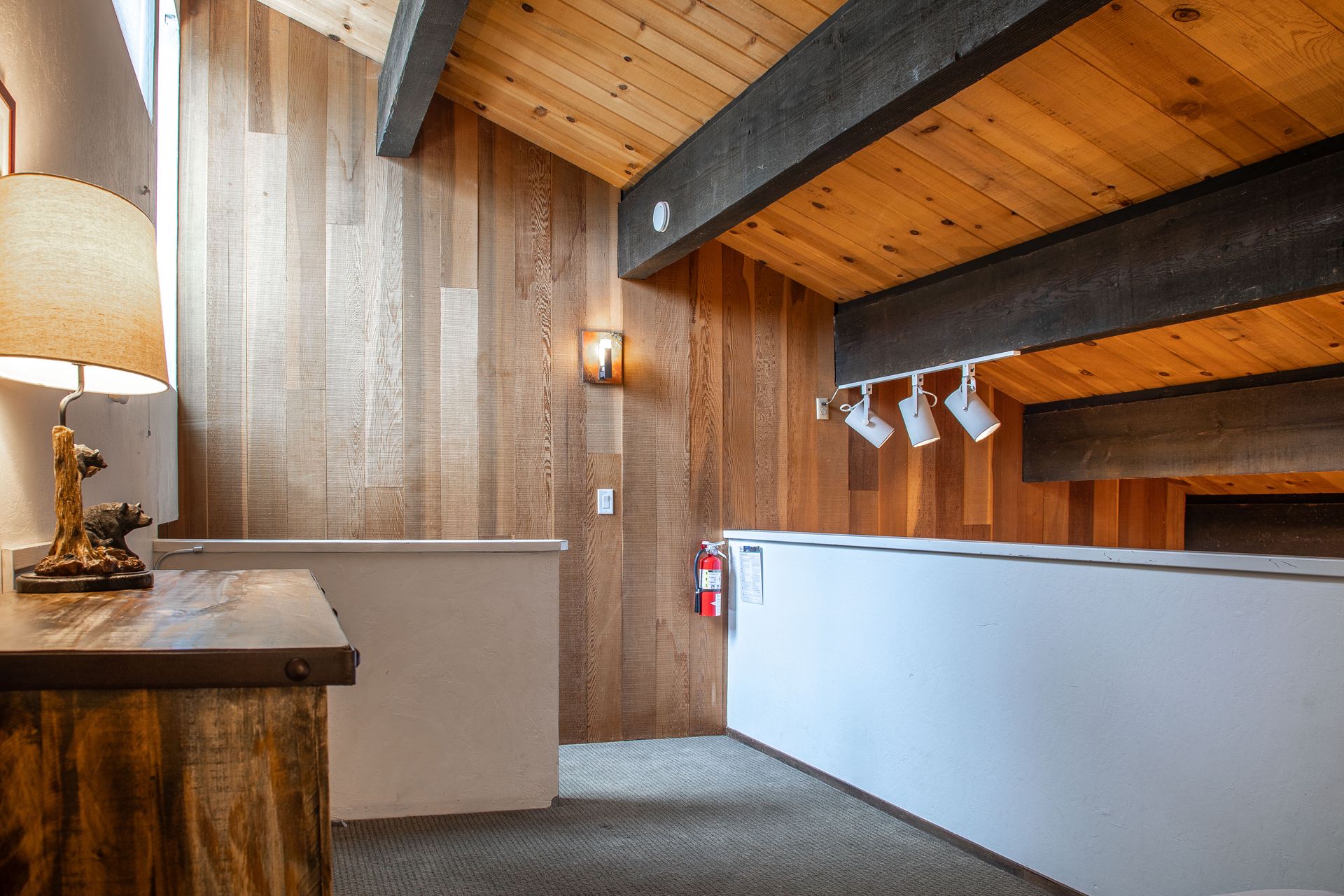 Inside, the attention to detail is evident with extensive remodeling that includes energy-efficient dual-pane Milguard windows, engineered hardwood floors, and solid-core knotty alder doors and trim. The great room is a focal point, boasting high-vaulted pine ceilings with exposed beams and a granite fireplace, creating a cozy and inviting atmosphere.