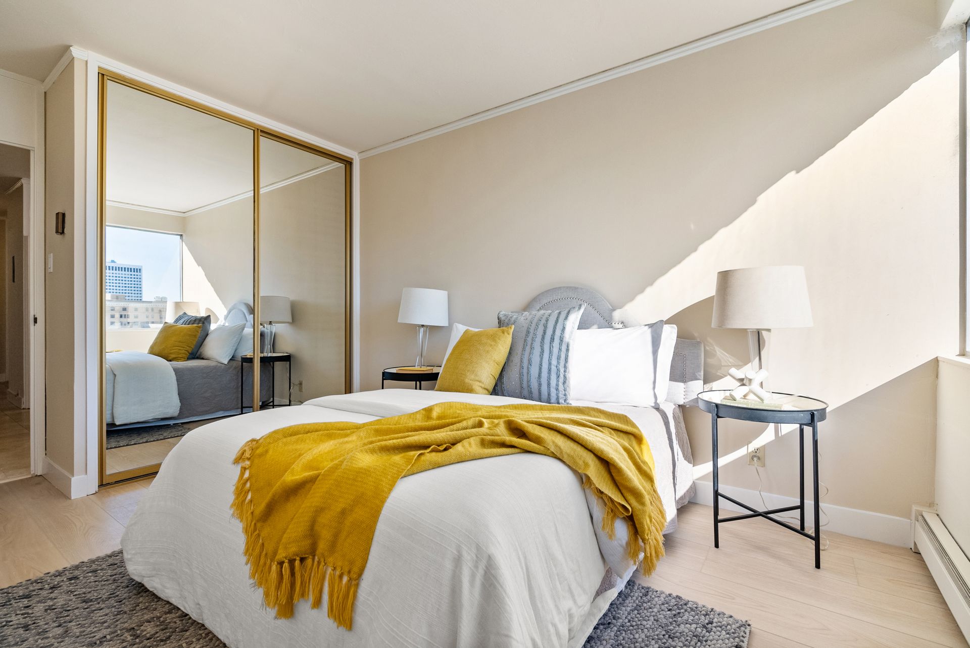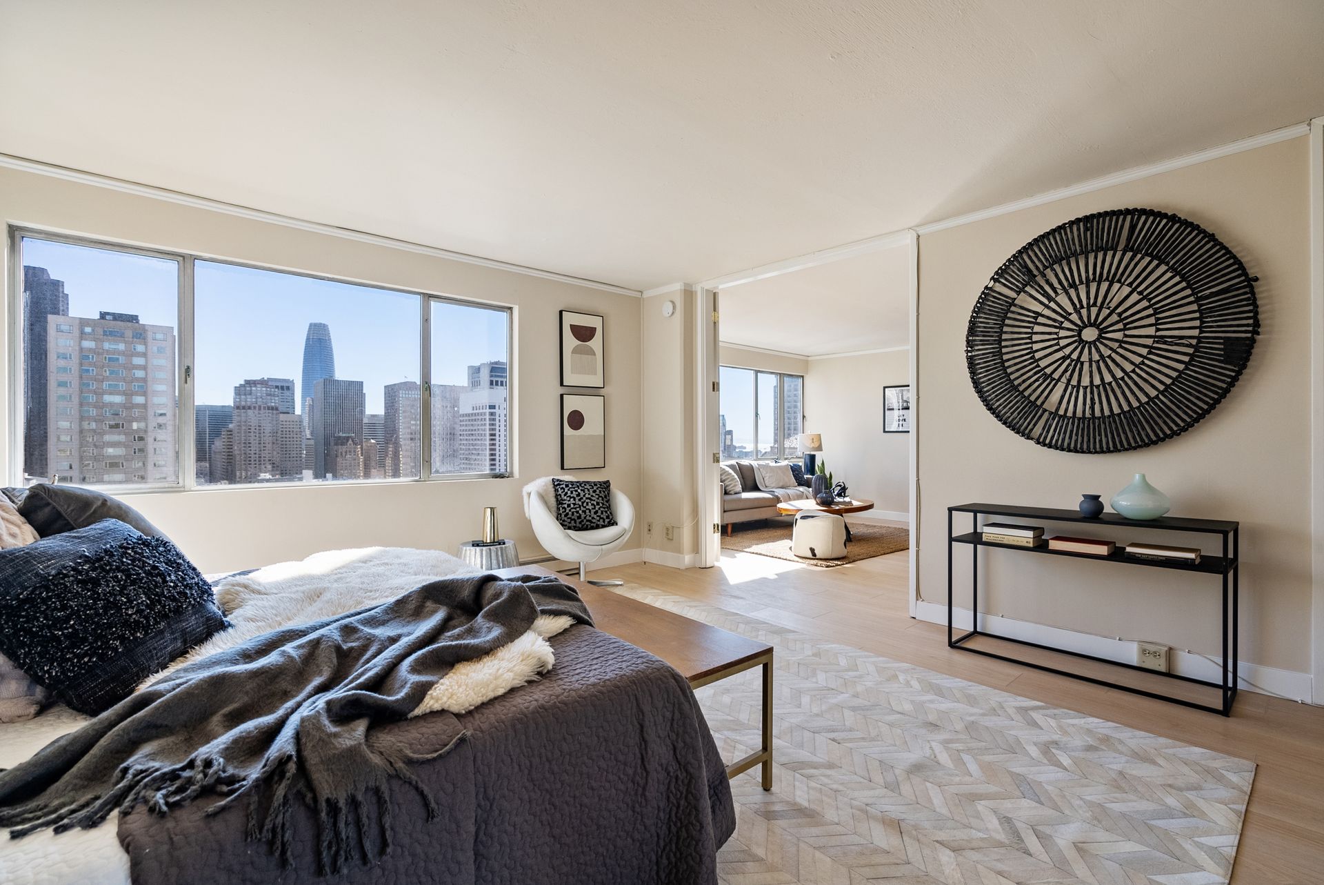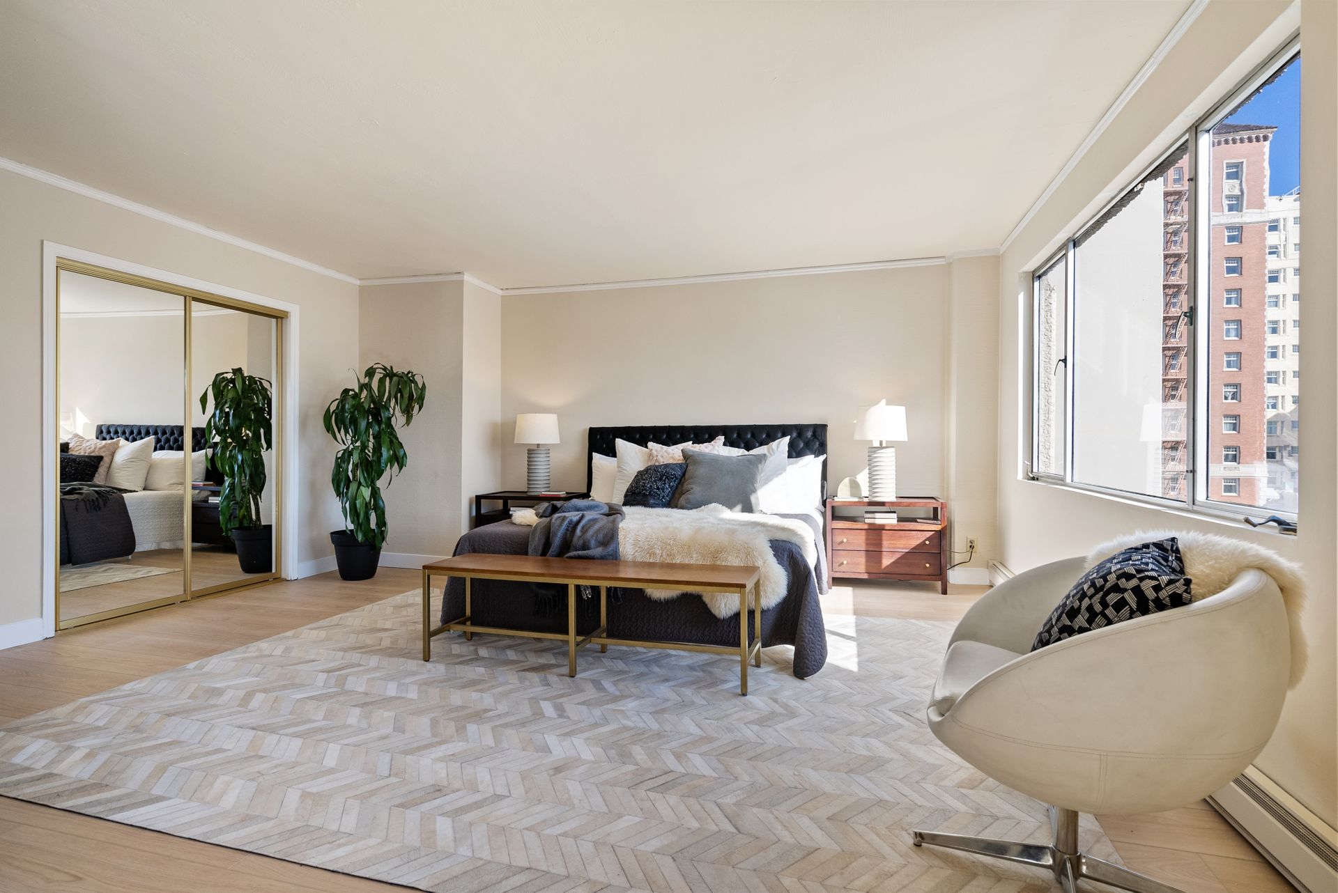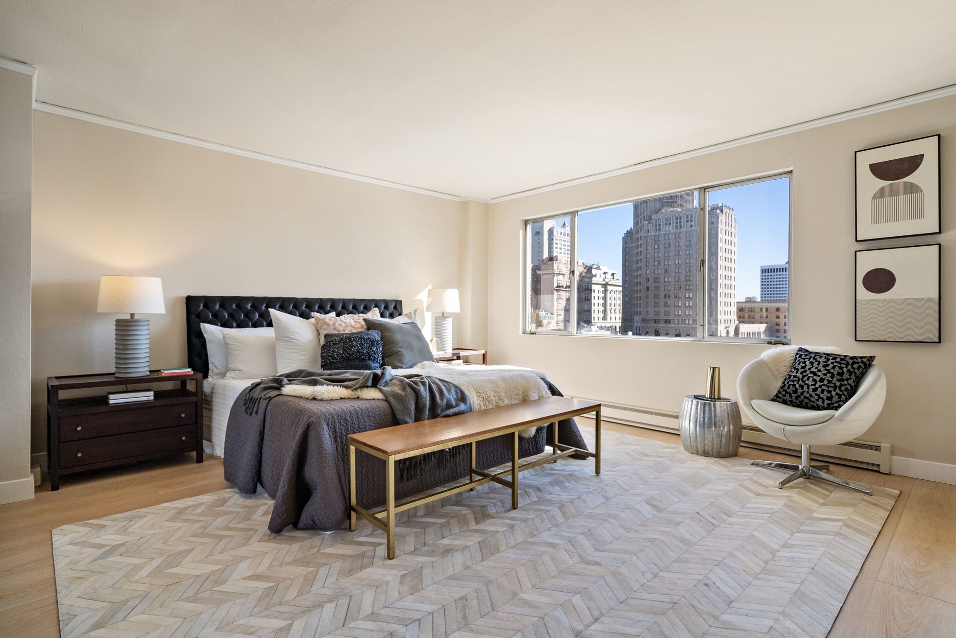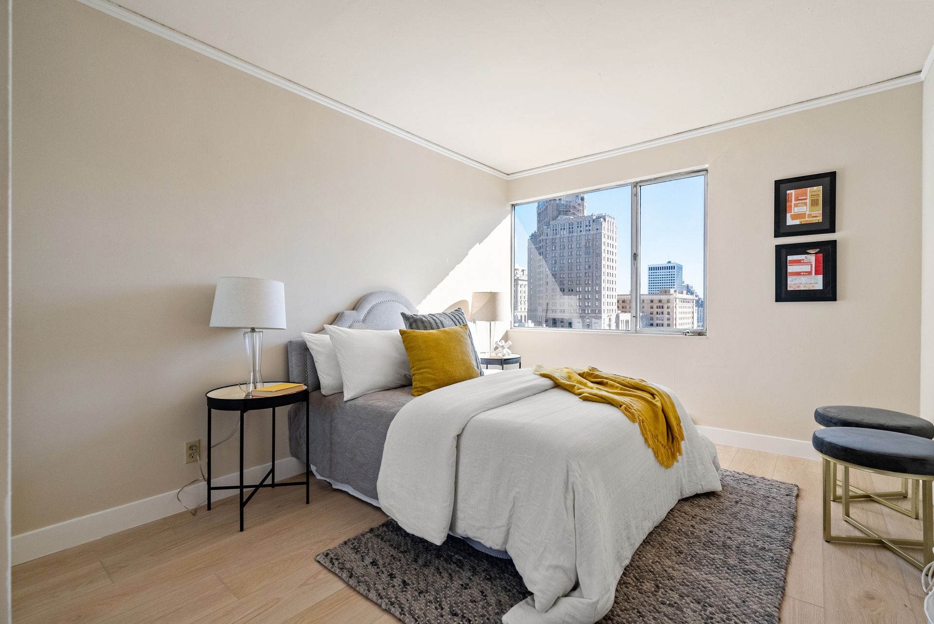 Welcome to 1001 Pine Street, where breathtaking views of San Francisco Skyline and the Bay awaits you on the 11th floor of this rare double unit two-bed, two-bath 1,100 sqft condo located in the heart of Nob Hill. Thoughtful upgrades including new light fixtures, a sleek sink and vanity in the primary bathroom, fresh interior paint and newly installed hardwood flooring, enhance the bright and airy ambiance throughout.