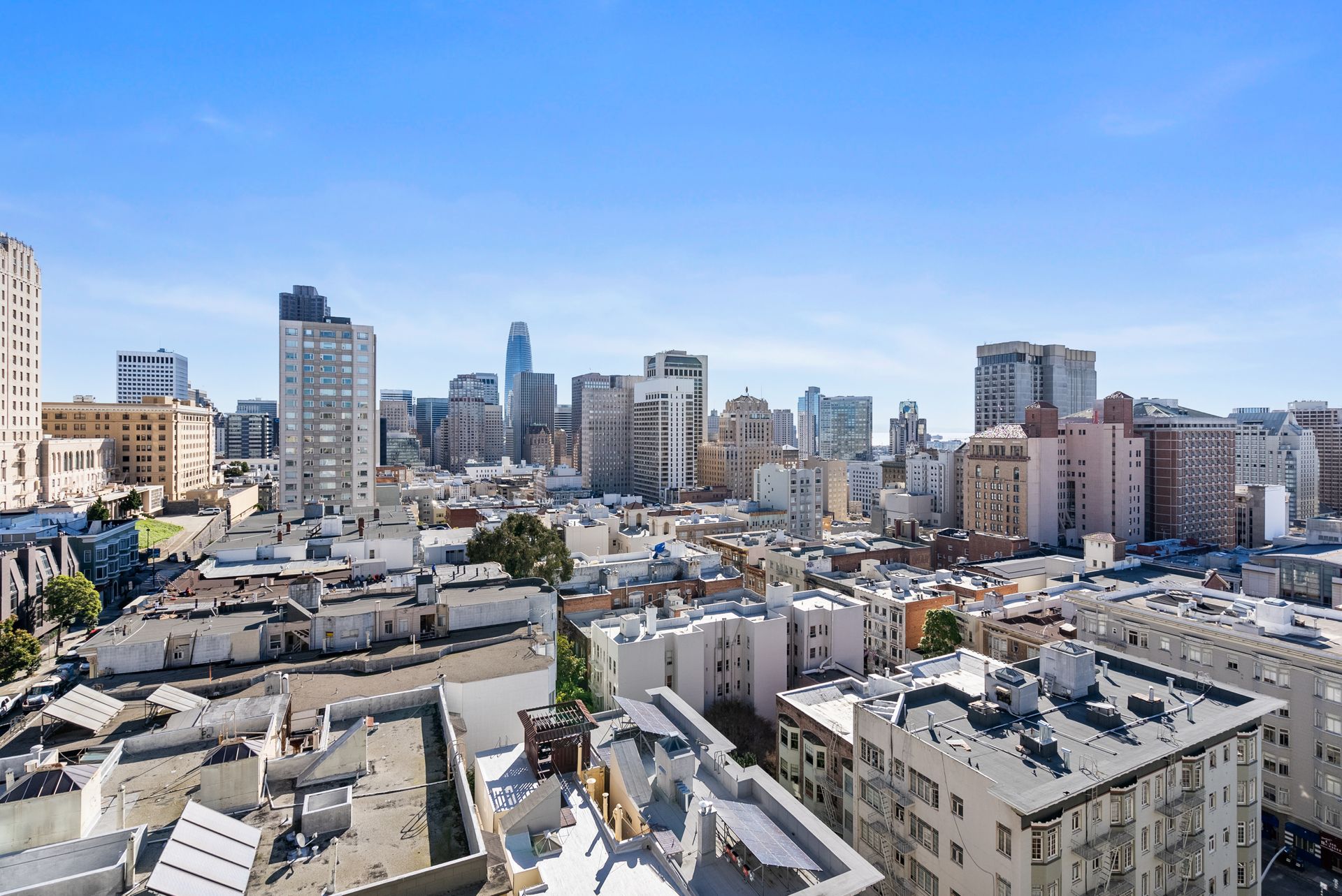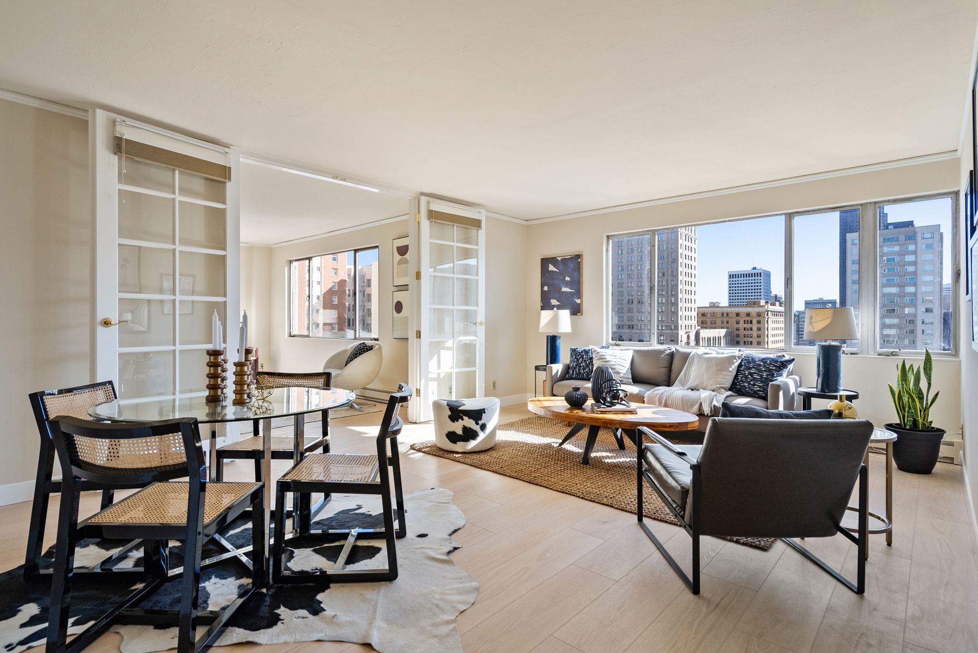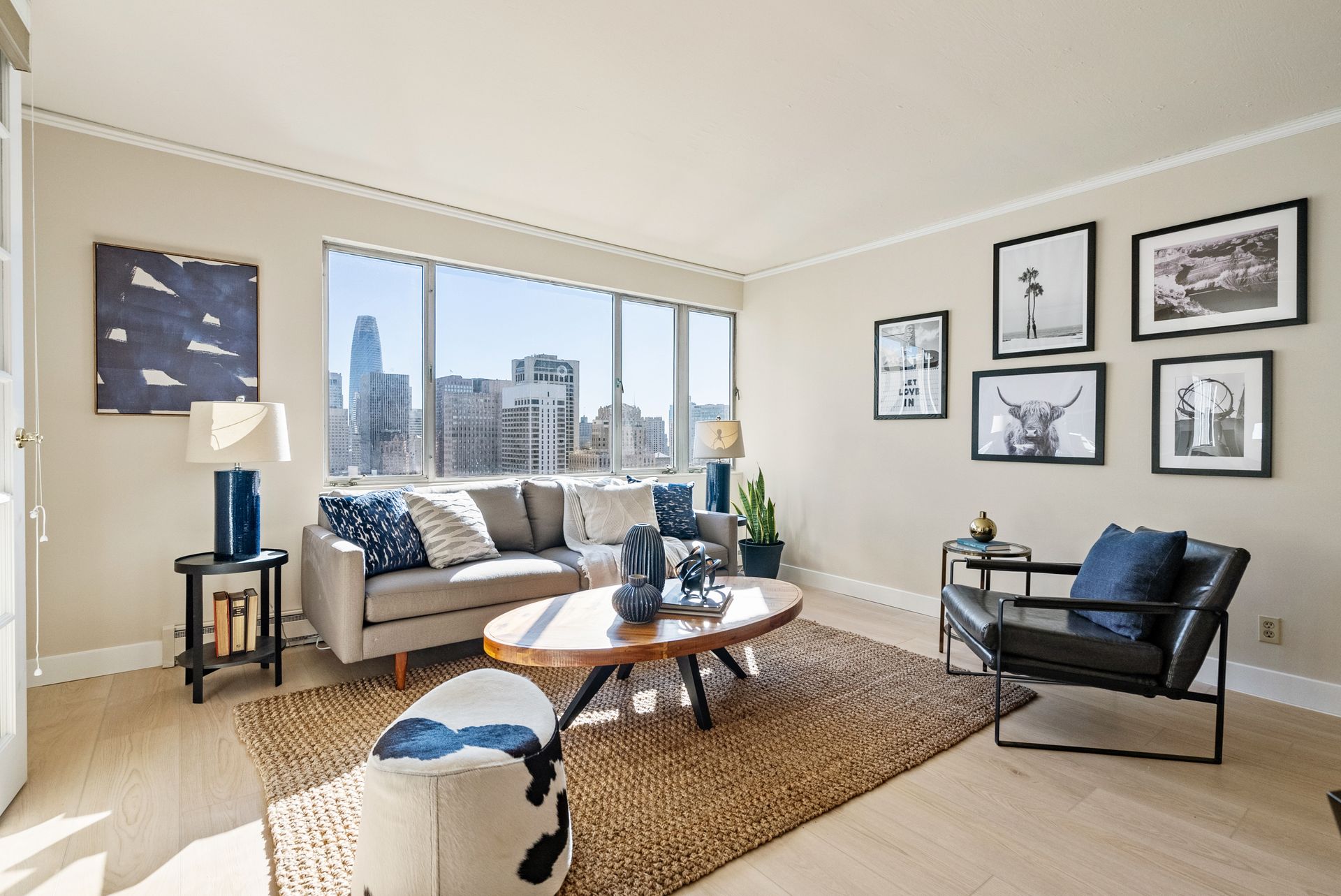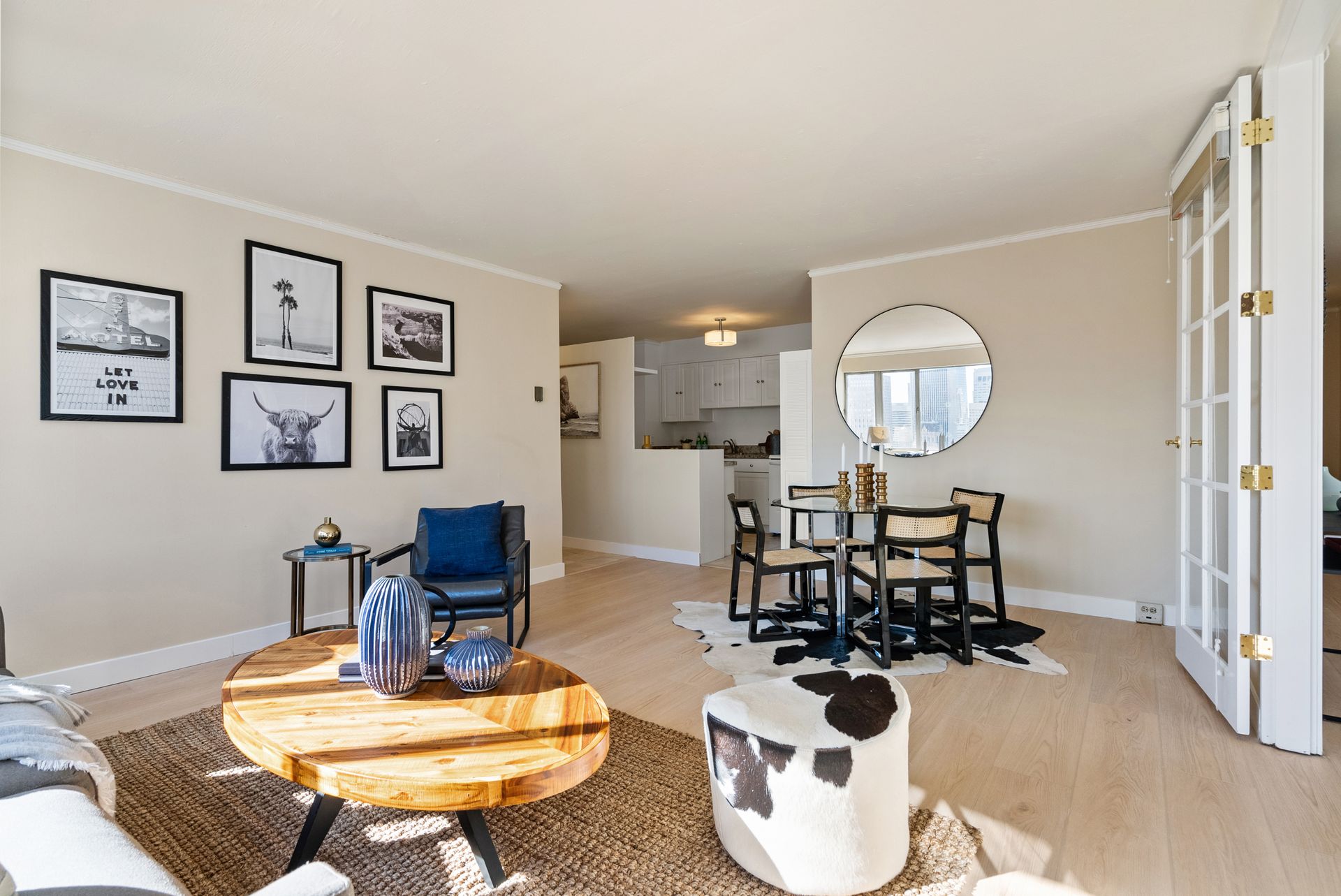 Welcome to 1001 Pine Street, where breathtaking views of San Francisco Skyline and the Bay awaits you on the 11th floor of this rare double unit two-bed, two-bath 1,100 sqft condo located in the heart of Nob Hill. Thoughtful upgrades including new light fixtures, a sleek sink and vanity in the primary bathroom, fresh interior paint and newly installed hardwood flooring, enhance the bright and airy ambiance throughout.