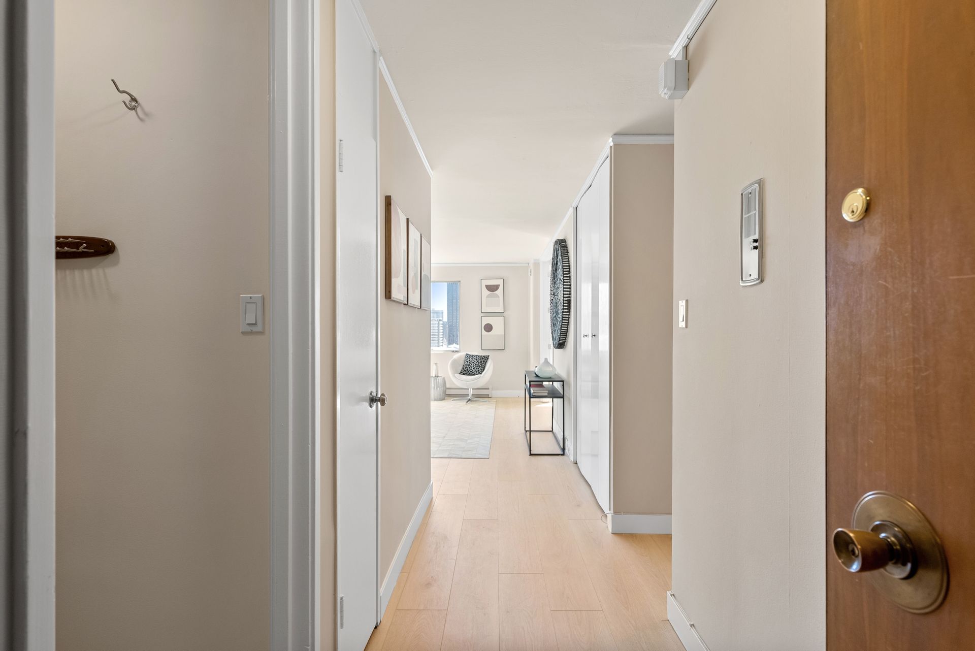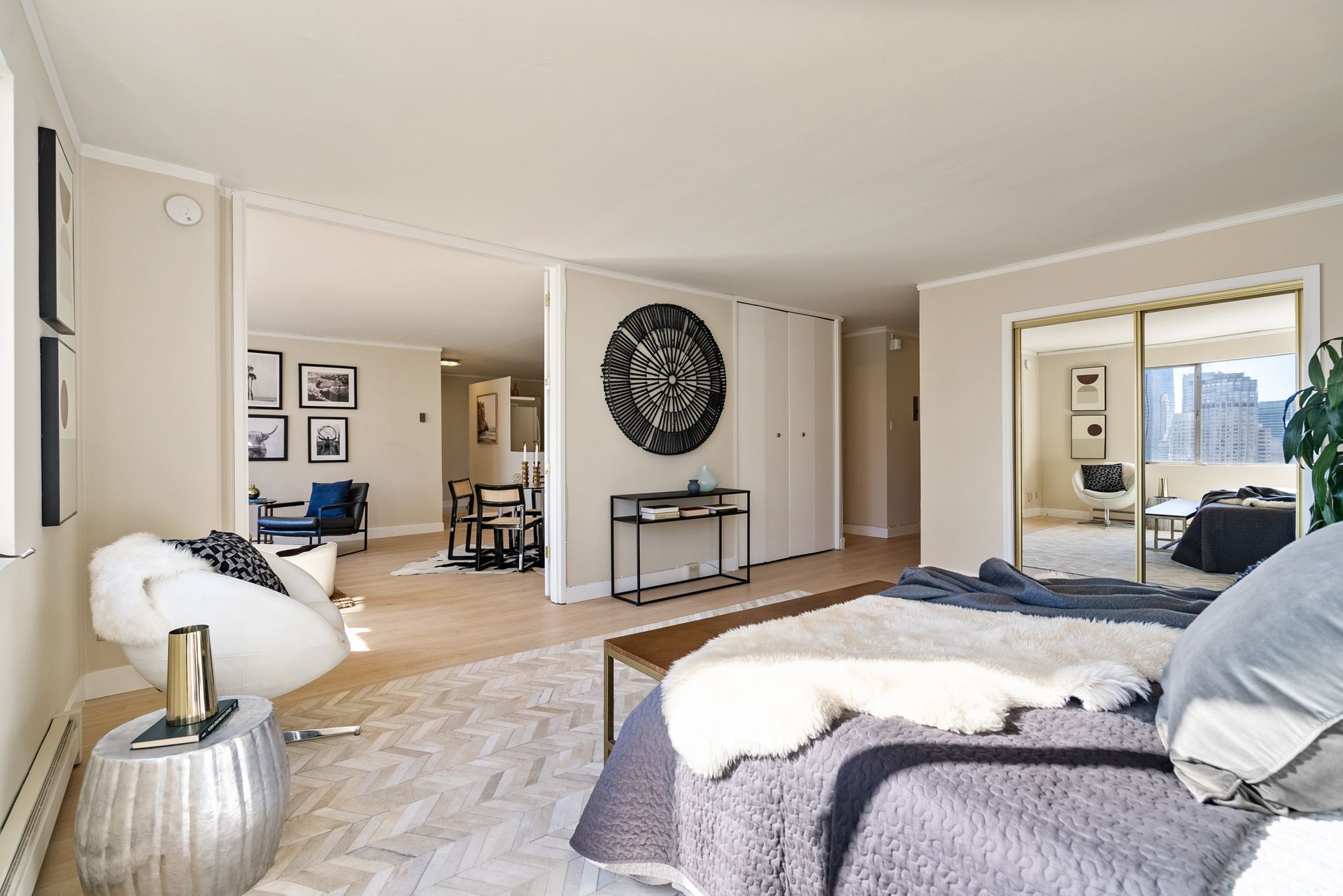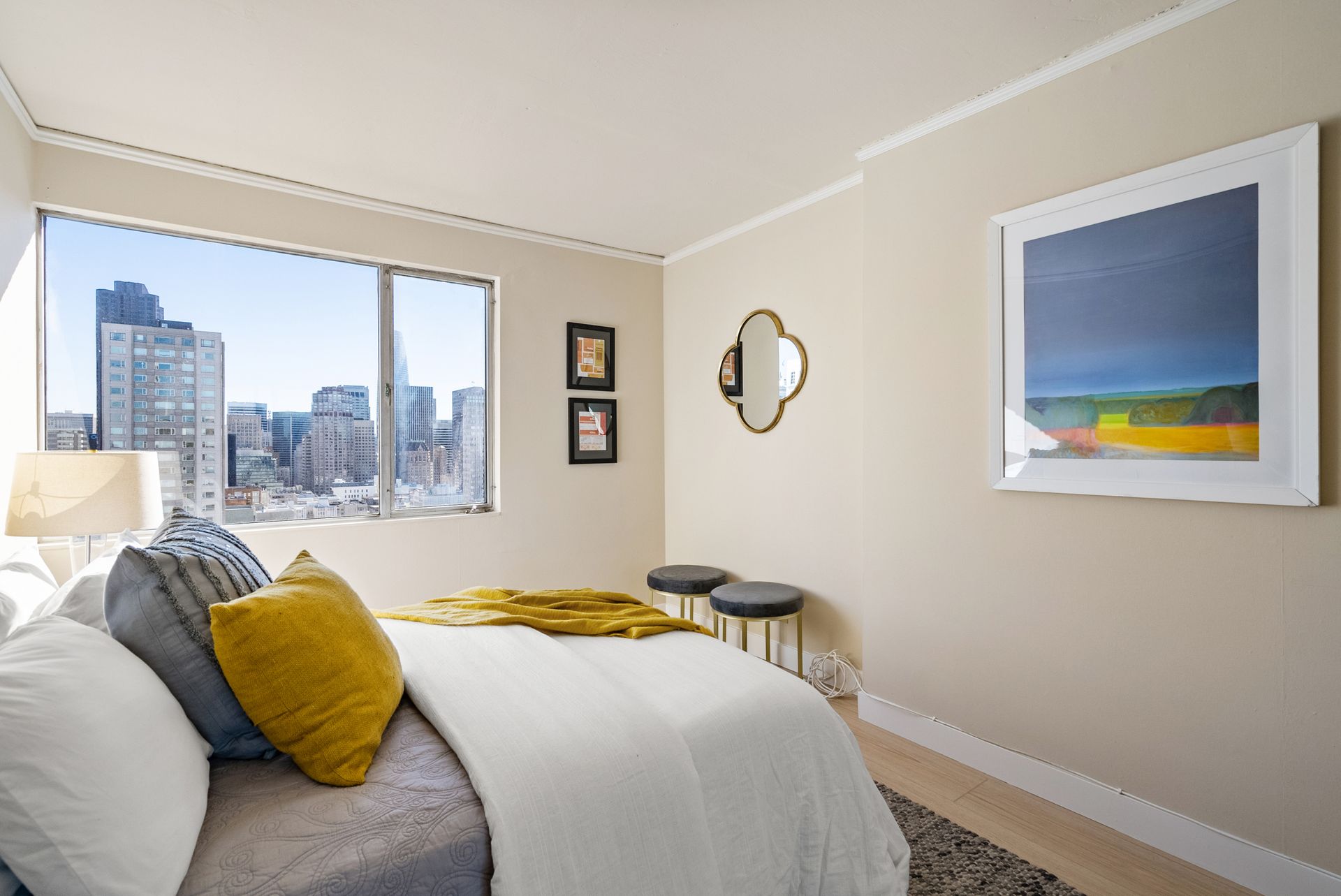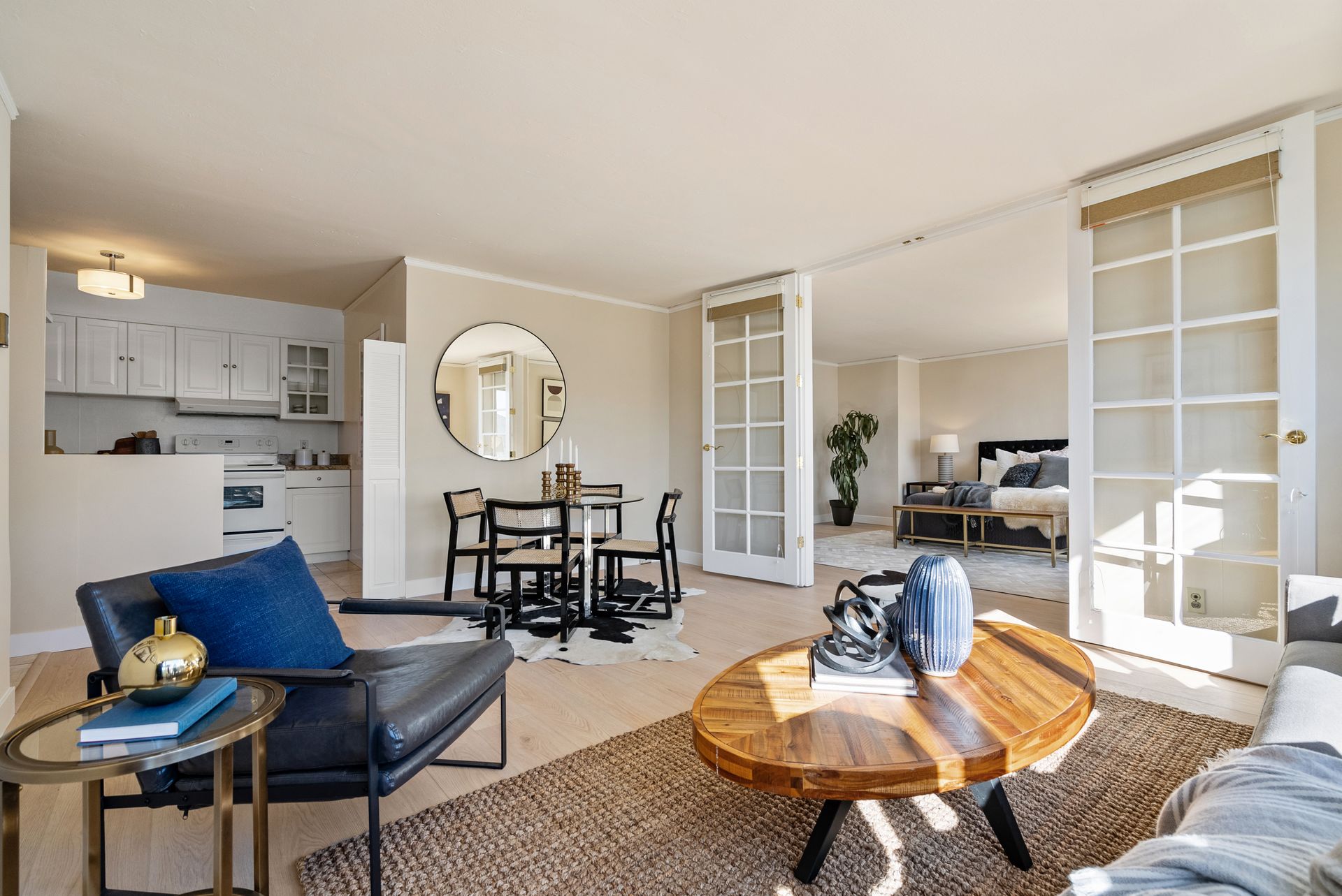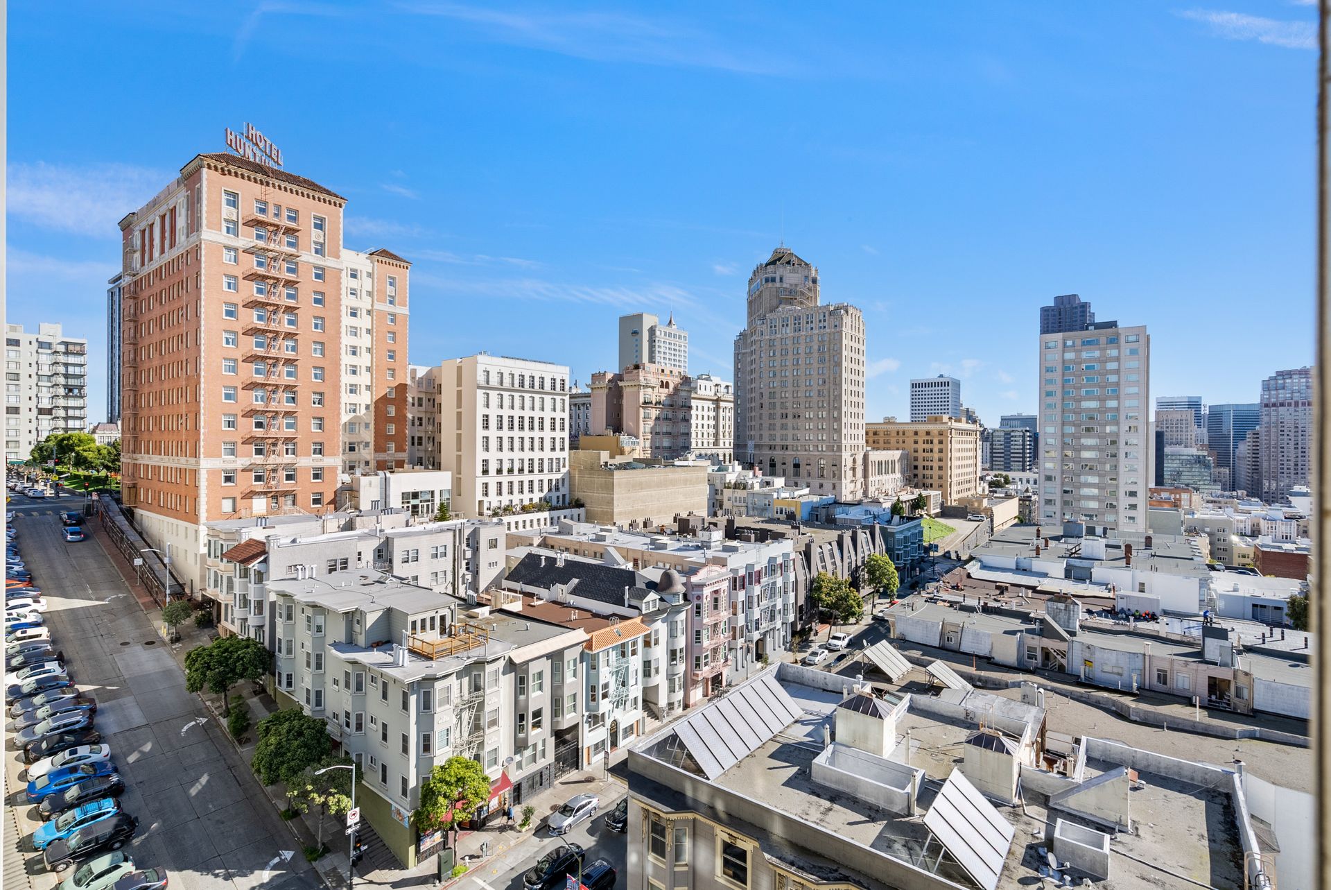 Welcome to 1001 Pine Street, where breathtaking views of San Francisco Skyline and the Bay awaits you on the 11th floor of this rare double unit two-bed, two-bath 1,100 sqft condo located in the heart of Nob Hill. Thoughtful upgrades including new light fixtures, a sleek sink and vanity in the primary bathroom, fresh interior paint and newly installed hardwood flooring, enhance the bright and airy ambiance throughout.