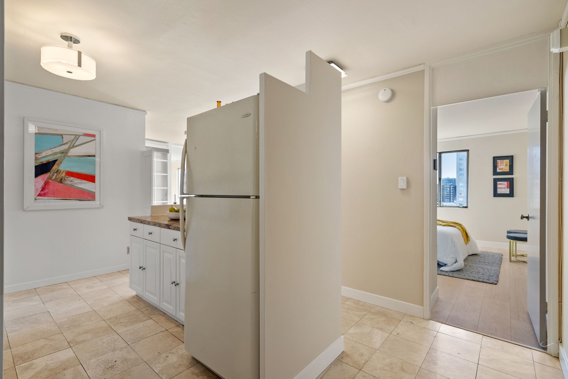The modern layout effortlessly transitions from the open kitchen to spacious living and dining areas, ideal for both relaxation and entertainment. The generous primary bedroom with walk in closets and guest bedroom are bathed in natural light by day and offer captivating views of city lights by night.
