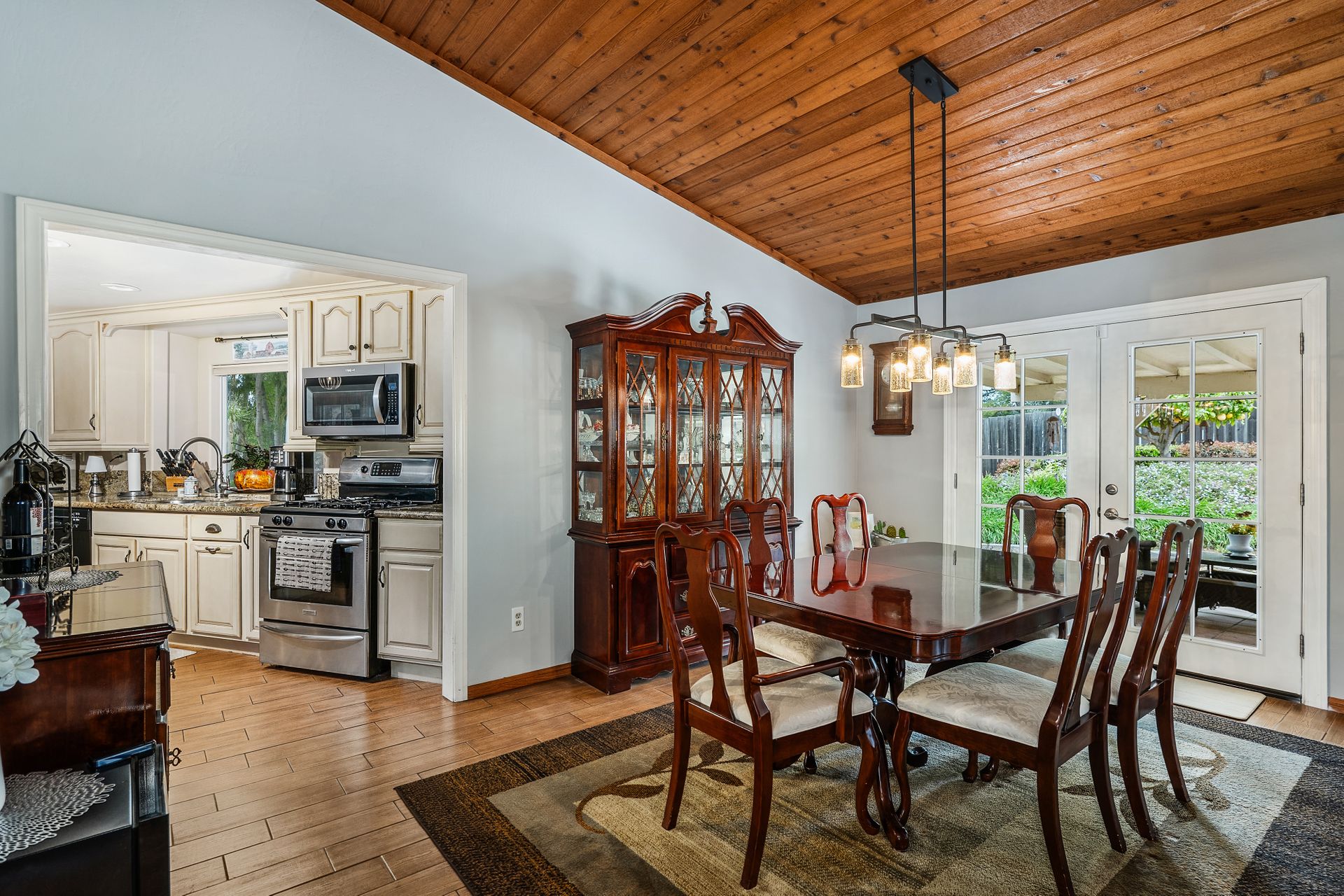 This one story, approximately 2,637 square foot, four bedroom, two and one-half bath home boasts a floor plan that flows exceptionally well. The home is situated on a very manageable 0.52 acres and is the last home in the back of a peaceful neighborhood. It is situated close to shopping and downtown. Open the custom made glass front doors and enjoy the cozy great room with exposed wood ceilings, a wood pellet stove and a wet bar. A separate formal dining room is adjacent to the kitchen and has French doors which lead to the very tranquil and spacious back patio. The kitchen has granite counter tops, an island, a breakfast nook and a separate pantry. The spacious primary bedroom with a recently upgraded bathroom has dual sinks and closets and opens to the very tranquil back patio. The back patio is covered and extra deep providing a very peaceful and restful view of the professionally landscaped and maintained yard, including a waterfall. There are three outbuildings. The large gym includes a shower and there is a greenhouse as well as a large tool shed. This home has both a solar system and a security system including cameras.