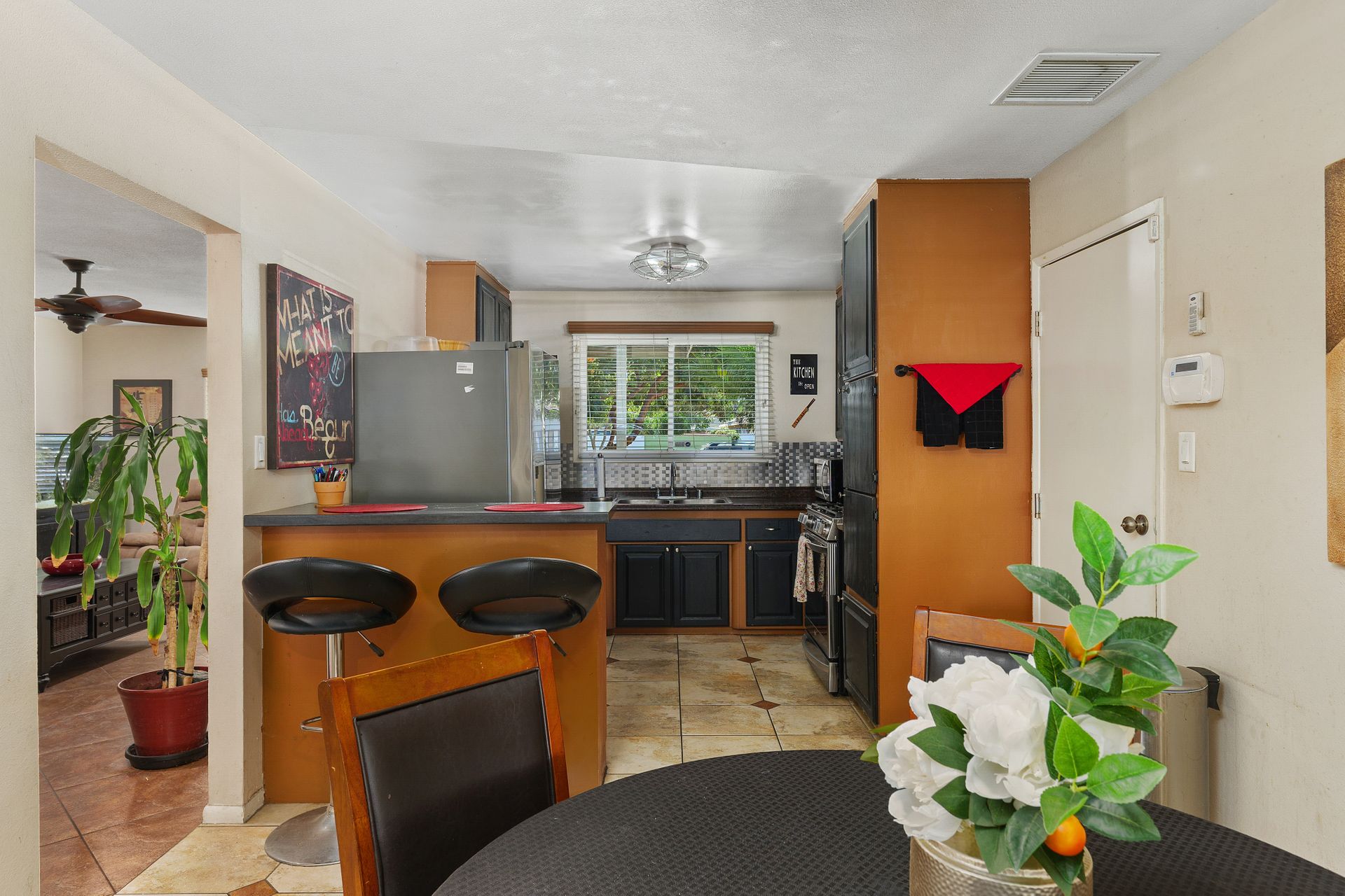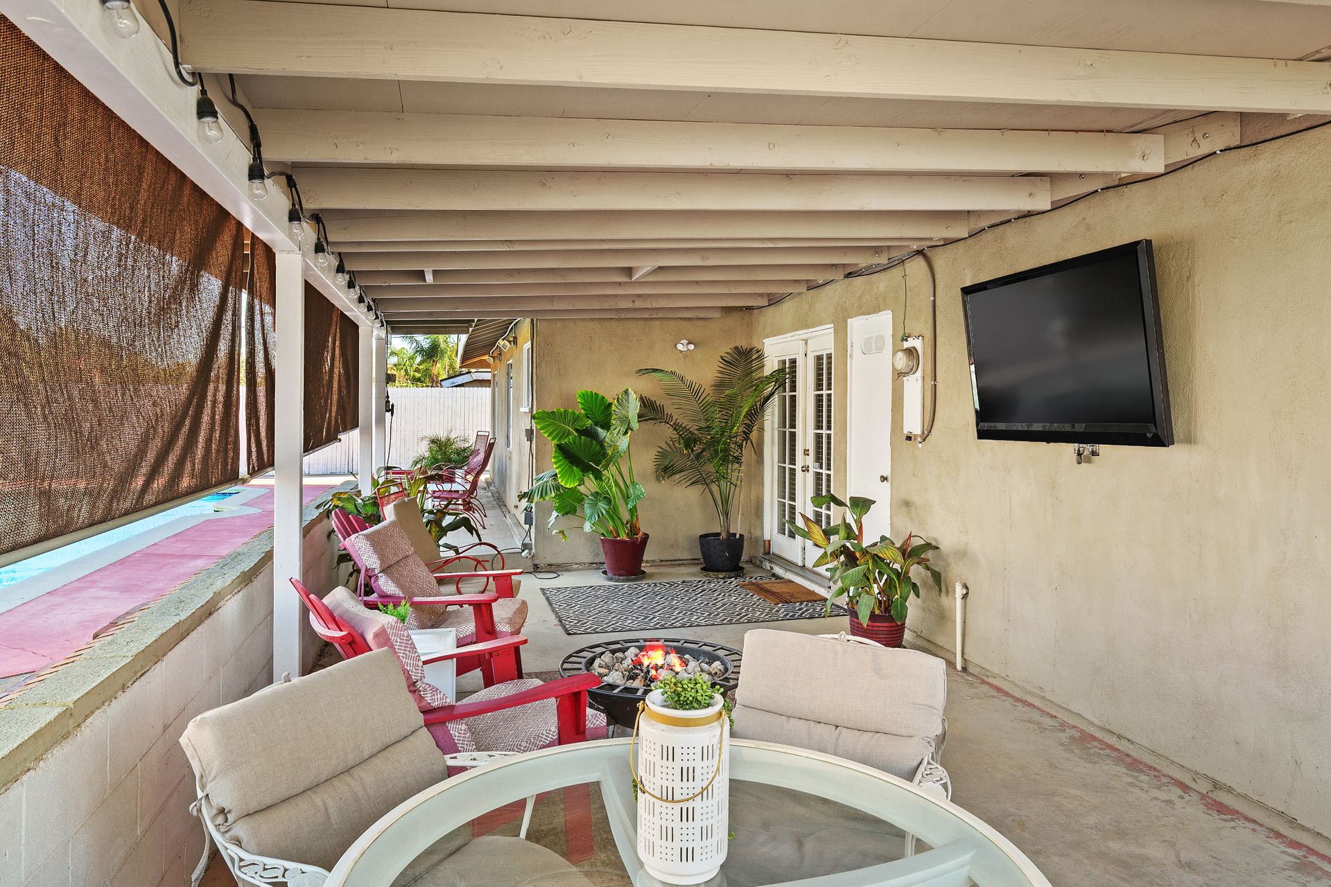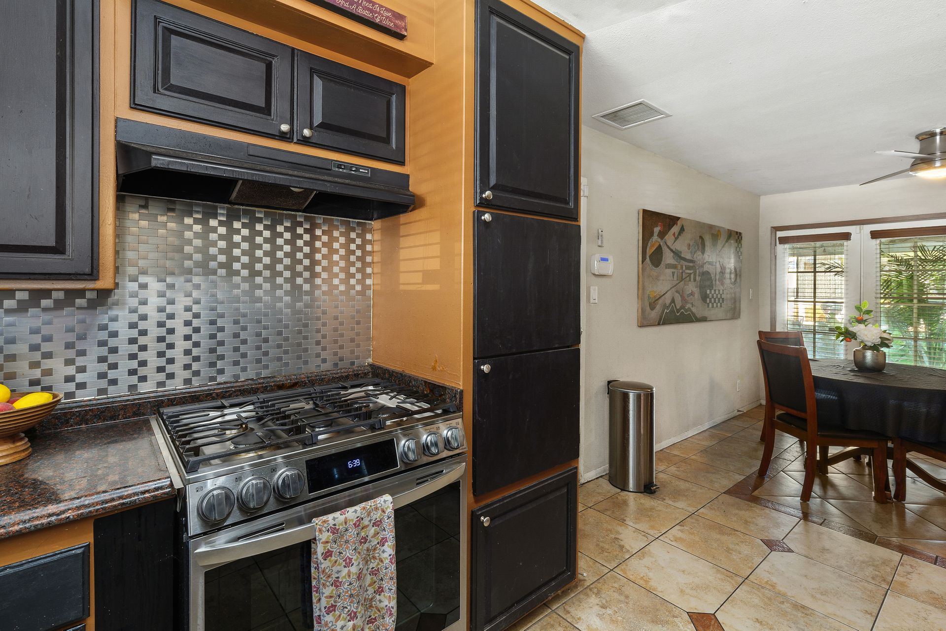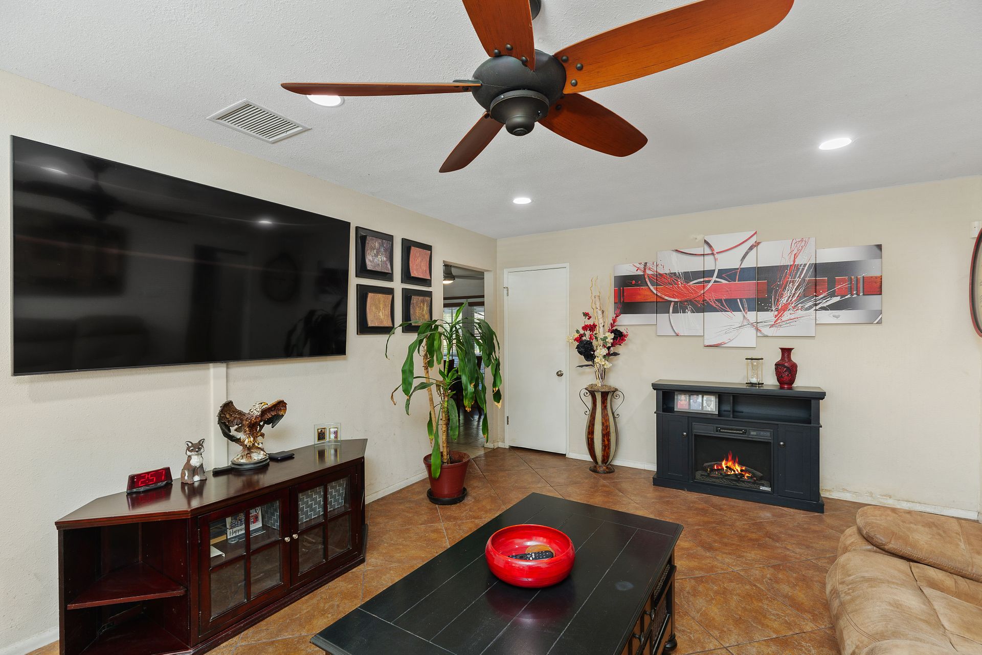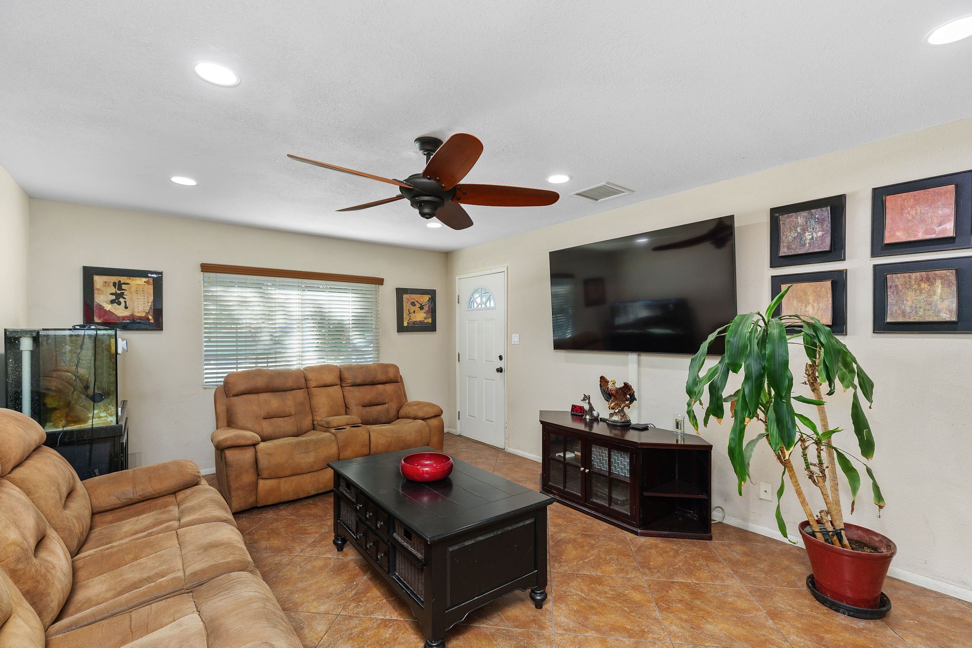 Charming Riverside pool home situated on a beautifully manicured lot. This single-story home boasts of well-designed living space, featuring three bedrooms and two bathrooms. Upon entry, you're greeted by a large open living room that sets the stage for stylish and comfortable living. All common areas include tile flooring. The primary suite is generously sized and includes an ensuite with a walk-in shower. The two additional bedrooms on the opposite side of the house are bright and inviting, each equipped with large closets and ceiling fans. The open kitchen includes Formica countertops and backsplash, ample cabinetry, a built-in oven along with a newer LG range. It's waiting for its next culinary enthusiast!! Find the dining area centrally located adjacent to the kitchen for seamless flow. French doors open to your outdoor covered patio with a TV and gas fire pit. Perfect for indoor-outdoor living. Step outside to discover a true backyard paradise. Enjoy the sparkling pool, spacious area, gazebo with a second (wood) fire pit, two Ponytail palm trees, and a Mediterranean Fan palm. This outdoor space is ideal for relaxation and entertainment alike. Experience the ideal blend of comfort, style, and outdoor living in this welcoming home.