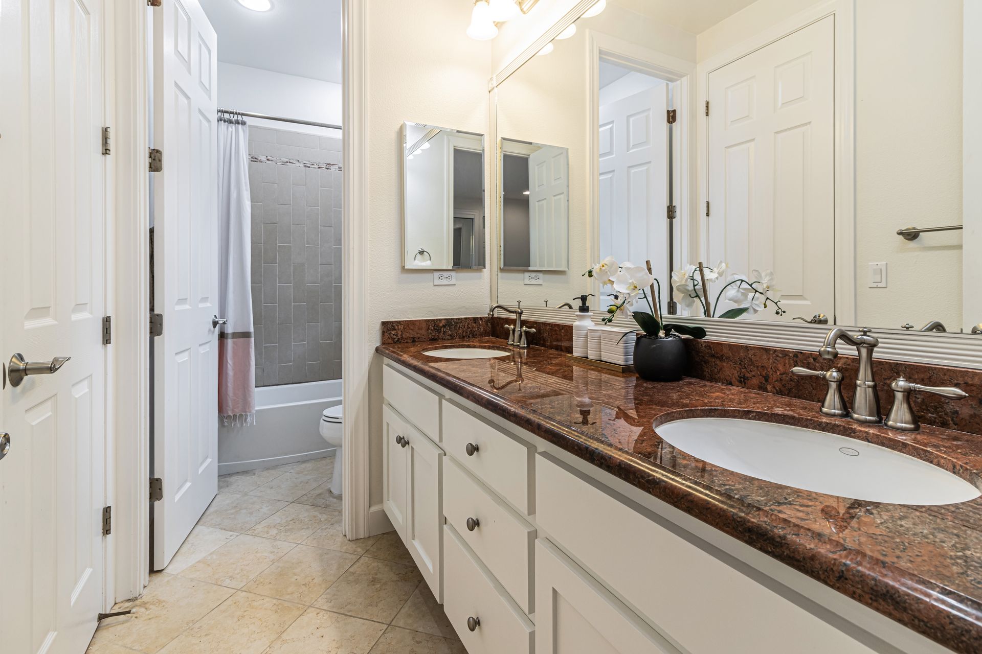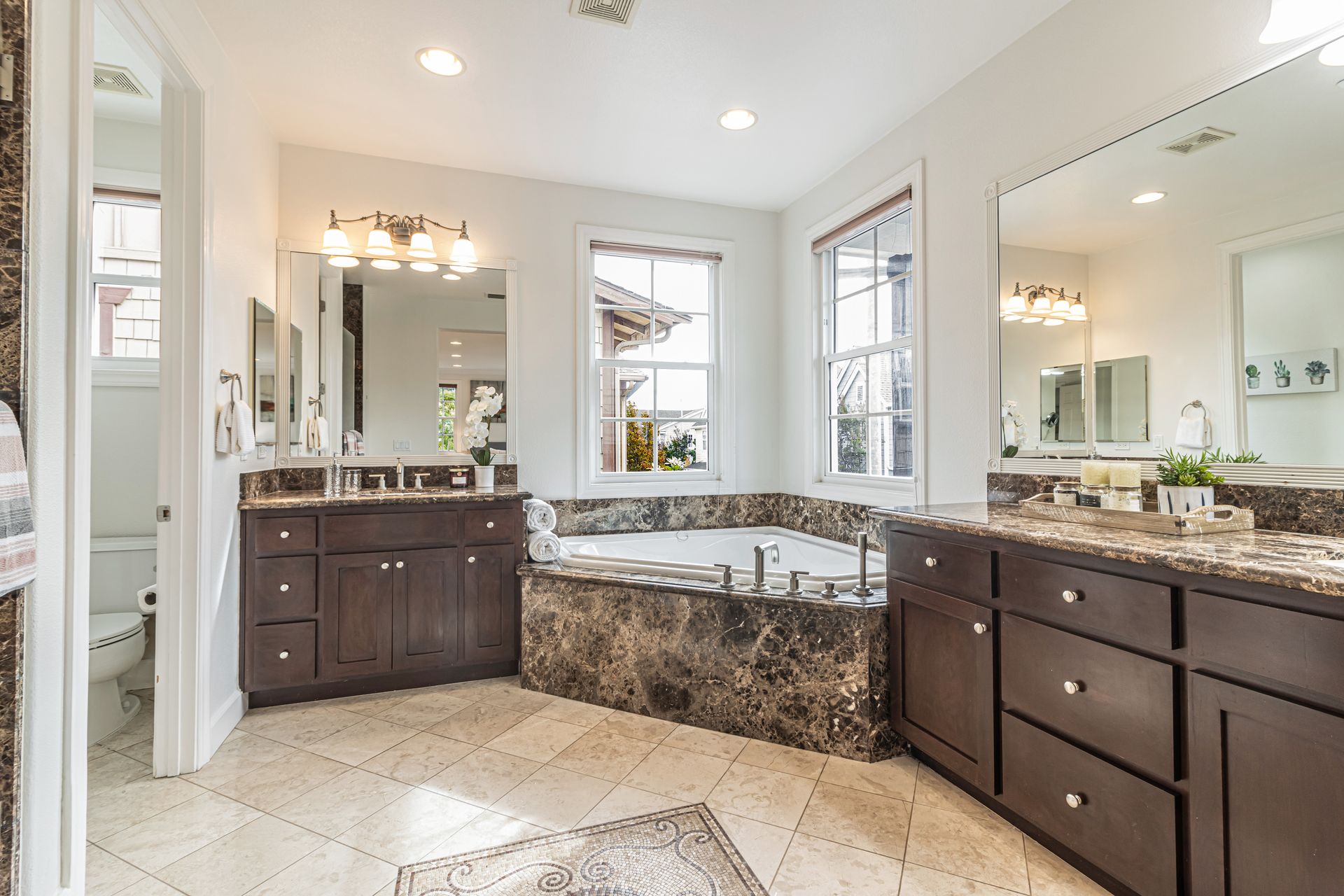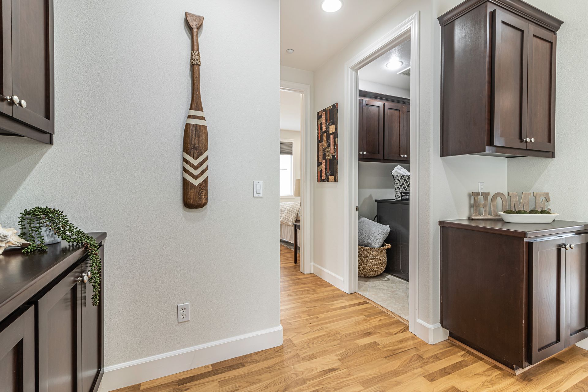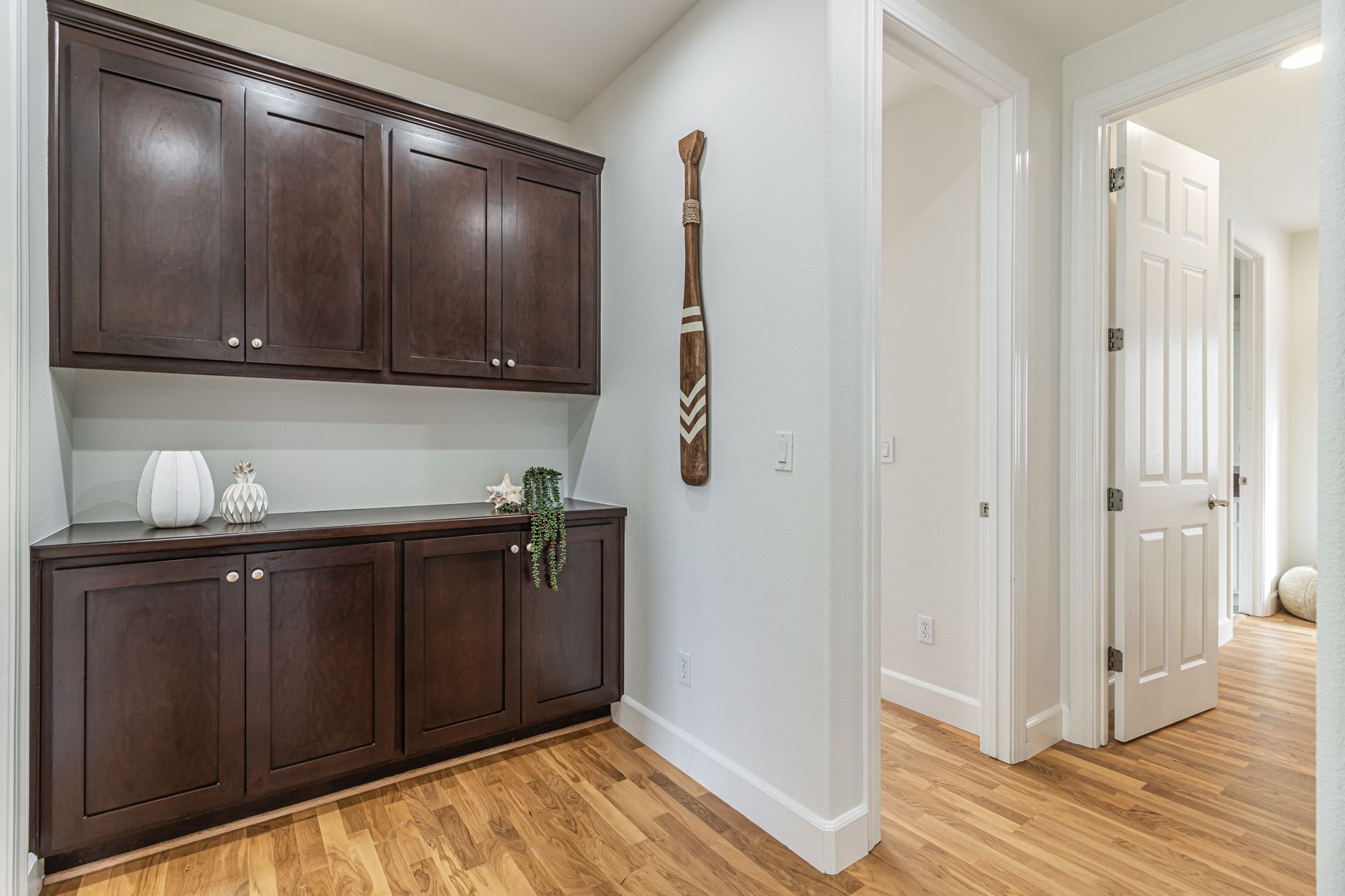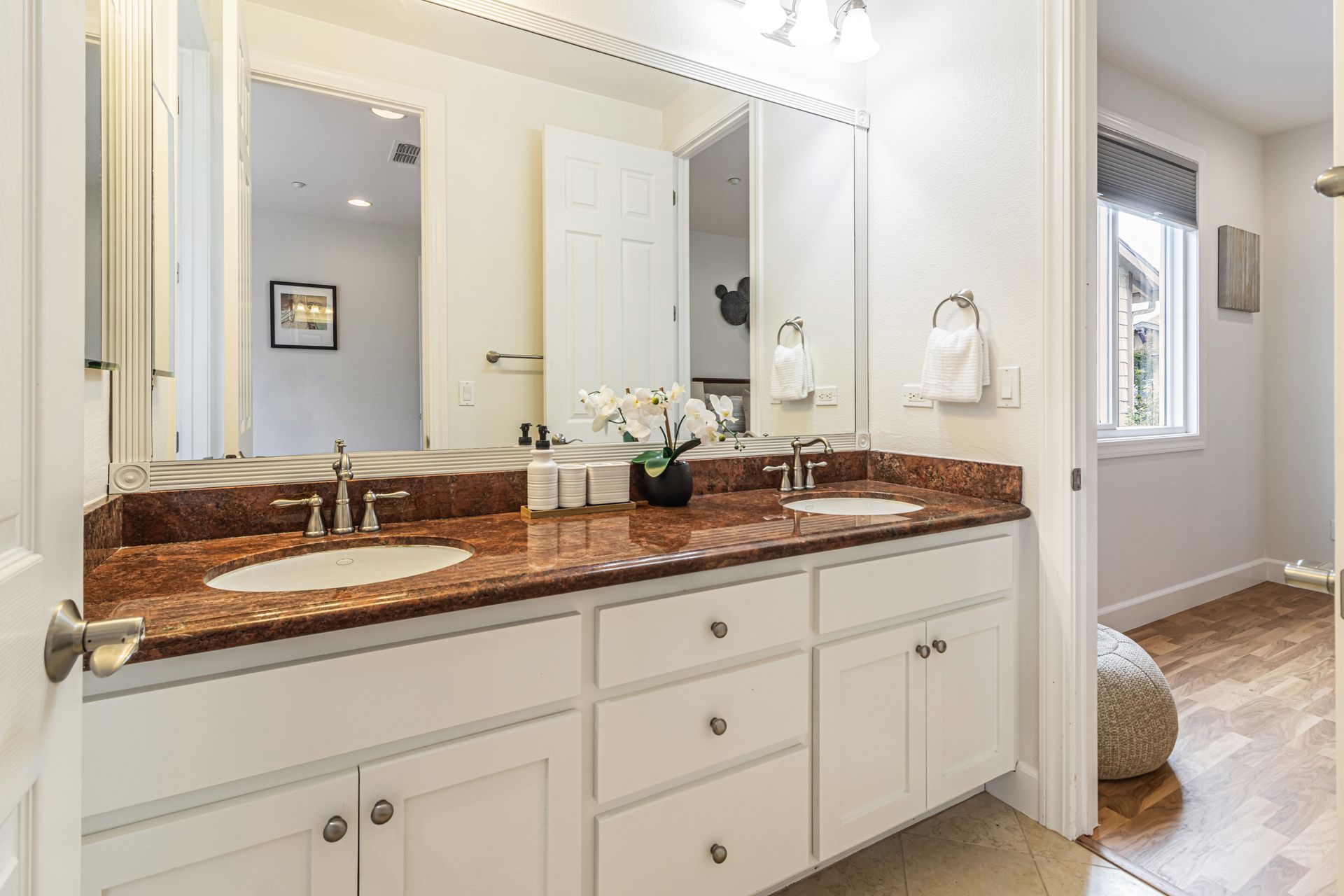 The upper floor features spacious four bedrooms, three bathrooms and a laundry room. The elegant luxurious primary suite boasts a fireplace, custom walk-in closet, a spa retreat with a jacuzzi tub, double vanities and a deck with views. The laundry room with the vanity sink and cabinets is located near all bedrooms for added convenience. Other features include newly installed wood flooring and fresh interior paint. The two-car garage with a Powerwall and EV charging offers ample space for vehicles and storage.