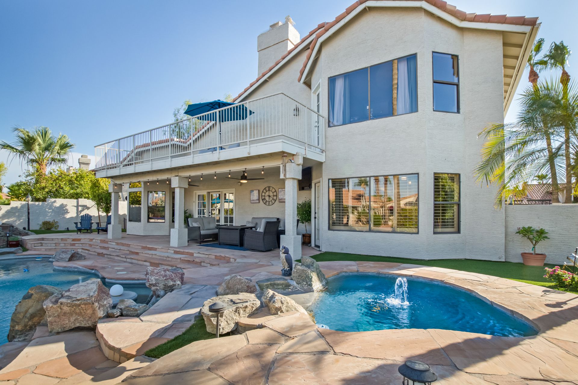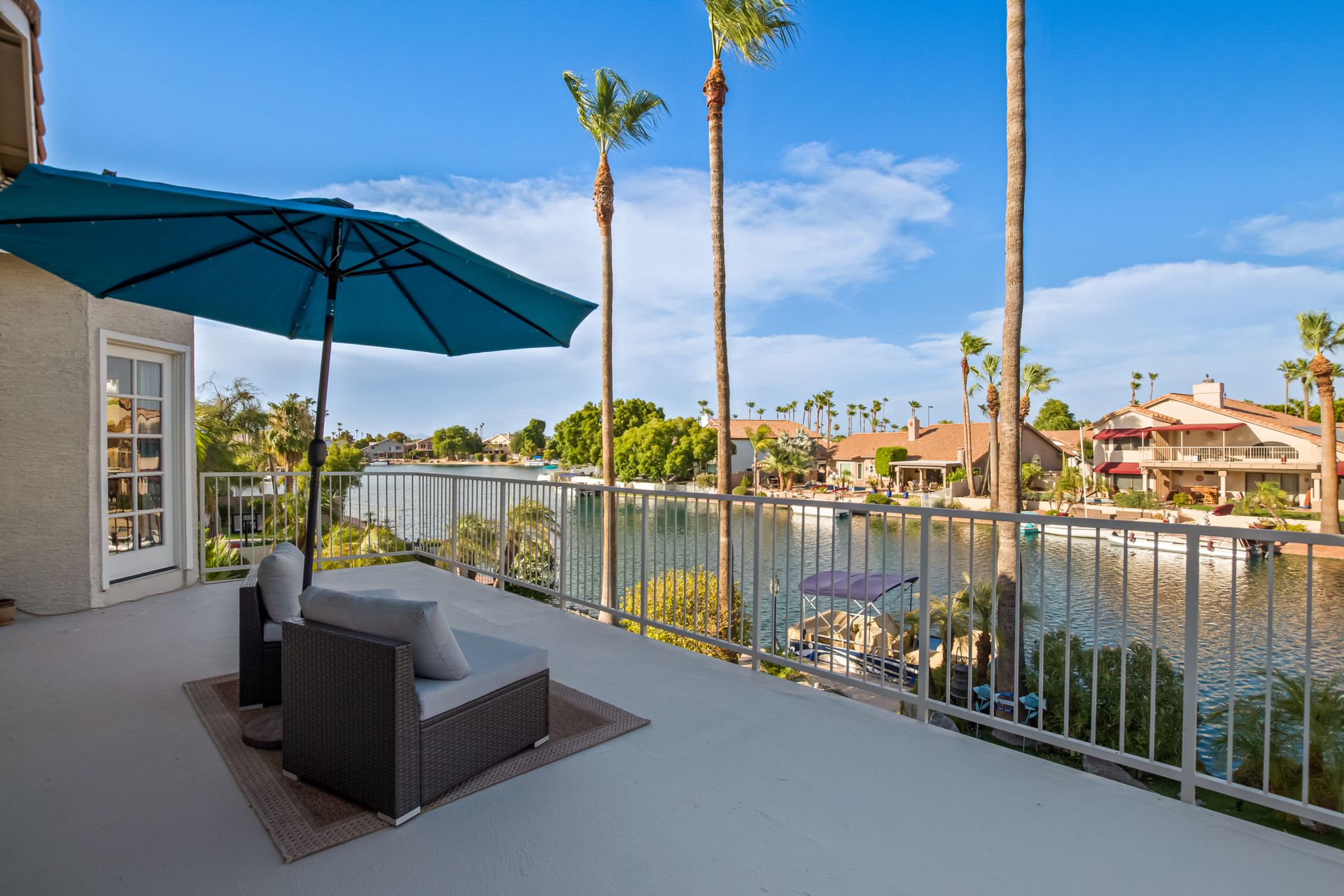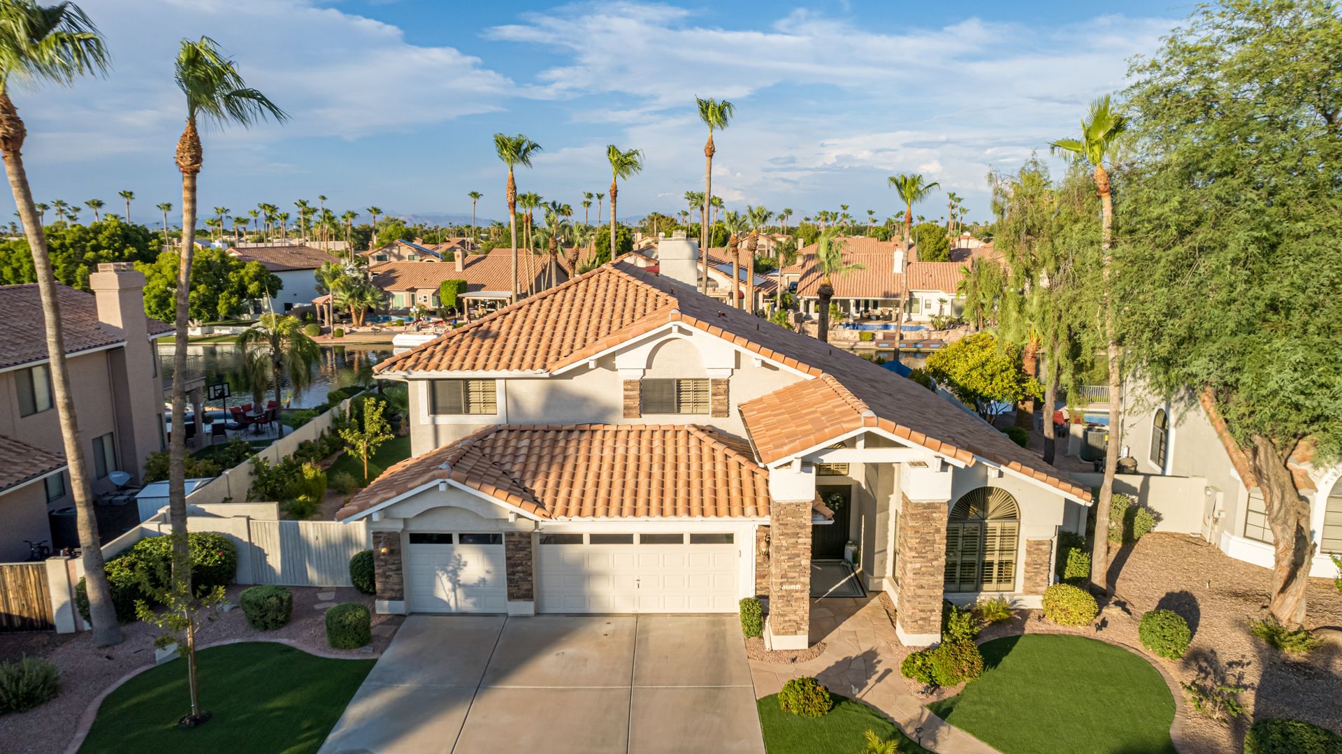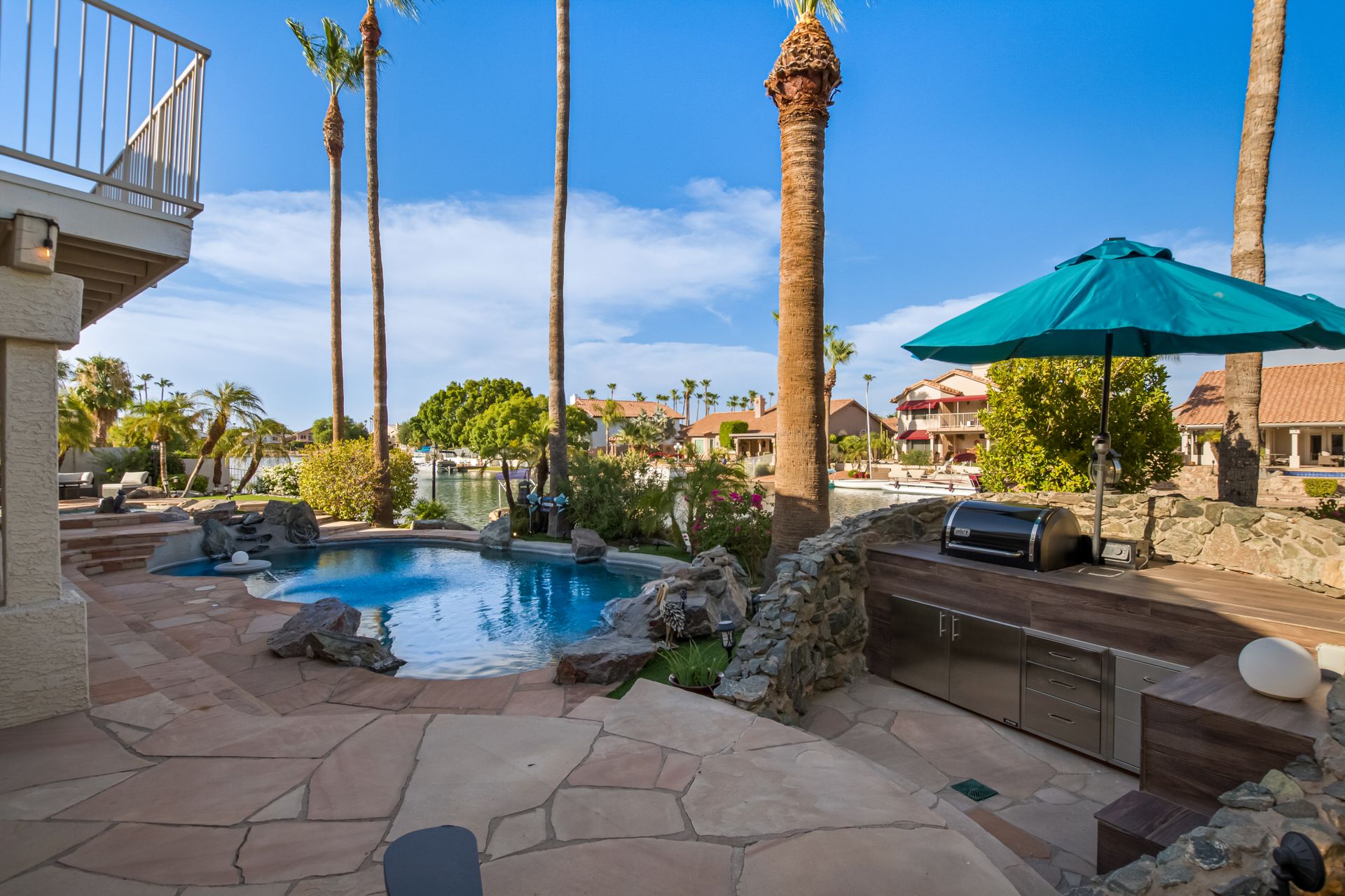 Welcome to Key Harbor, the epitome of waterfront living on The Islands in Gilbert, Arizona. This exquisite 3,126 square-foot, five-bedroom, two-and-one-half-bathroom home seamlessly combines luxurious comfort with breathtaking waterfront views. The open-concept living area is filled with natural light, showcasing stunning vistas. The kitchen features high-end Thermador appliances, granite countertops, and ample storage. The downstairs primary suite offers waterfront views, an en-suite bathroom with a jetted tub, a separate shower, and two walk-in closets. Upstairs, a coffee bar and four well-appointed bedrooms await. Make your way outside to the expansive patio, pool, heated spa, sitting areas, and built-in barbeque perfect for unwinding or hosting gatherings. Own this waterfront sanctuary and embrace an exceptional lifestyle of luxury, breathtaking views, and unparalleled lifestyle!