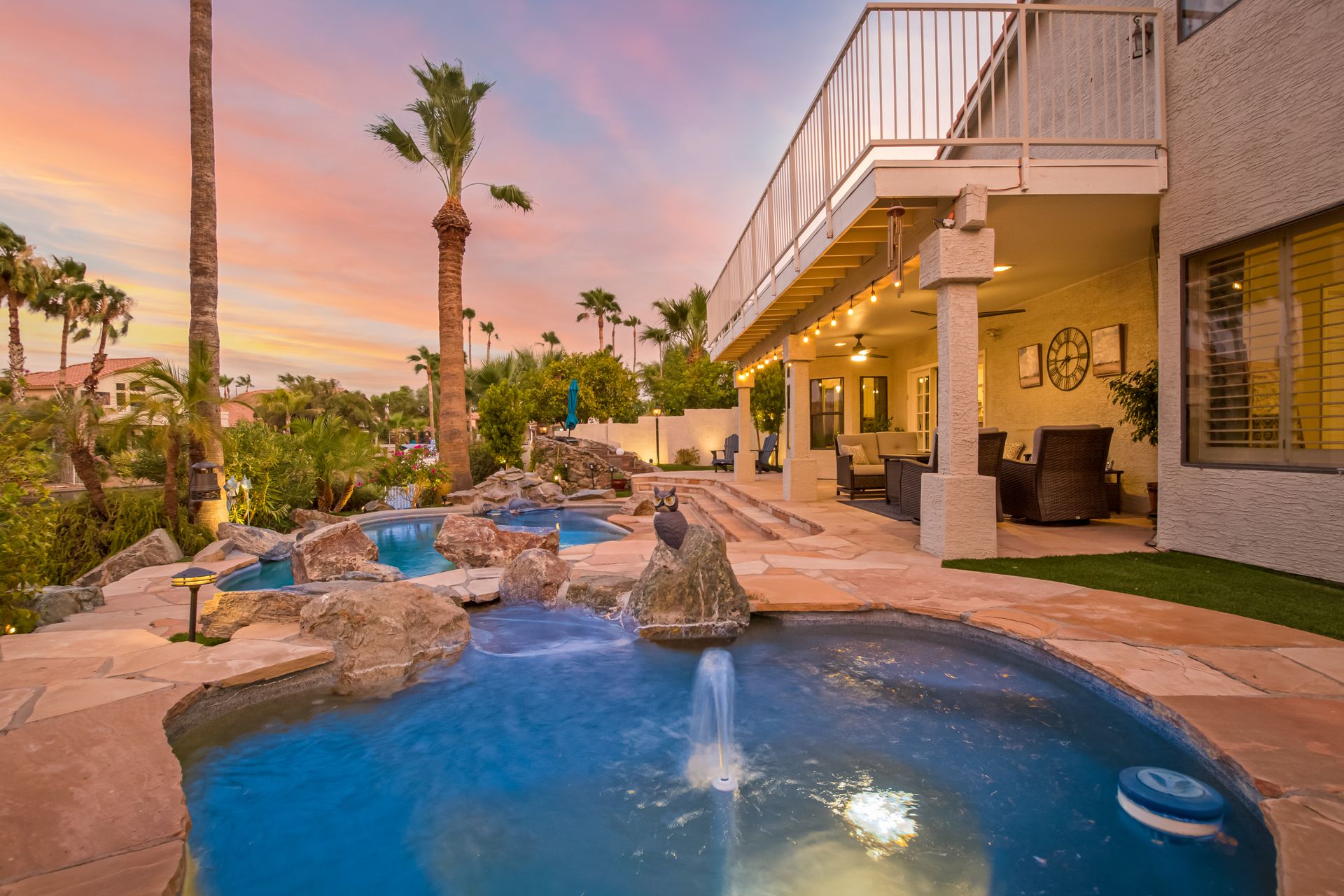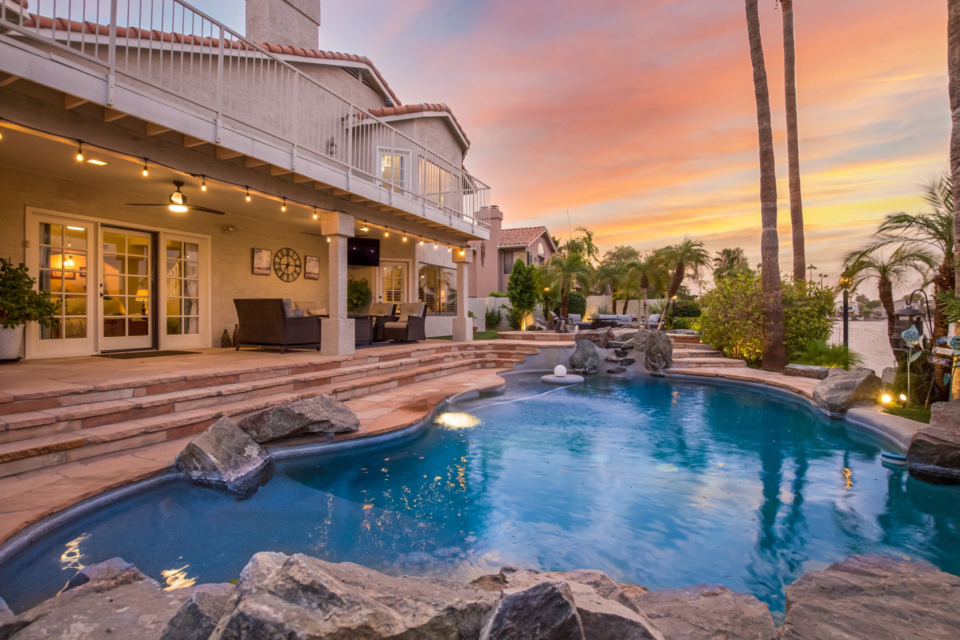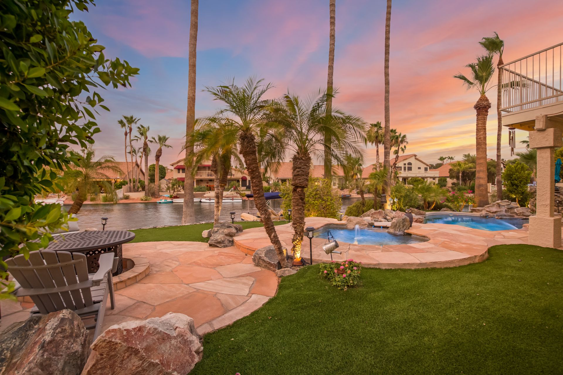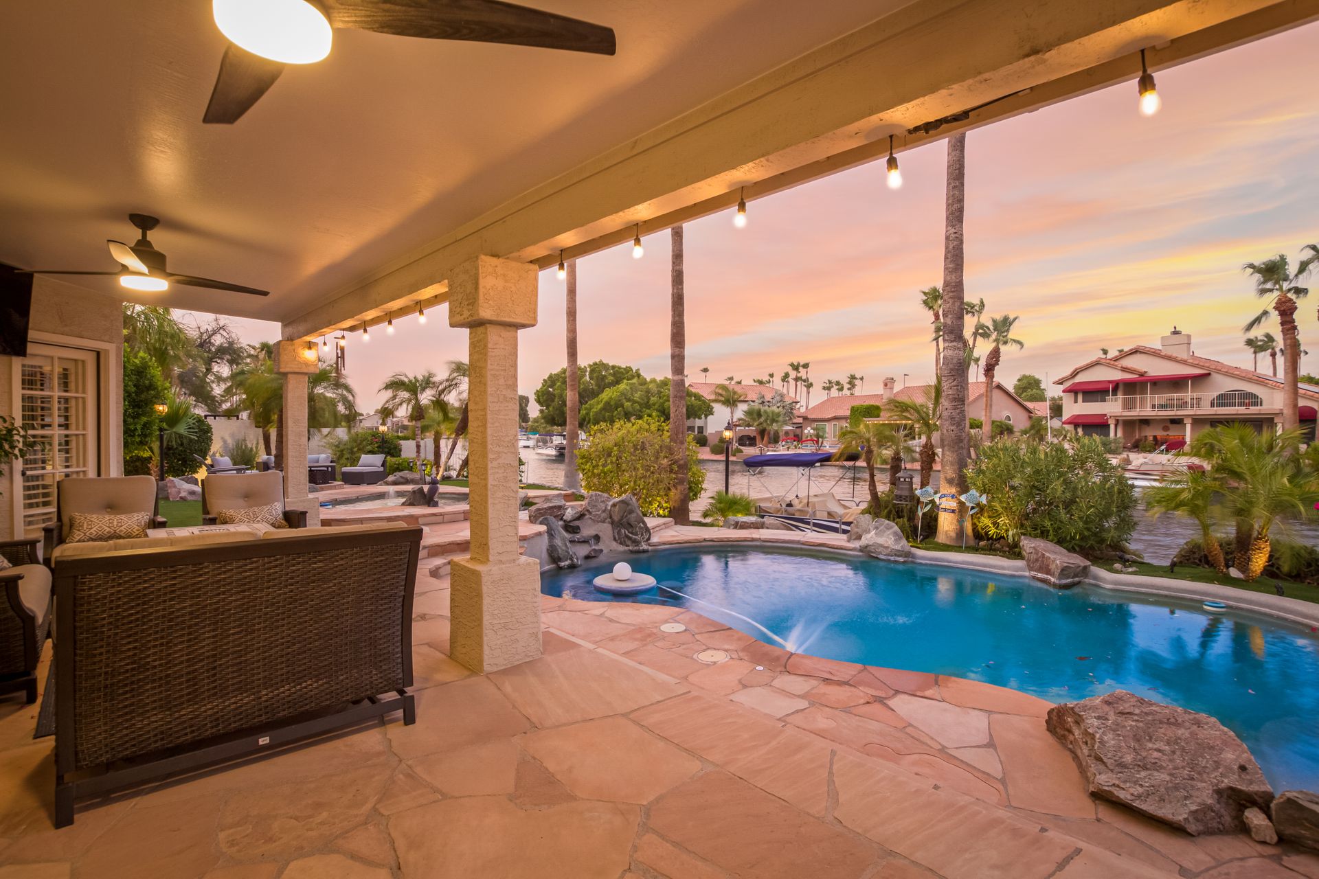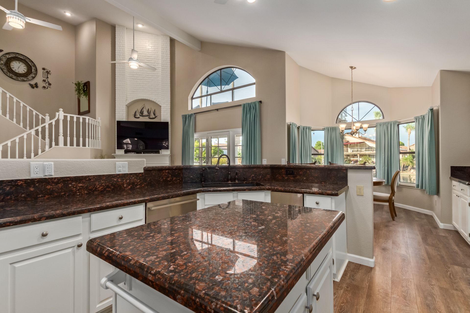 Welcome to Key Harbor, the epitome of waterfront living on The Islands in Gilbert, Arizona. This exquisite 3,126 square-foot, five-bedroom, two-and-one-half-bathroom home seamlessly combines luxurious comfort with breathtaking waterfront views. The open-concept living area is filled with natural light, showcasing stunning vistas. The kitchen features high-end Thermador appliances, granite countertops, and ample storage. The downstairs primary suite offers waterfront views, an en-suite bathroom with a jetted tub, a separate shower, and two walk-in closets. Upstairs, a coffee bar and four well-appointed bedrooms await. Make your way outside to the expansive patio, pool, heated spa, sitting areas, and built-in barbeque perfect for unwinding or hosting gatherings. Own this waterfront sanctuary and embrace an exceptional lifestyle of luxury, breathtaking views, and unparalleled lifestyle!