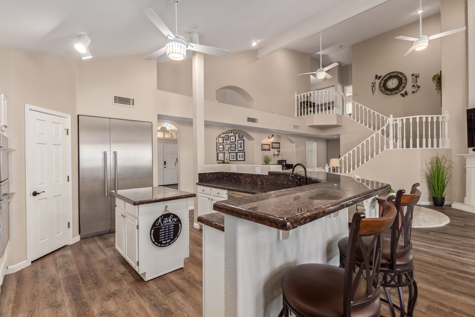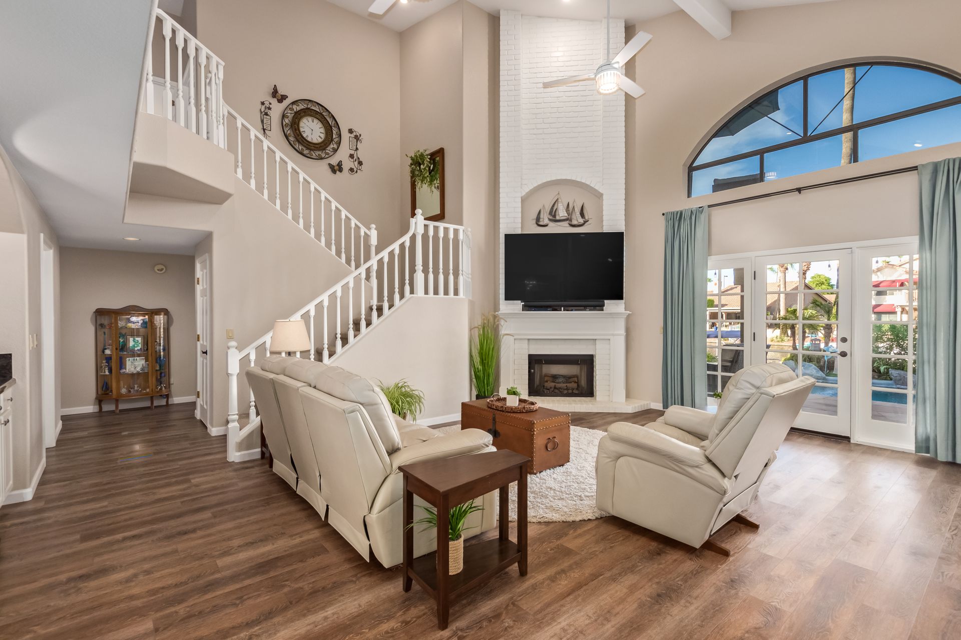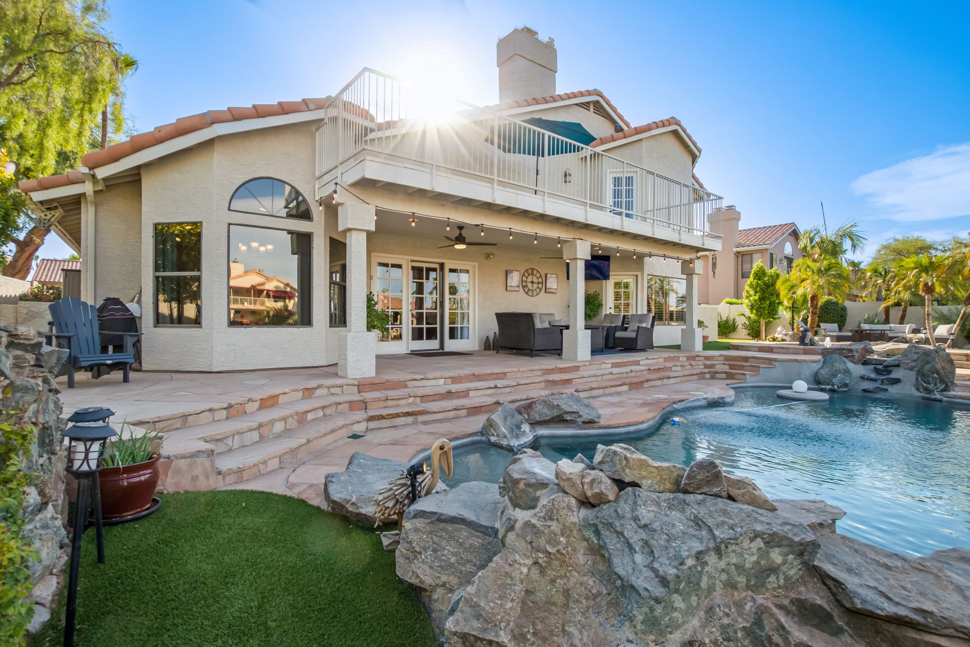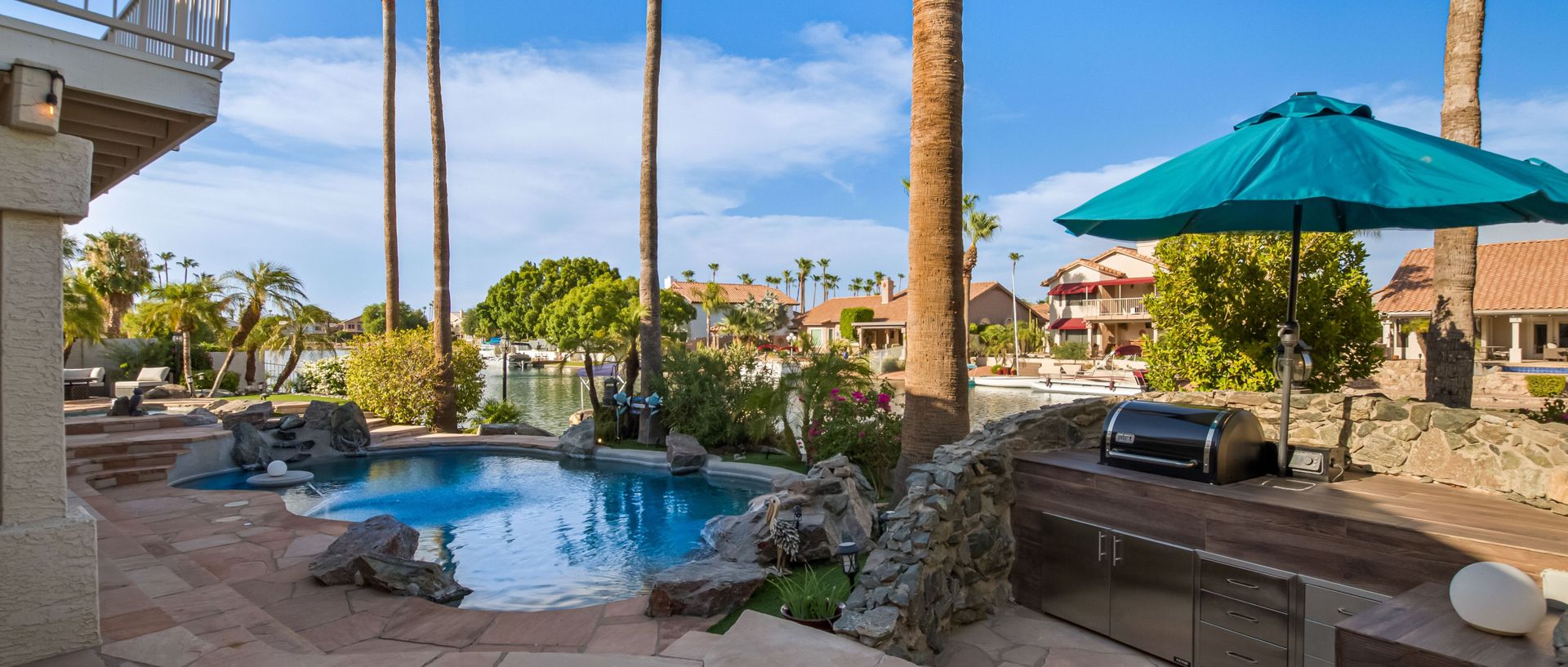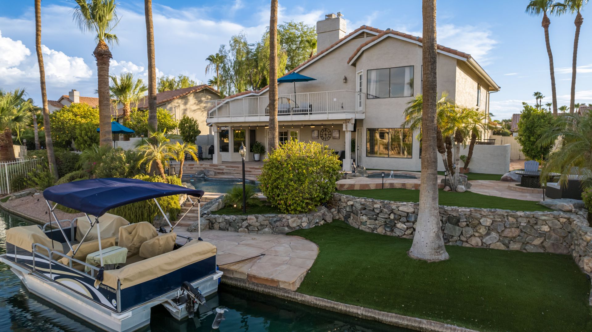 Welcome to Key Harbor, the epitome of waterfront living on The Islands in Gilbert, Arizona. This exquisite 3,126 square-foot, five-bedroom, two-and-one-half-bathroom home seamlessly combines luxurious comfort with breathtaking waterfront views. The open-concept living area is filled with natural light, showcasing stunning vistas. The kitchen features high-end Thermador appliances, granite countertops, and ample storage. The downstairs primary suite offers waterfront views, an en-suite bathroom with a jetted tub, a separate shower, and two walk-in closets. Upstairs, a coffee bar and four well-appointed bedrooms await. Make your way outside to the expansive patio, pool, heated spa, sitting areas, and built-in barbeque perfect for unwinding or hosting gatherings. Own this waterfront sanctuary and embrace an exceptional lifestyle of luxury, breathtaking views, and unparalleled lifestyle!