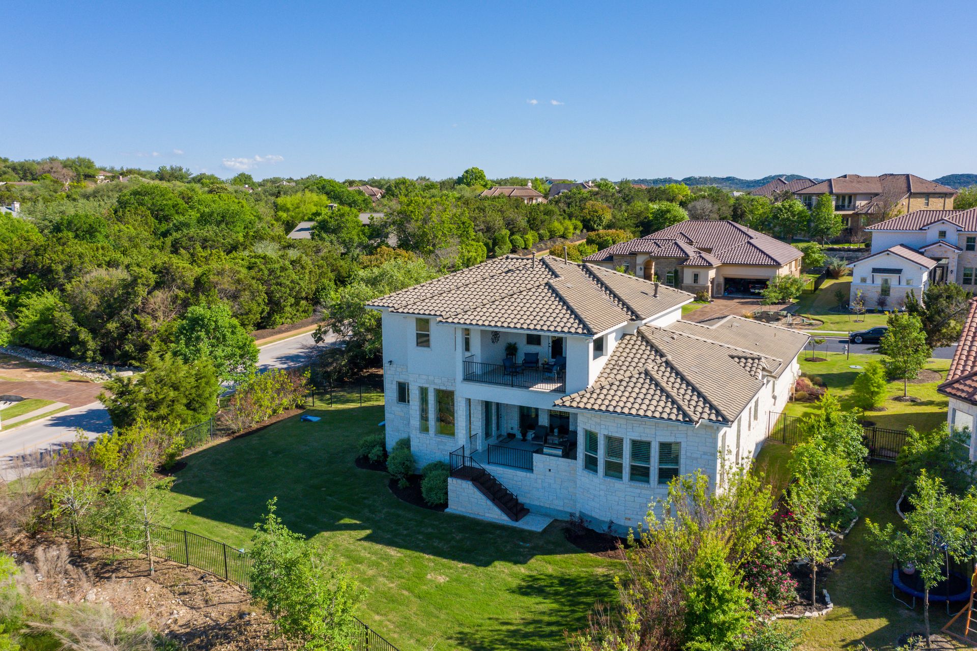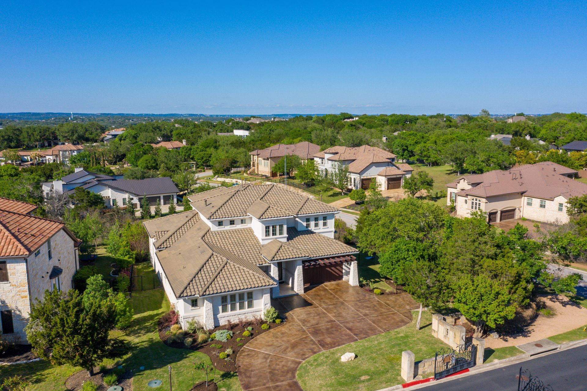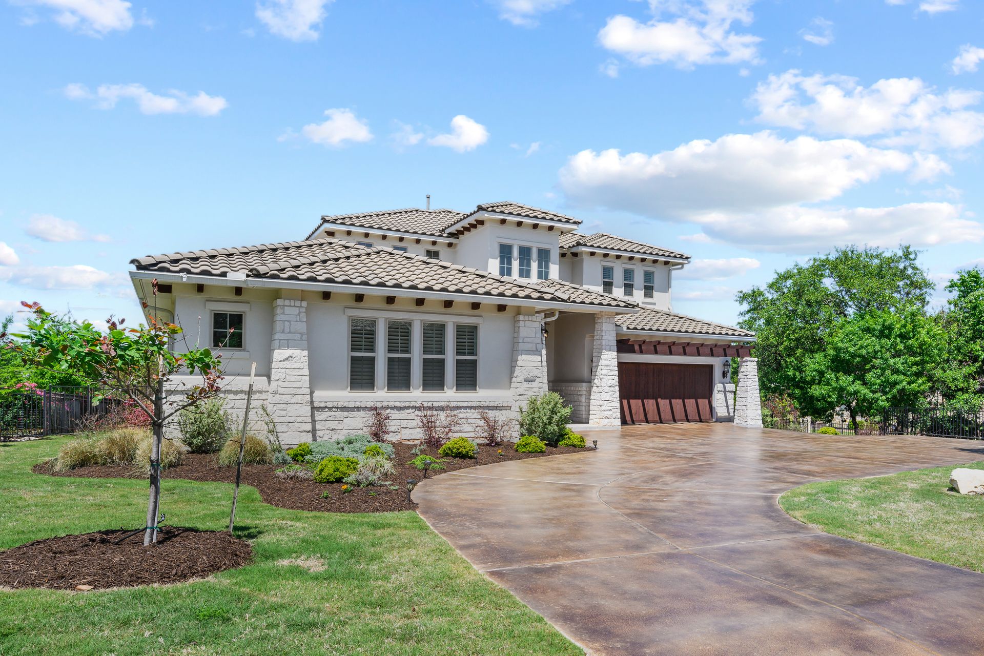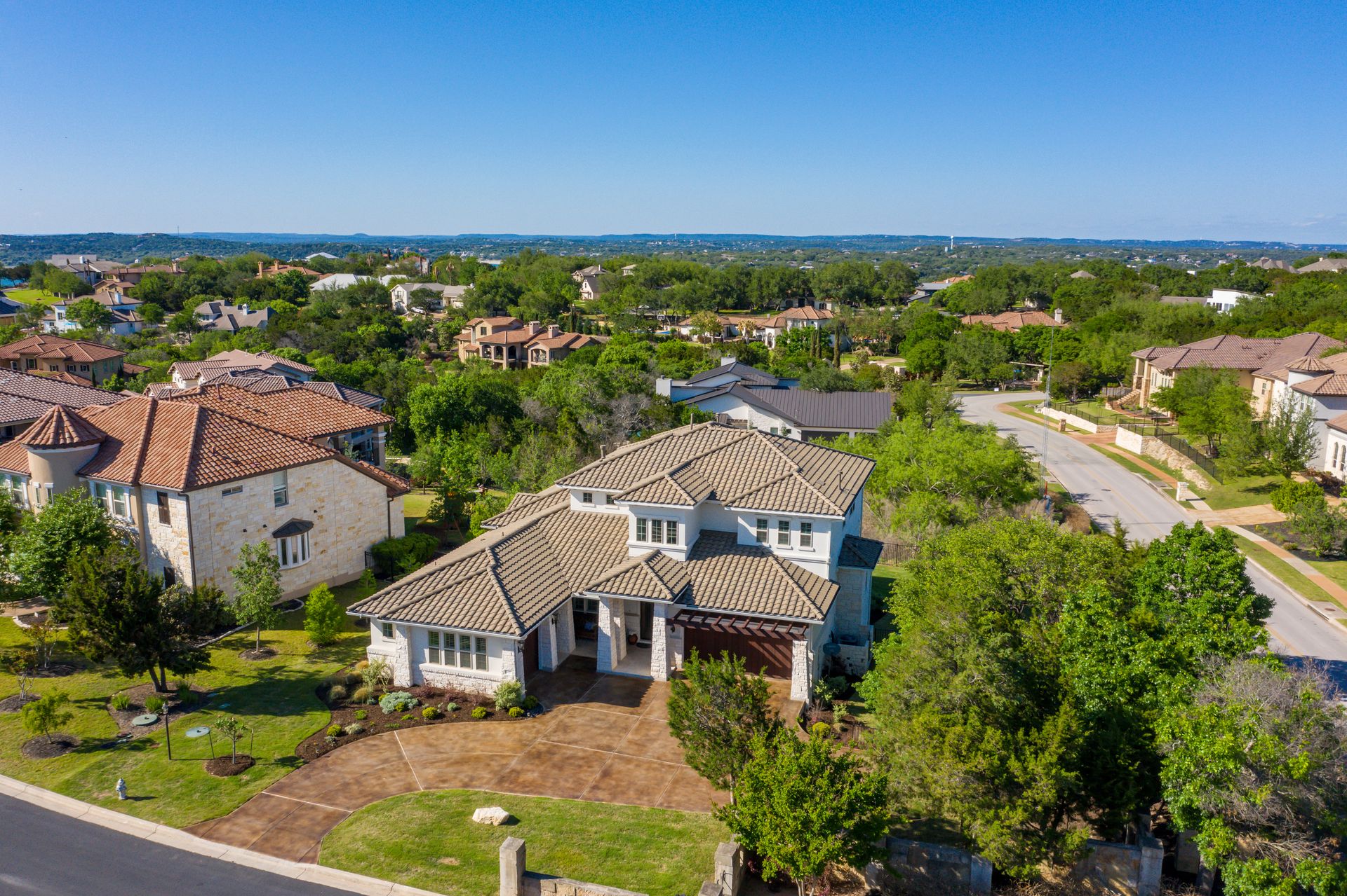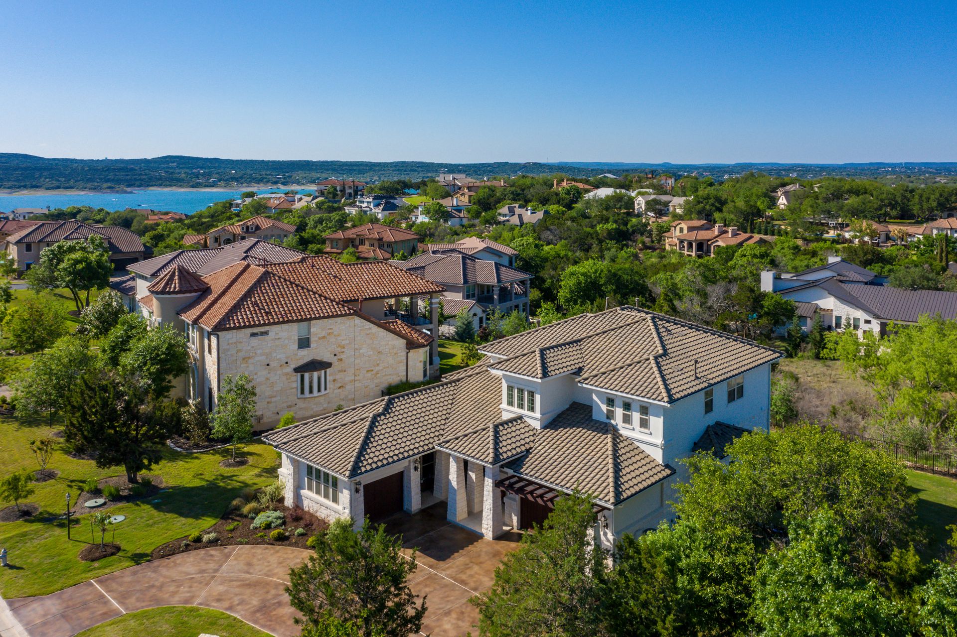 Hill Country Craftsman home is a true escape in the active boating and lifestyle community of The Enclave at Rough Hollow. This private corner half-acre + home site blends seamlessly into its surroundings and is complimented by the recently completed home with stately white limestone columns, concrete tile roof, stained corbels, and pergola. Transitional architectural details enhance the dramatic ceilings and custom lighting and window treatments throughout. Grand areas with a massive kitchen open to living area, informal and formal dining and covered outdoor living area with kitchen, all overlooking private fenced rear yard with room for pool and additional outdoor activities. Custom gray painted shaker style cabinets with quartz countertops and farmhouse sink are enhanced by Jenn-Air® appliances that includes four burner range with griddle, built-in ovens and microwave, built-in refrigerator and wine refrigerator. Private master wing with sitting area and a thoughtfully designed bath with dual vanities, dual closets, walk-in shower, soaking tub, shiplap walls and barn door entry. First floor guest suite in addition to a private office that is adjacent full bath and can also be used as an additional downstairs suite. Upstairs office with built-in cabinetry is secluded and adjacent to exercise room with full bath. Upstairs living area with covered outdoor living and two bedrooms and additional bath. The Enclave has two gated entrances and is ideally positioned for living convenience and is walking distance from the Rough Hollow Marina, Canyon Grille and gyms. The shopping and dining centers, and exemplary Lake Travis schools are just minutes away. Community has onsite marina and restaurant, 4 pools with lazy river, play scape, pet, and park areas, tennis, pickle, bocce, and basketball courts, dog park, soccer fields, two pavilions, 23 miles of hike and bike trails, stand up paddle boards, kayaks, ship store, onsite activity and HOA director.