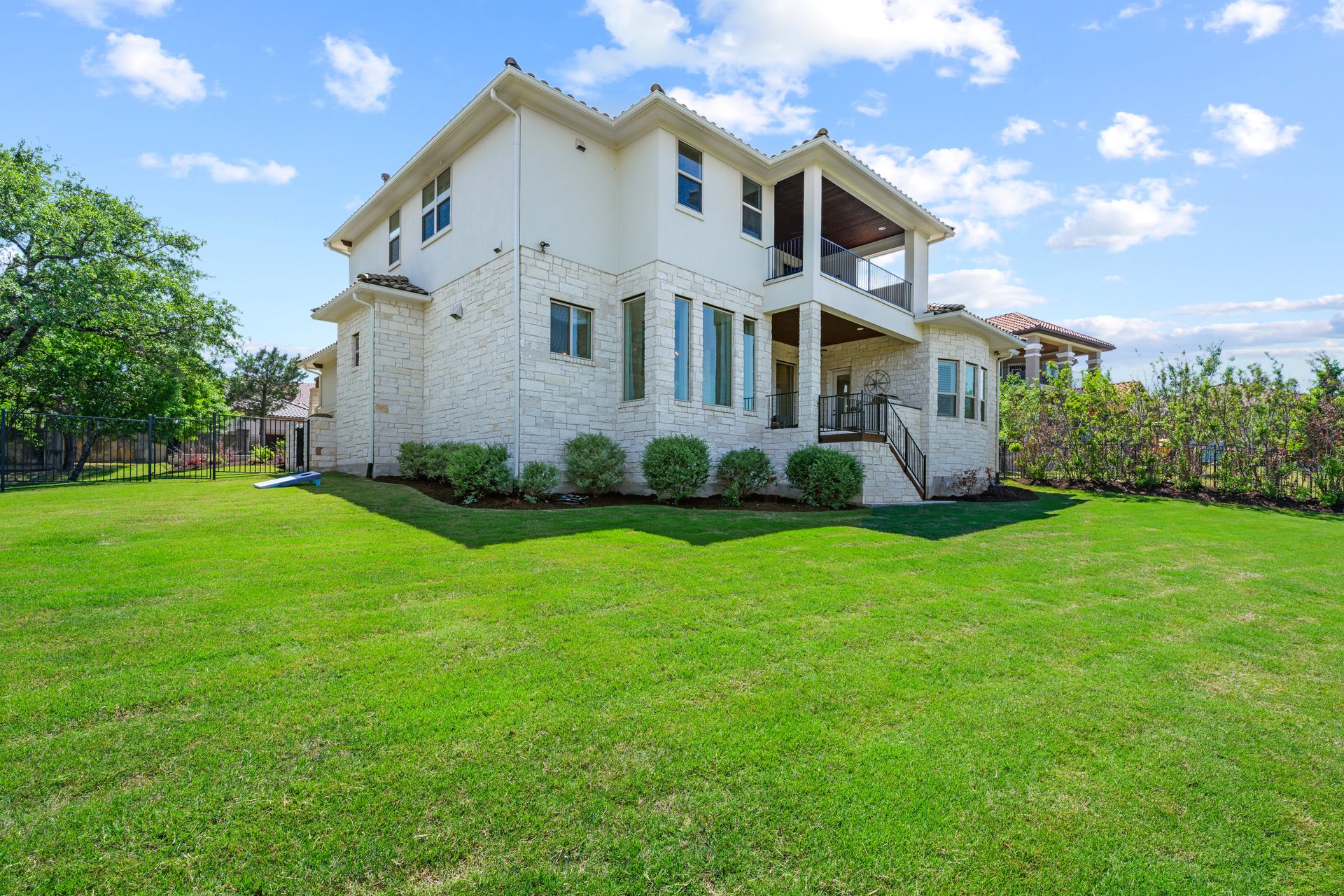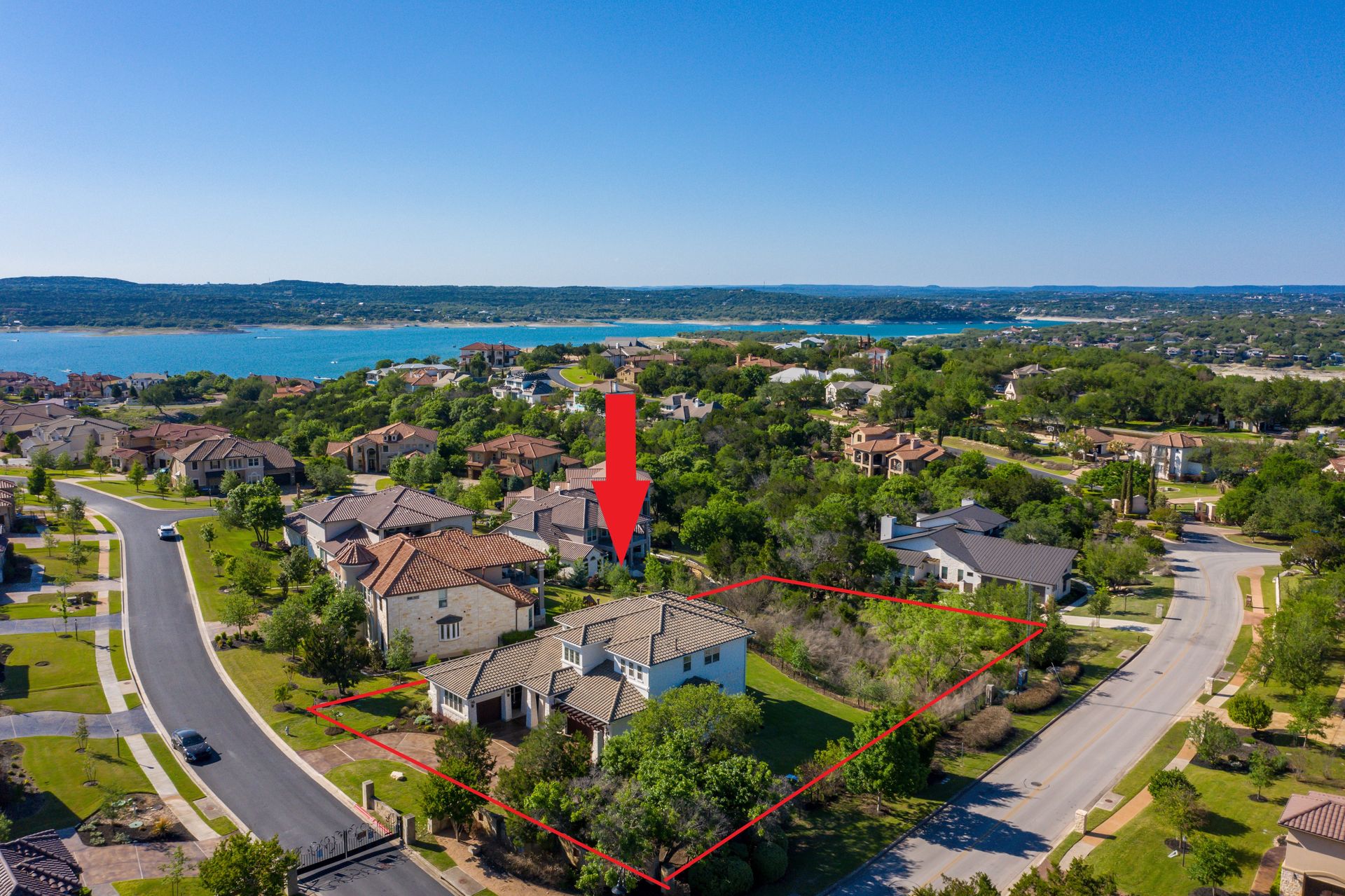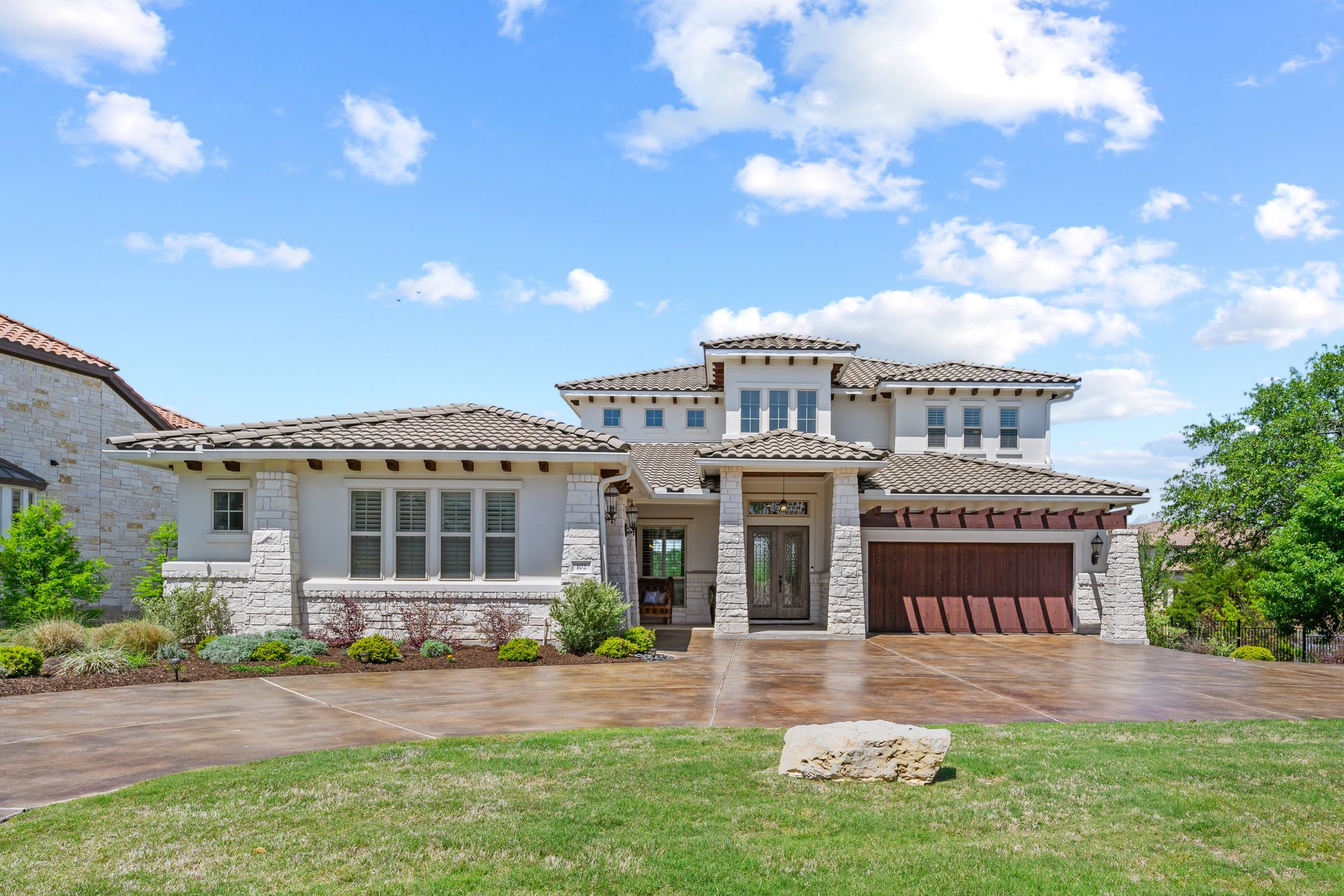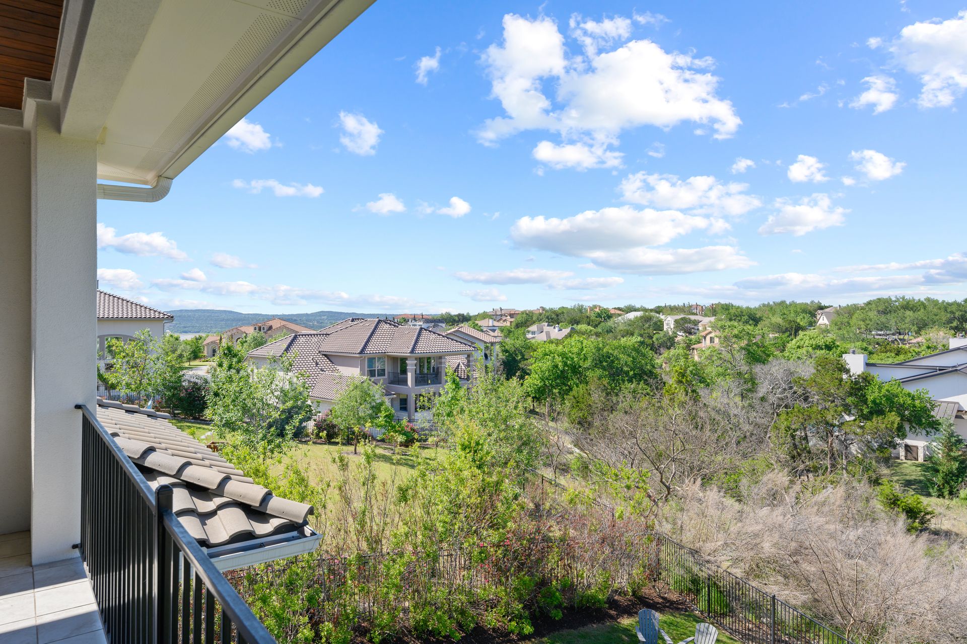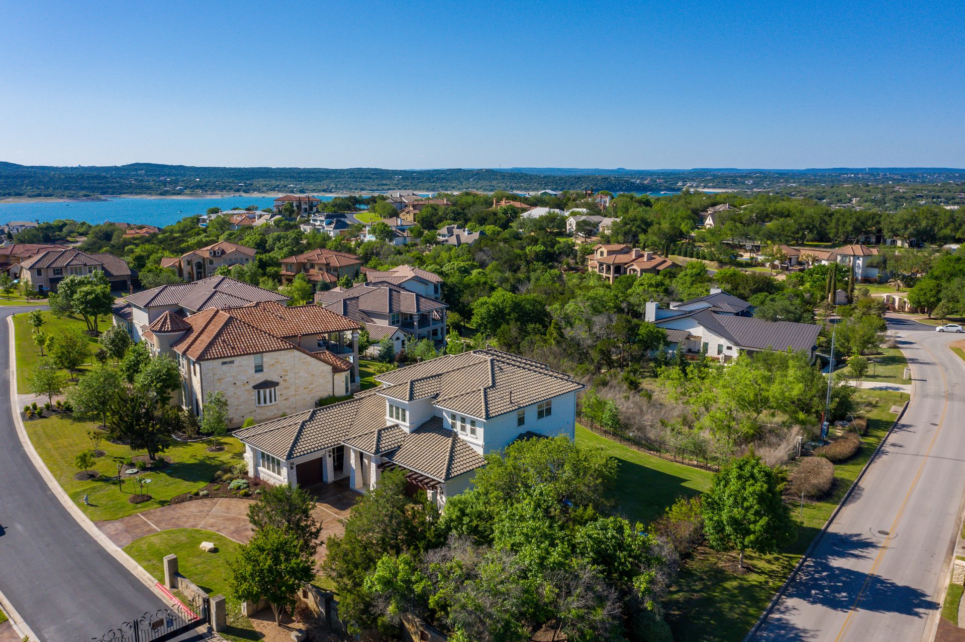 Hill Country Craftsman home is a true escape in the active boating and lifestyle community of The Enclave at Rough Hollow. This private corner half-acre + home site blends seamlessly into its surroundings and is complimented by the recently completed home with stately white limestone columns, concrete tile roof, stained corbels, and pergola. Transitional architectural details enhance the dramatic ceilings and custom lighting and window treatments throughout. Grand areas with a massive kitchen open to living area, informal and formal dining and covered outdoor living area with kitchen, all overlooking private fenced rear yard with room for pool and additional outdoor activities. Custom gray painted shaker style cabinets with quartz countertops and farmhouse sink are enhanced by Jenn-Air® appliances that includes four burner range with griddle, built-in ovens and microwave, built-in refrigerator and wine refrigerator. Private master wing with sitting area and a thoughtfully designed bath with dual vanities, dual closets, walk-in shower, soaking tub, shiplap walls and barn door entry. First floor guest suite in addition to a private office that is adjacent full bath and can also be used as an additional downstairs suite. Upstairs office with built-in cabinetry is secluded and adjacent to exercise room with full bath. Upstairs living area with covered outdoor living and two bedrooms and additional bath. The Enclave has two gated entrances and is ideally positioned for living convenience and is walking distance from the Rough Hollow Marina, Canyon Grille and gyms. The shopping and dining centers, and exemplary Lake Travis schools are just minutes away. Community has onsite marina and restaurant, 4 pools with lazy river, play scape, pet, and park areas, tennis, pickle, bocce, and basketball courts, dog park, soccer fields, two pavilions, 23 miles of hike and bike trails, stand up paddle boards, kayaks, ship store, onsite activity and HOA director.