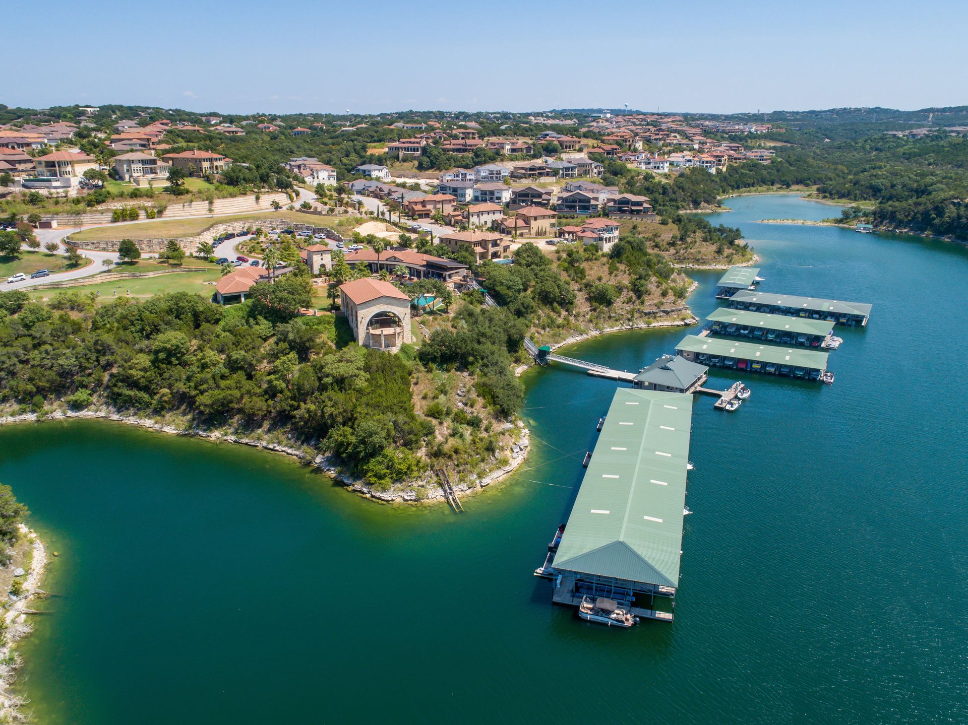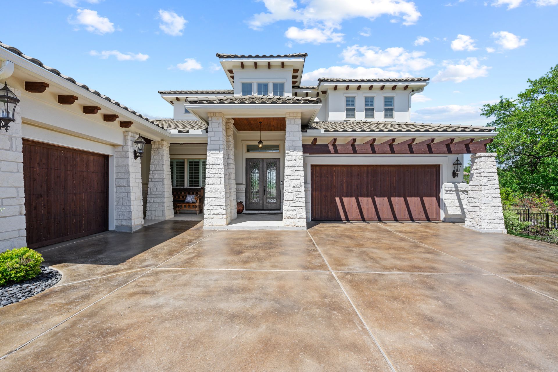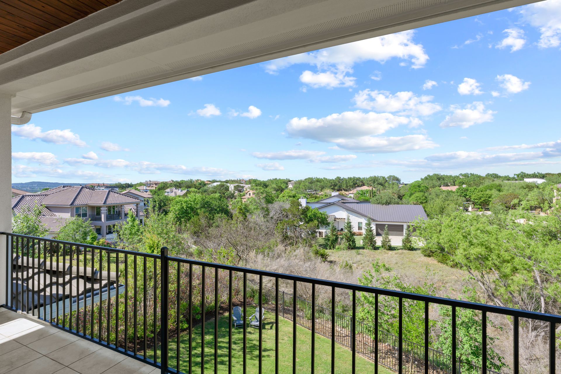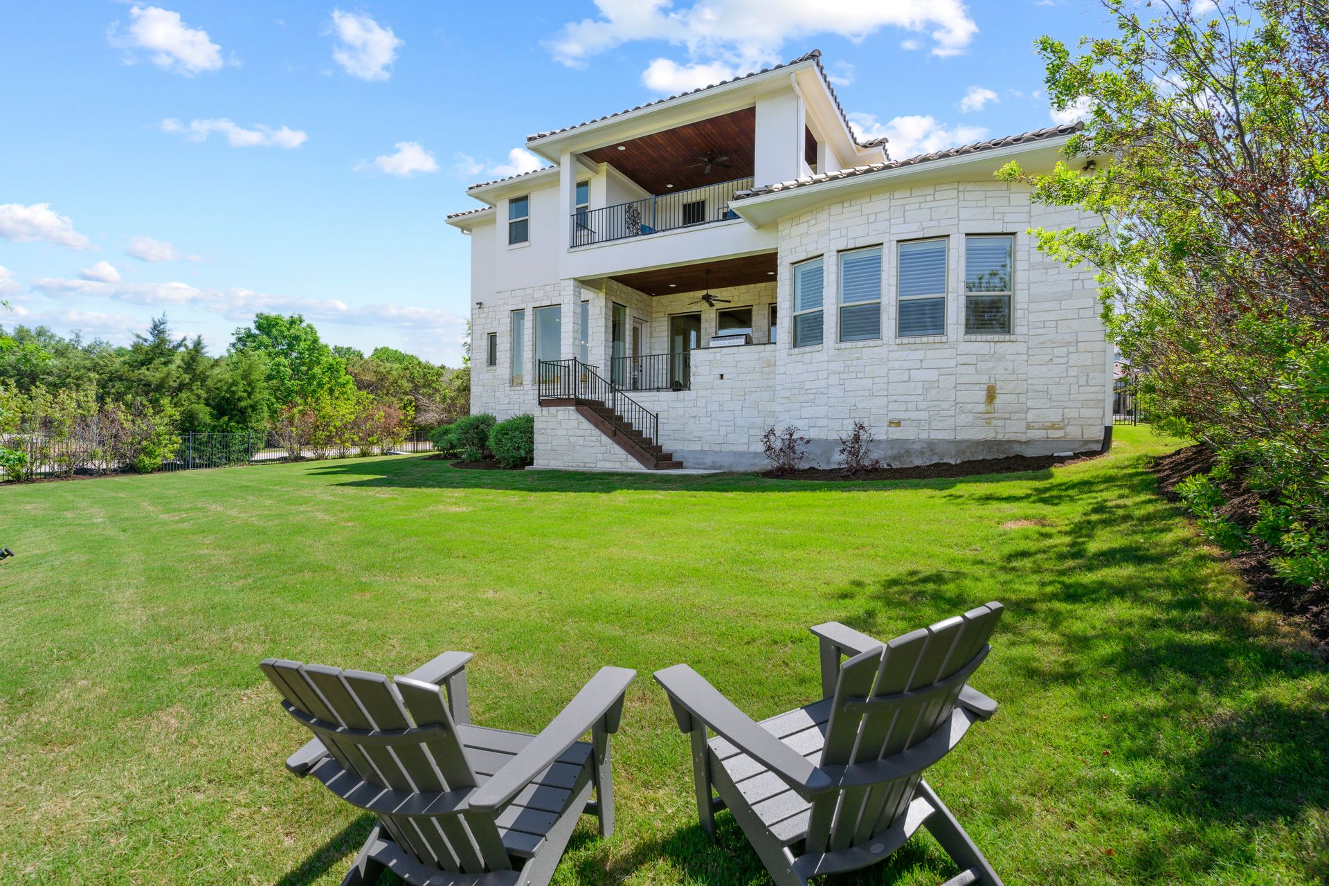 Hill Country Craftsman home is a true escape in the active boating and lifestyle community of The Enclave at Rough Hollow. This private corner half-acre + home site blends seamlessly into its surroundings and is complimented by the recently completed home with stately white limestone columns, concrete tile roof, stained corbels, and pergola. Transitional architectural details enhance the dramatic ceilings and custom lighting and window treatments throughout. Grand areas with a massive kitchen open to living area, informal and formal dining and covered outdoor living area with kitchen, all overlooking private fenced rear yard with room for pool and additional outdoor activities. Custom gray painted shaker style cabinets with quartz countertops and farmhouse sink are enhanced by Jenn-Air® appliances that includes four burner range with griddle, built-in ovens and microwave, built-in refrigerator and wine refrigerator. Private master wing with sitting area and a thoughtfully designed bath with dual vanities, dual closets, walk-in shower, soaking tub, shiplap walls and barn door entry. First floor guest suite in addition to a private office that is adjacent full bath and can also be used as an additional downstairs suite. Upstairs office with built-in cabinetry is secluded and adjacent to exercise room with full bath. Upstairs living area with covered outdoor living and two bedrooms and additional bath. The Enclave has two gated entrances and is ideally positioned for living convenience and is walking distance from the Rough Hollow Marina, Canyon Grille and gyms. The shopping and dining centers, and exemplary Lake Travis schools are just minutes away. Community has onsite marina and restaurant, 4 pools with lazy river, play scape, pet, and park areas, tennis, pickle, bocce, and basketball courts, dog park, soccer fields, two pavilions, 23 miles of hike and bike trails, stand up paddle boards, kayaks, ship store, onsite activity and HOA director.
