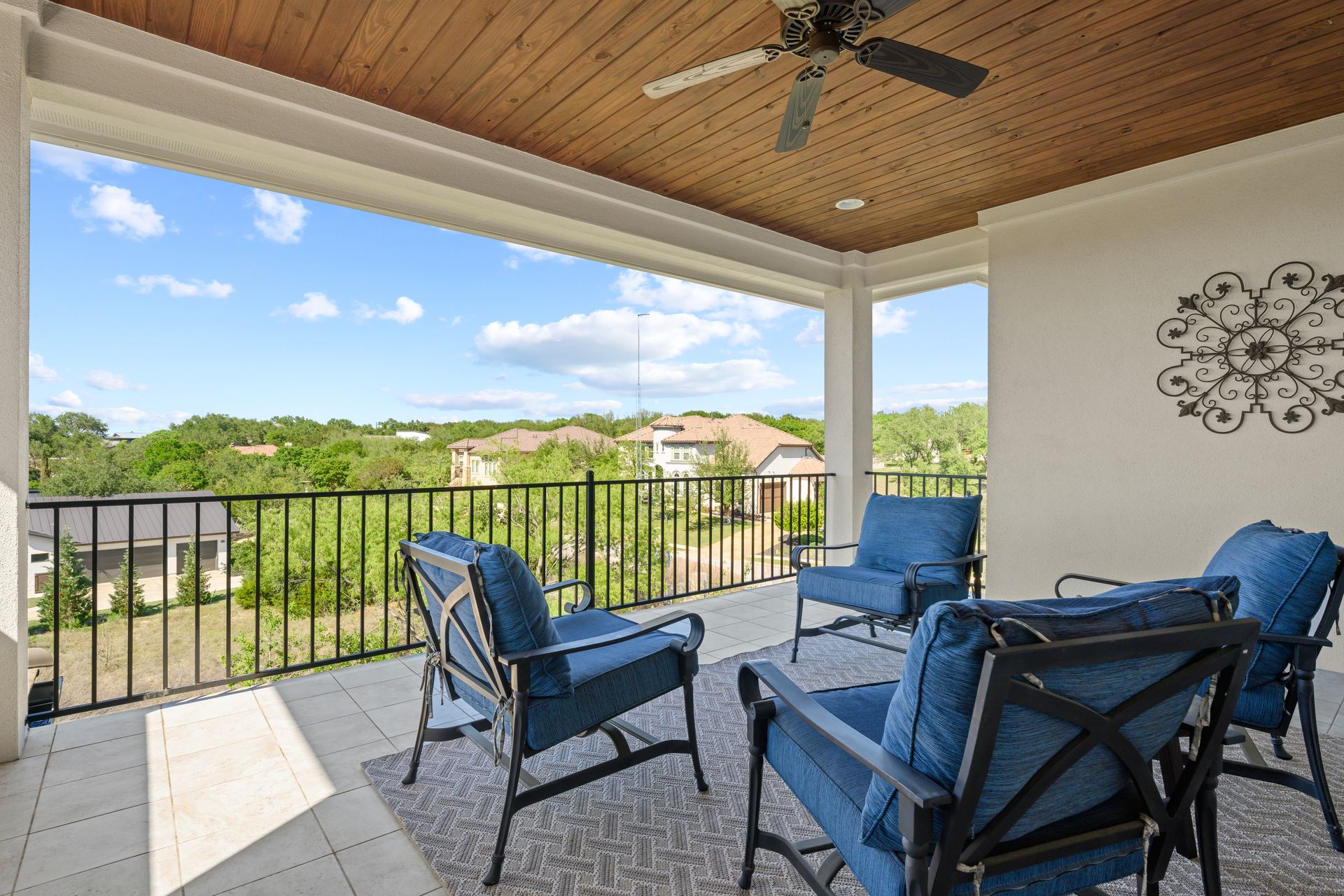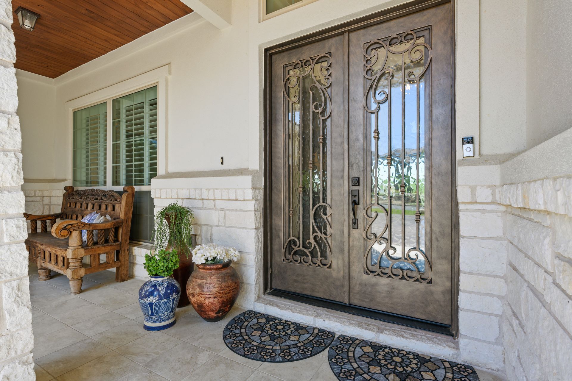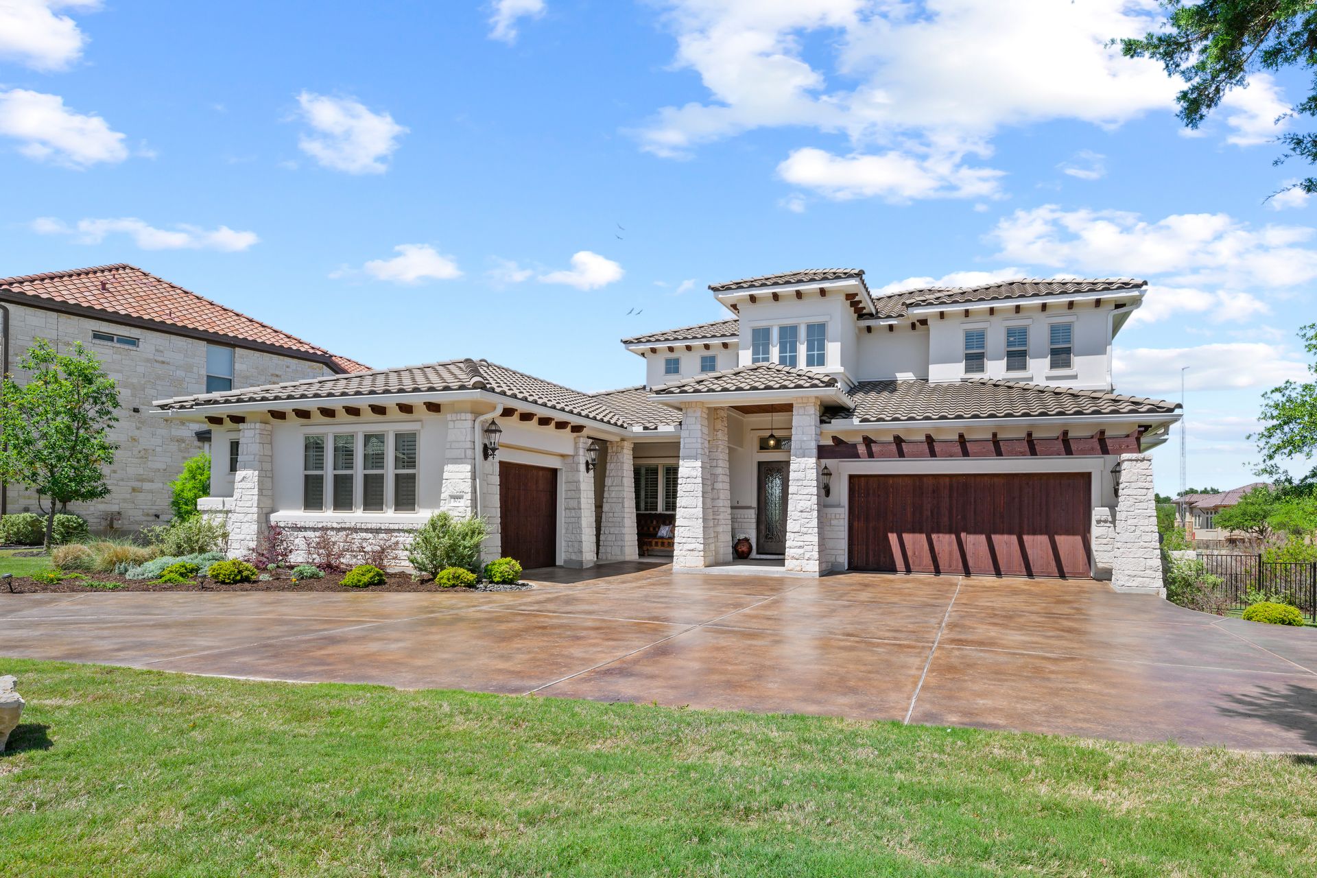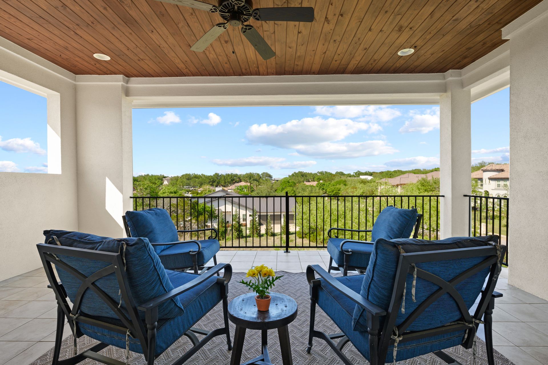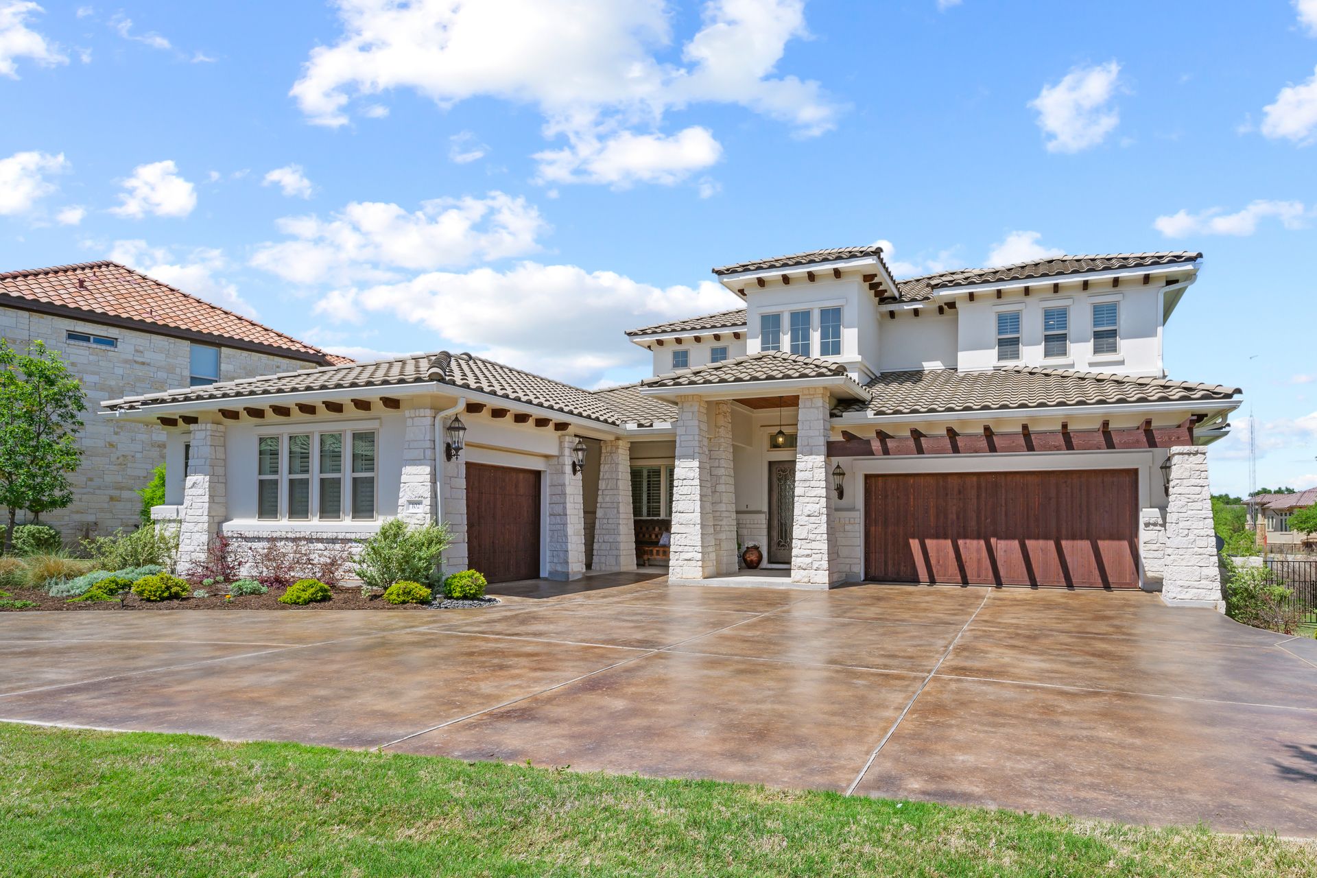 Hill Country Craftsman home is a true escape in the active boating and lifestyle community of The Enclave at Rough Hollow. This private corner half-acre + home site blends seamlessly into its surroundings and is complimented by the recently completed home with stately white limestone columns, concrete tile roof, stained corbels, and pergola. Transitional architectural details enhance the dramatic ceilings and custom lighting and window treatments throughout. Grand areas with a massive kitchen open to living area, informal and formal dining and covered outdoor living area with kitchen, all overlooking private fenced rear yard with room for pool and additional outdoor activities. Custom gray painted shaker style cabinets with quartz countertops and farmhouse sink are enhanced by Jenn-Air® appliances that includes four burner range with griddle, built-in ovens and microwave, built-in refrigerator and wine refrigerator. Private master wing with sitting area and a thoughtfully designed bath with dual vanities, dual closets, walk-in shower, soaking tub, shiplap walls and barn door entry. First floor guest suite in addition to a private office that is adjacent full bath and can also be used as an additional downstairs suite. Upstairs office with built-in cabinetry is secluded and adjacent to exercise room with full bath. Upstairs living area with covered outdoor living and two bedrooms and additional bath. The Enclave has two gated entrances and is ideally positioned for living convenience and is walking distance from the Rough Hollow Marina, Canyon Grille and gyms. The shopping and dining centers, and exemplary Lake Travis schools are just minutes away. Community has onsite marina and restaurant, 4 pools with lazy river, play scape, pet, and park areas, tennis, pickle, bocce, and basketball courts, dog park, soccer fields, two pavilions, 23 miles of hike and bike trails, stand up paddle boards, kayaks, ship store, onsite activity and HOA director.