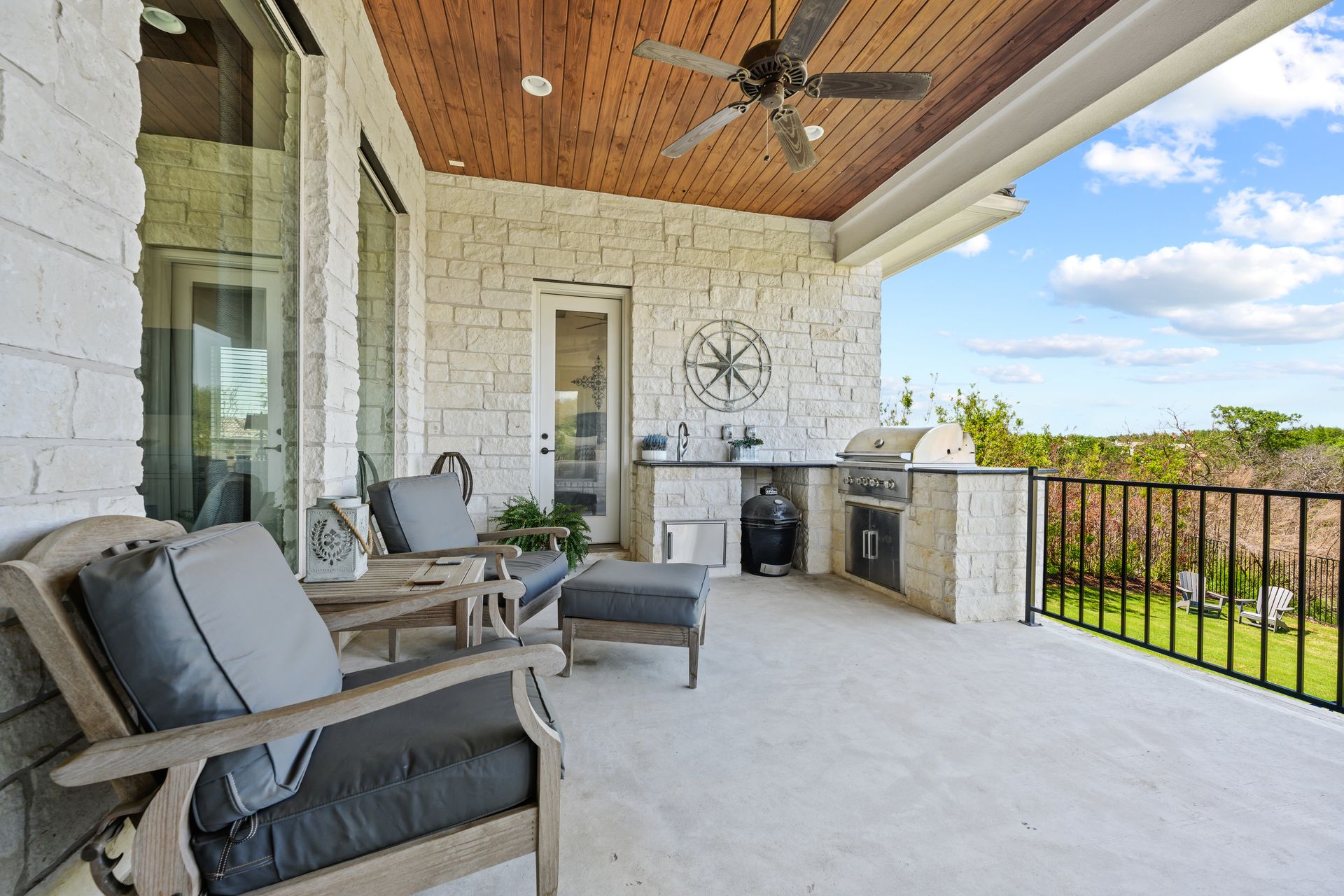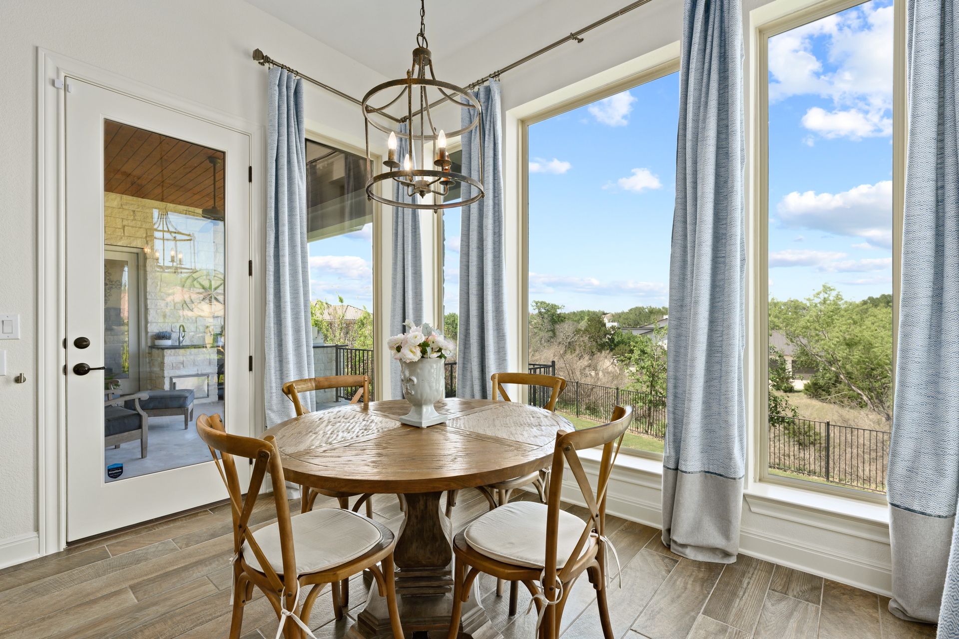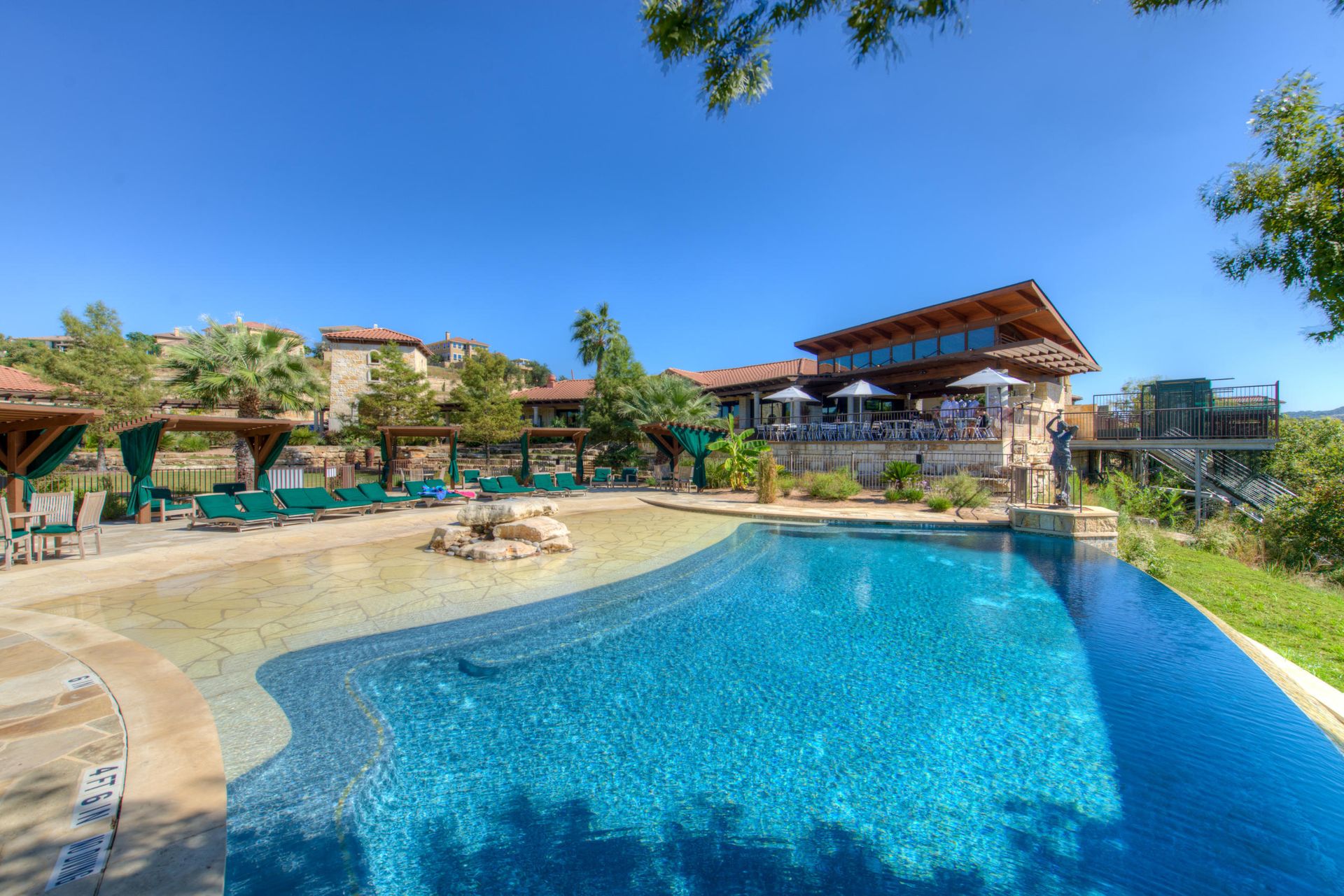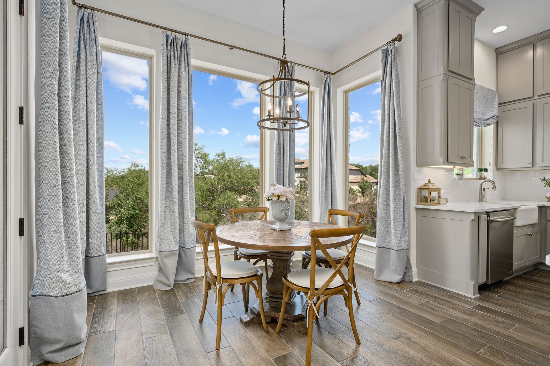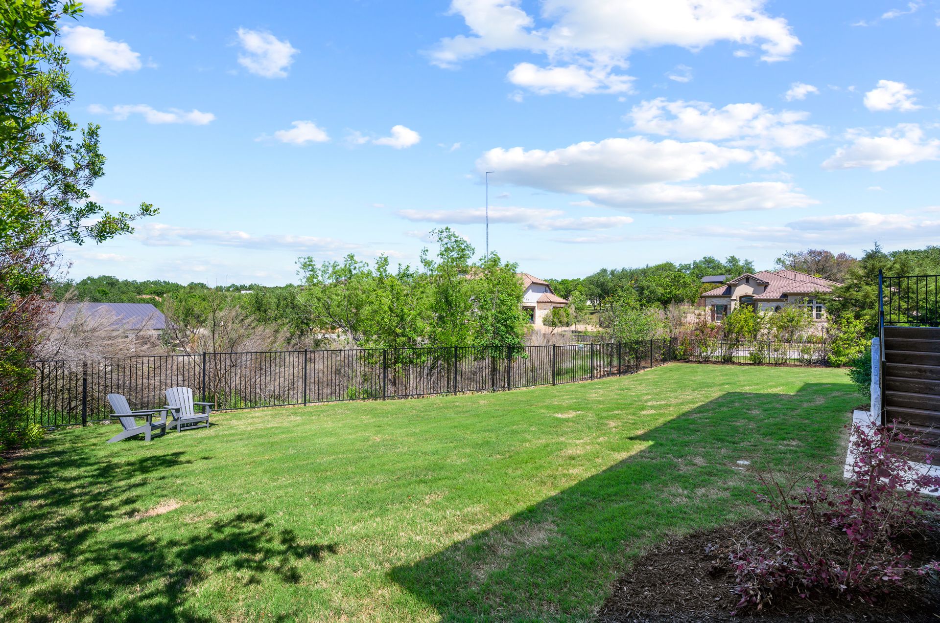 Hill Country Craftsman home is a true escape in the active boating and lifestyle community of The Enclave at Rough Hollow. This private corner half-acre + home site blends seamlessly into its surroundings and is complimented by the recently completed home with stately white limestone columns, concrete tile roof, stained corbels, and pergola. Transitional architectural details enhance the dramatic ceilings and custom lighting and window treatments throughout. Grand areas with a massive kitchen open to living area, informal and formal dining and covered outdoor living area with kitchen, all overlooking private fenced rear yard with room for pool and additional outdoor activities. Custom gray painted shaker style cabinets with quartz countertops and farmhouse sink are enhanced by Jenn-Air® appliances that includes four burner range with griddle, built-in ovens and microwave, built-in refrigerator and wine refrigerator. Private master wing with sitting area and a thoughtfully designed bath with dual vanities, dual closets, walk-in shower, soaking tub, shiplap walls and barn door entry. First floor guest suite in addition to a private office that is adjacent full bath and can also be used as an additional downstairs suite. Upstairs office with built-in cabinetry is secluded and adjacent to exercise room with full bath. Upstairs living area with covered outdoor living and two bedrooms and additional bath. The Enclave has two gated entrances and is ideally positioned for living convenience and is walking distance from the Rough Hollow Marina, Canyon Grille and gyms. The shopping and dining centers, and exemplary Lake Travis schools are just minutes away. Community has onsite marina and restaurant, 4 pools with lazy river, play scape, pet, and park areas, tennis, pickle, bocce, and basketball courts, dog park, soccer fields, two pavilions, 23 miles of hike and bike trails, stand up paddle boards, kayaks, ship store, onsite activity and HOA director.