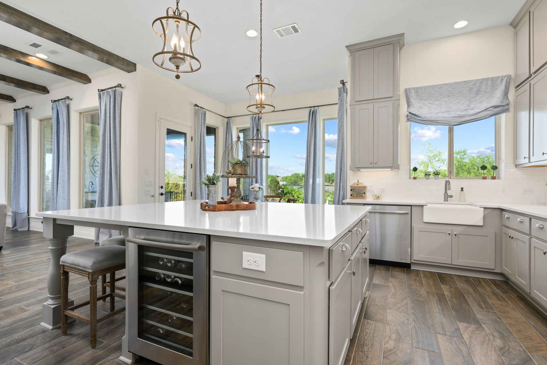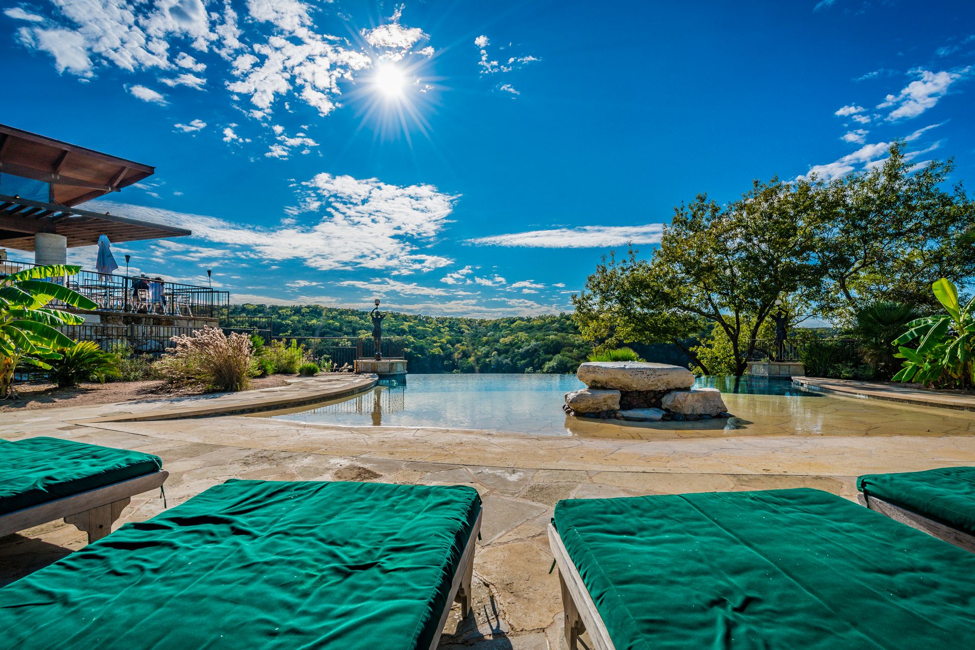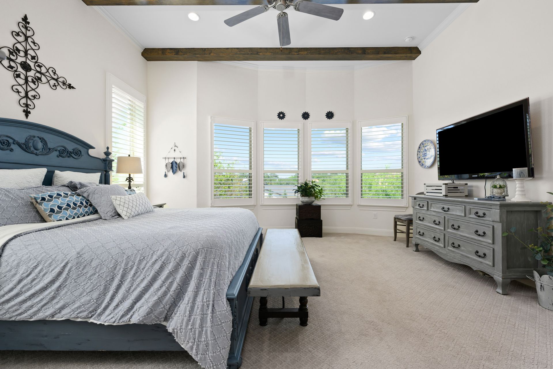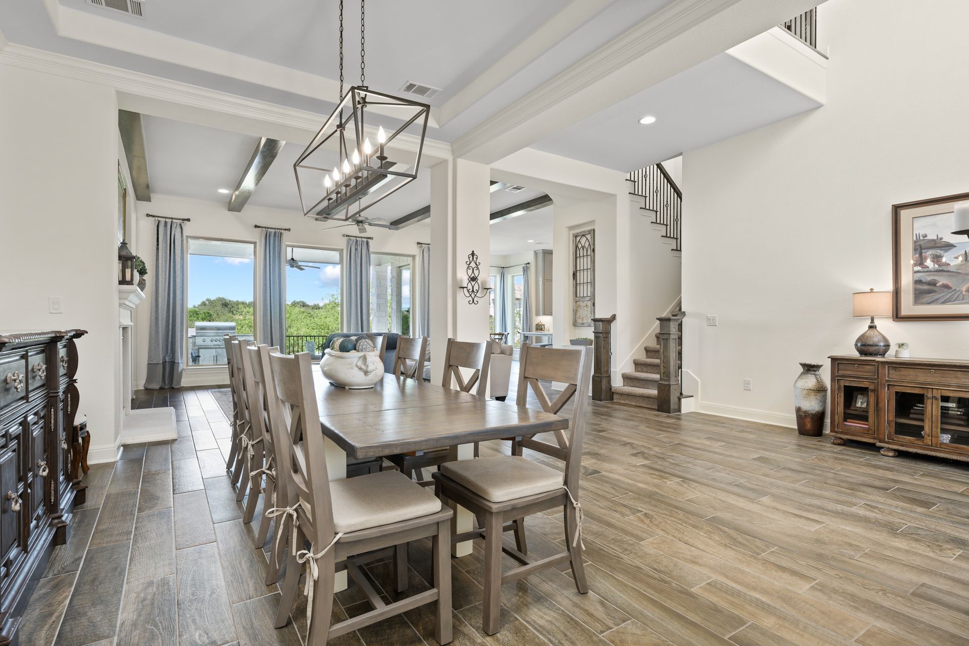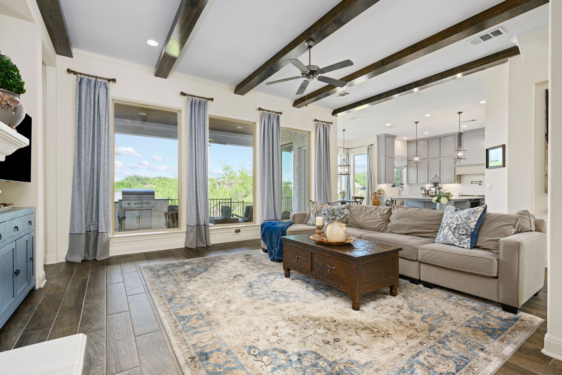 Hill Country Craftsman home is a true escape in the active boating and lifestyle community of The Enclave at Rough Hollow. This private corner half-acre + home site blends seamlessly into its surroundings and is complimented by the recently completed home with stately white limestone columns, concrete tile roof, stained corbels, and pergola. Transitional architectural details enhance the dramatic ceilings and custom lighting and window treatments throughout. Grand areas with a massive kitchen open to living area, informal and formal dining and covered outdoor living area with kitchen, all overlooking private fenced rear yard with room for pool and additional outdoor activities. Custom gray painted shaker style cabinets with quartz countertops and farmhouse sink are enhanced by Jenn-Air® appliances that includes four burner range with griddle, built-in ovens and microwave, built-in refrigerator and wine refrigerator. Private master wing with sitting area and a thoughtfully designed bath with dual vanities, dual closets, walk-in shower, soaking tub, shiplap walls and barn door entry. First floor guest suite in addition to a private office that is adjacent full bath and can also be used as an additional downstairs suite. Upstairs office with built-in cabinetry is secluded and adjacent to exercise room with full bath. Upstairs living area with covered outdoor living and two bedrooms and additional bath. The Enclave has two gated entrances and is ideally positioned for living convenience and is walking distance from the Rough Hollow Marina, Canyon Grille and gyms. The shopping and dining centers, and exemplary Lake Travis schools are just minutes away. Community has onsite marina and restaurant, 4 pools with lazy river, play scape, pet, and park areas, tennis, pickle, bocce, and basketball courts, dog park, soccer fields, two pavilions, 23 miles of hike and bike trails, stand up paddle boards, kayaks, ship store, onsite activity and HOA director.
