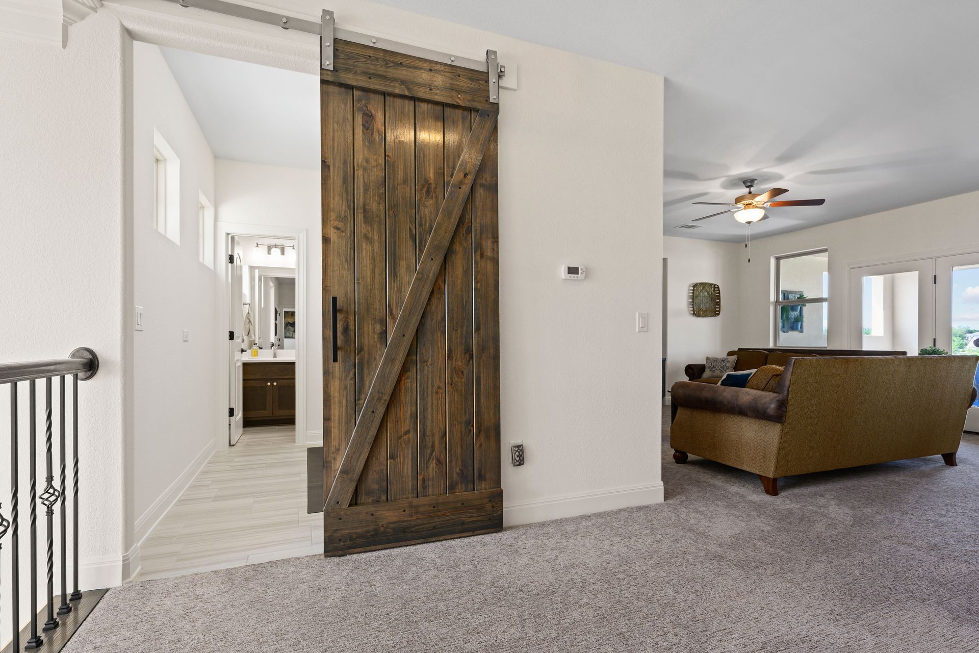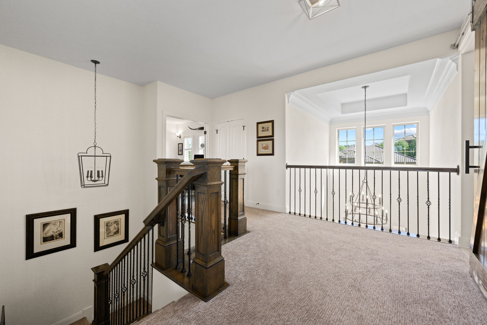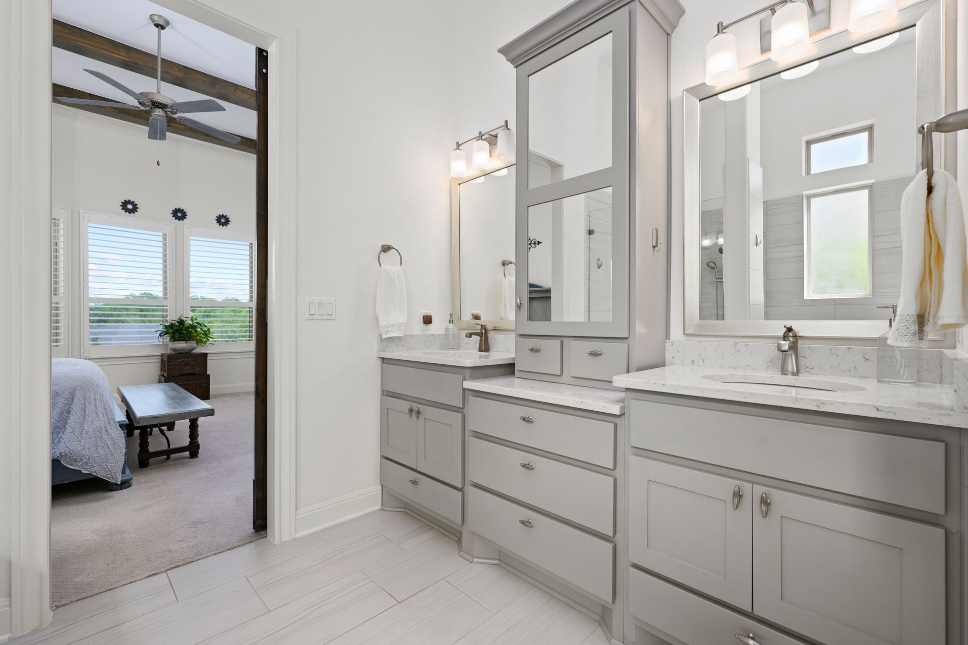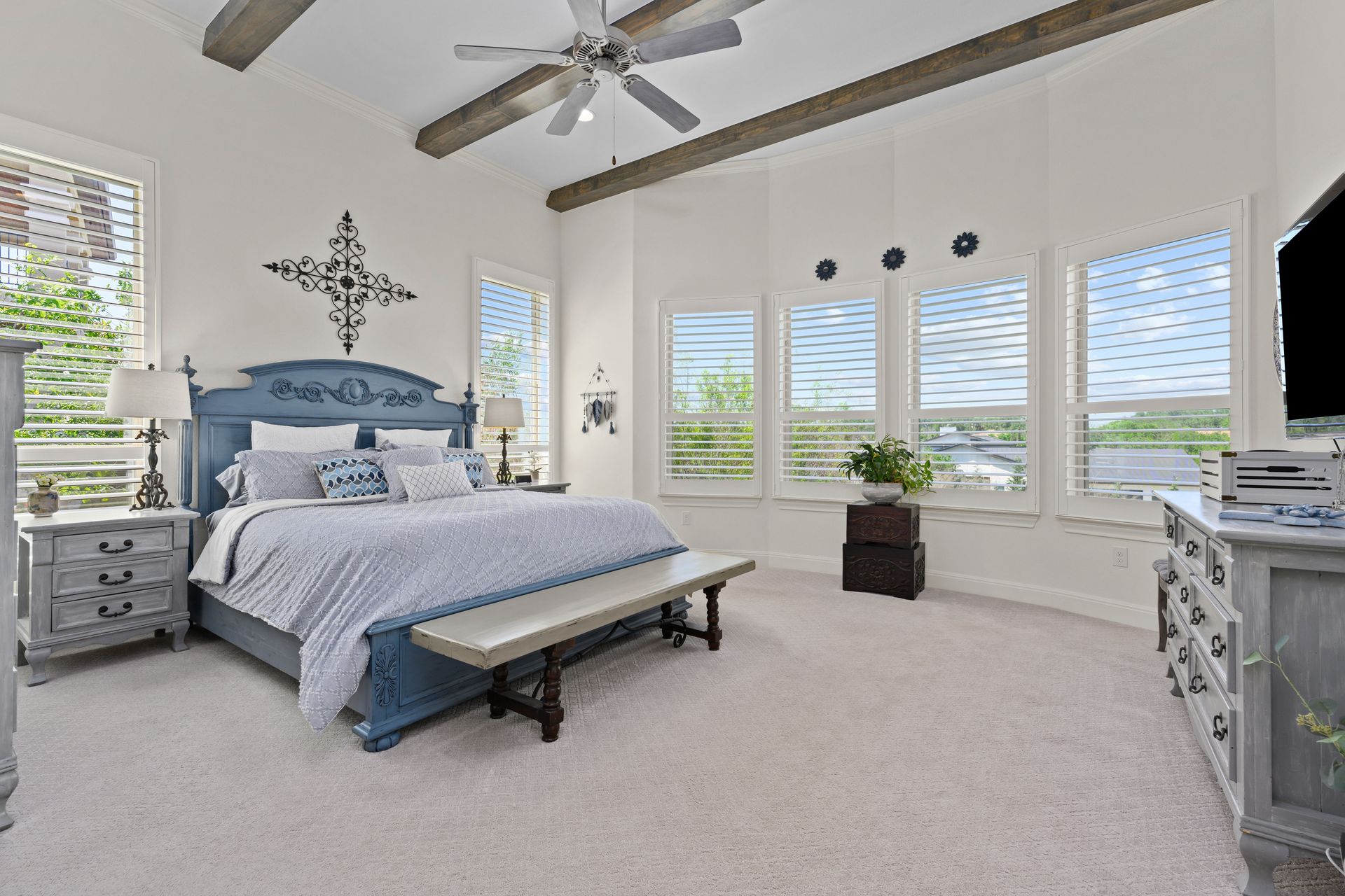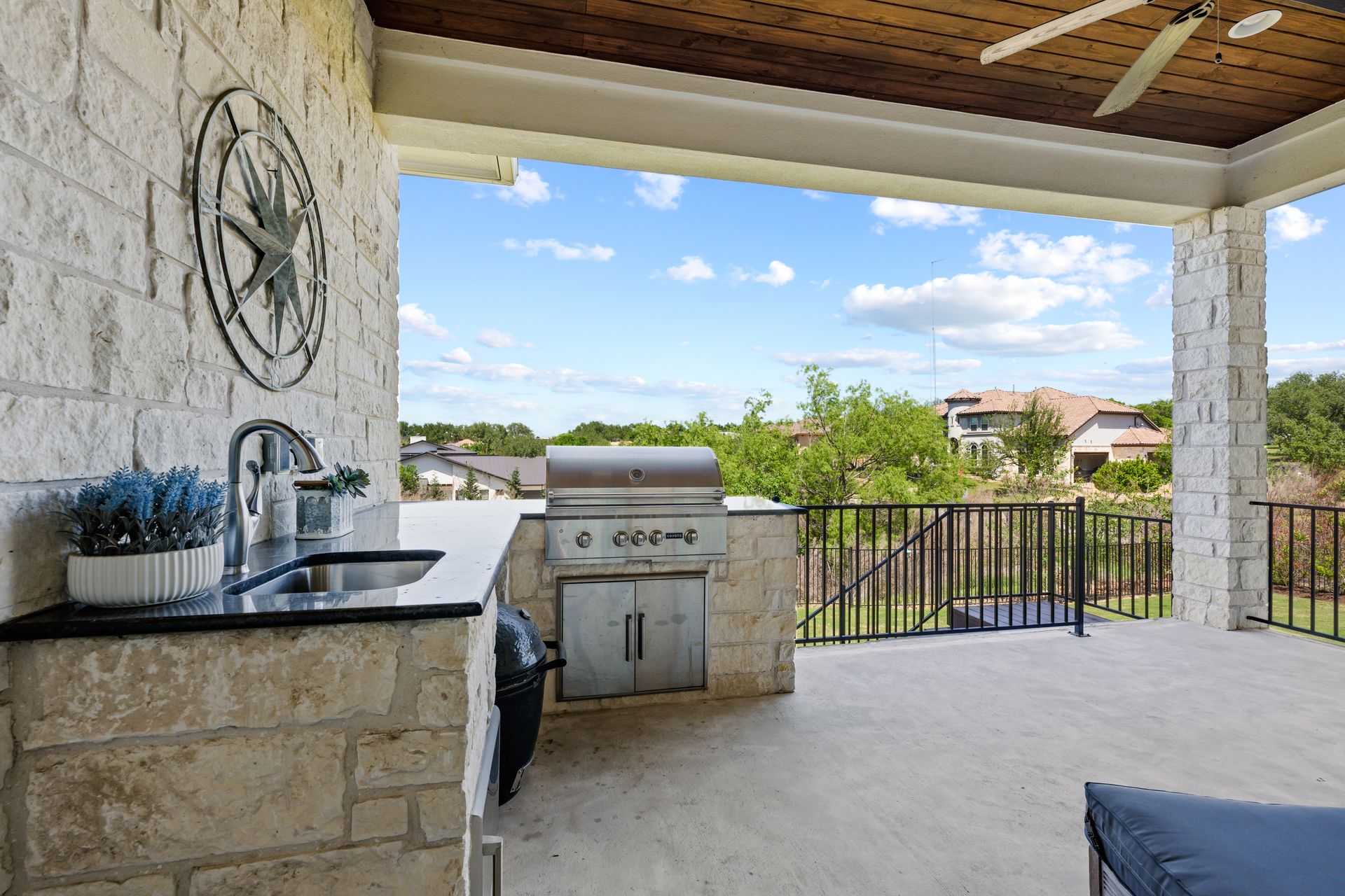 Hill Country Craftsman home is a true escape in the active boating and lifestyle community of The Enclave at Rough Hollow. This private corner half-acre + home site blends seamlessly into its surroundings and is complimented by the recently completed home with stately white limestone columns, concrete tile roof, stained corbels, and pergola. Transitional architectural details enhance the dramatic ceilings and custom lighting and window treatments throughout. Grand areas with a massive kitchen open to living area, informal and formal dining and covered outdoor living area with kitchen, all overlooking private fenced rear yard with room for pool and additional outdoor activities. Custom gray painted shaker style cabinets with quartz countertops and farmhouse sink are enhanced by Jenn-Air® appliances that includes four burner range with griddle, built-in ovens and microwave, built-in refrigerator and wine refrigerator. Private master wing with sitting area and a thoughtfully designed bath with dual vanities, dual closets, walk-in shower, soaking tub, shiplap walls and barn door entry. First floor guest suite in addition to a private office that is adjacent full bath and can also be used as an additional downstairs suite. Upstairs office with built-in cabinetry is secluded and adjacent to exercise room with full bath. Upstairs living area with covered outdoor living and two bedrooms and additional bath. The Enclave has two gated entrances and is ideally positioned for living convenience and is walking distance from the Rough Hollow Marina, Canyon Grille and gyms. The shopping and dining centers, and exemplary Lake Travis schools are just minutes away. Community has onsite marina and restaurant, 4 pools with lazy river, play scape, pet, and park areas, tennis, pickle, bocce, and basketball courts, dog park, soccer fields, two pavilions, 23 miles of hike and bike trails, stand up paddle boards, kayaks, ship store, onsite activity and HOA director.