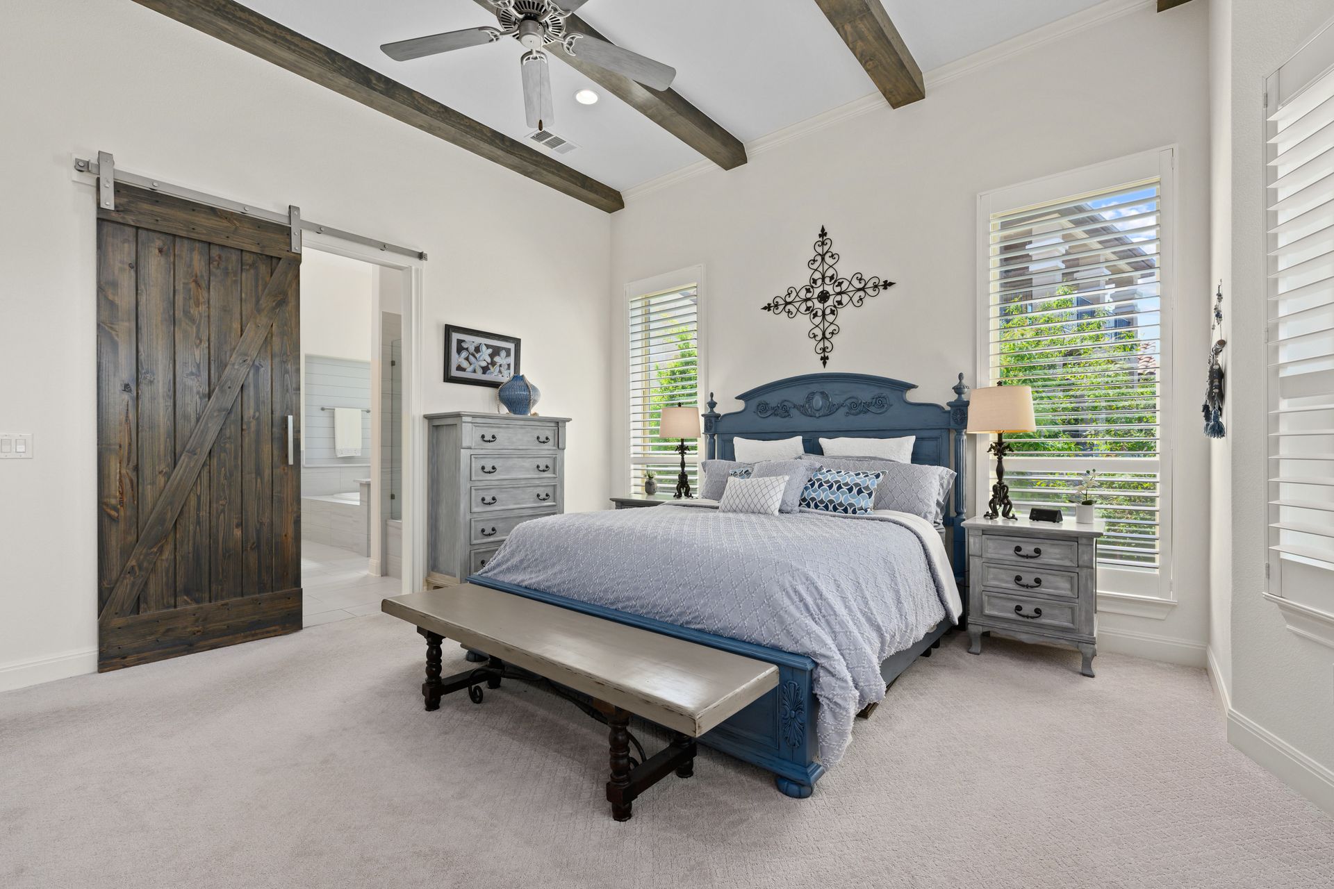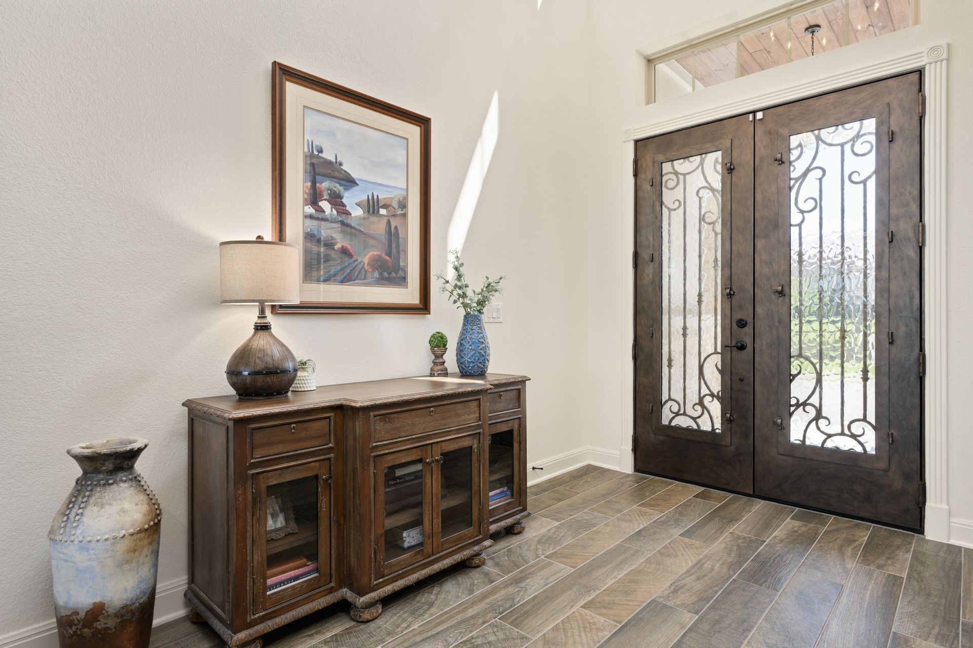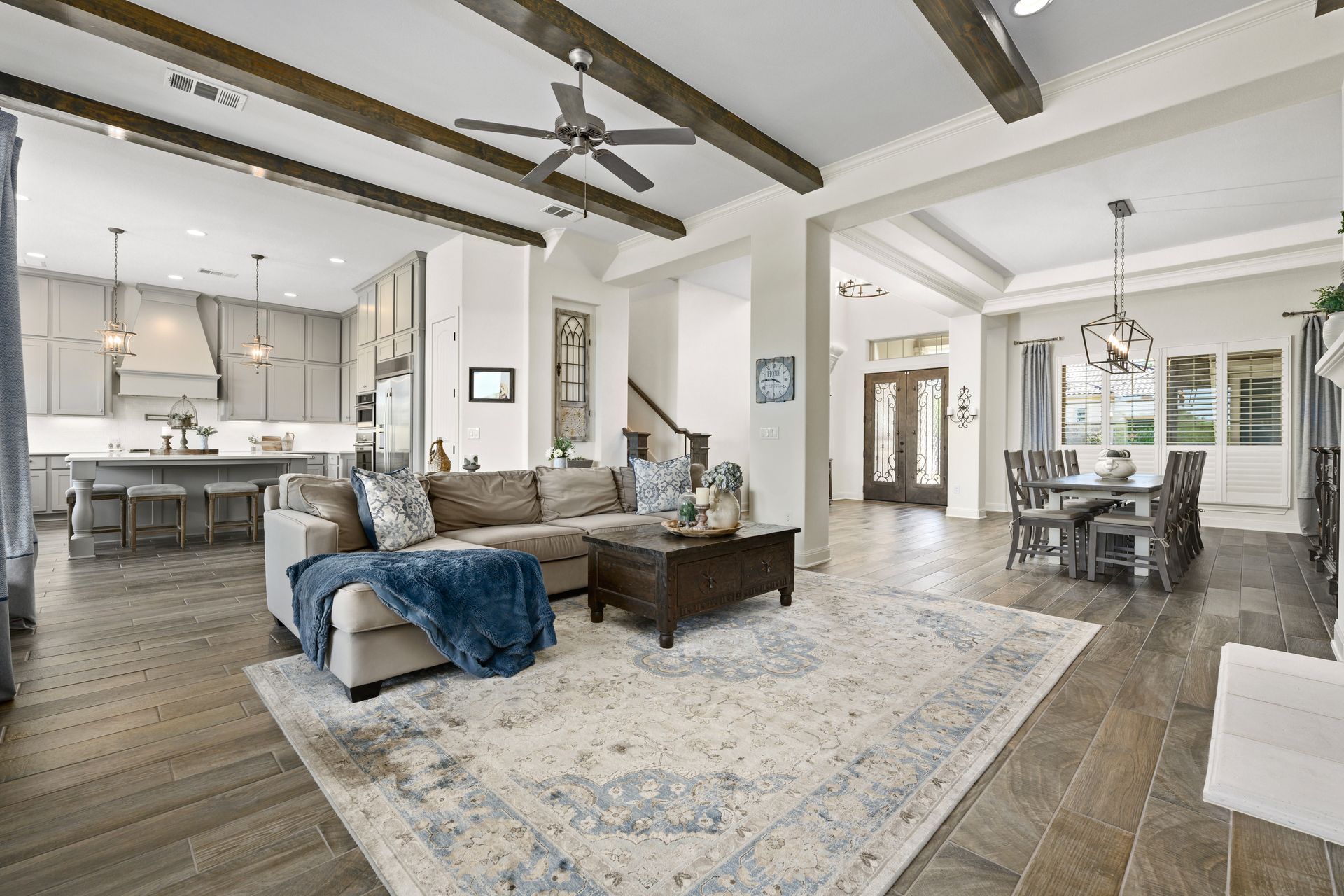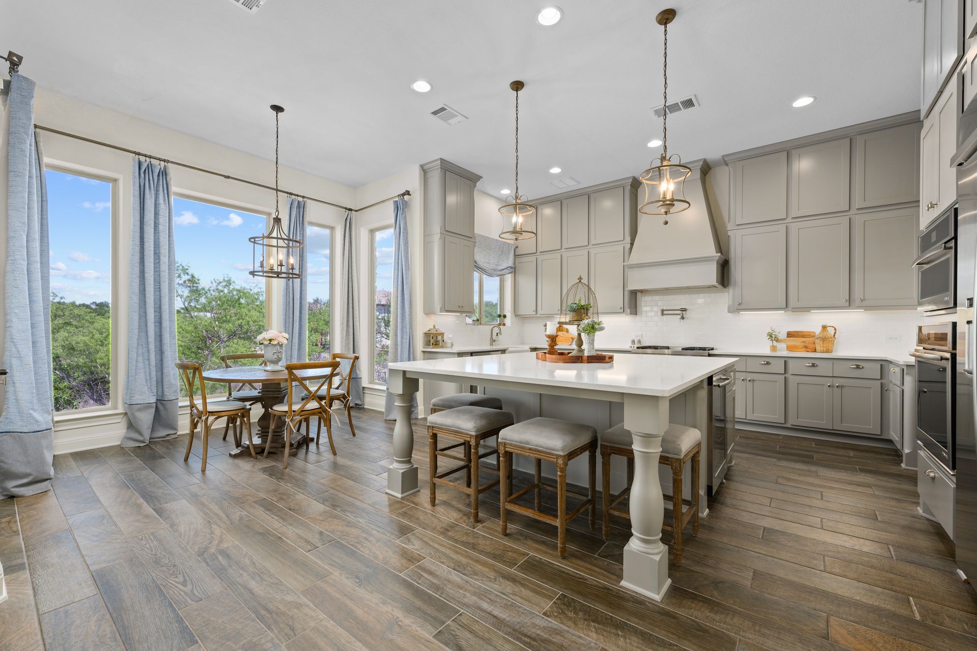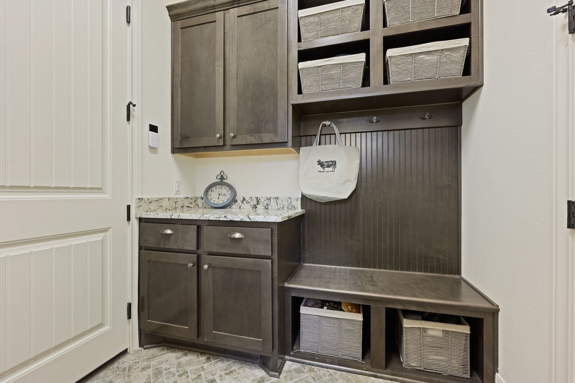 Hill Country Craftsman home is a true escape in the active boating and lifestyle community of The Enclave at Rough Hollow. This private corner half-acre + home site blends seamlessly into its surroundings and is complimented by the recently completed home with stately white limestone columns, concrete tile roof, stained corbels, and pergola. Transitional architectural details enhance the dramatic ceilings and custom lighting and window treatments throughout. Grand areas with a massive kitchen open to living area, informal and formal dining and covered outdoor living area with kitchen, all overlooking private fenced rear yard with room for pool and additional outdoor activities. Custom gray painted shaker style cabinets with quartz countertops and farmhouse sink are enhanced by Jenn-Air® appliances that includes four burner range with griddle, built-in ovens and microwave, built-in refrigerator and wine refrigerator. Private master wing with sitting area and a thoughtfully designed bath with dual vanities, dual closets, walk-in shower, soaking tub, shiplap walls and barn door entry. First floor guest suite in addition to a private office that is adjacent full bath and can also be used as an additional downstairs suite. Upstairs office with built-in cabinetry is secluded and adjacent to exercise room with full bath. Upstairs living area with covered outdoor living and two bedrooms and additional bath. The Enclave has two gated entrances and is ideally positioned for living convenience and is walking distance from the Rough Hollow Marina, Canyon Grille and gyms. The shopping and dining centers, and exemplary Lake Travis schools are just minutes away. Community has onsite marina and restaurant, 4 pools with lazy river, play scape, pet, and park areas, tennis, pickle, bocce, and basketball courts, dog park, soccer fields, two pavilions, 23 miles of hike and bike trails, stand up paddle boards, kayaks, ship store, onsite activity and HOA director.