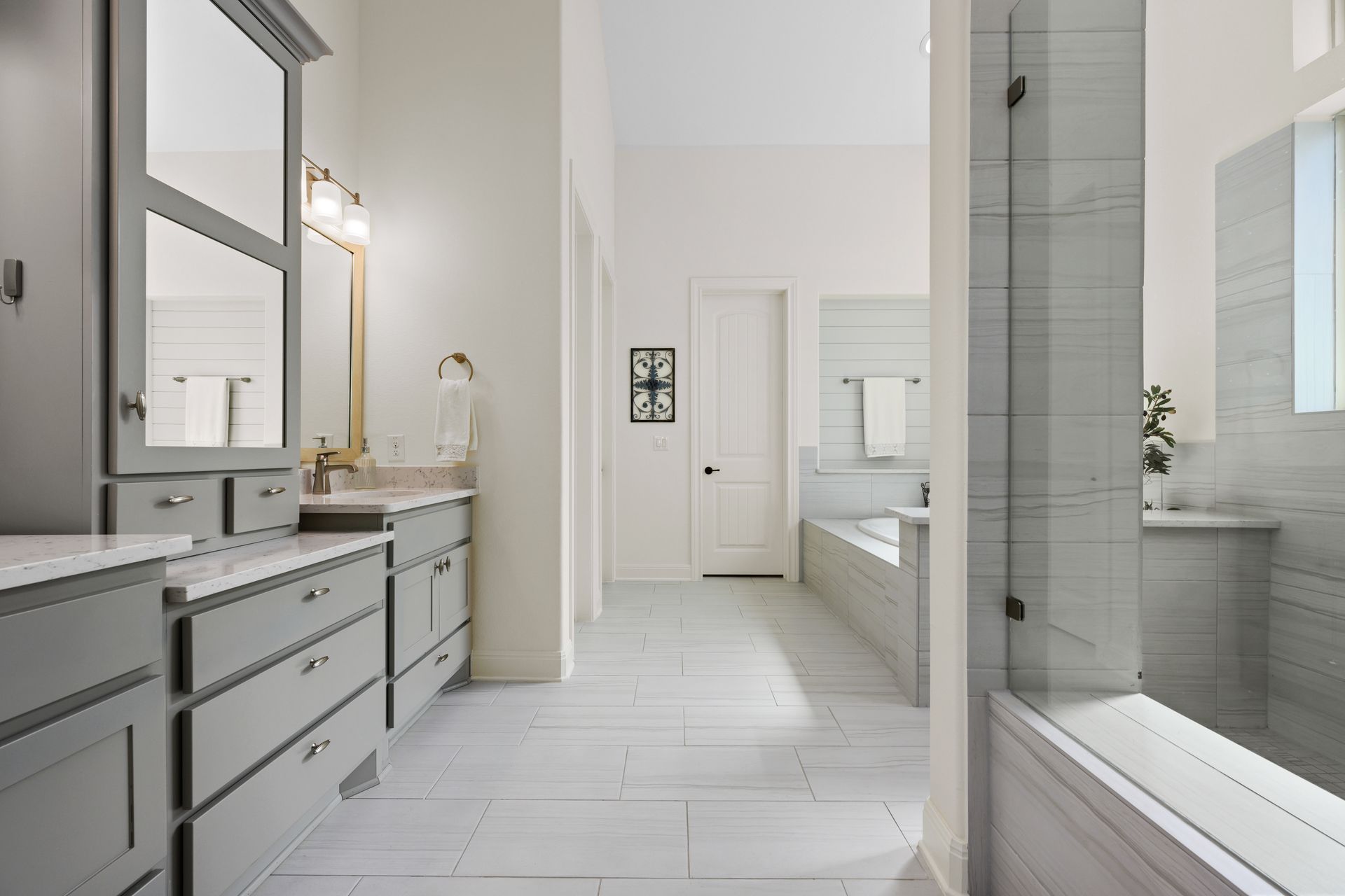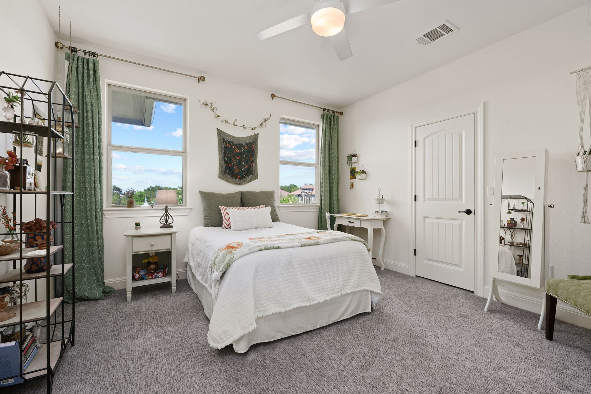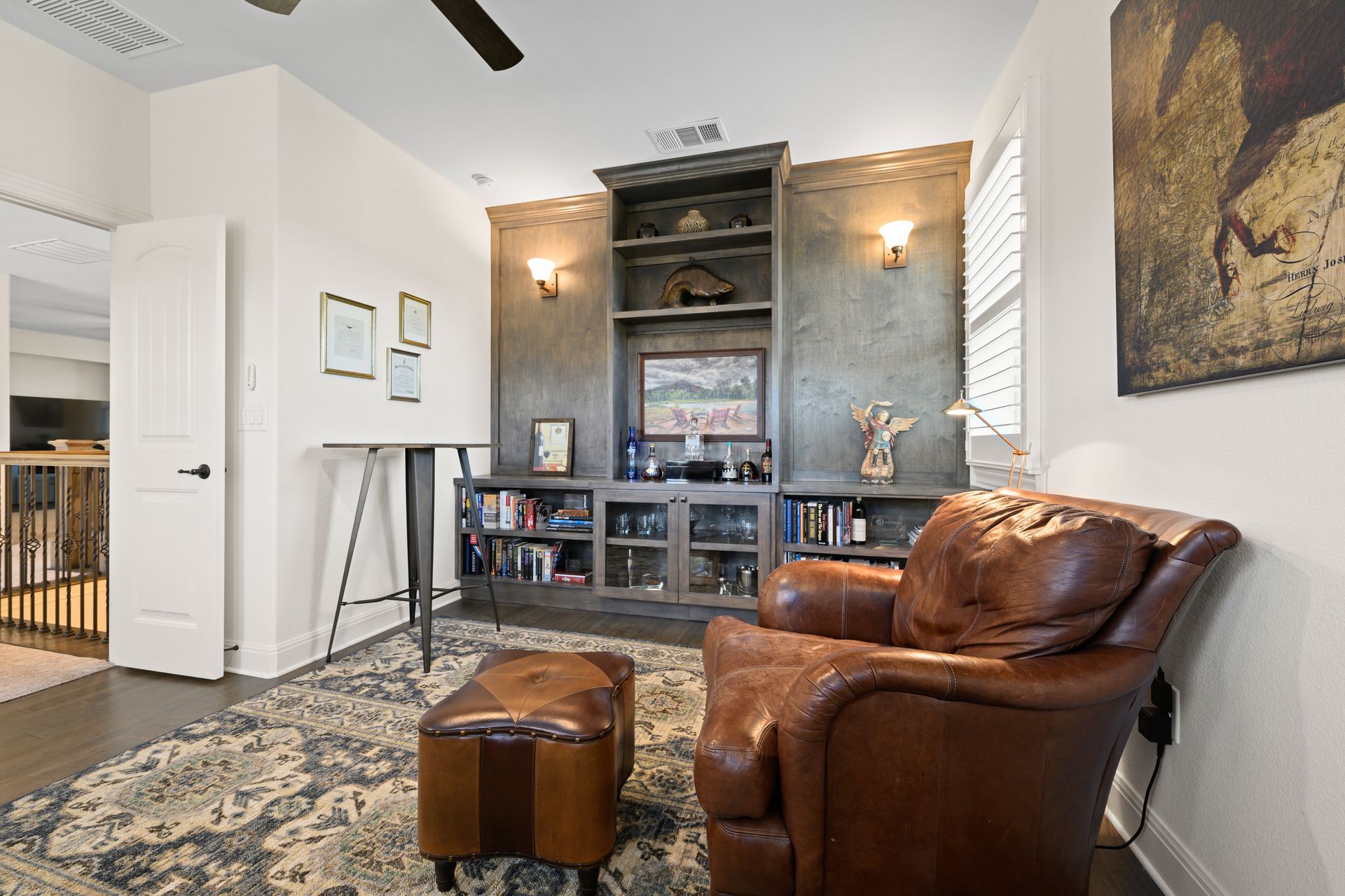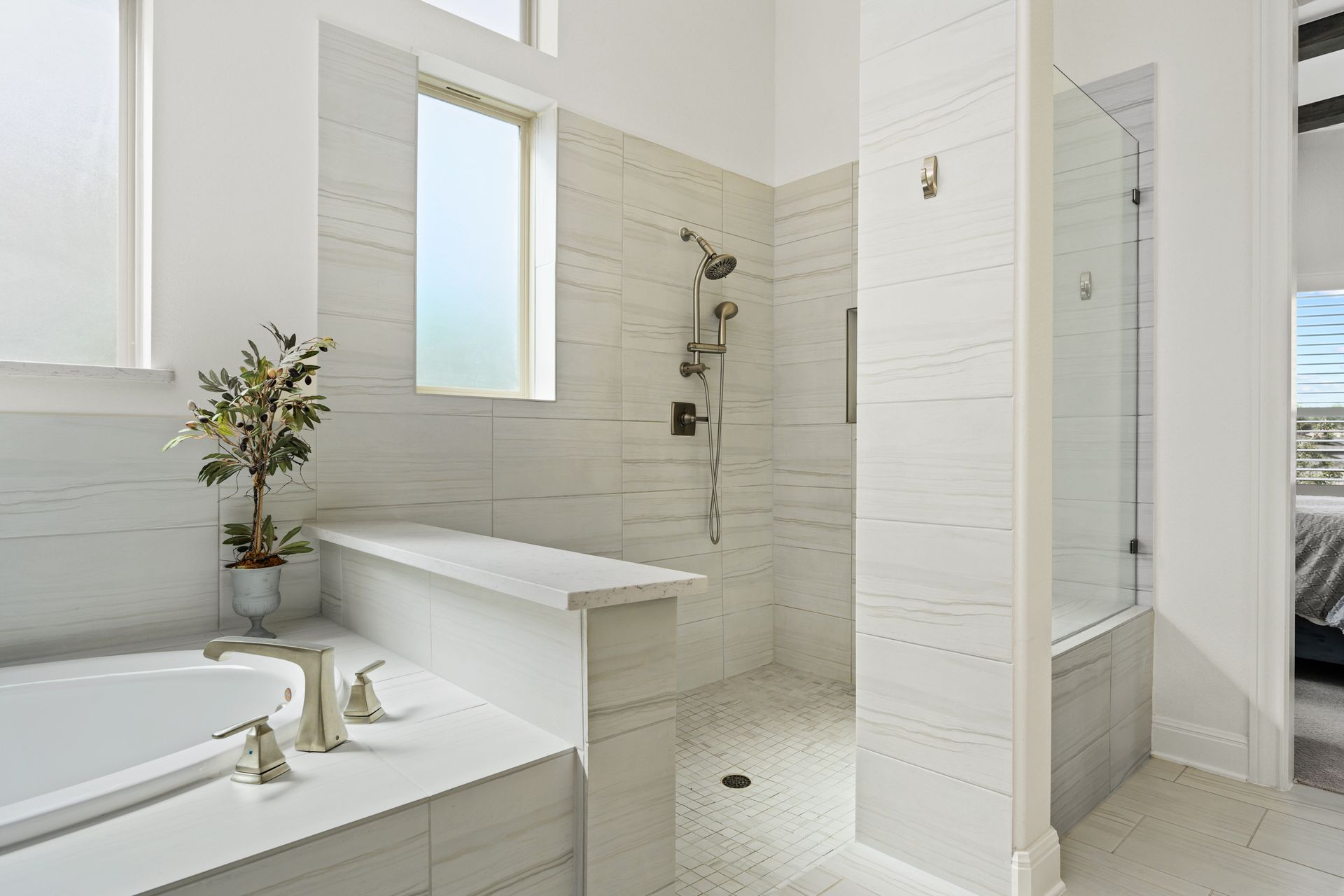 Hill Country Craftsman home is a true escape in the active boating and lifestyle community of The Enclave at Rough Hollow. This private corner half-acre + home site blends seamlessly into its surroundings and is complimented by the recently completed home with stately white limestone columns, concrete tile roof, stained corbels, and pergola. Transitional architectural details enhance the dramatic ceilings and custom lighting and window treatments throughout. Grand areas with a massive kitchen open to living area, informal and formal dining and covered outdoor living area with kitchen, all overlooking private fenced rear yard with room for pool and additional outdoor activities. Custom gray painted shaker style cabinets with quartz countertops and farmhouse sink are enhanced by Jenn-Air® appliances that includes four burner range with griddle, built-in ovens and microwave, built-in refrigerator and wine refrigerator. Private master wing with sitting area and a thoughtfully designed bath with dual vanities, dual closets, walk-in shower, soaking tub, shiplap walls and barn door entry. First floor guest suite in addition to a private office that is adjacent full bath and can also be used as an additional downstairs suite. Upstairs office with built-in cabinetry is secluded and adjacent to exercise room with full bath. Upstairs living area with covered outdoor living and two bedrooms and additional bath. The Enclave has two gated entrances and is ideally positioned for living convenience and is walking distance from the Rough Hollow Marina, Canyon Grille and gyms. The shopping and dining centers, and exemplary Lake Travis schools are just minutes away. Community has onsite marina and restaurant, 4 pools with lazy river, play scape, pet, and park areas, tennis, pickle, bocce, and basketball courts, dog park, soccer fields, two pavilions, 23 miles of hike and bike trails, stand up paddle boards, kayaks, ship store, onsite activity and HOA director.