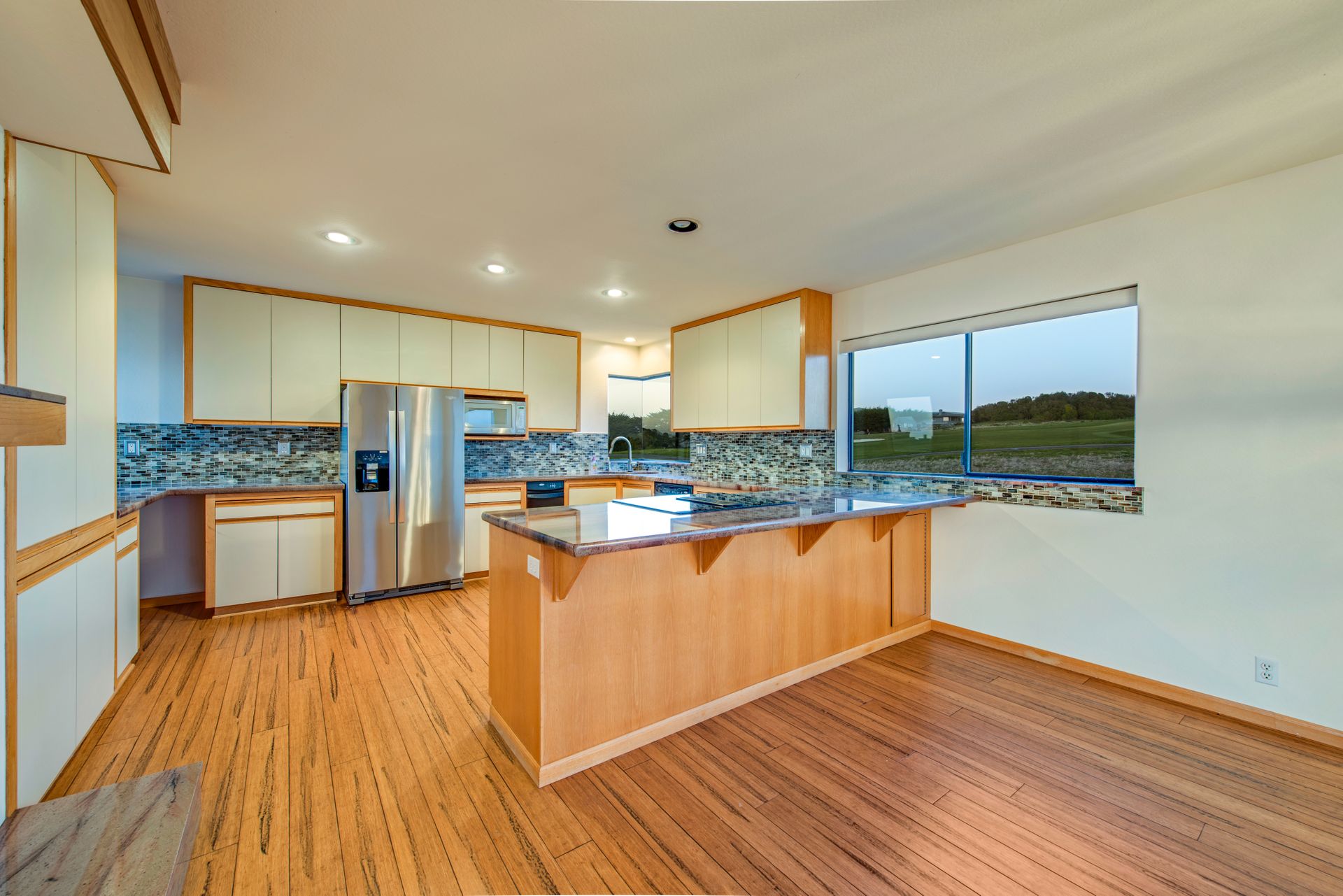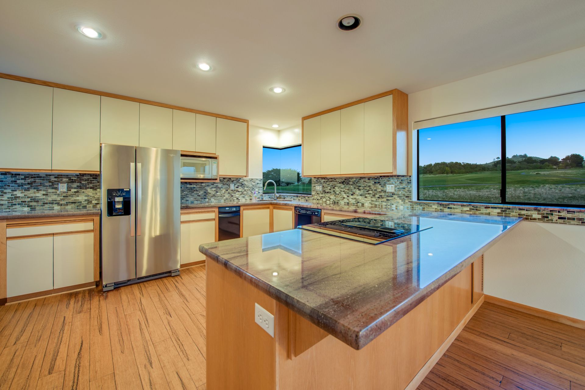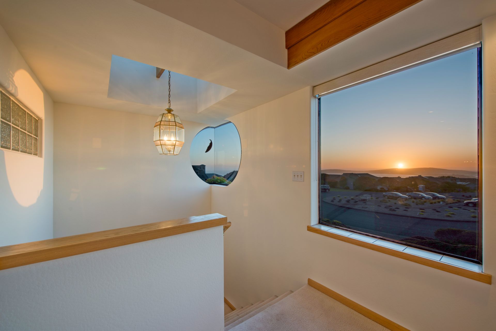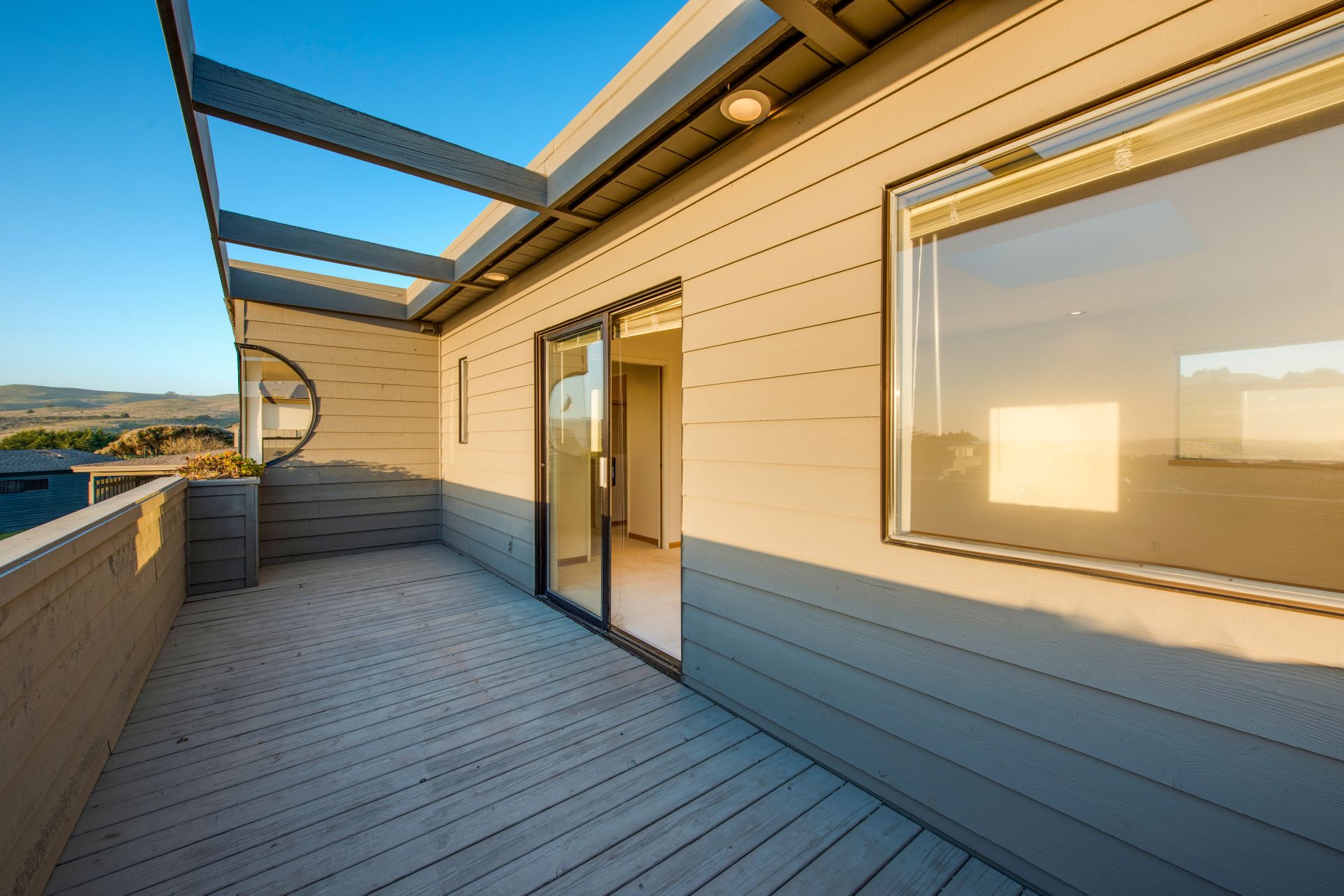 Take advantage of grand views of the bay, ocean, Bodega Head, the golf course and coastal hills on a peaceful cul-de-sac location with extra parking. The upstairs features a great room, kitchen and dining room area with plentiful natural light. The kitchen has granite countertops, stainless steel appliances and Bamboo wood flooring throughout and onto the dining area. The master bedroom has access on both sides to the exterior decks, with the ocean and bay facing deck in the front and the large, wind protected deck with a hot tub in the back. The master also has a large walk-in closet and a bathroom with double sinks, a shower and jetted tub. There are two bedrooms, a bathroom and a family room on the ground level. There is a spacious two-car garage and a large storage area from the garage to the home.