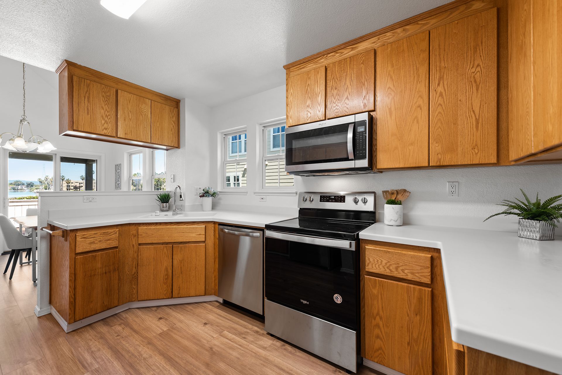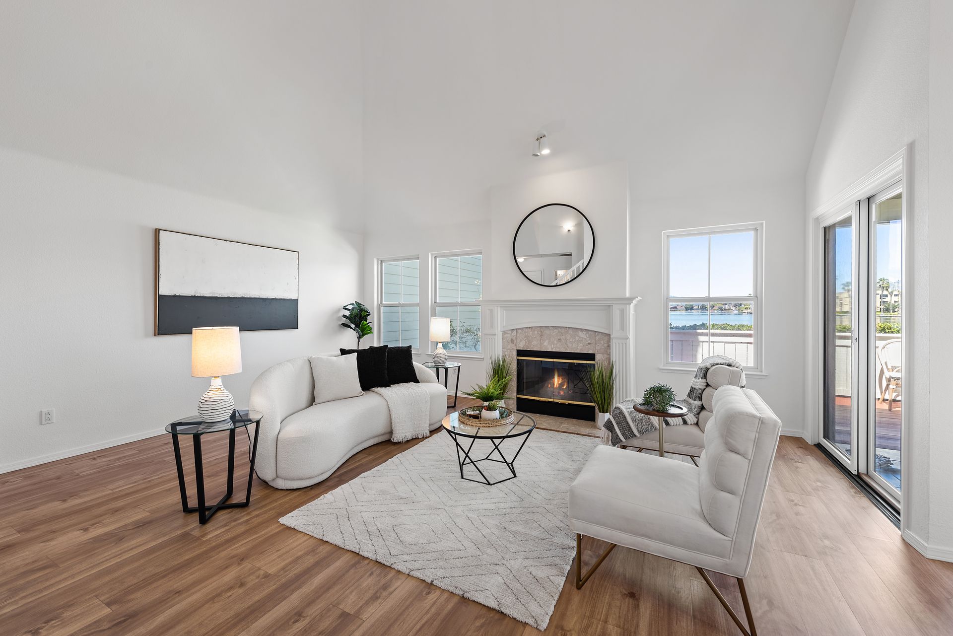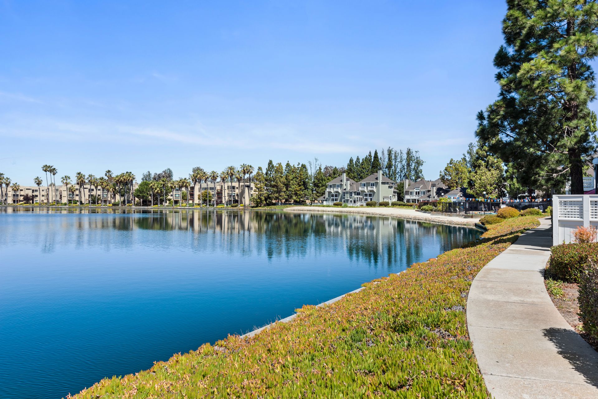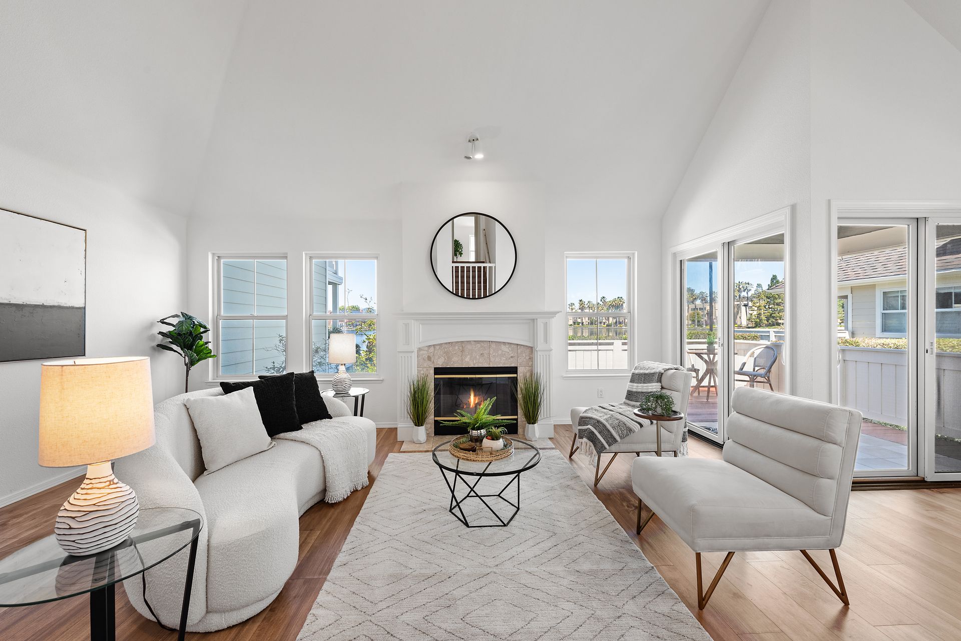 Don’t miss this updated home located in the resort-like Bayfront Court Community. This gorgeous end-unit townhouse features two bedrooms plus a den, office, third bedroom or nursery as well as two and one-half bathrooms. Enjoy high vaulted ceilings in the living room and dining area and cozy up by the beautiful fireplace in the living room making for a warm and comfortable place to entertain. The light-filled home faces the tranquil lagoon making this an ideal location. The open kitchen features ample cabinets and all newly installed appliances. The convenient one-half bath on the first floor makes this a smart choice. The large light-filled primary bedroom features a walk-in closet and a large shower, making this an ideal home and location. Not to be missed is the large attached two-car garage. This complex has a pool, spa and PRIVATE BEACH AREA ON THE LAGOON.