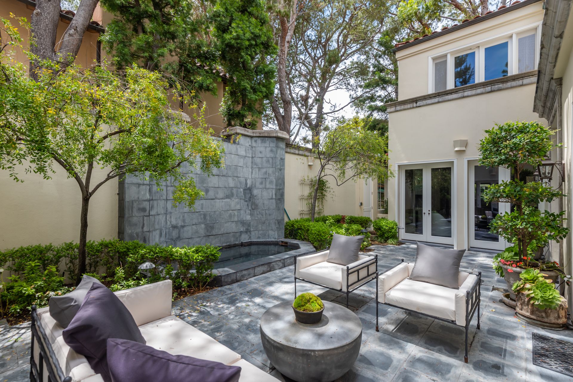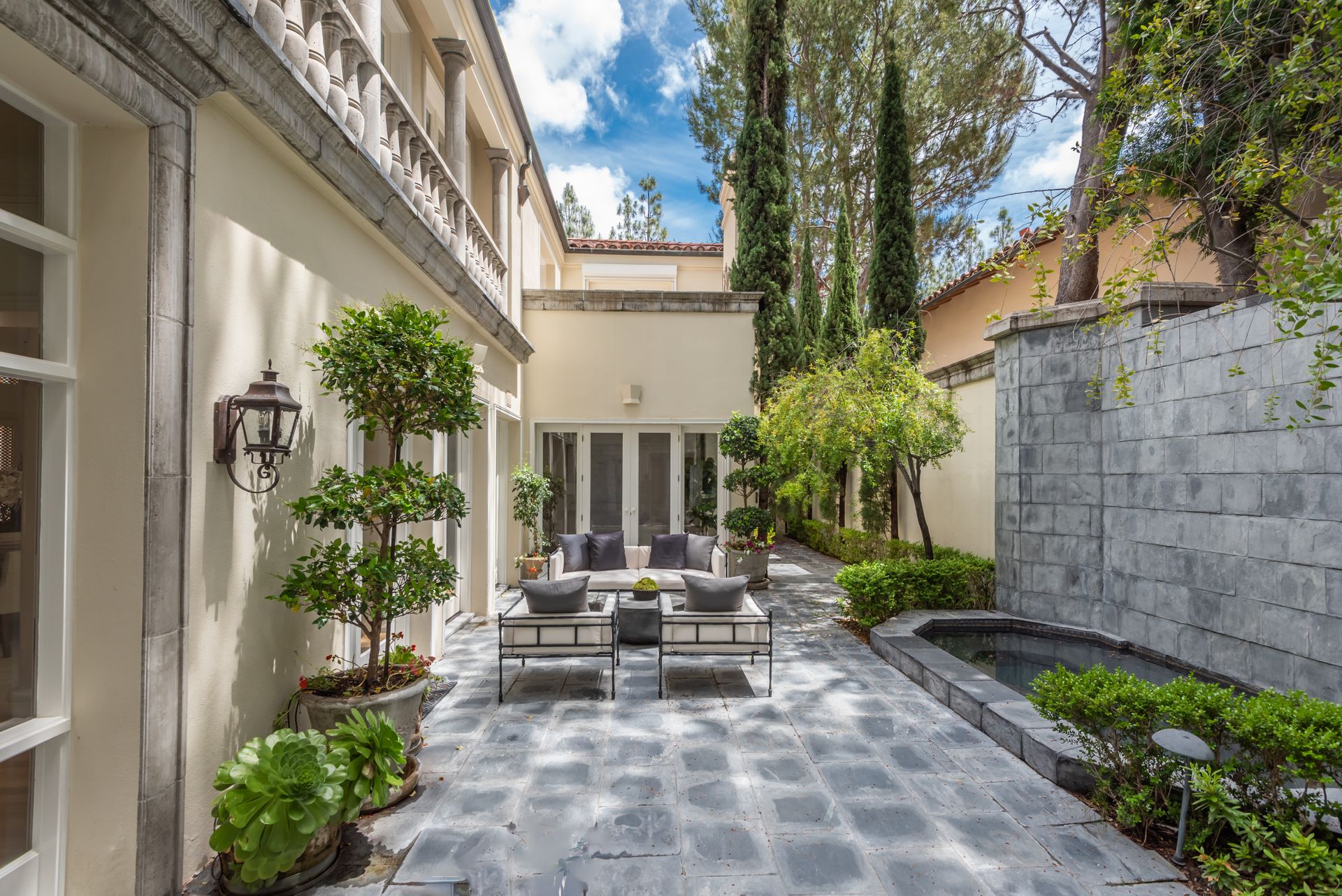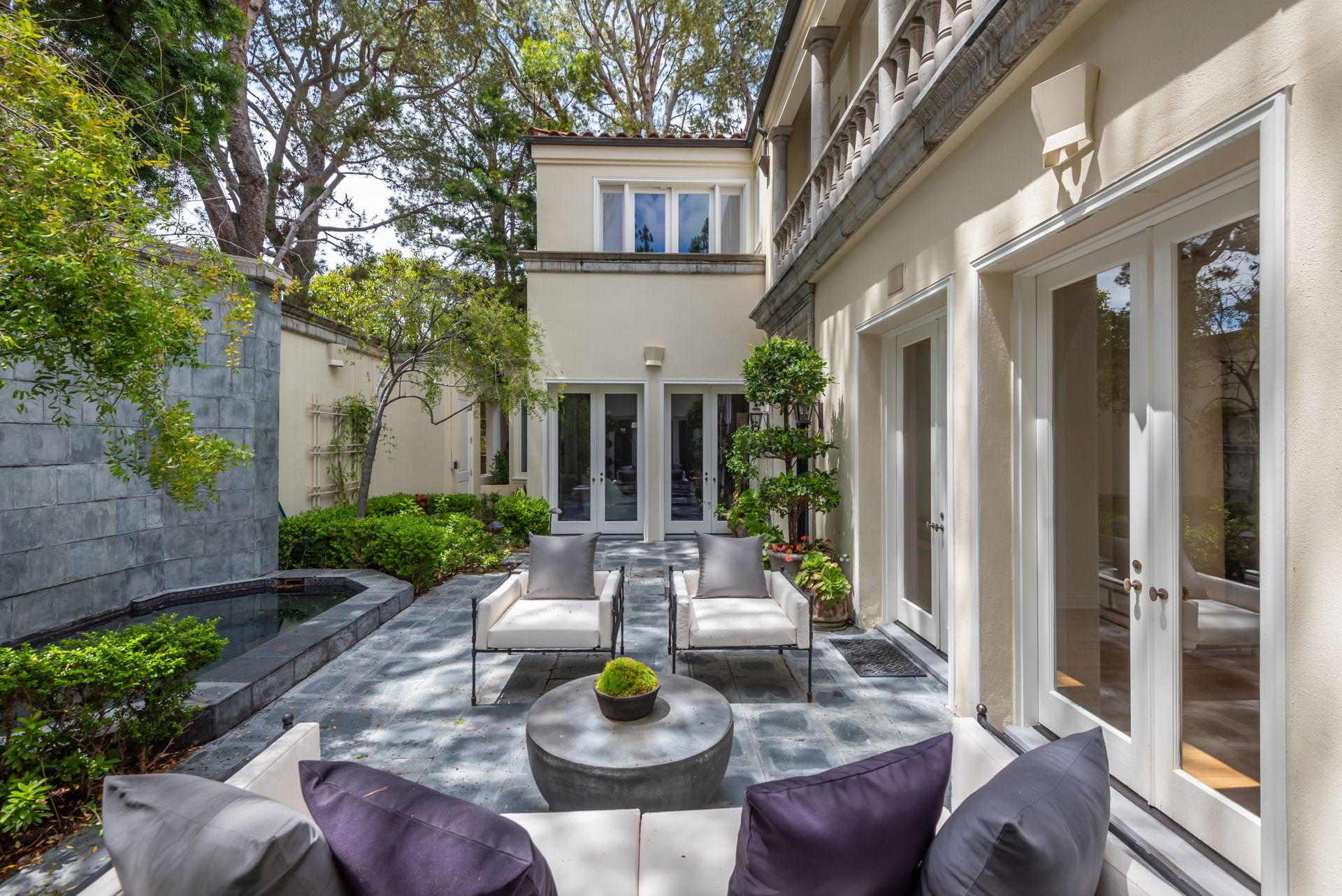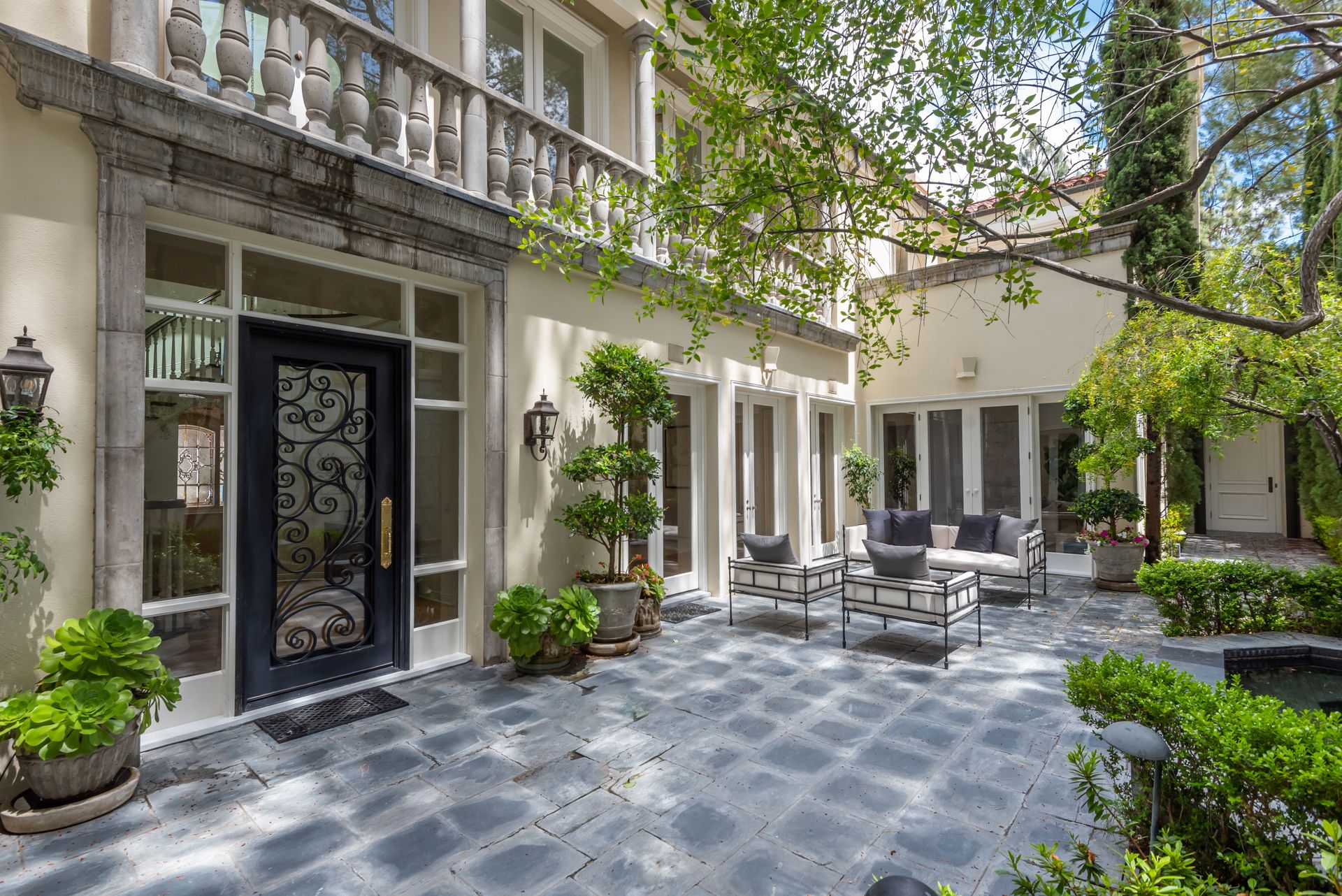 Enter into the enchanting embrace of a sun-drenched courtyard, extending a warm invitation to a captivating two-level haven nestled within the prestigious and secure confines of the coveted Century Woods guard-gated community. Adorned with French doors that seamlessly blend indoor and outdoor spaces, this resplendent five bedroom abode exudes an air of effortless refinement, coaxing you into a lifestyle of unparalleled comfort and elegance. Discover the allure of three majestic fireplaces and a meticulously crafted built-in bar, enhancing the allure of this remarkable dwelling. As you ascend the grandeur of high ceilings, a luxurious foyer bedecked with a glistening crystal chandelier and a gracefully curved stairway beckon you to make a memorable entrance. Nestled within this discreet sanctuary, a verdant tapestry of trees envelops the small, exclusive community, offering a serene ambiance complemented by coveted amenities including a North-South oriented tennis court, a state-of-the-art fitness center and both indoor and outdoor pools and spa facilities. Completing this exceptional retreat is the magnificent Clubhouse, thoughtfully designed by the renowned architect Cliff May, ensuring an unrivaled experience of opulence and sophistication.