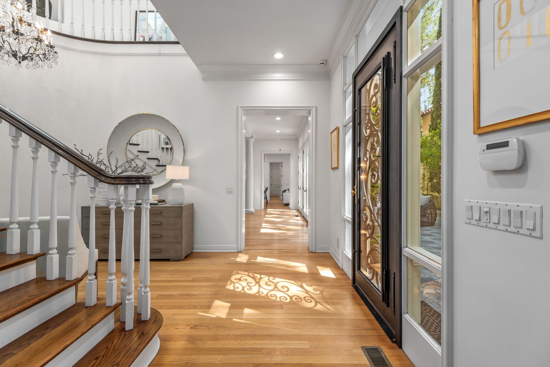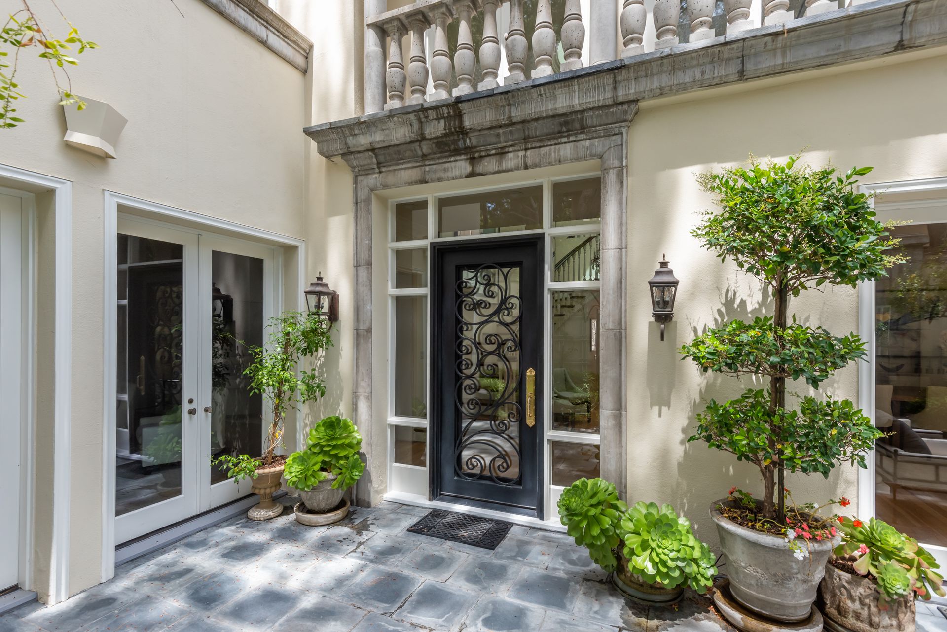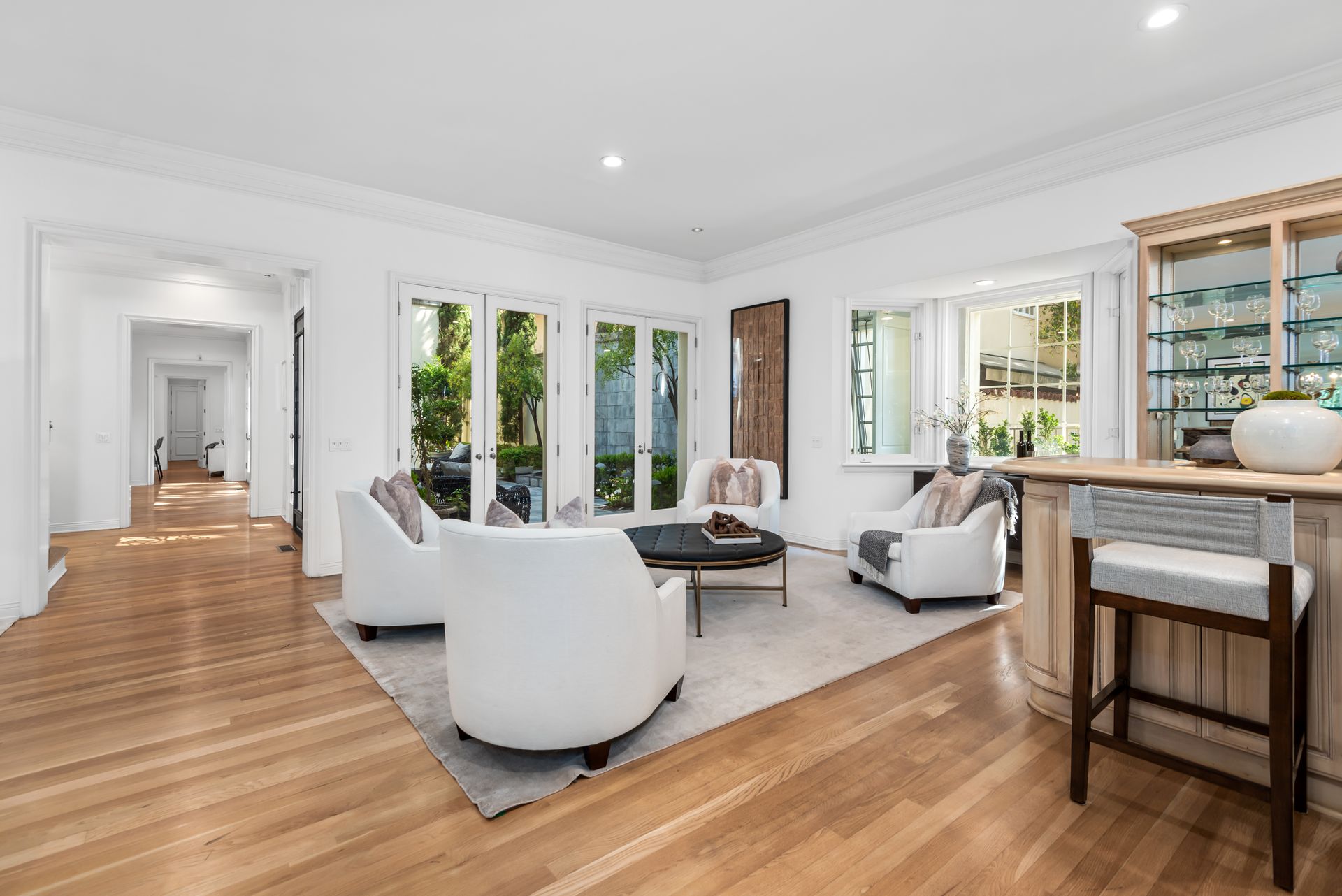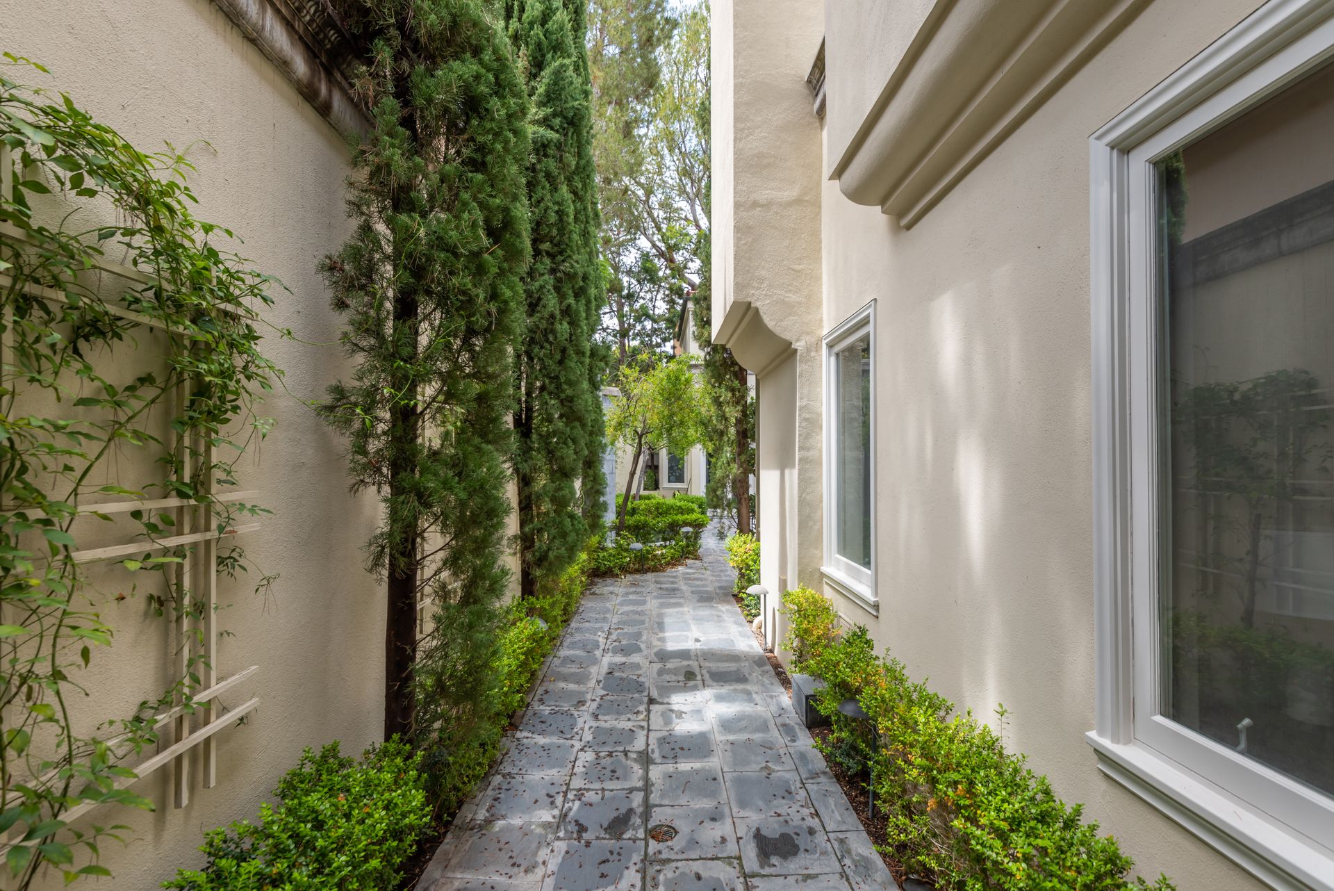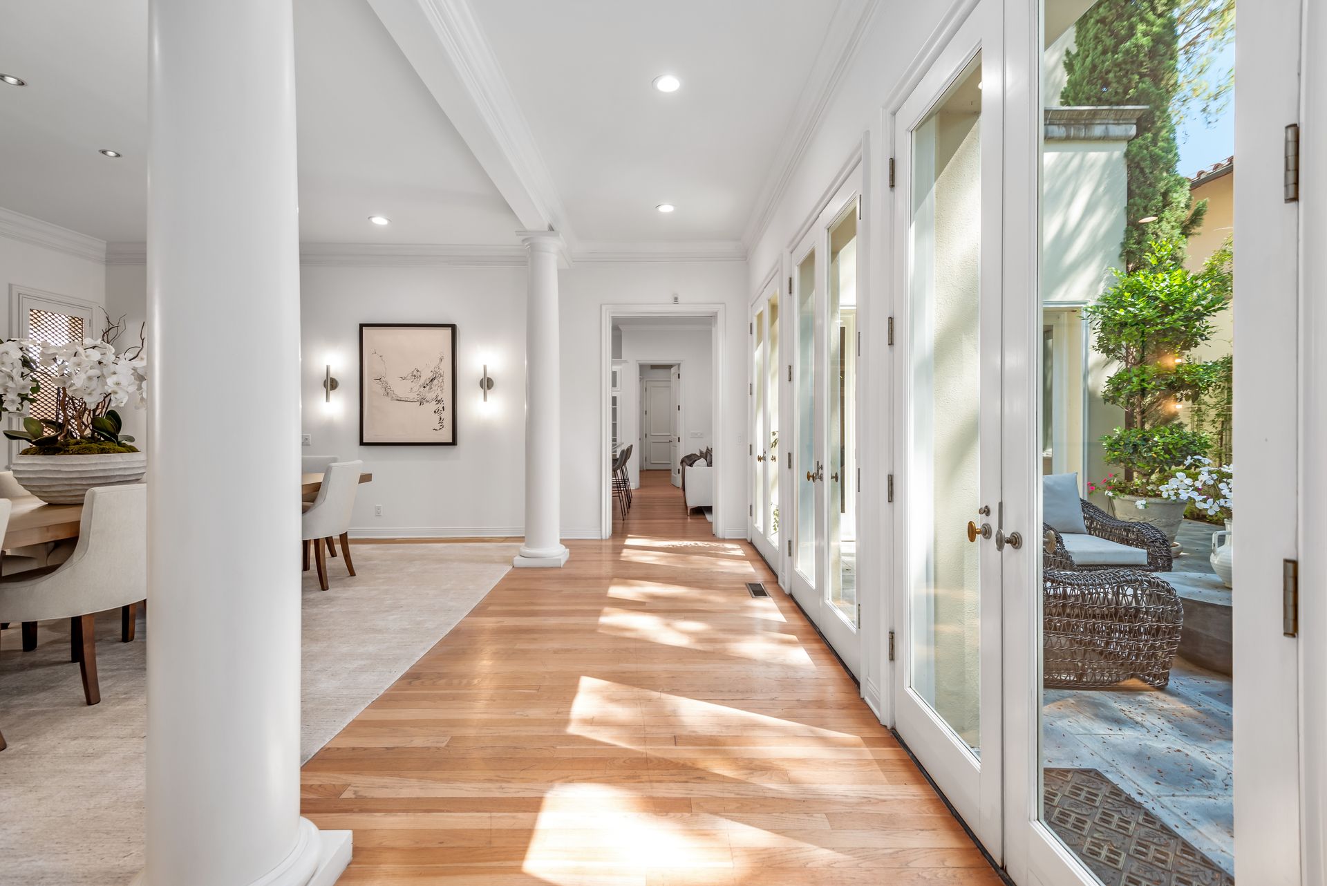 Enter into the enchanting embrace of a sun-drenched courtyard, extending a warm invitation to a captivating two-level haven nestled within the prestigious and secure confines of the coveted Century Woods guard-gated community. Adorned with French doors that seamlessly blend indoor and outdoor spaces, this resplendent five bedroom abode exudes an air of effortless refinement, coaxing you into a lifestyle of unparalleled comfort and elegance. Discover the allure of three majestic fireplaces and a meticulously crafted built-in bar, enhancing the allure of this remarkable dwelling. As you ascend the grandeur of high ceilings, a luxurious foyer bedecked with a glistening crystal chandelier and a gracefully curved stairway beckon you to make a memorable entrance. Nestled within this discreet sanctuary, a verdant tapestry of trees envelops the small, exclusive community, offering a serene ambiance complemented by coveted amenities including a North-South oriented tennis court, a state-of-the-art fitness center and both indoor and outdoor pools and spa facilities. Completing this exceptional retreat is the magnificent Clubhouse, thoughtfully designed by the renowned architect Cliff May, ensuring an unrivaled experience of opulence and sophistication.