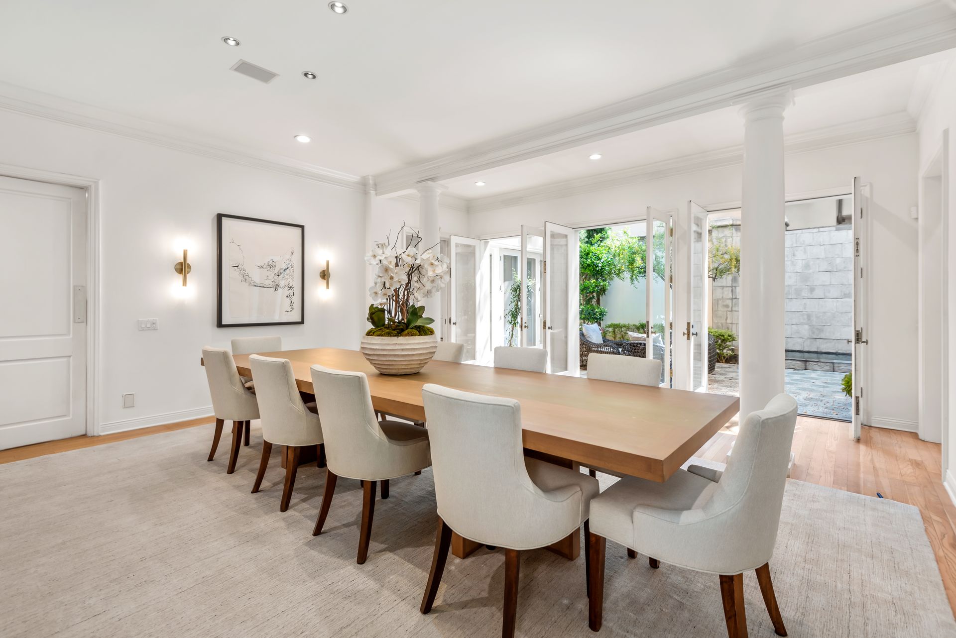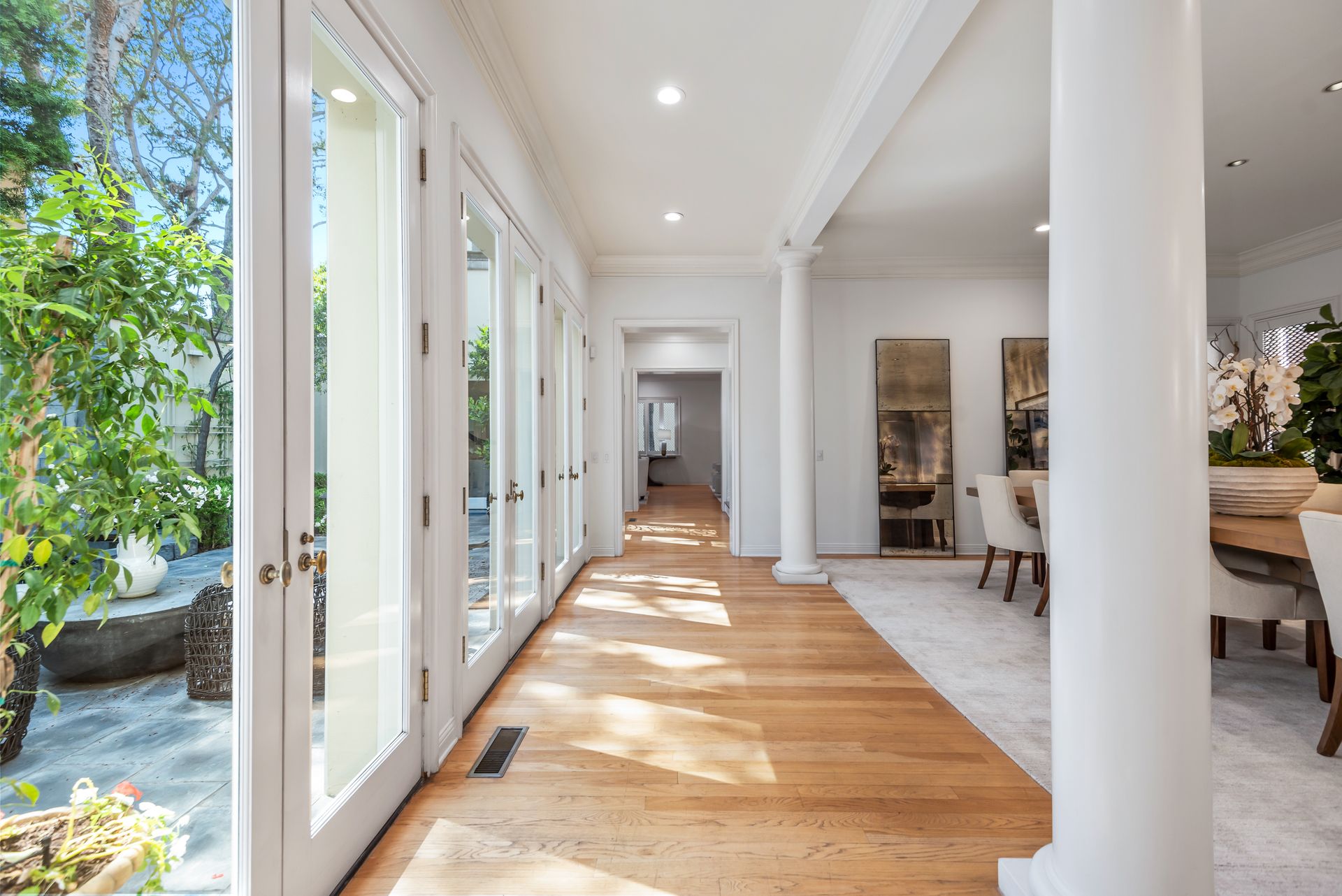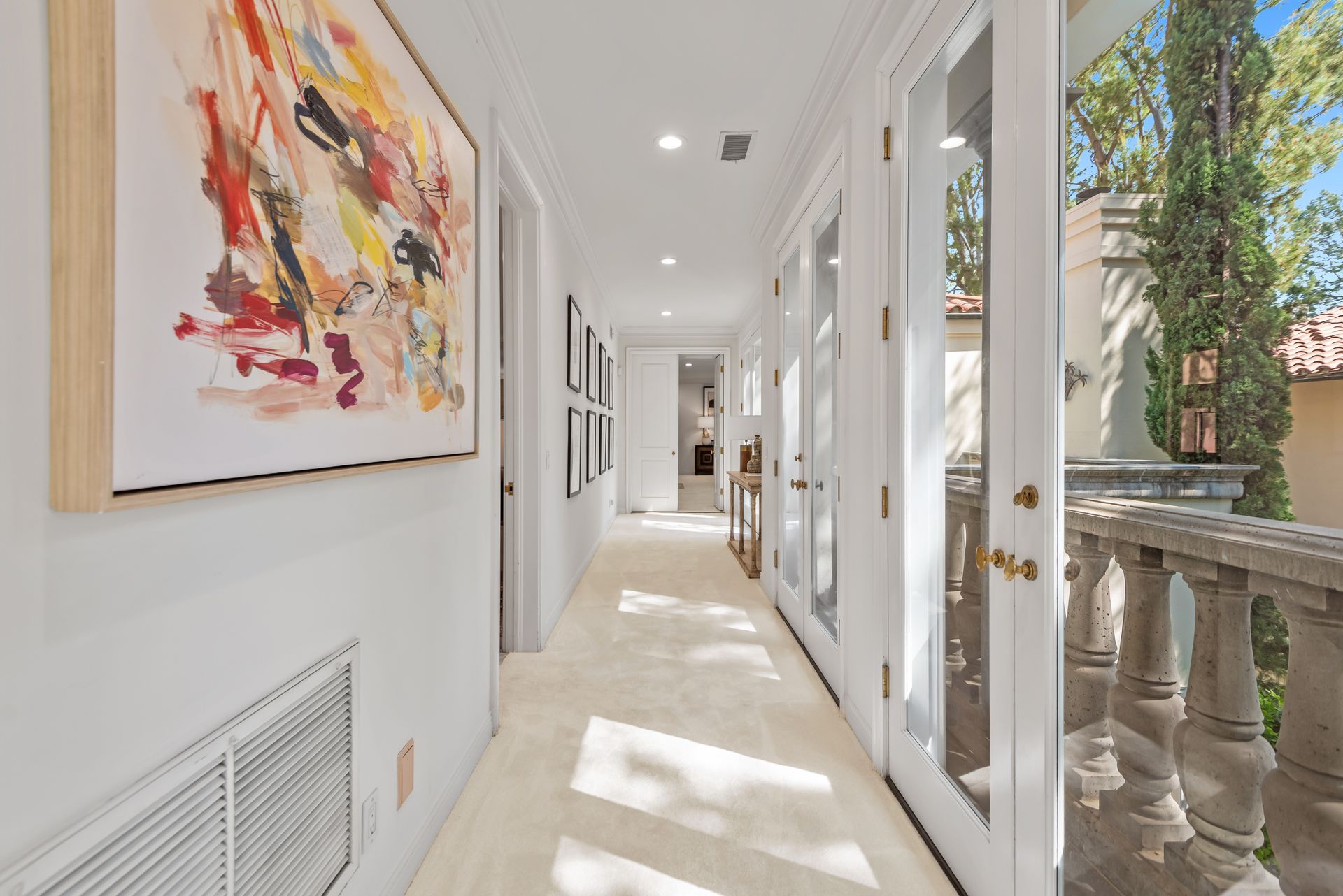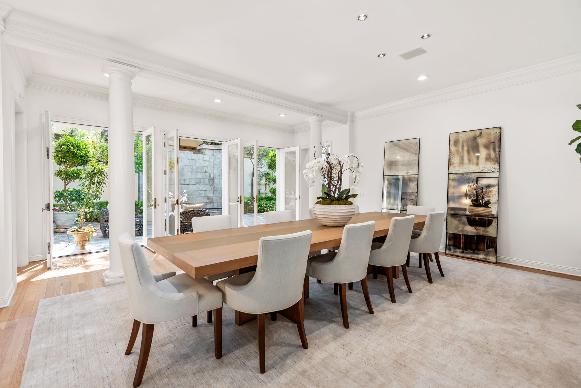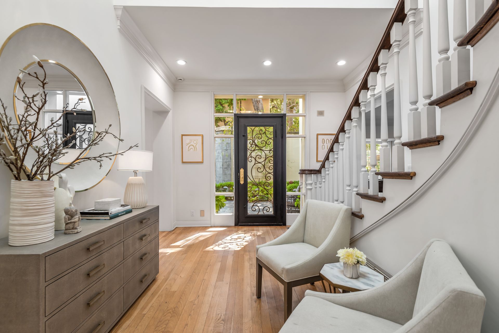 Enter into the enchanting embrace of a sun-drenched courtyard, extending a warm invitation to a captivating two-level haven nestled within the prestigious and secure confines of the coveted Century Woods guard-gated community. Adorned with French doors that seamlessly blend indoor and outdoor spaces, this resplendent five bedroom abode exudes an air of effortless refinement, coaxing you into a lifestyle of unparalleled comfort and elegance. Discover the allure of three majestic fireplaces and a meticulously crafted built-in bar, enhancing the allure of this remarkable dwelling. As you ascend the grandeur of high ceilings, a luxurious foyer bedecked with a glistening crystal chandelier and a gracefully curved stairway beckon you to make a memorable entrance. Nestled within this discreet sanctuary, a verdant tapestry of trees envelops the small, exclusive community, offering a serene ambiance complemented by coveted amenities including a North-South oriented tennis court, a state-of-the-art fitness center and both indoor and outdoor pools and spa facilities. Completing this exceptional retreat is the magnificent Clubhouse, thoughtfully designed by the renowned architect Cliff May, ensuring an unrivaled experience of opulence and sophistication.