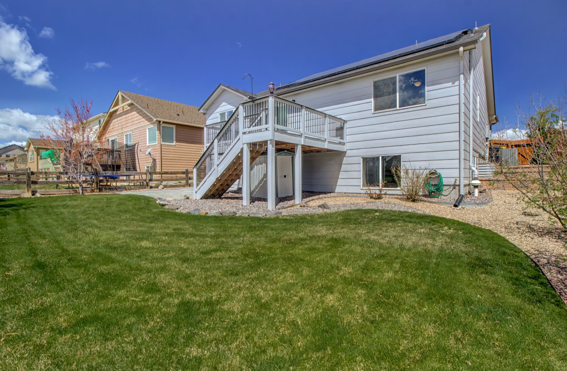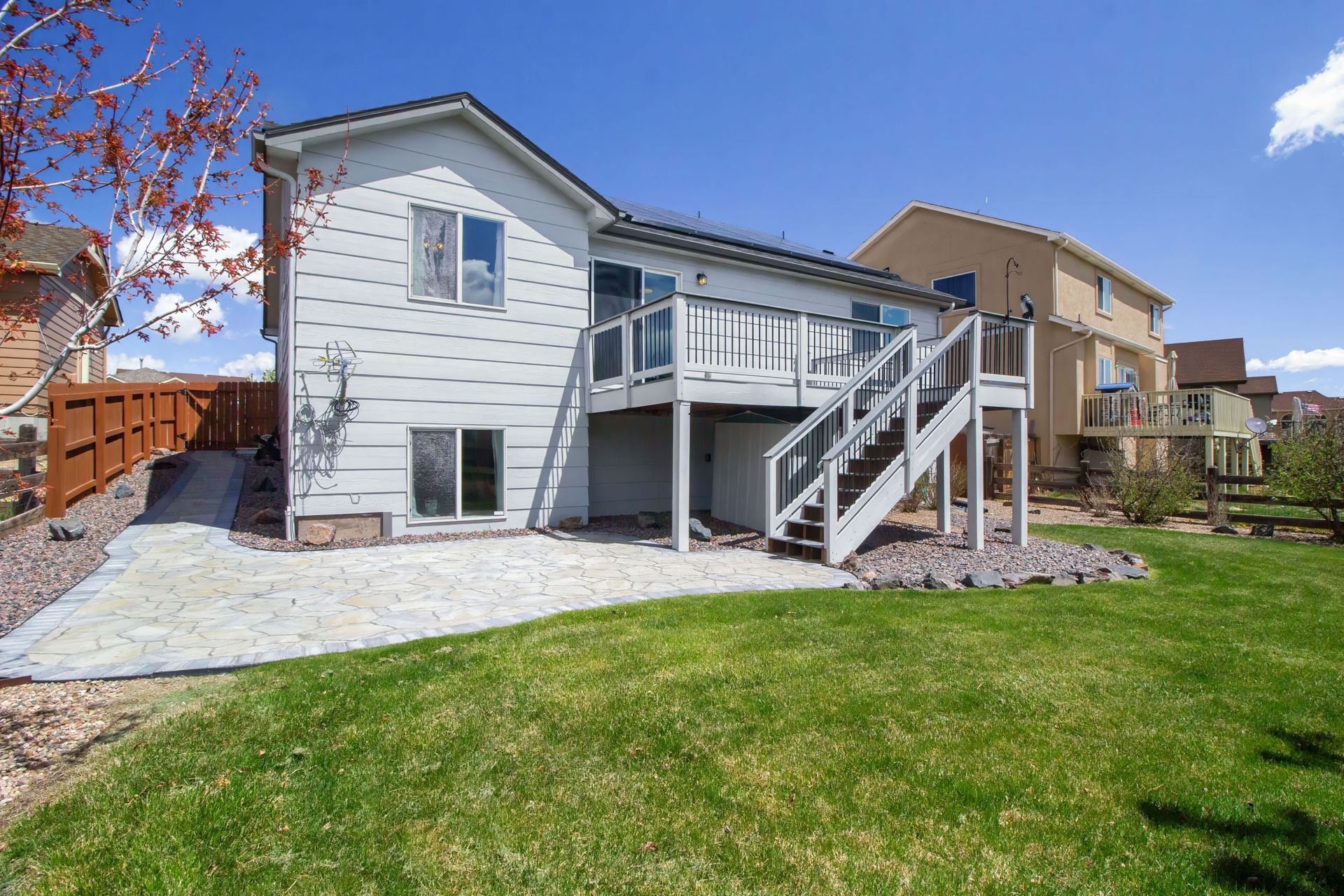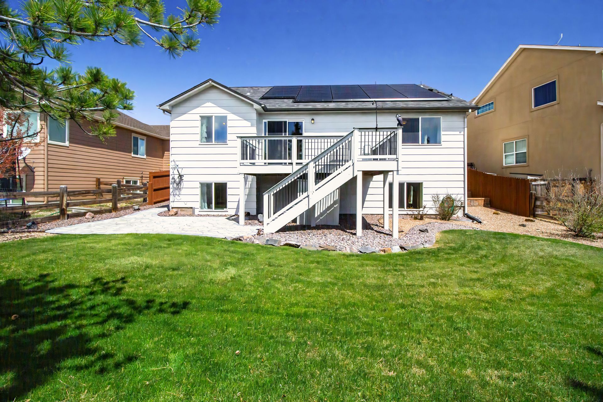"LOCATION! This very well maintained rancher is in the perfect setting! It's located near the community rec center, between 2 parks, and between the high school, middle school, and 2 elementary schools. And it's loaded with updates, both inside and out! On the exterior you can enjoy a composite deck, new trees/perennials, stone patio, privacy fence, newer roof w/40-yr transferable warranty high-impact shingles, fresh paint, wifi managed sprinkler system, 2 EV outlets in the garage, and lien-free solar (with battery backup). Walking inside, the kitchen includes granite counters, stainless steel appliances, soft-close cabinets, LVP flooring, and an eat-in kitchen area with formal dining right around the corner. Also on the main floor you'll notice the vaulted ceilings, living area with gas fireplace, a master suite with large walk-in closet and full bath with dual-sink vanity. A 2nd bedroom and full bath complete this floor. The lower level includes a large living area wired for surround sound, wet bar w/mini fridge and wine fridge, laundry room, 2 bedrooms w/walk-in closets, a full bath with dual vanities, and double-insulated walls for energy savings and noise tampering. This house is truly a MUST SEE!"