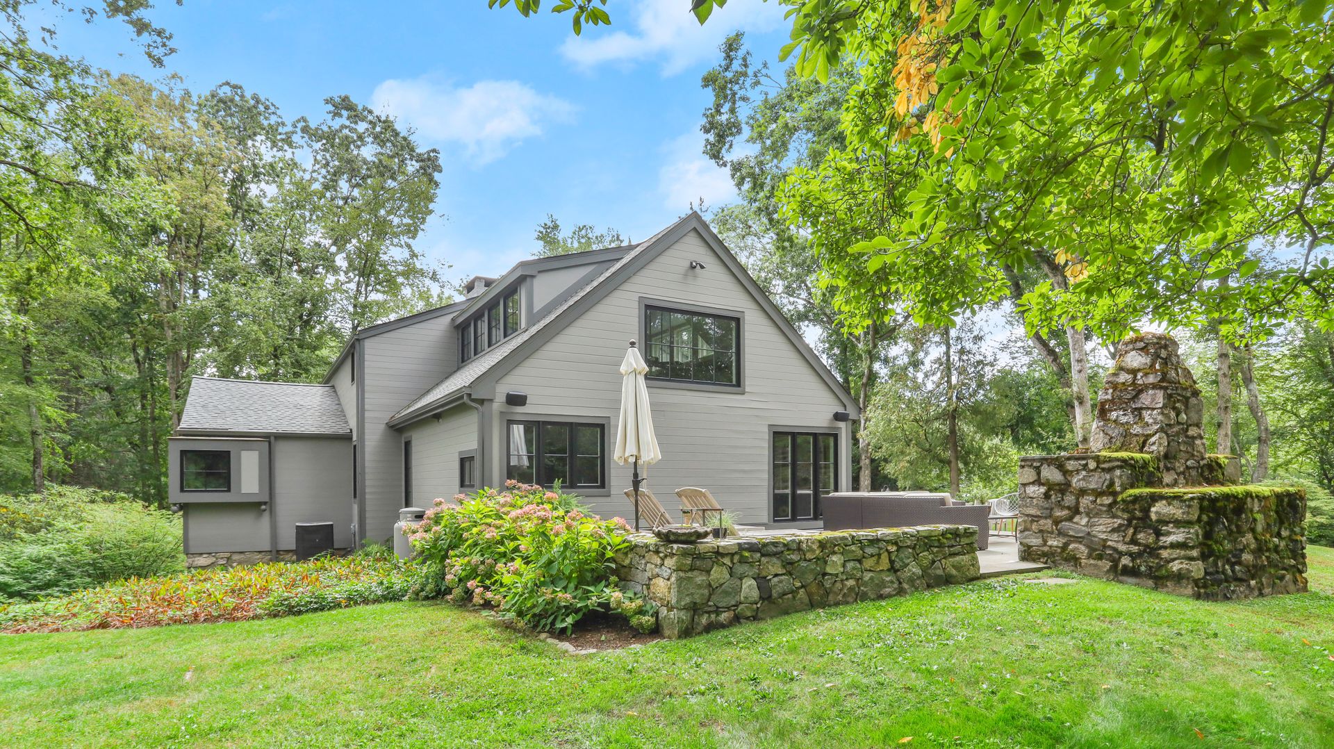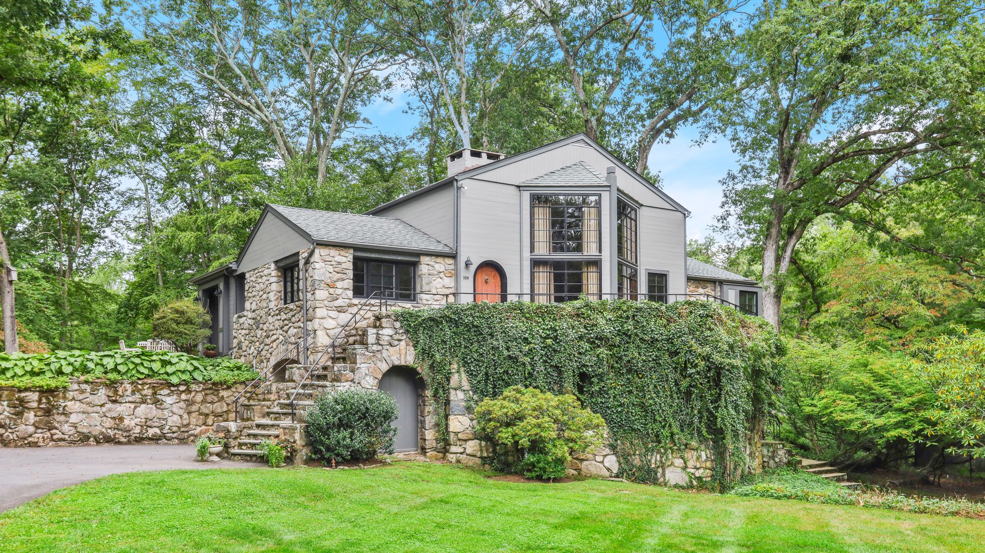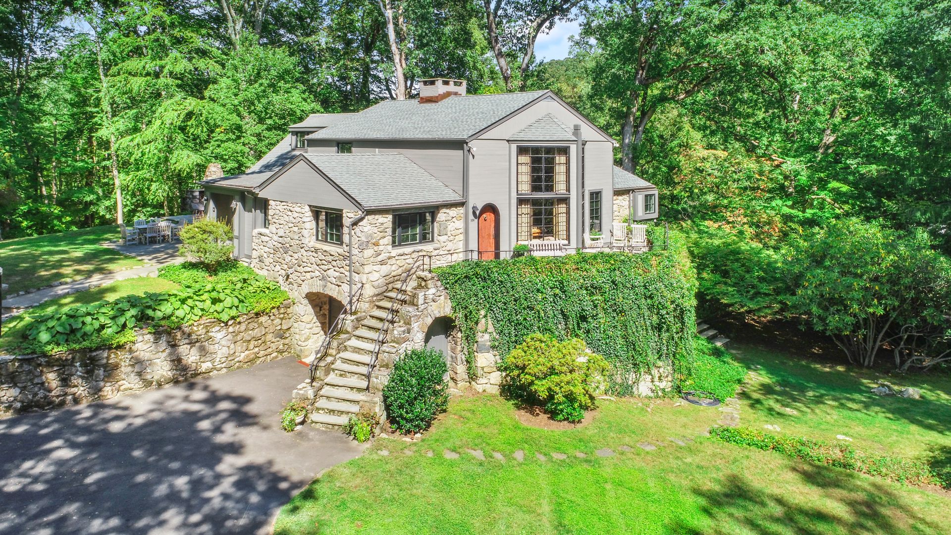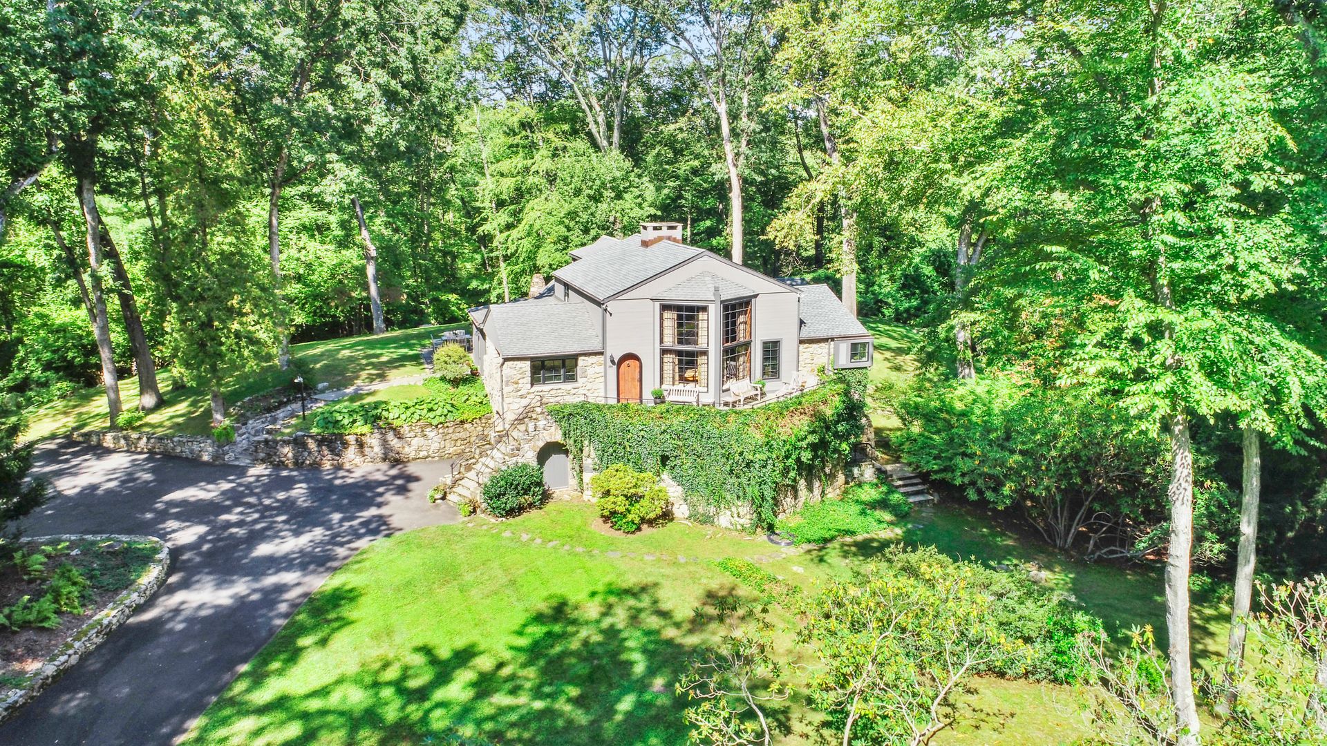 A private retreat is what you'll find as you pass stone columns, wind down the drive past the grounds and arrive at Waterock Cottage. This three bedroom, three bath, completely renovated home will take your breath away. Climb the curved staircase to the ivy-covered stone terrace to discover serenity. Inside continues to surprise and delight. The eat-in kitchen with vaulted ceiling, custom cabinetry, island and high-end appliances is the heart of the home and opens to a family room with fireplace, pantry/office and mudroom. French doors open to a patio great for indoor/outdoor entertaining. The main level features a great room with fireplace and floor-to-ceiling windows, en suite bedroom, second bedroom, full bath and office/guest room. The second level features the primary bedroom with fireplace, en suite bath, walk-in closet and loft, perfect for an office. The finished lower level has a laundry room and a flex use room. You'll love the outdoor spaces, including wrap-around bluestone patio with fireplace, screened greenhouse, potting shed and wood shed on the three-acre property which abuts Aspetuck Land Trust. This property feels like you are on vacation in Sonoma, with its terraced rolling hills, yet you are only moments to award winning Weston schools and a quick trip to Westport beaches and train to NYC.