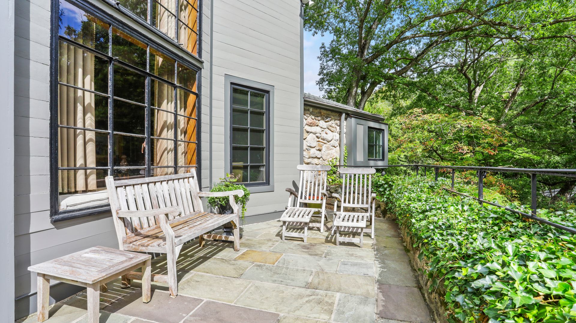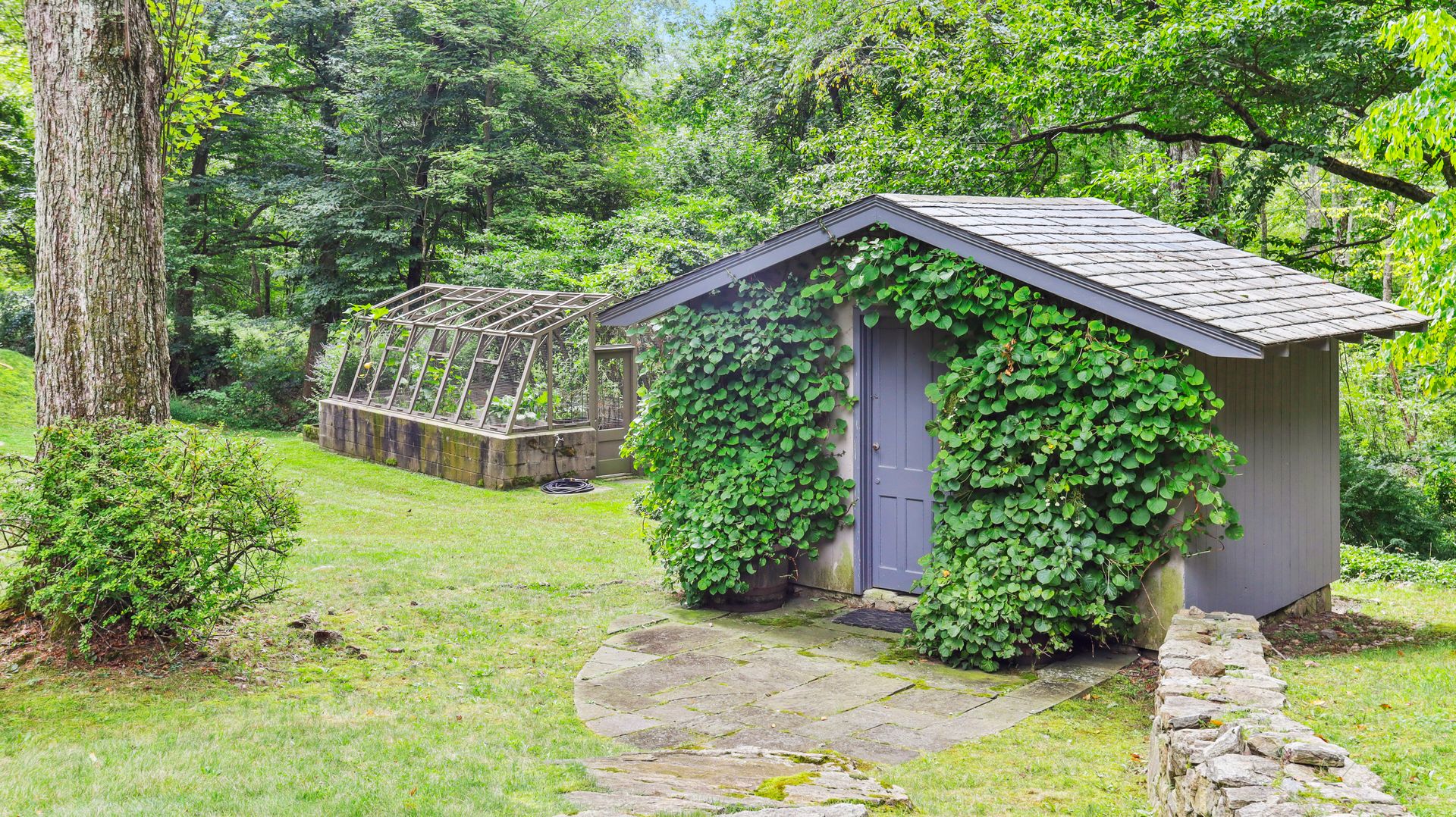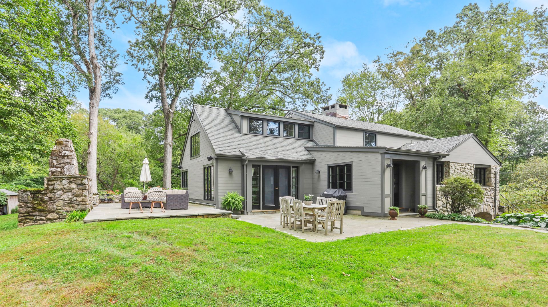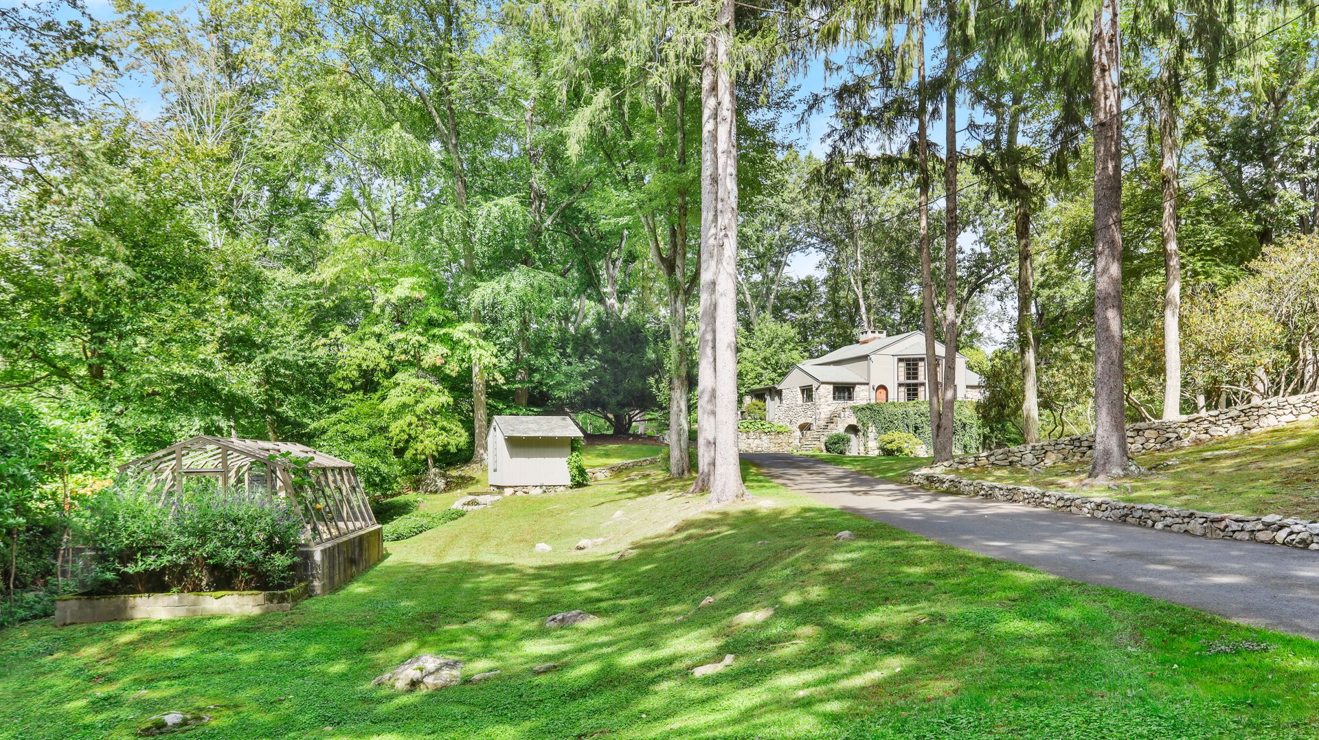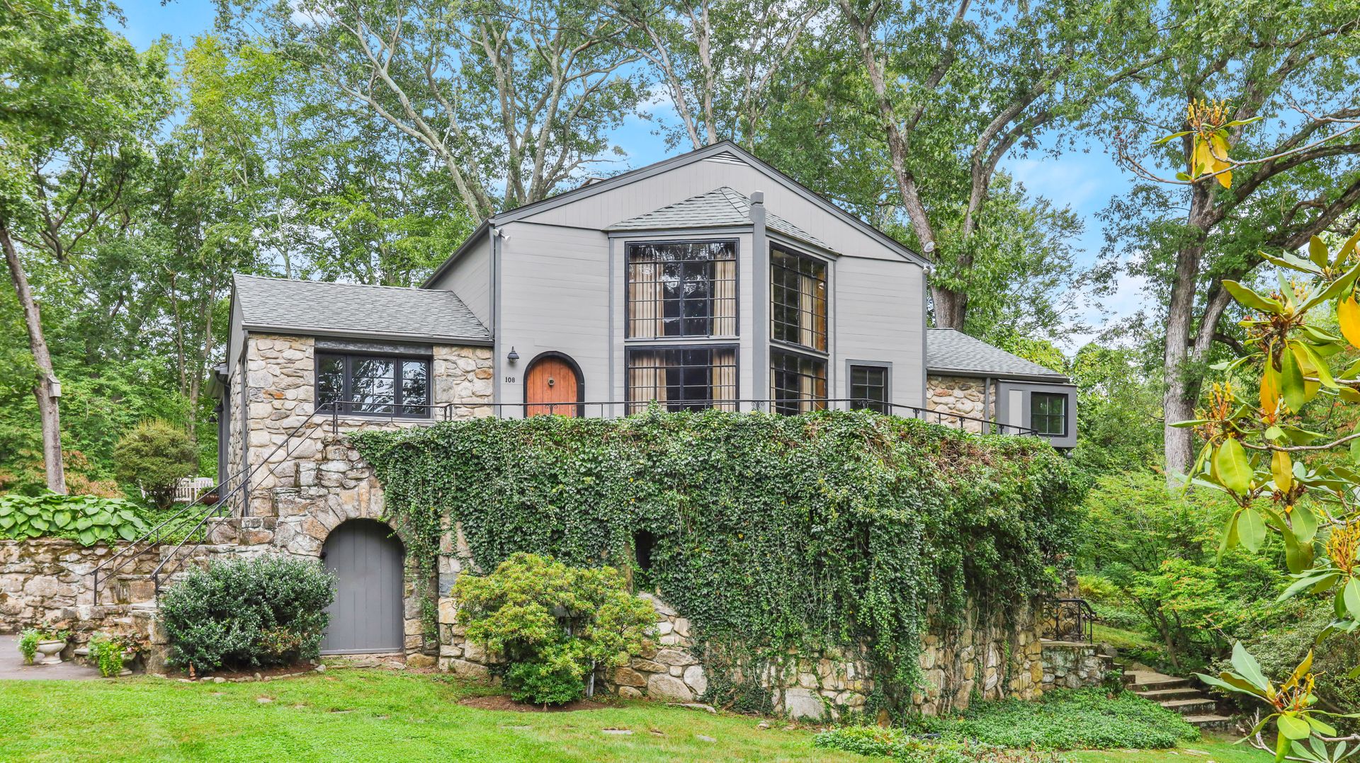 A private retreat is what you'll find as you pass stone columns, wind down the drive past the grounds and arrive at Waterock Cottage. This three bedroom, three bath, completely renovated home will take your breath away. Climb the curved staircase to the ivy-covered stone terrace to discover serenity. Inside continues to surprise and delight. The eat-in kitchen with vaulted ceiling, custom cabinetry, island and high-end appliances is the heart of the home and opens to a family room with fireplace, pantry/office and mudroom. French doors open to a patio great for indoor/outdoor entertaining. The main level features a great room with fireplace and floor-to-ceiling windows, en suite bedroom, second bedroom, full bath and office/guest room. The second level features the primary bedroom with fireplace, en suite bath, walk-in closet and loft, perfect for an office. The finished lower level has a laundry room and a flex use room. You'll love the outdoor spaces, including wrap-around bluestone patio with fireplace, screened greenhouse, potting shed and wood shed on the three-acre property which abuts Aspetuck Land Trust. This property feels like you are on vacation in Sonoma, with its terraced rolling hills, yet you are only moments to award winning Weston schools and a quick trip to Westport beaches and train to NYC.