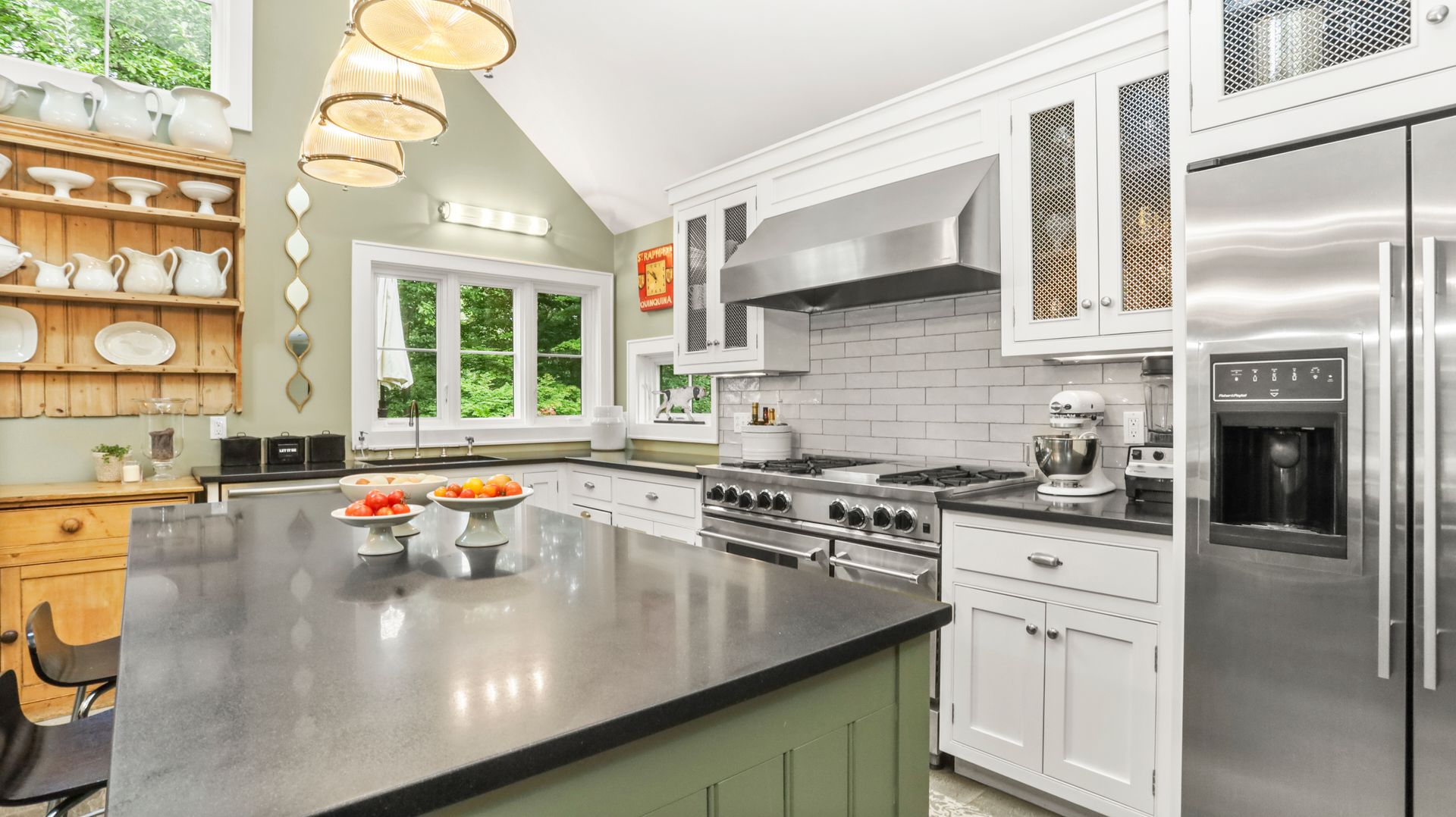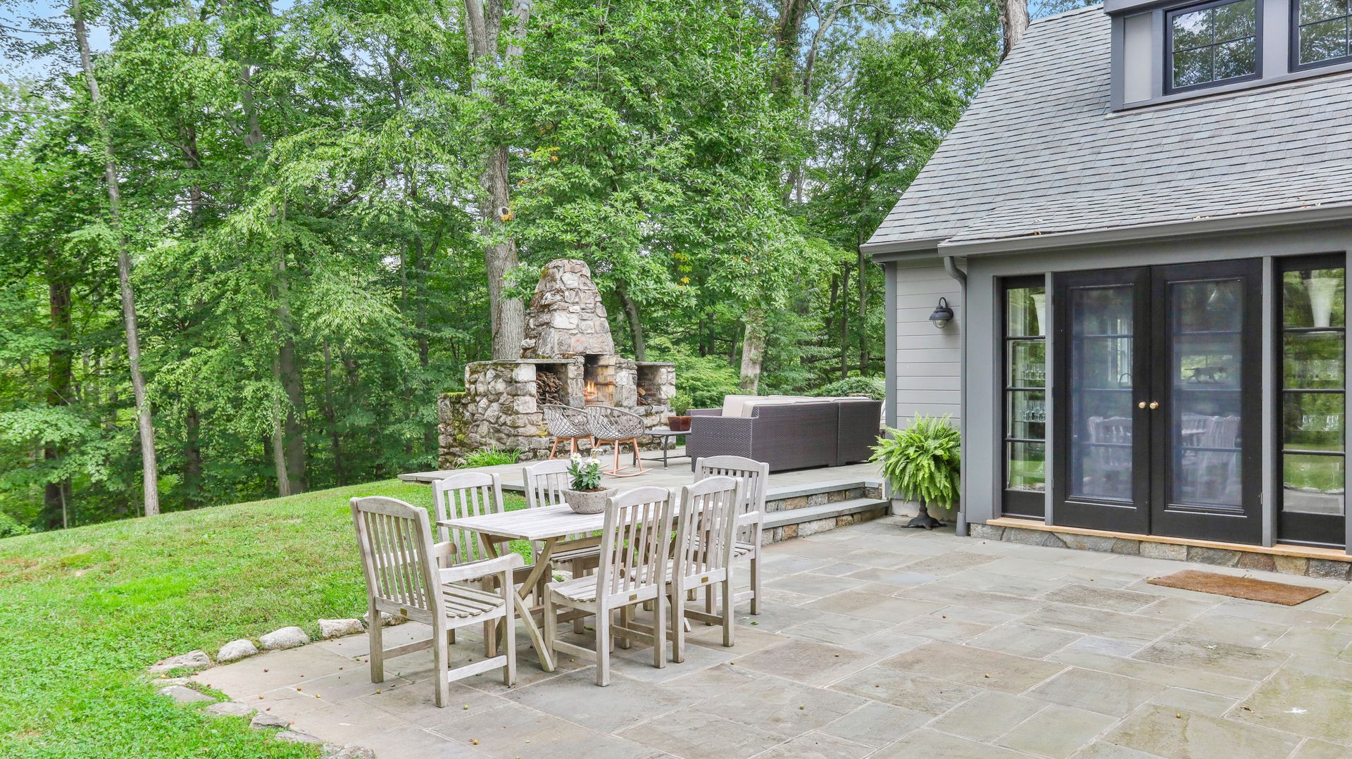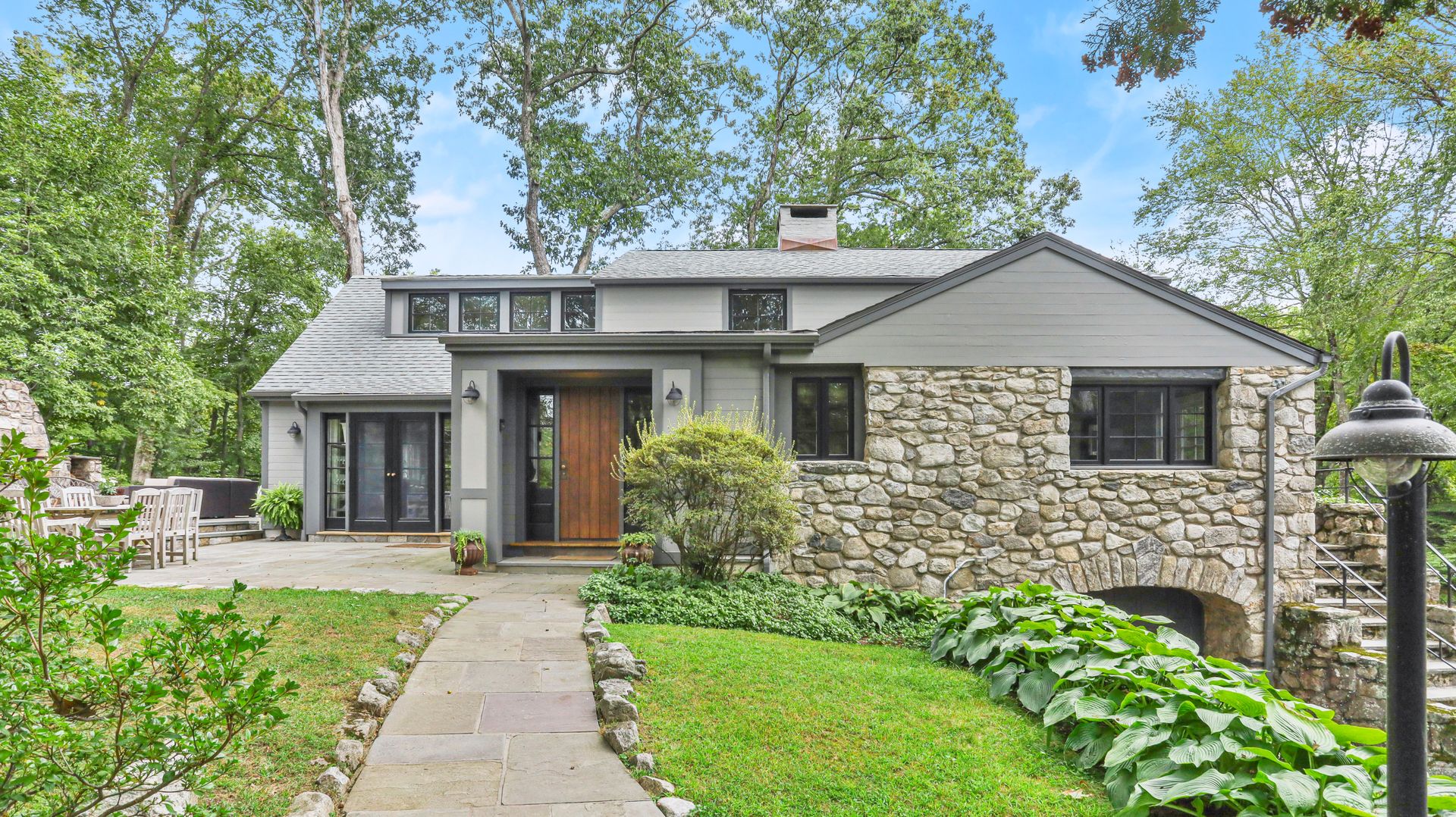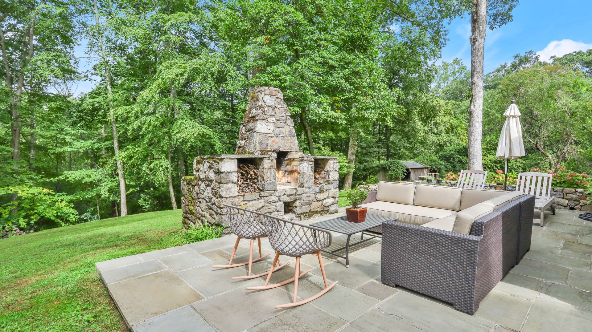 A private retreat is what you'll find as you pass stone columns, wind down the drive past the grounds and arrive at Waterock Cottage. This three bedroom, three bath, completely renovated home will take your breath away. Climb the curved staircase to the ivy-covered stone terrace to discover serenity. Inside continues to surprise and delight. The eat-in kitchen with vaulted ceiling, custom cabinetry, island and high-end appliances is the heart of the home and opens to a family room with fireplace, pantry/office and mudroom. French doors open to a patio great for indoor/outdoor entertaining. The main level features a great room with fireplace and floor-to-ceiling windows, en suite bedroom, second bedroom, full bath and office/guest room. The second level features the primary bedroom with fireplace, en suite bath, walk-in closet and loft, perfect for an office. The finished lower level has a laundry room and a flex use room. You'll love the outdoor spaces, including wrap-around bluestone patio with fireplace, screened greenhouse, potting shed and wood shed on the three-acre property which abuts Aspetuck Land Trust. This property feels like you are on vacation in Sonoma, with its terraced rolling hills, yet you are only moments to award winning Weston schools and a quick trip to Westport beaches and train to NYC.