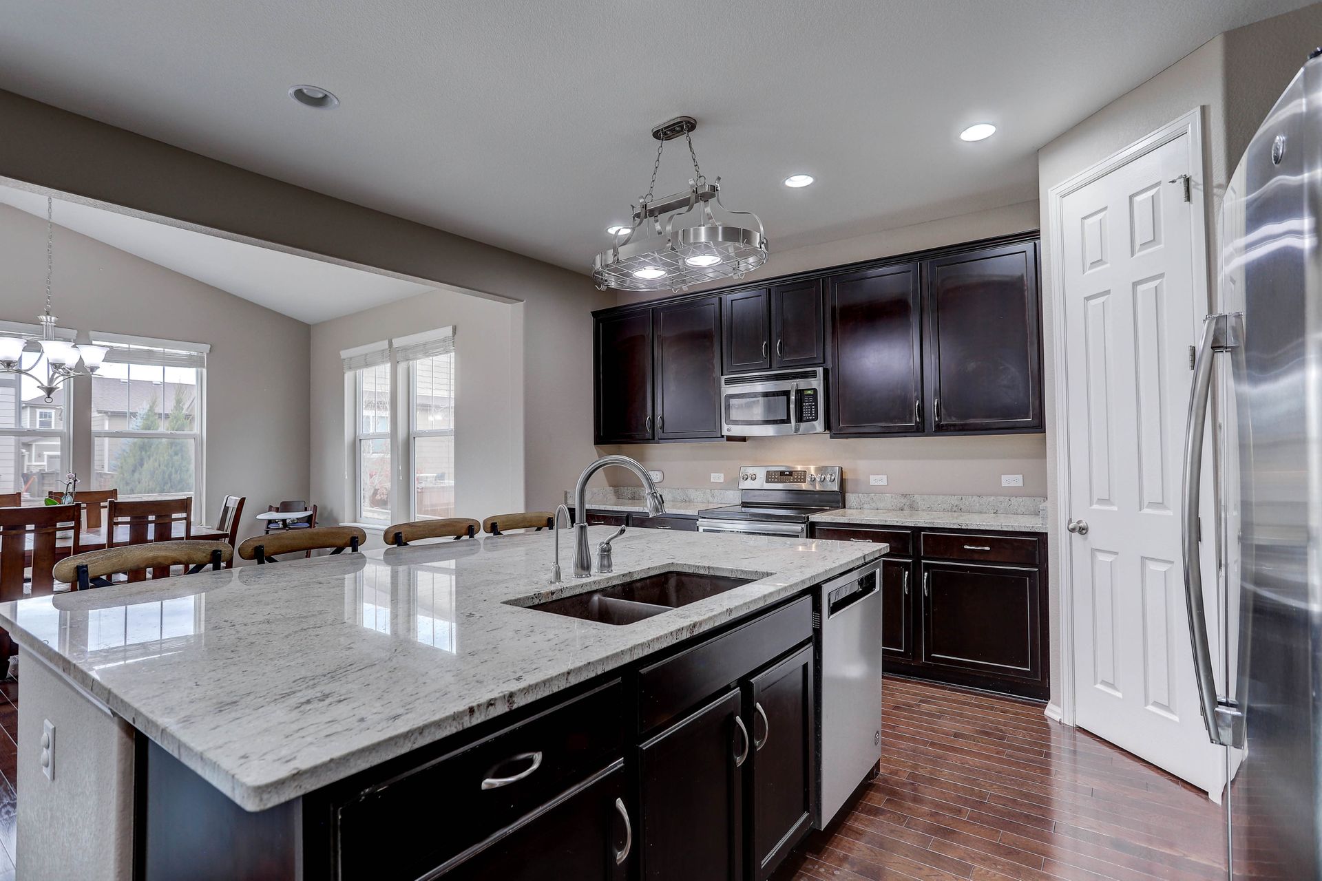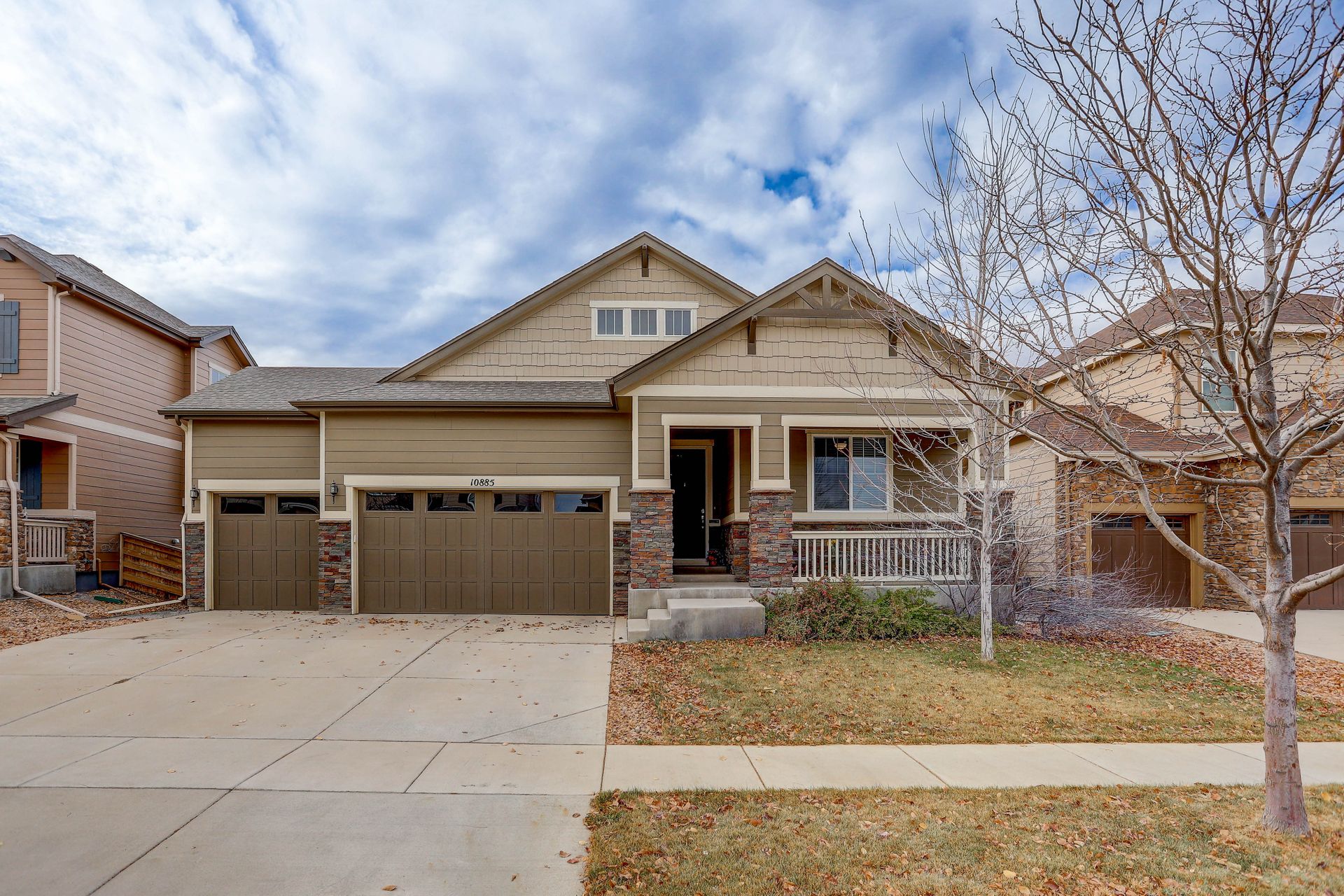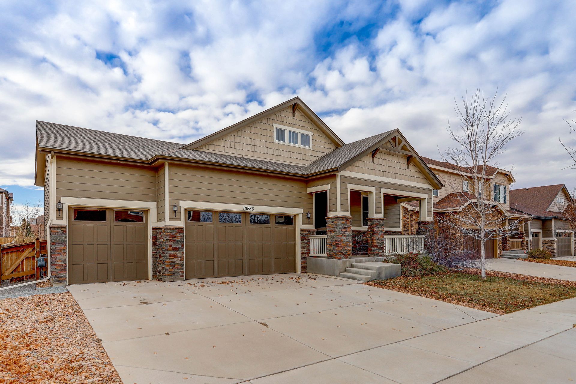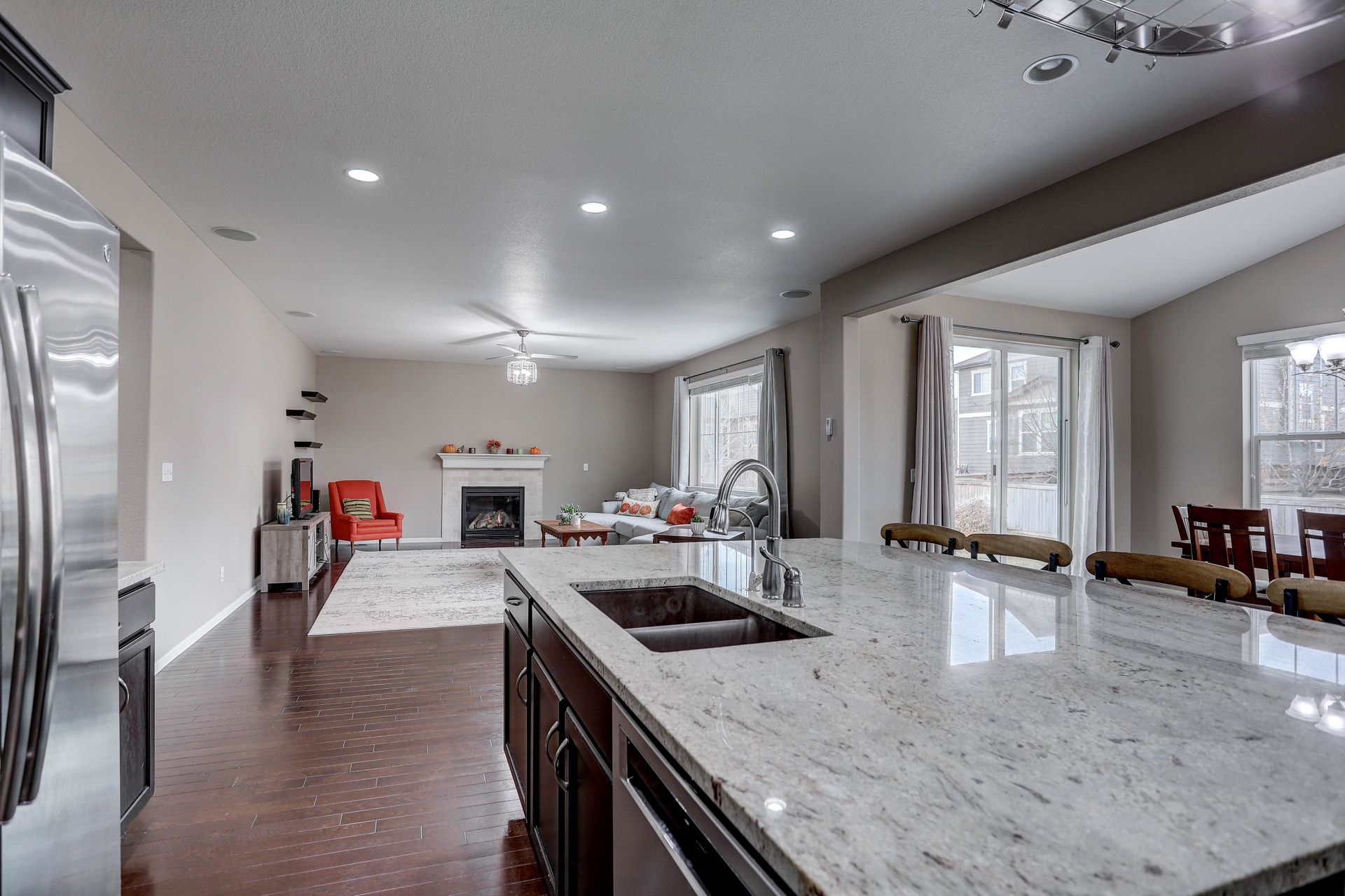 Amazing ranch style home located in the quiet Reunion neighborhood. Head into the bright and open home featuring upgrades throughout. From the flowing wood flooring to the eight-foot doors and ten-foot ceilings, this spacious inviting home is welcoming. The gourmet kitchen is a chef's dream with all stainless appliances, a walk-in pantry, huge kitchen island with sink, extensive stone counters and more. The kitchen opens onto a bright and cheery sunroom/dining space along with a spacious family room with a gas fireplace. The master suite features a recessed ceiling, ceiling fan, walk-in closet and luxurious five-piece bath. The main plan also includes a formal dining/flex space, two more bedrooms, a full bath and laundry. Downstairs features an open floor plan with space for games, a TV viewing space and more. Fourth bedroom, a three-quarter bath and storage space complete the lower level. Exit outside onto a concrete patio and enjoy a gorgeous fully fenced backyard. The three-car garage has high ceilings for additional storage! Two blocks away from Reunion Park with expansive green space and the community pool! Close to the elementary school. The home is perfect for entertaining! Looks almost new and is ready for you!