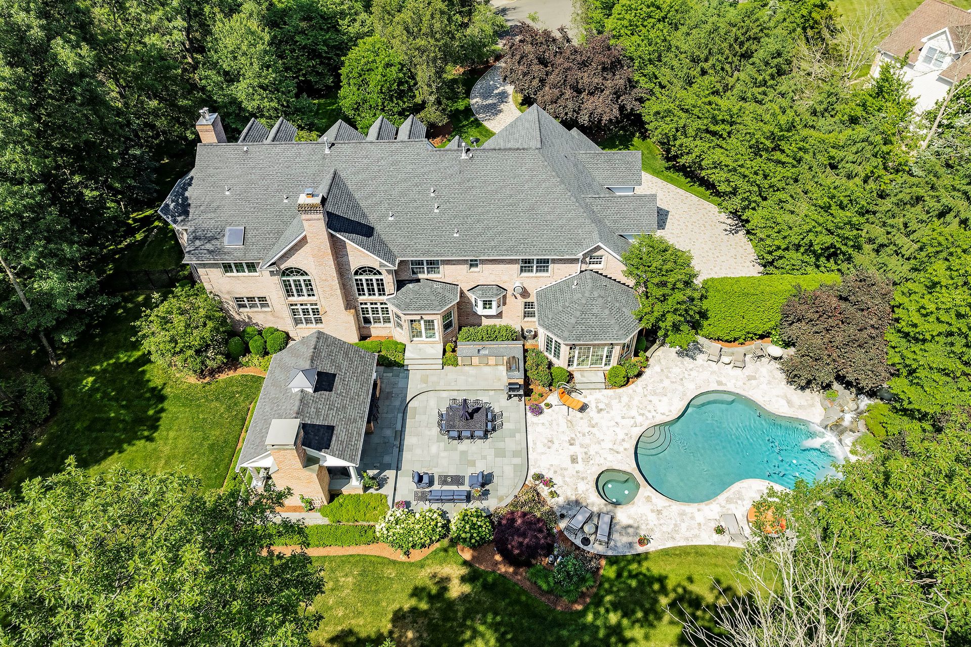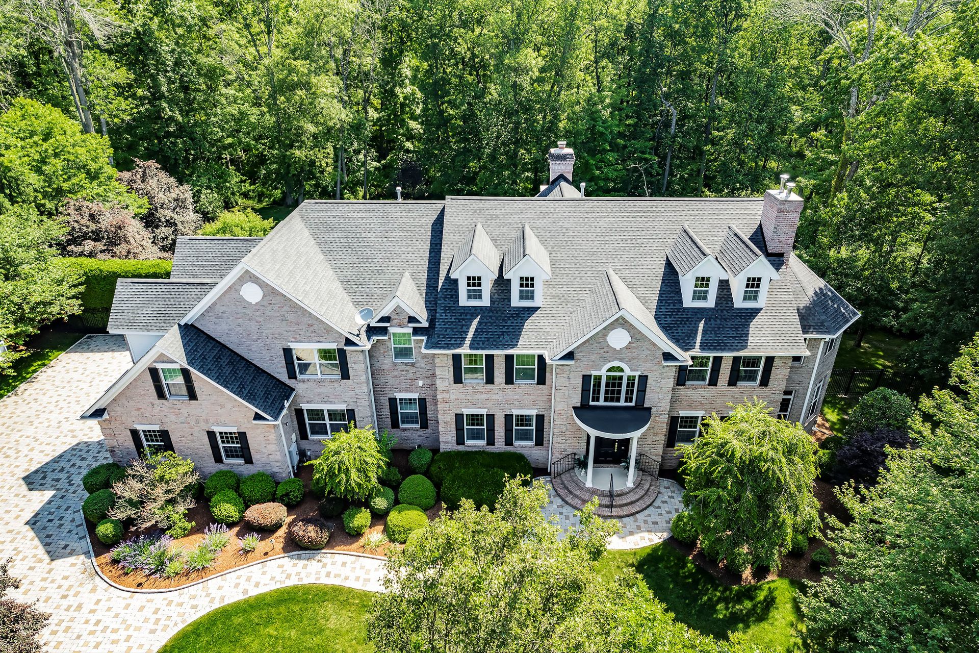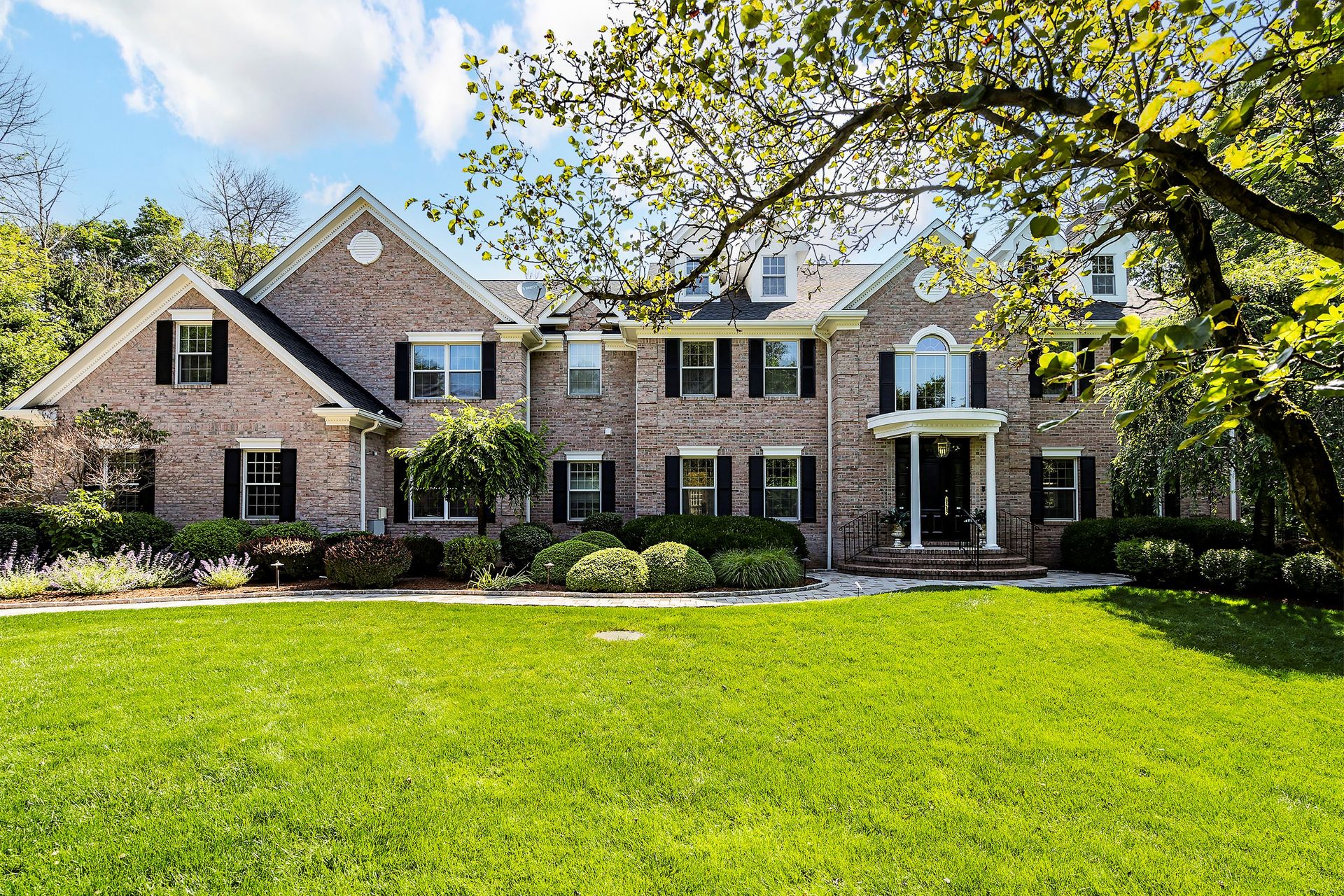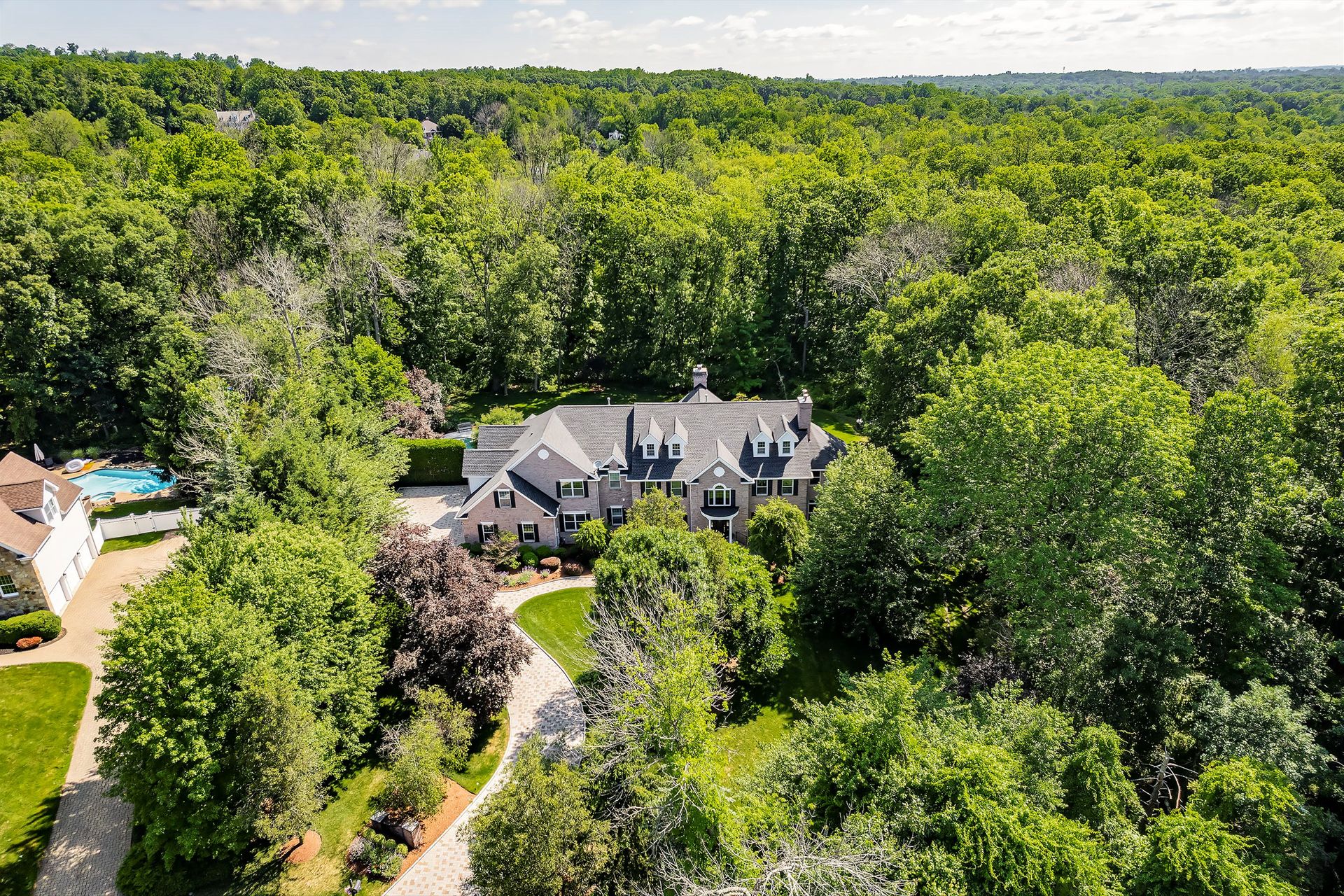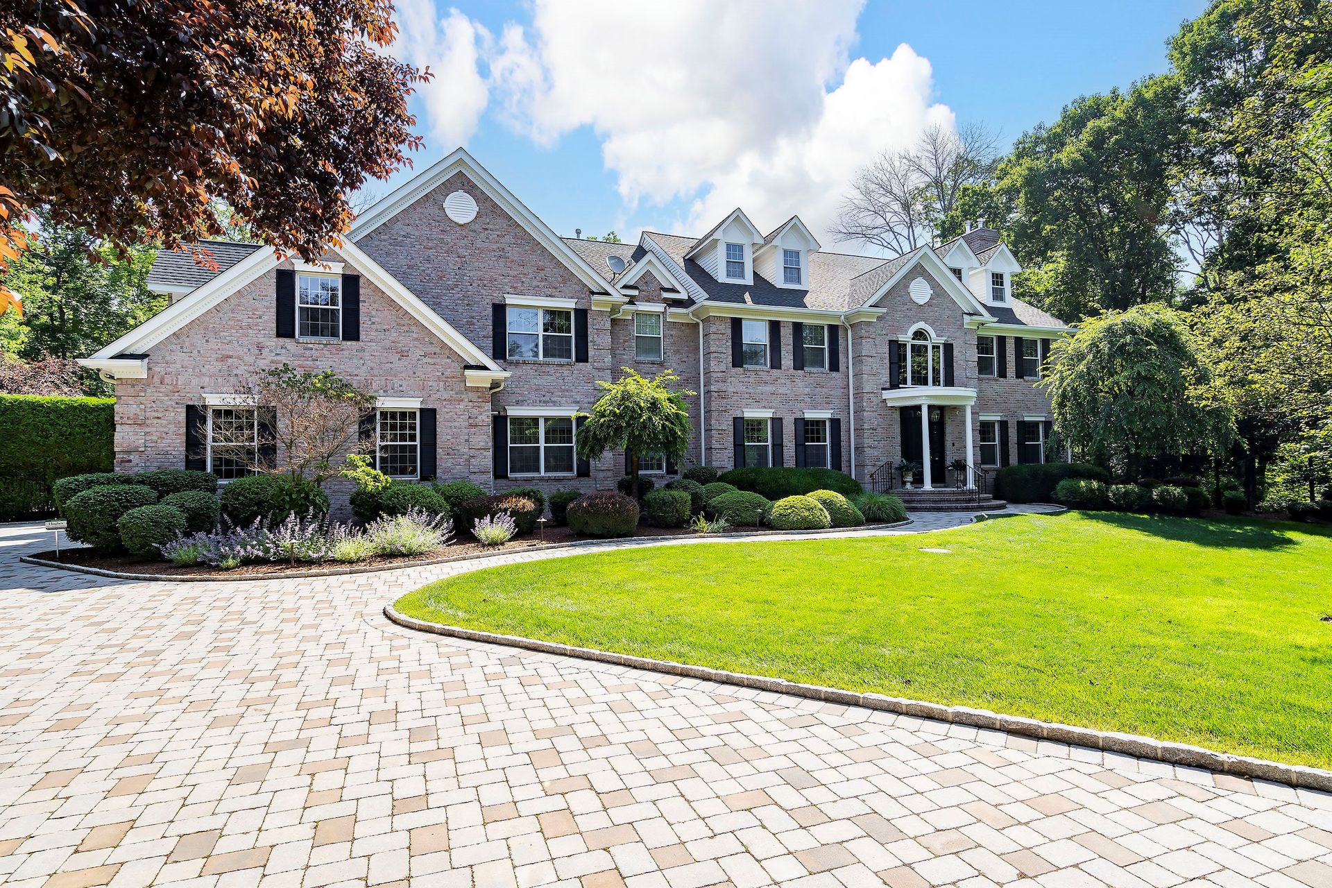 Tucked away in a serene cul-de-sac, this exquisite custom brick colonial is a must-see that sits on nearly six acres of lush greenery, adorned with mature trees and vibrant plantings. This beautiful home includes six bedrooms - five bedrooms plus a media room and recreation room on the second level - and an additional bedroom and full bath on the first level. Boasting an array of luxurious features, including soaring ceilings, a four-car garage, four cozy fireplaces, a refreshing pool with a charming cabana, a pavilion with fireplace and outdoor kitchen and a sophisticated wine cellar, the spacious layout is even further enhanced by intricate moldings. The home also features a handsome wood-paneled library, a bright sunroom, a generous eat-in chef's kitchen equipped with top-of-the-line appliances, an elevator that conveniently serves all three levels and a full house generator for added convenience. A fully finished basement offering a sizable exercise room, a dance studio and another full bath completes this amazing space.