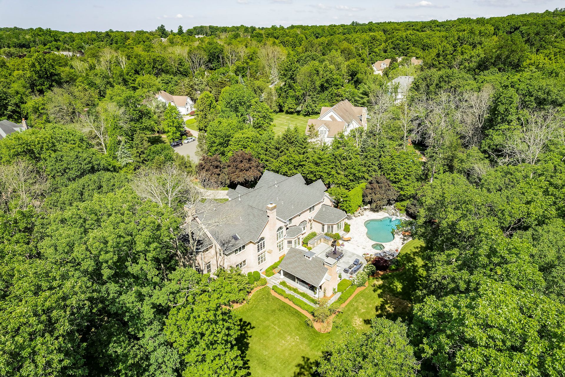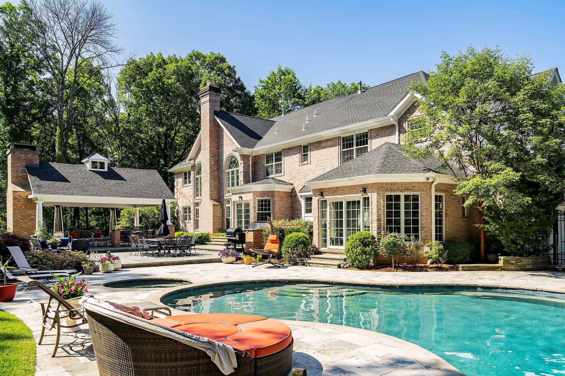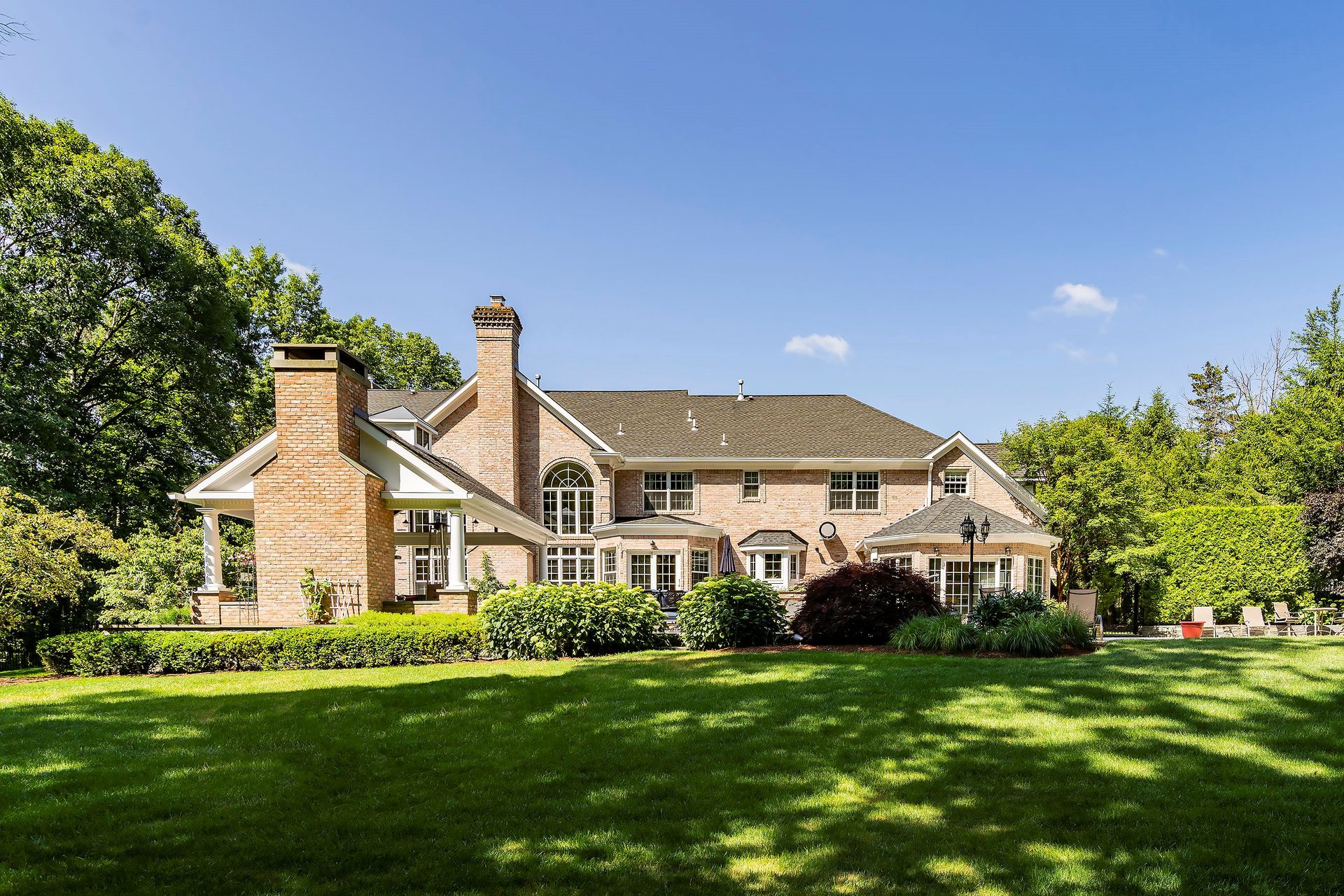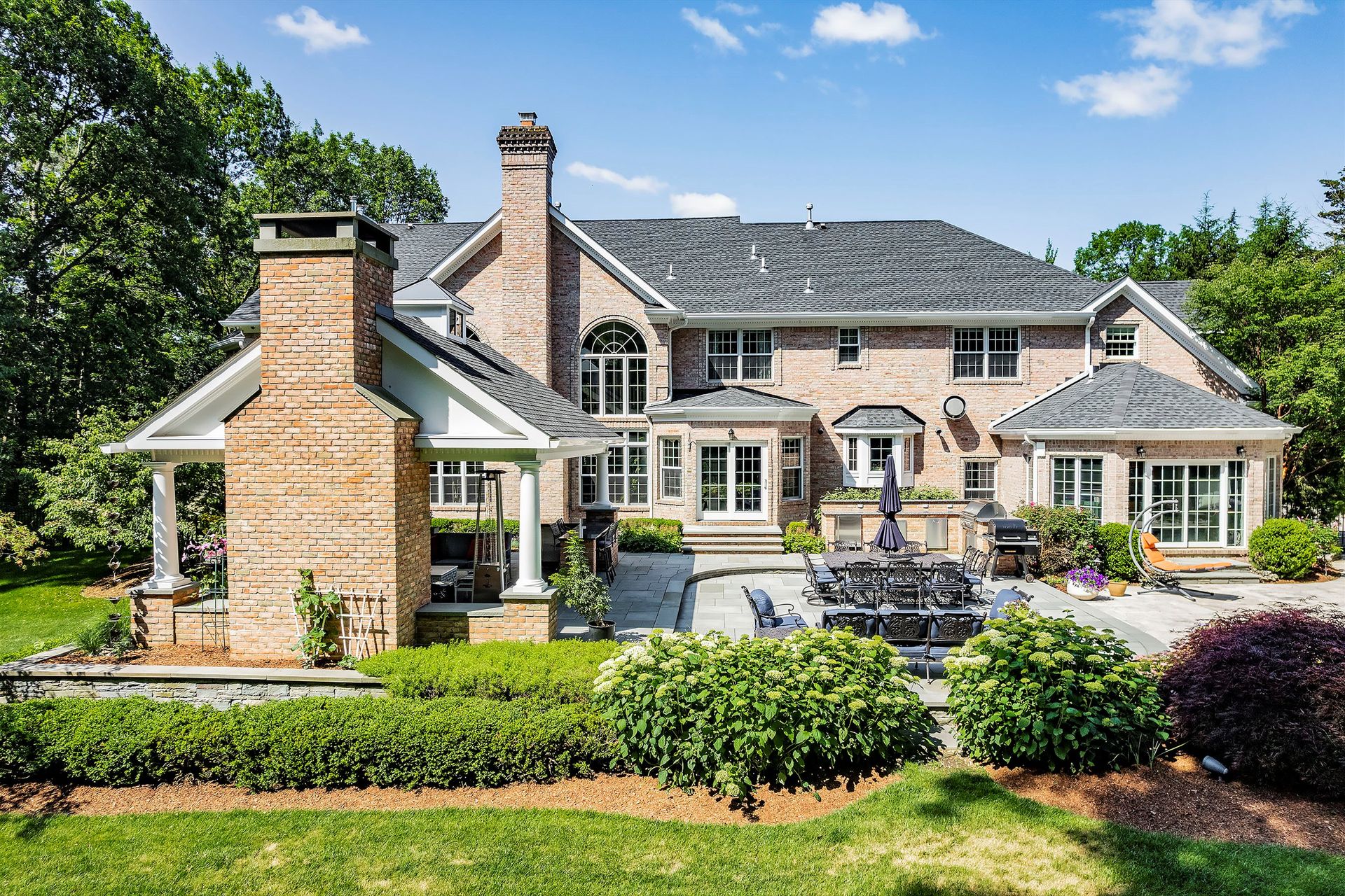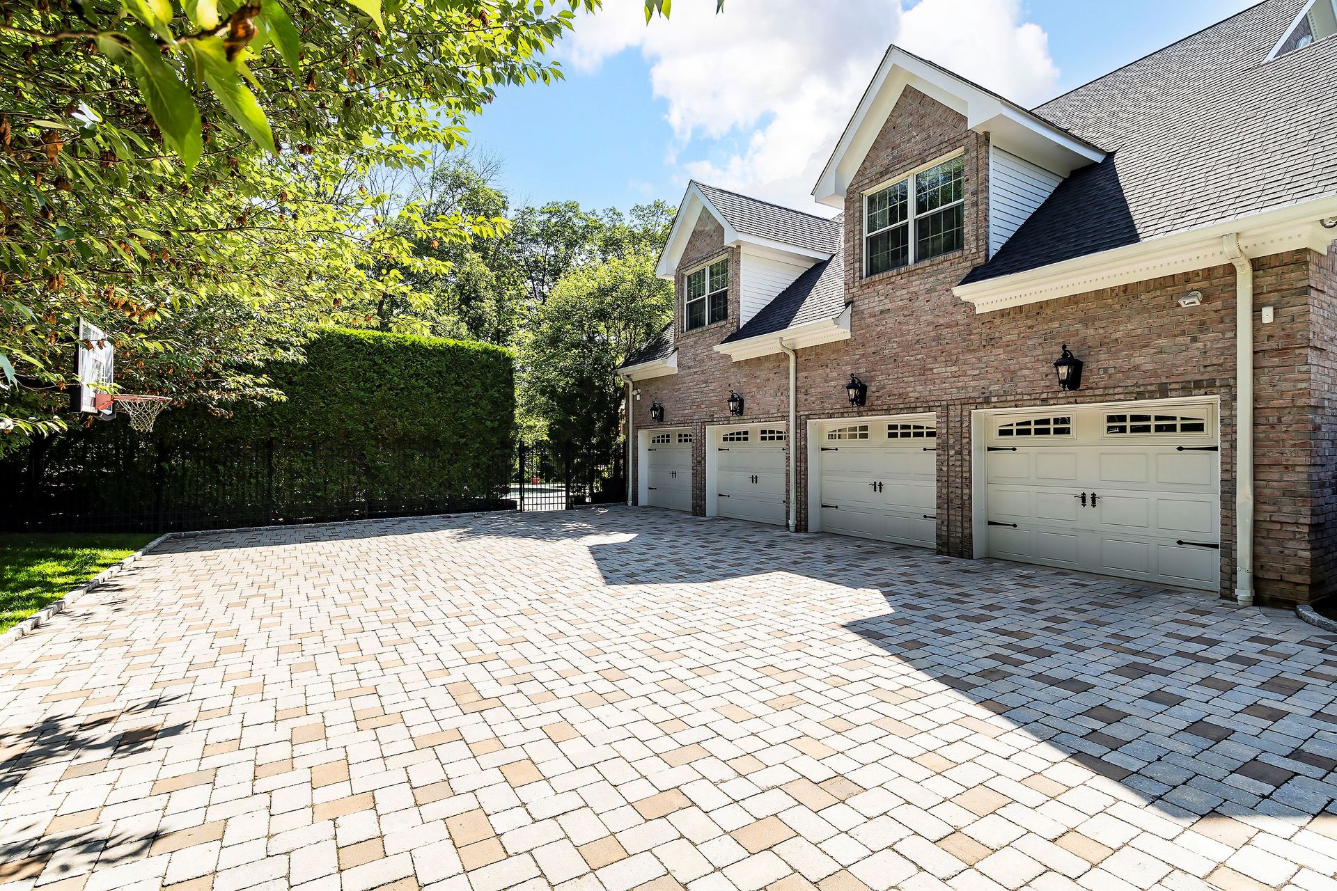 Tucked away in a serene cul-de-sac, this exquisite custom brick colonial is a must-see that sits on nearly six acres of lush greenery, adorned with mature trees and vibrant plantings. This beautiful home includes six bedrooms - five bedrooms plus a media room and recreation room on the second level - and an additional bedroom and full bath on the first level. Boasting an array of luxurious features, including soaring ceilings, a four-car garage, four cozy fireplaces, a refreshing pool with a charming cabana, a pavilion with fireplace and outdoor kitchen and a sophisticated wine cellar, the spacious layout is even further enhanced by intricate moldings. The home also features a handsome wood-paneled library, a bright sunroom, a generous eat-in chef's kitchen equipped with top-of-the-line appliances, an elevator that conveniently serves all three levels and a full house generator for added convenience. A fully finished basement offering a sizable exercise room, a dance studio and another full bath completes this amazing space.