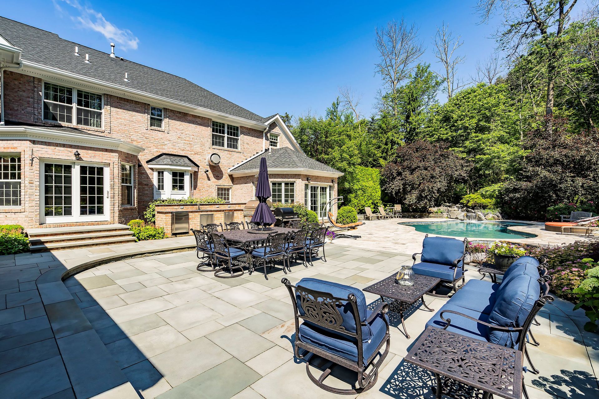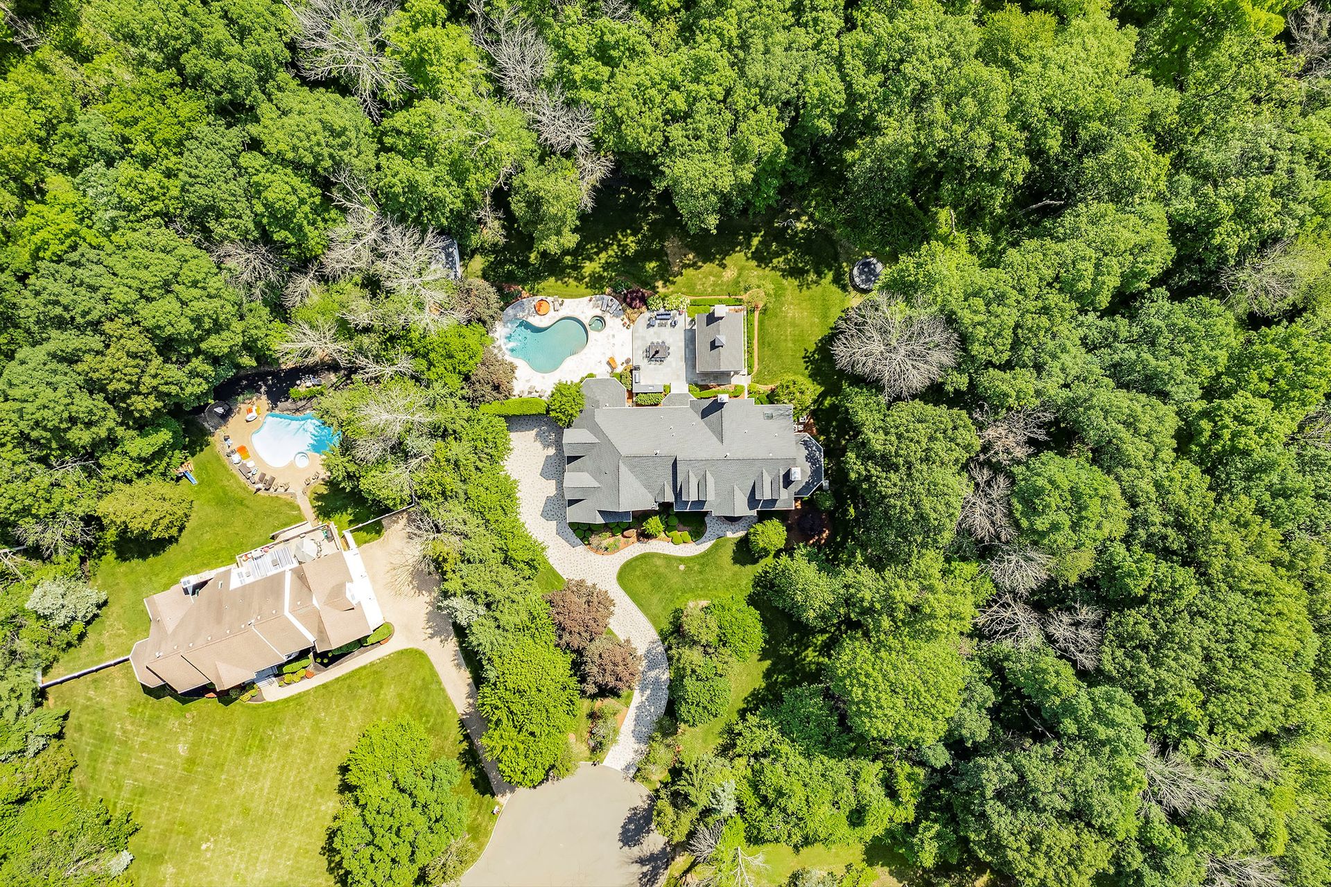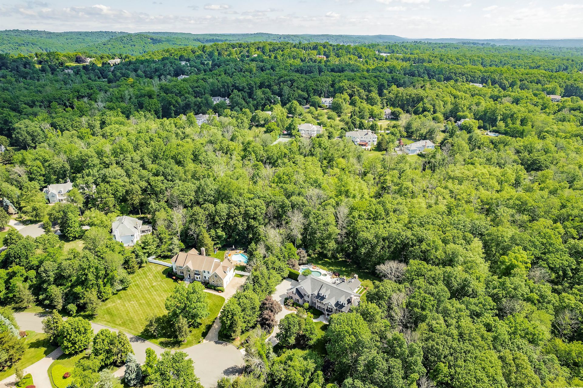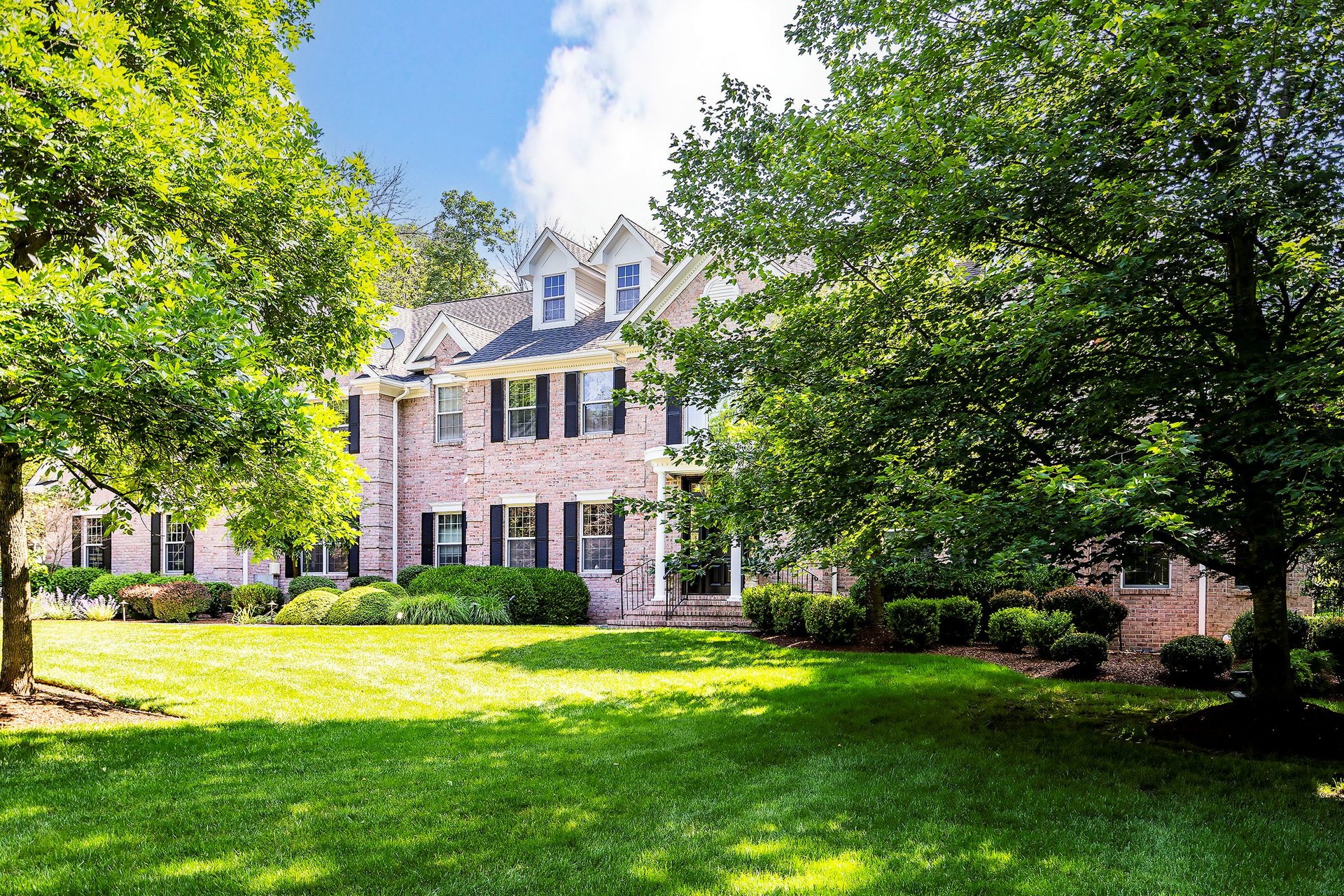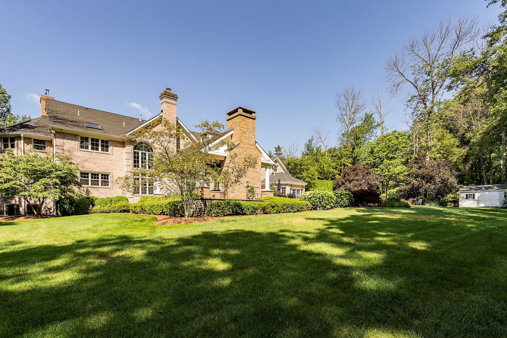 Tucked away in a serene cul-de-sac, this exquisite custom brick colonial is a must-see that sits on nearly six acres of lush greenery, adorned with mature trees and vibrant plantings. This beautiful home includes six bedrooms - five bedrooms plus a media room and recreation room on the second level - and an additional bedroom and full bath on the first level. Boasting an array of luxurious features, including soaring ceilings, a four-car garage, four cozy fireplaces, a refreshing pool with a charming cabana, a pavilion with fireplace and outdoor kitchen and a sophisticated wine cellar, the spacious layout is even further enhanced by intricate moldings. The home also features a handsome wood-paneled library, a bright sunroom, a generous eat-in chef's kitchen equipped with top-of-the-line appliances, an elevator that conveniently serves all three levels and a full house generator for added convenience. A fully finished basement offering a sizable exercise room, a dance studio and another full bath completes this amazing space.