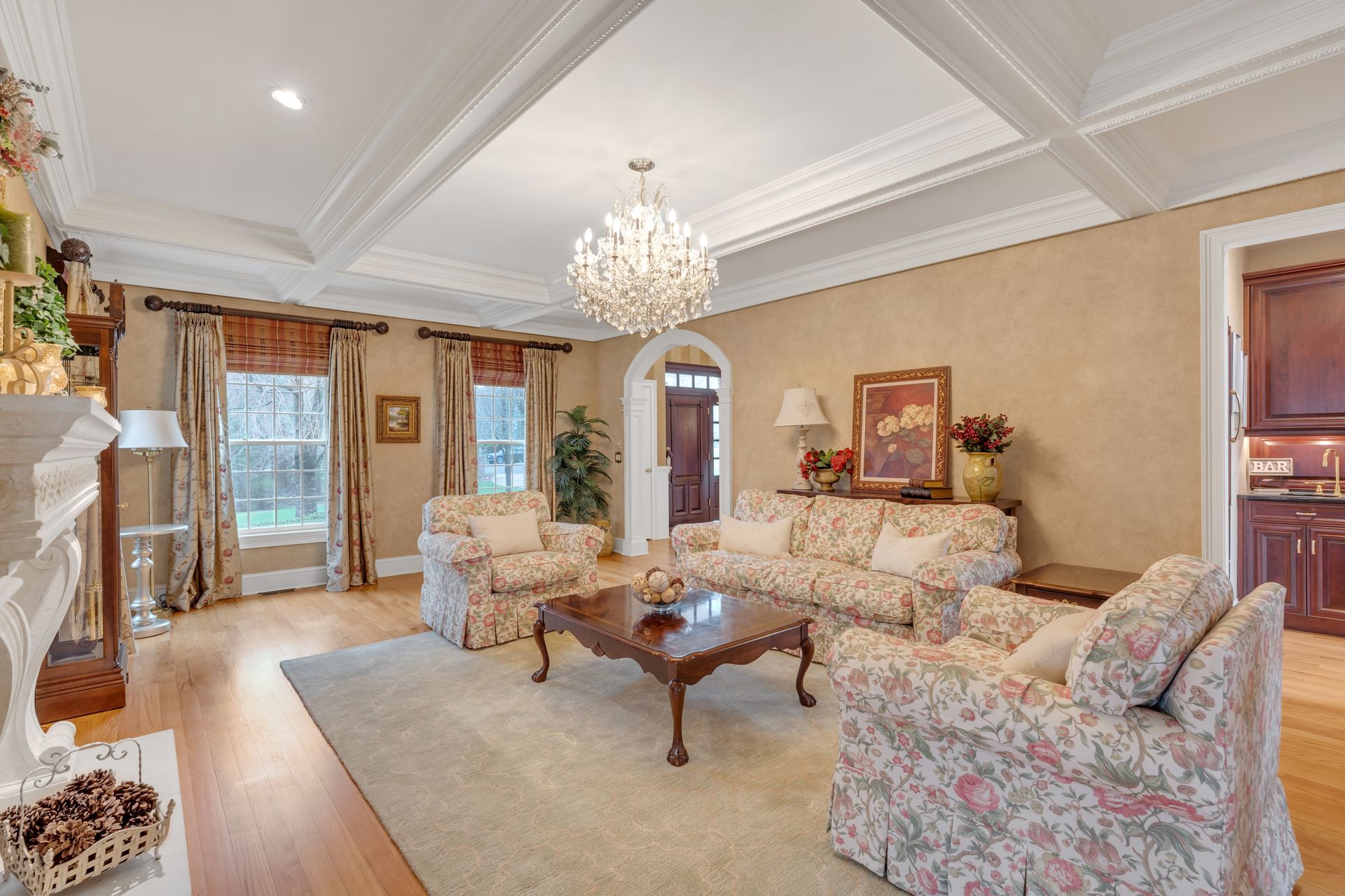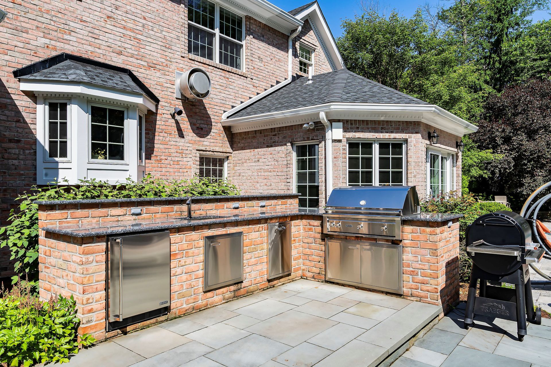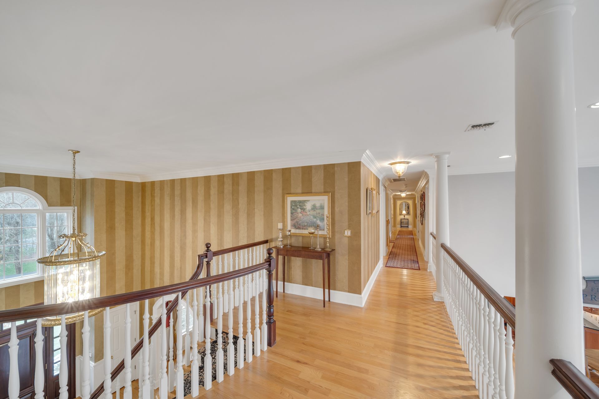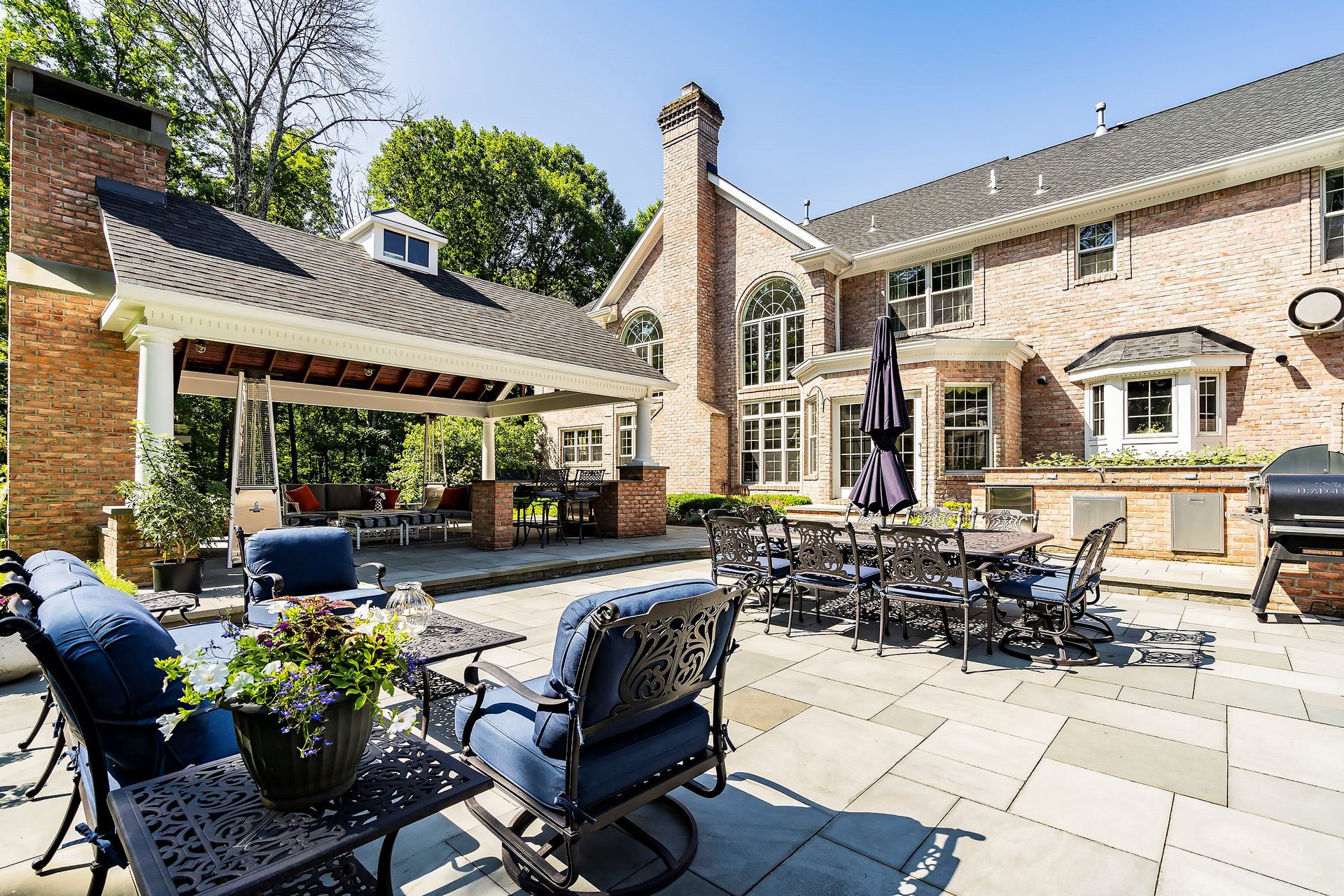 Tucked away in a serene cul-de-sac, this exquisite custom brick colonial is a must-see that sits on nearly six acres of lush greenery, adorned with mature trees and vibrant plantings. This beautiful home includes six bedrooms - five bedrooms plus a media room and recreation room on the second level - and an additional bedroom and full bath on the first level. Boasting an array of luxurious features, including soaring ceilings, a four-car garage, four cozy fireplaces, a refreshing pool with a charming cabana, a pavilion with fireplace and outdoor kitchen and a sophisticated wine cellar, the spacious layout is even further enhanced by intricate moldings. The home also features a handsome wood-paneled library, a bright sunroom, a generous eat-in chef's kitchen equipped with top-of-the-line appliances, an elevator that conveniently serves all three levels and a full house generator for added convenience. A fully finished basement offering a sizable exercise room, a dance studio and another full bath completes this amazing space.