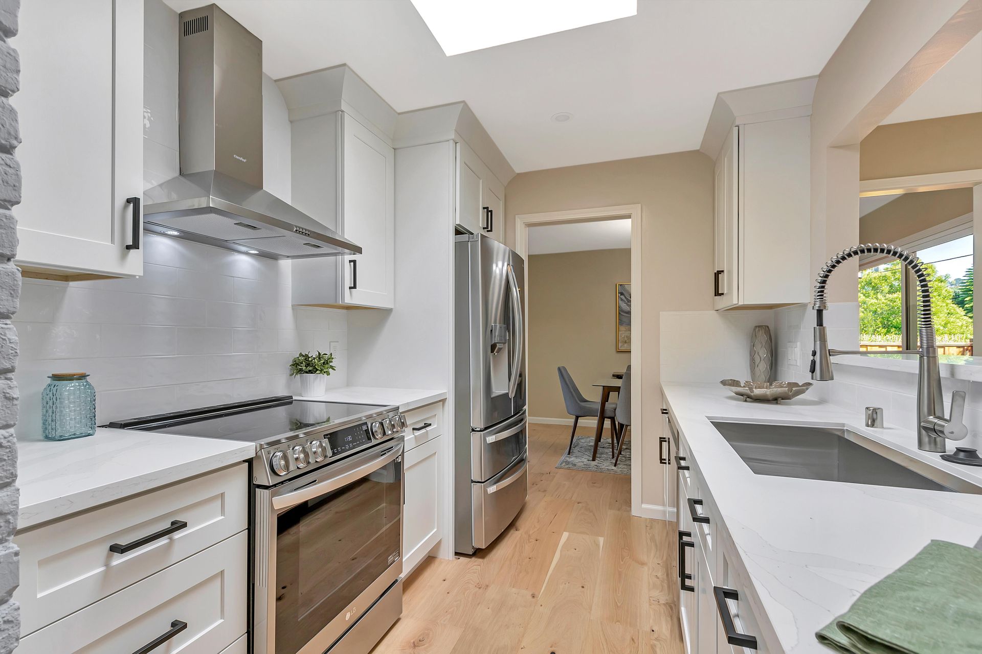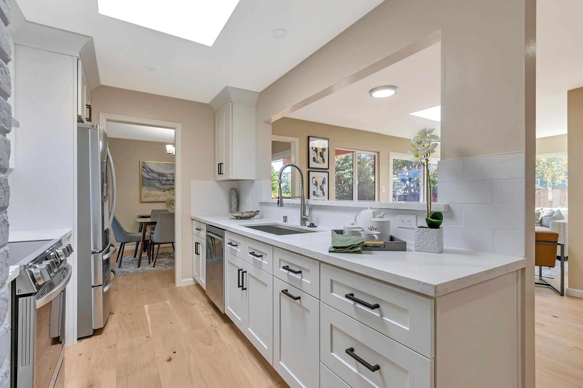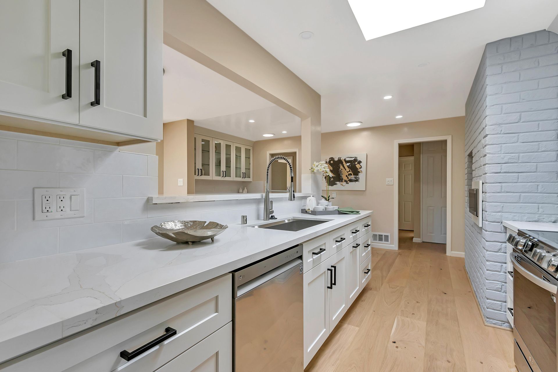This fabulous remodeled five bedroom, two bath ranch-style home is located on a corner lot in the desirable Meadows neighborhood of Millbrae. Features include a remodeled galley style kitchen with quartz countertops, tile backsplash, shaker cabinets, stainless steel appliances, an indoor barbecue, a breakfast bar and an adjacent breakfast nook with sun tunnel. Enjoy a family room with a skylight, recently installed hardwood floors, double pane windows, a freshly painted interior, a dining area, a living room with a fireplace and recessed lighting throughout. A primary bedroom suite offers mirrored closet doors and a remodeled bathroom with tiled floors, a quartz-topped vanity and a shower stall. Additional highlights include a remodeled hall bathroom with tiled floors, quartz-topped vanity and a tub with a shower enclosure, a landscaped backyard with a deck and lawn area, a landscaped front yard, an attached 2 garage with epoxy floors and more.