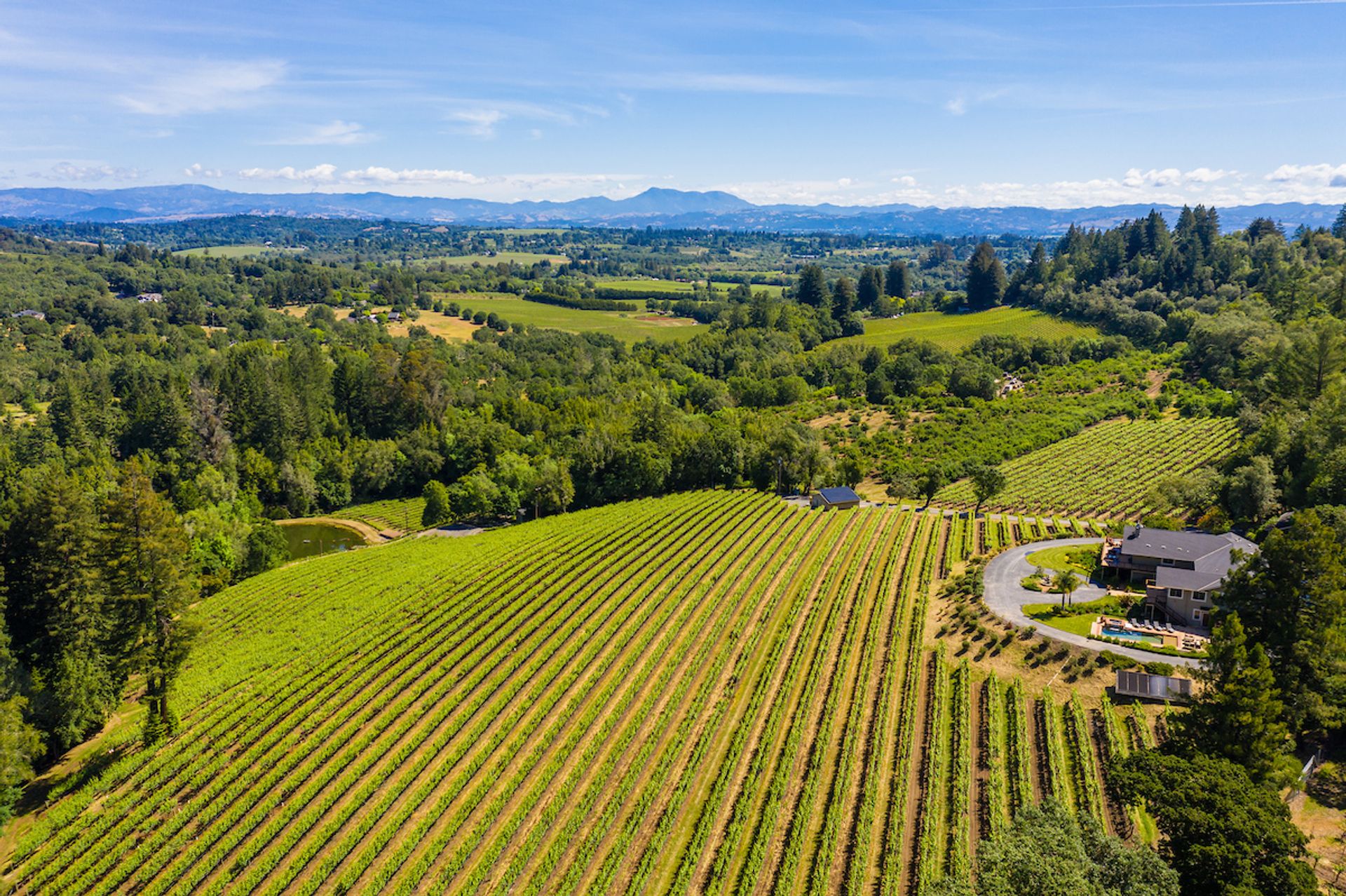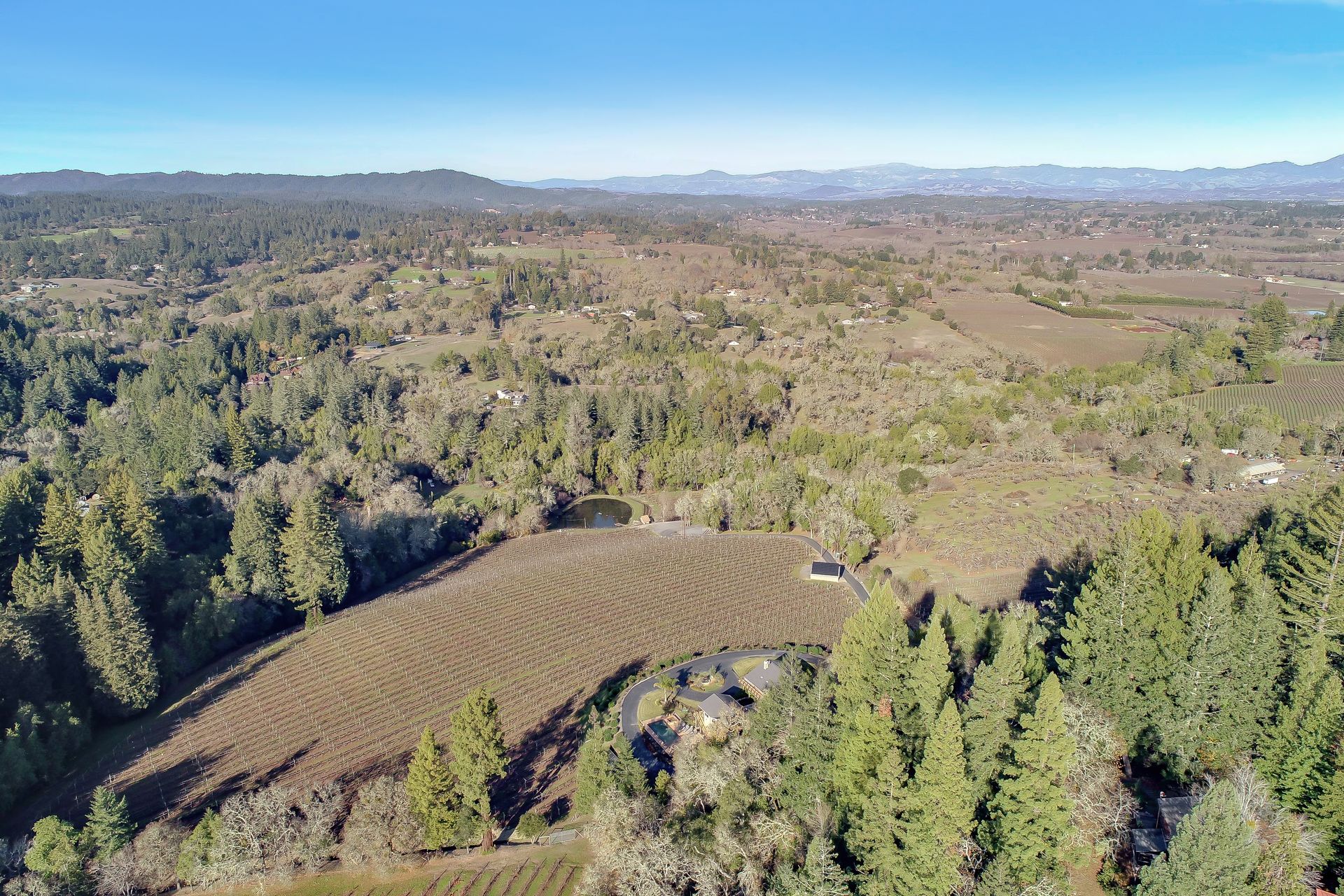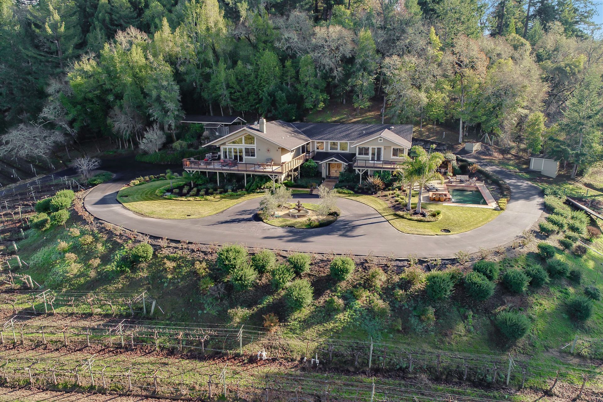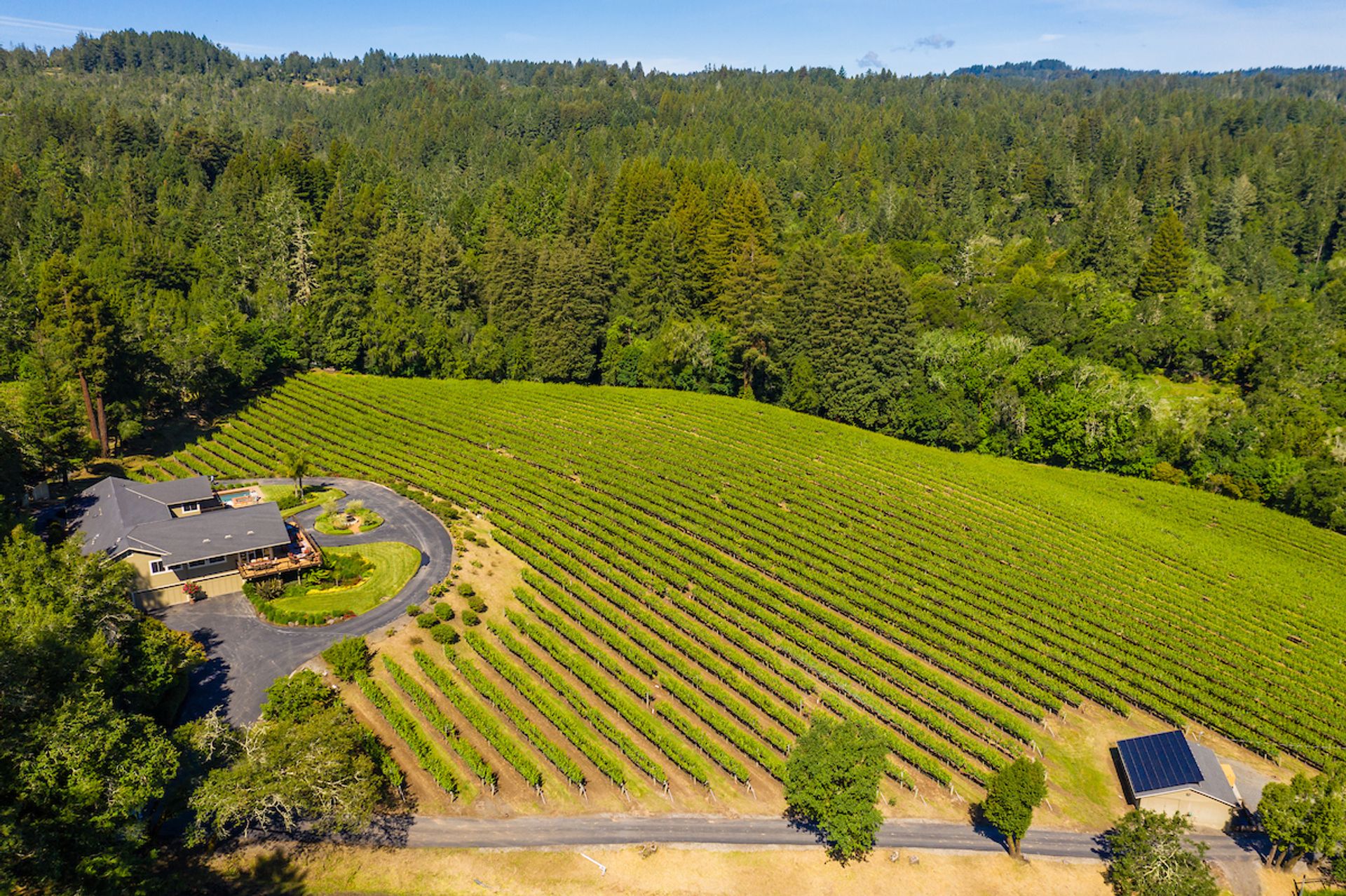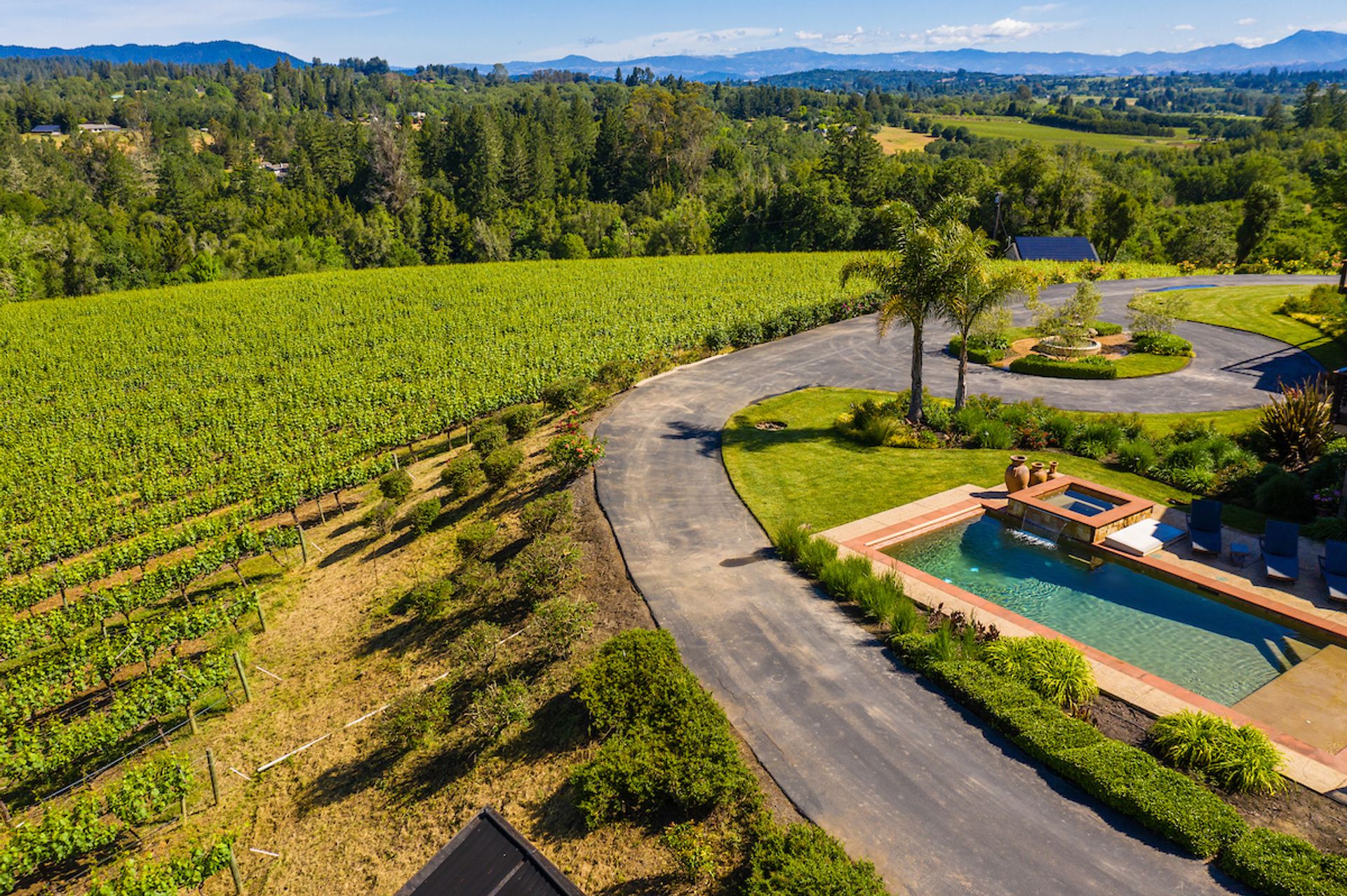 This approximately 18 acre, hilltop gated vineyard estate captures the ultimate Sonoma County dream. With breathtaking views, this stunning retreat features a roughly 6,089 square foot main residence with a two bedroom, one bath guest house, a solar heated pool and hot tub, an outdoor kitchen, cave-style wine cellar, large carport, barn and custom tree fort. The impressive foyer displays the chandelier lit grand staircase to the main level and a seven plus car garage. The lower level offers a large coat closet, office, one-half bath, a guest suite with heated floors and a walk-in closet. Enjoy the main level boasting a great room with vaulted ceilings, glass Nana walls, dining for 12 plus people, a laundry and hobby room, two bedrooms for guests and a master suite with a master closet built for the most discerning and a sun deck with pool access. The kitchen is made for entertaining with a supersized island, prep sink and large seating, three dishwashers, two microwaves, a warming drawer, an eight-burner Wolf range, three ovens, a refrigerator and a wet bar with a wine fridge. Enjoy alfresco dining on the terrace overlooking the approximately 10 acre world class Chardonnay vineyard.