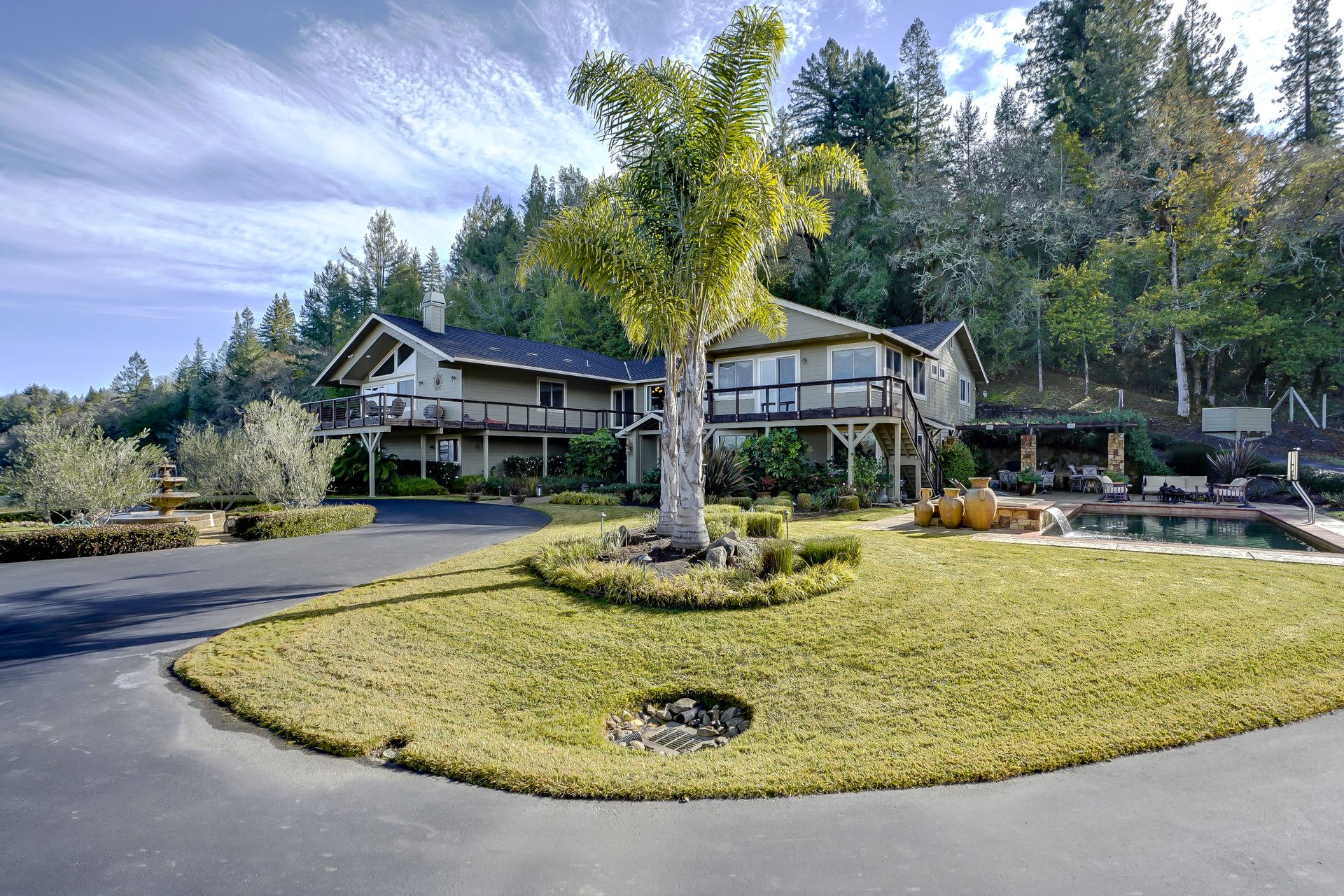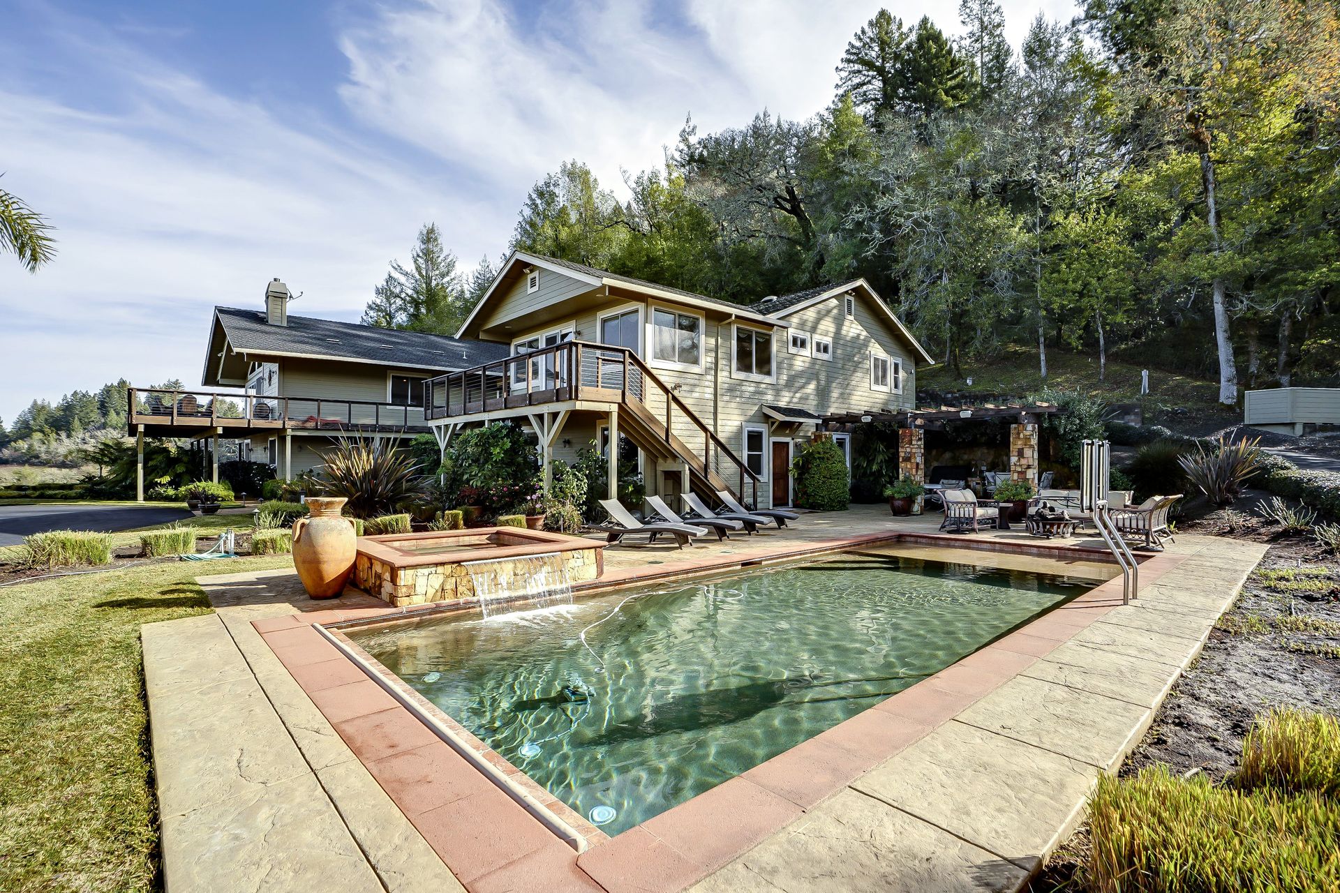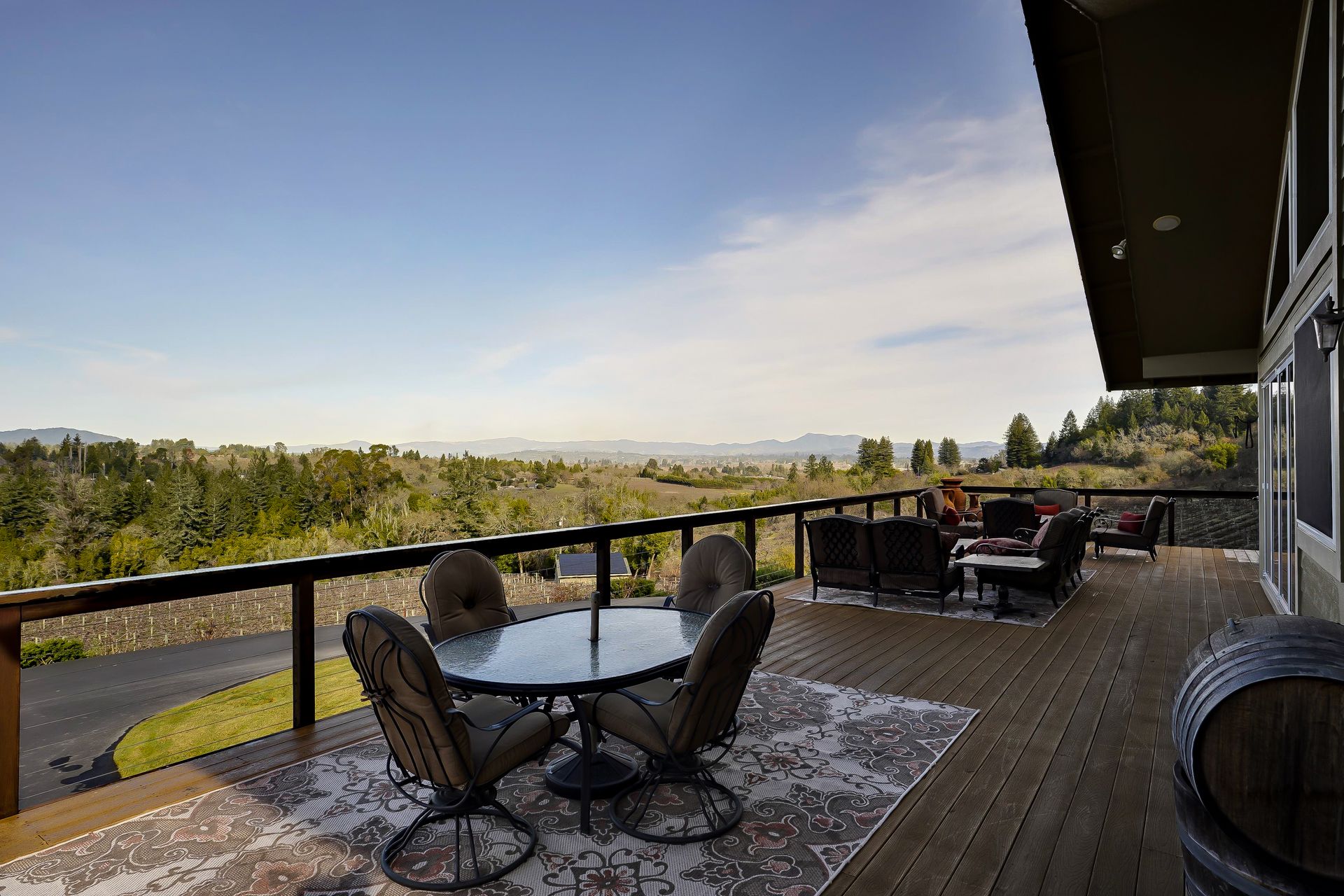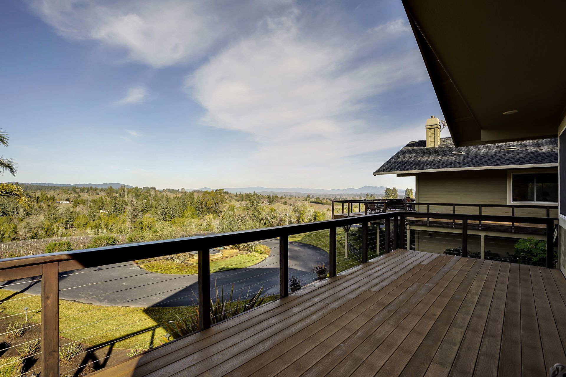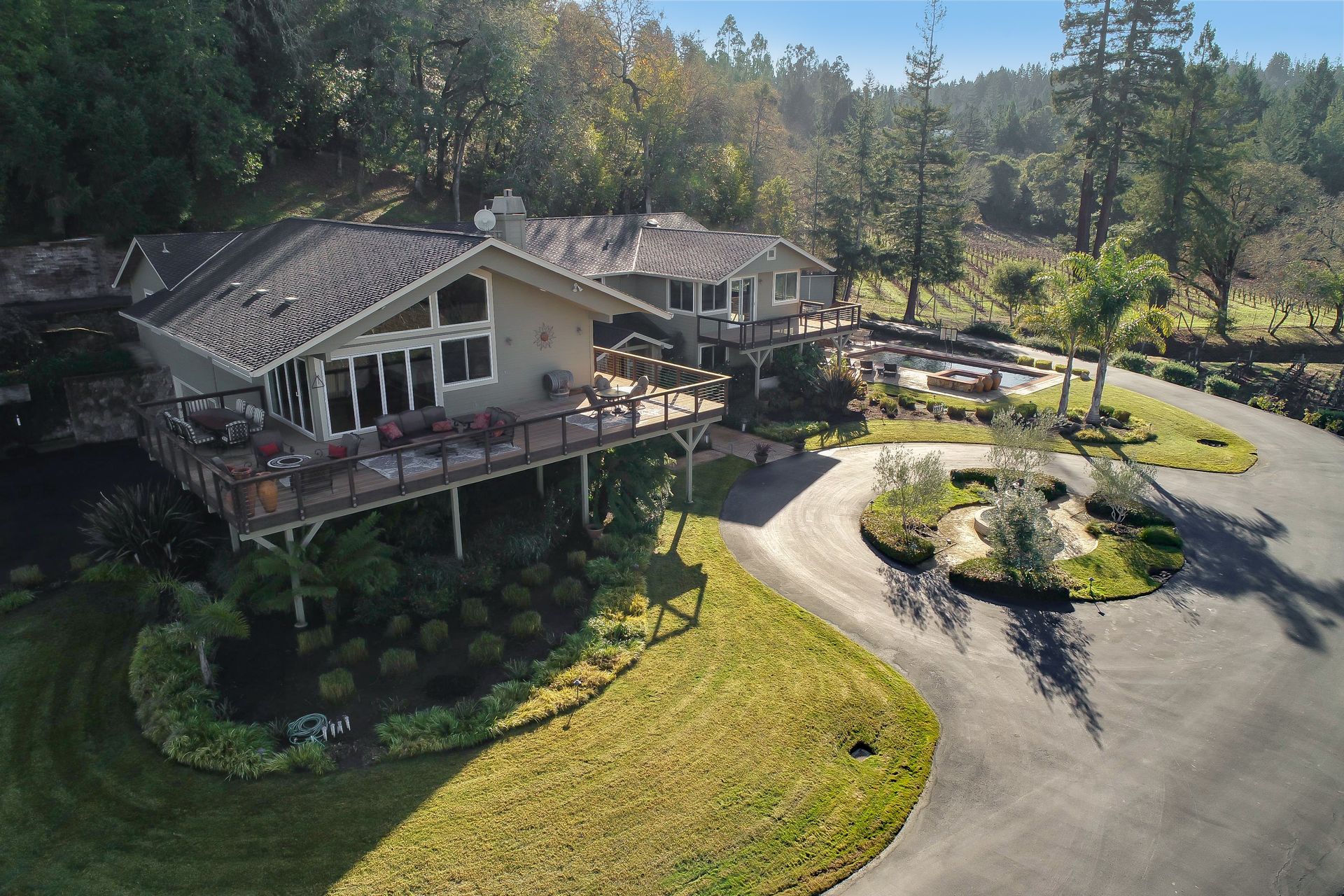 This approximately 18 acre, hilltop gated vineyard estate captures the ultimate Sonoma County dream. With breathtaking views, this stunning retreat features a roughly 6,089 square foot main residence with a two bedroom, one bath guest house, a solar heated pool and hot tub, an outdoor kitchen, cave-style wine cellar, large carport, barn and custom tree fort. The impressive foyer displays the chandelier lit grand staircase to the main level and a seven plus car garage. The lower level offers a large coat closet, office, one-half bath, a guest suite with heated floors and a walk-in closet. Enjoy the main level boasting a great room with vaulted ceilings, glass Nana walls, dining for 12 plus people, a laundry and hobby room, two bedrooms for guests and a master suite with a master closet built for the most discerning and a sun deck with pool access. The kitchen is made for entertaining with a supersized island, prep sink and large seating, three dishwashers, two microwaves, a warming drawer, an eight-burner Wolf range, three ovens, a refrigerator and a wet bar with a wine fridge. Enjoy alfresco dining on the terrace overlooking the approximately 10 acre world class Chardonnay vineyard.