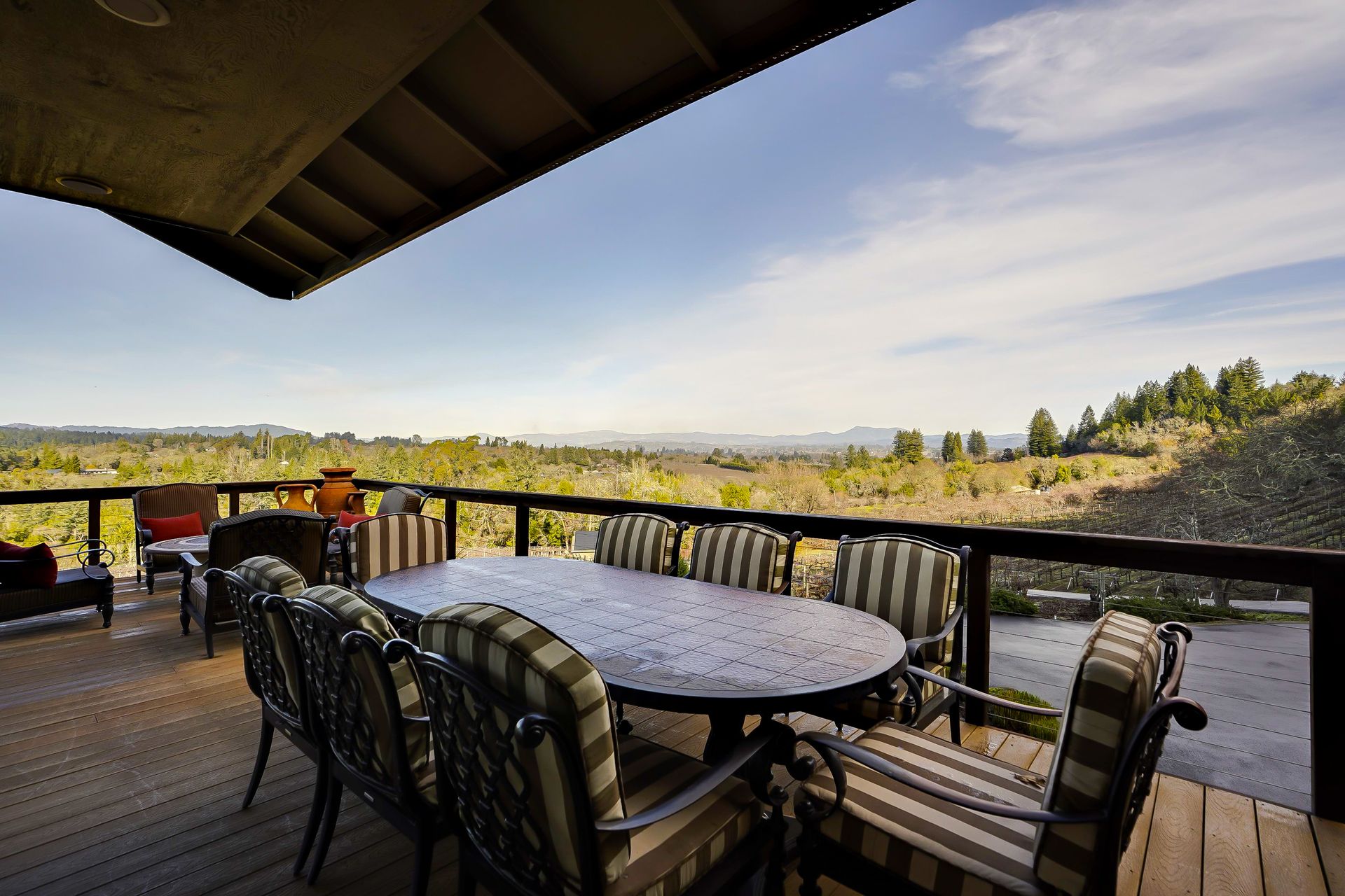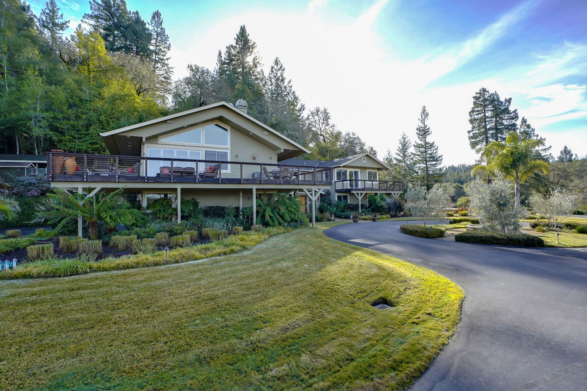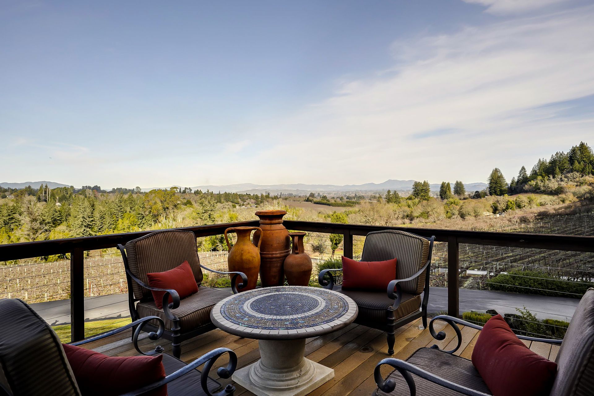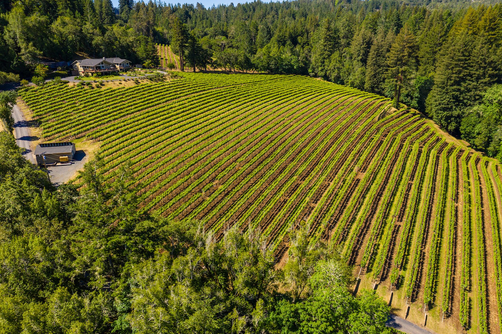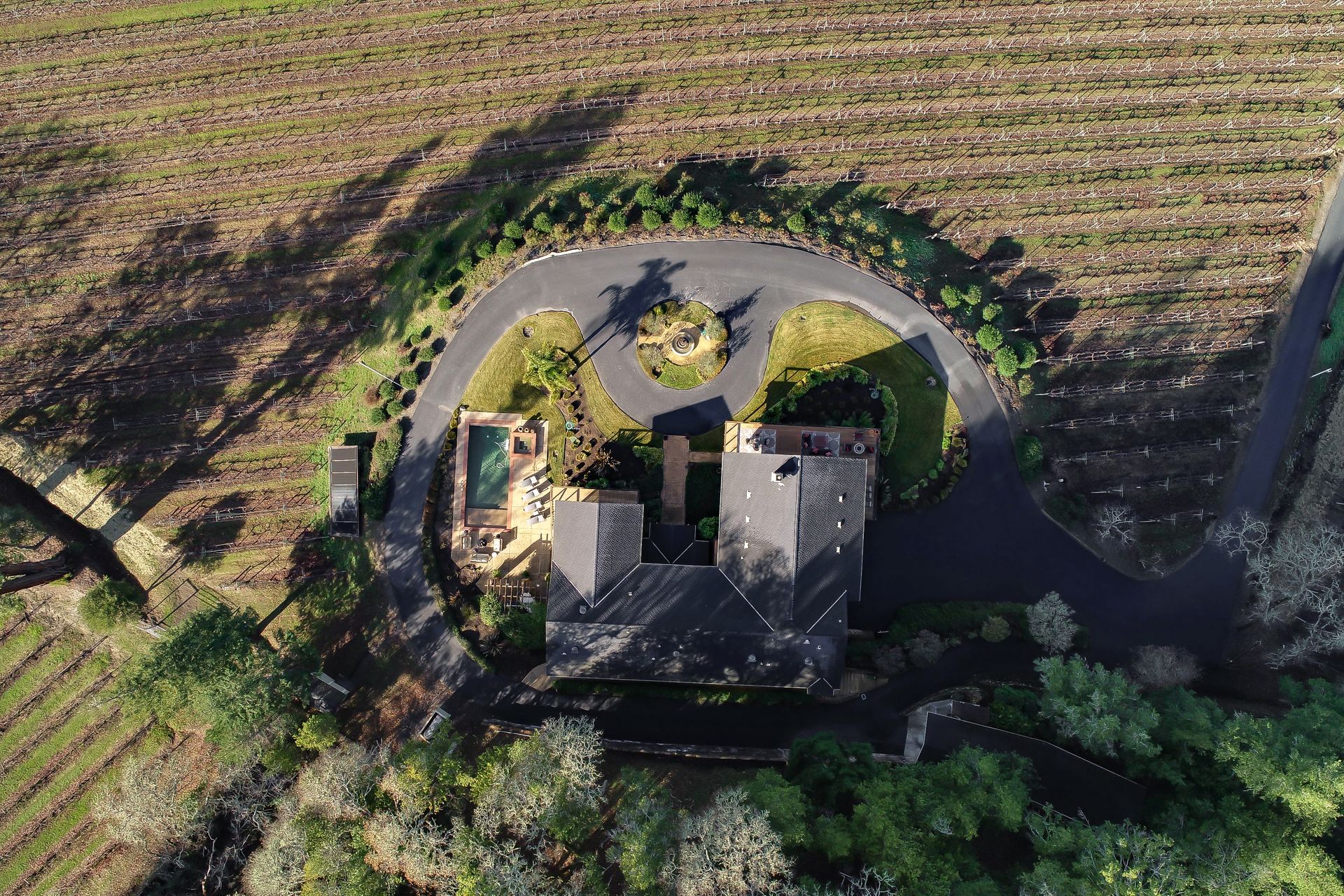 This approximately 18 acre, hilltop gated vineyard estate captures the ultimate Sonoma County dream. With breathtaking views, this stunning retreat features a roughly 6,089 square foot main residence with a two bedroom, one bath guest house, a solar heated pool and hot tub, an outdoor kitchen, cave-style wine cellar, large carport, barn and custom tree fort. The impressive foyer displays the chandelier lit grand staircase to the main level and a seven plus car garage. The lower level offers a large coat closet, office, one-half bath, a guest suite with heated floors and a walk-in closet. Enjoy the main level boasting a great room with vaulted ceilings, glass Nana walls, dining for 12 plus people, a laundry and hobby room, two bedrooms for guests and a master suite with a master closet built for the most discerning and a sun deck with pool access. The kitchen is made for entertaining with a supersized island, prep sink and large seating, three dishwashers, two microwaves, a warming drawer, an eight-burner Wolf range, three ovens, a refrigerator and a wet bar with a wine fridge. Enjoy alfresco dining on the terrace overlooking the approximately 10 acre world class Chardonnay vineyard.
