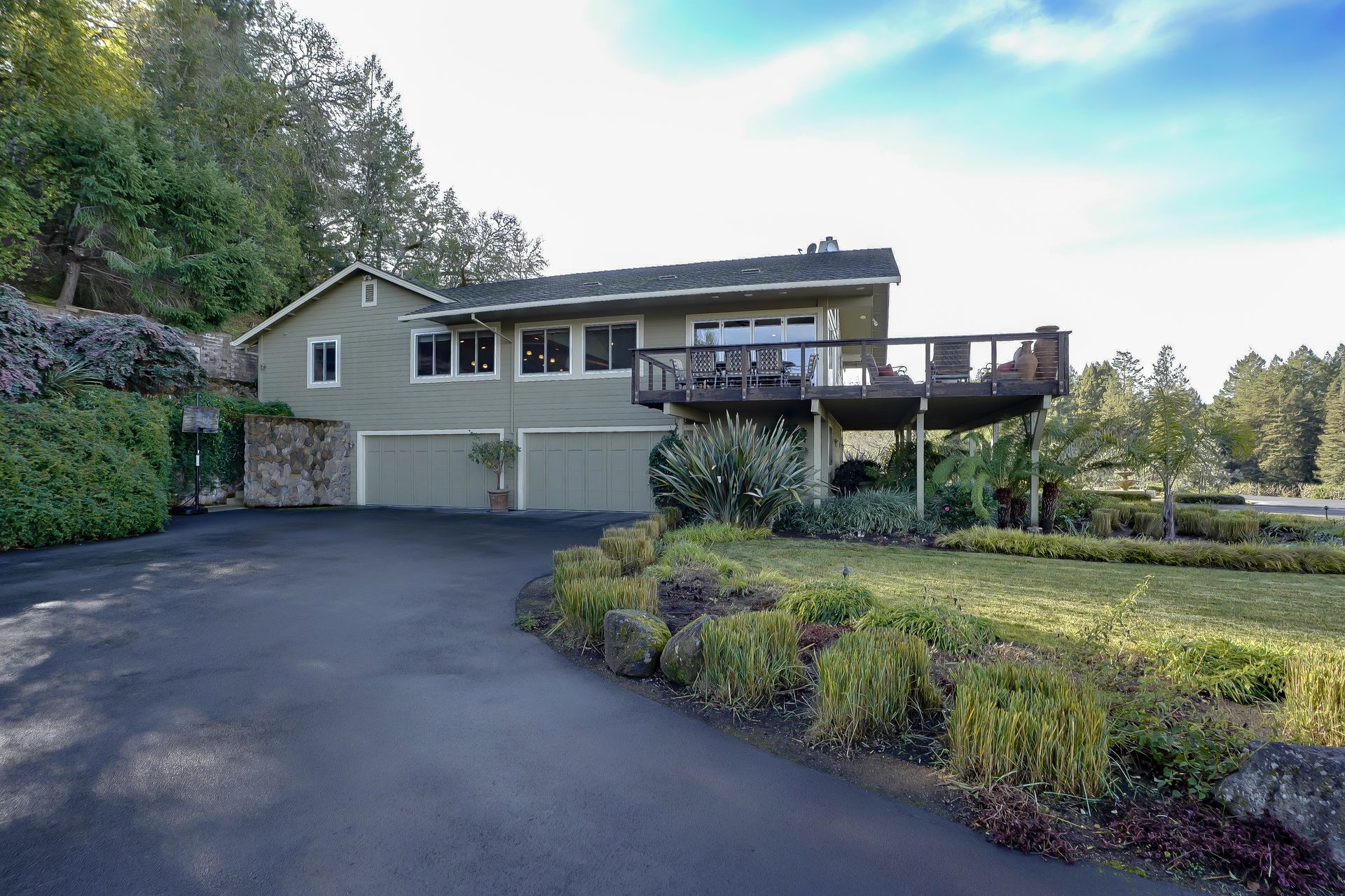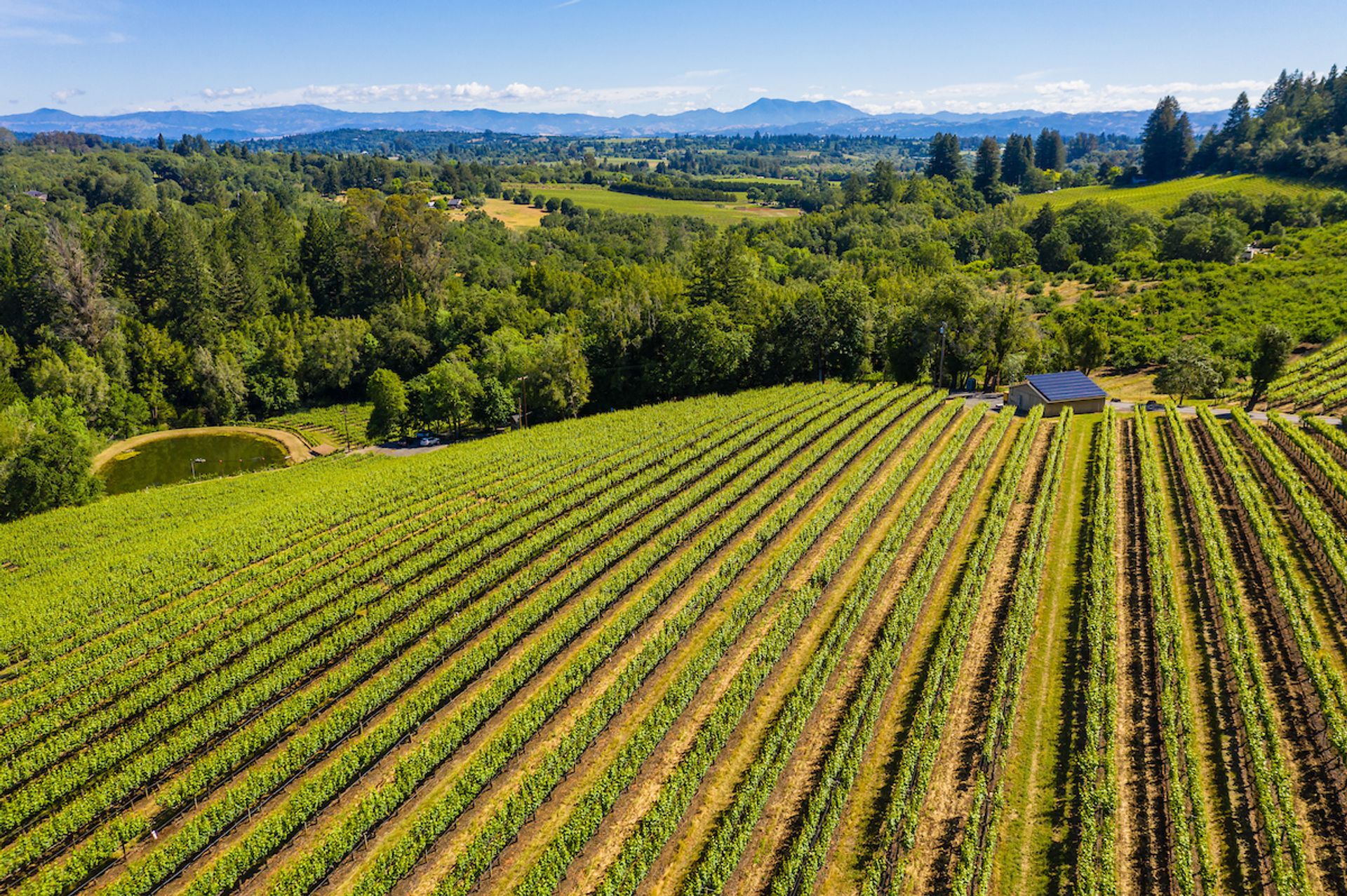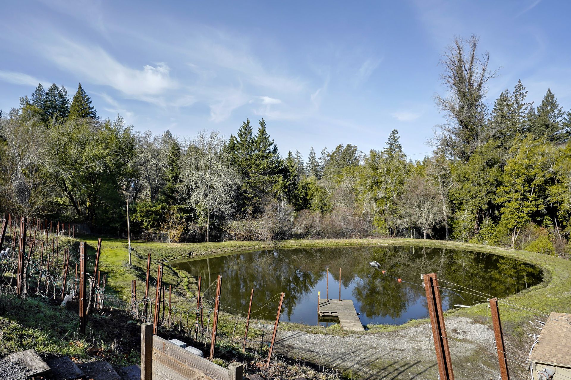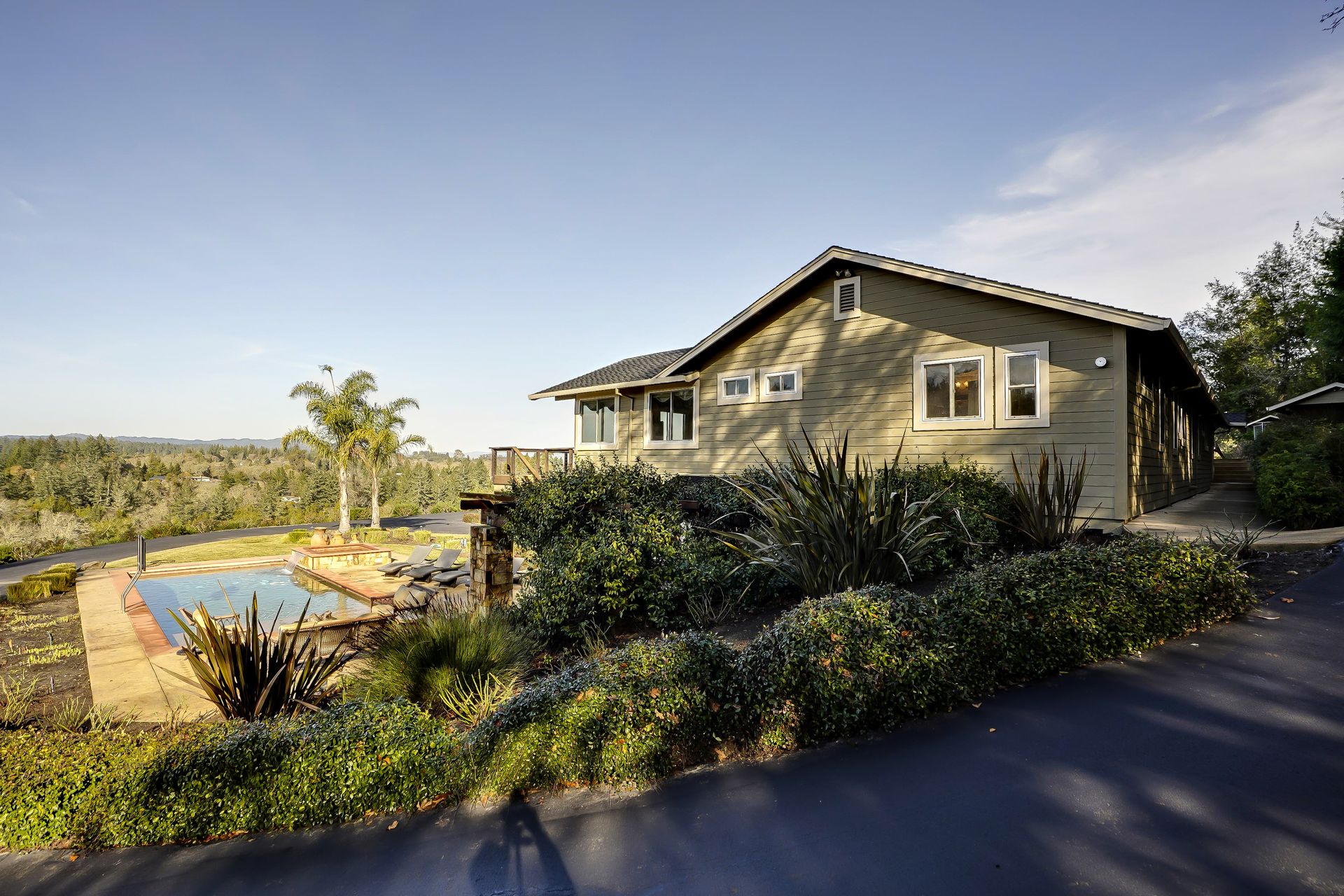 This approximately 18 acre, hilltop gated vineyard estate captures the ultimate Sonoma County dream. With breathtaking views, this stunning retreat features a roughly 6,089 square foot main residence with a two bedroom, one bath guest house, a solar heated pool and hot tub, an outdoor kitchen, cave-style wine cellar, large carport, barn and custom tree fort. The impressive foyer displays the chandelier lit grand staircase to the main level and a seven plus car garage. The lower level offers a large coat closet, office, one-half bath, a guest suite with heated floors and a walk-in closet. Enjoy the main level boasting a great room with vaulted ceilings, glass Nana walls, dining for 12 plus people, a laundry and hobby room, two bedrooms for guests and a master suite with a master closet built for the most discerning and a sun deck with pool access. The kitchen is made for entertaining with a supersized island, prep sink and large seating, three dishwashers, two microwaves, a warming drawer, an eight-burner Wolf range, three ovens, a refrigerator and a wet bar with a wine fridge. Enjoy alfresco dining on the terrace overlooking the approximately 10 acre world class Chardonnay vineyard.