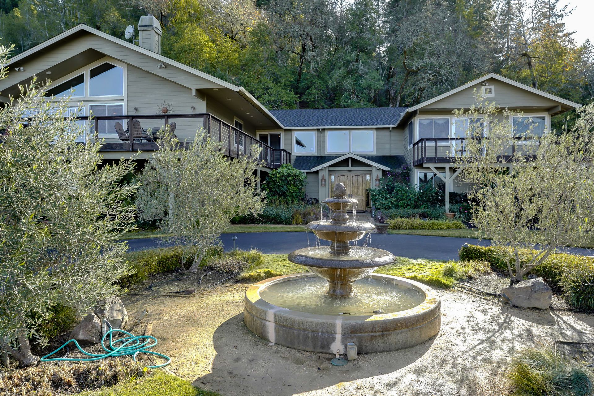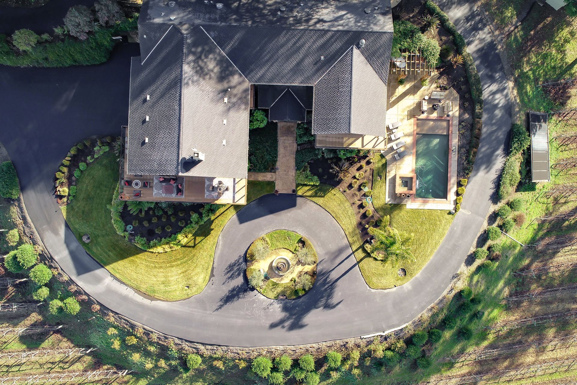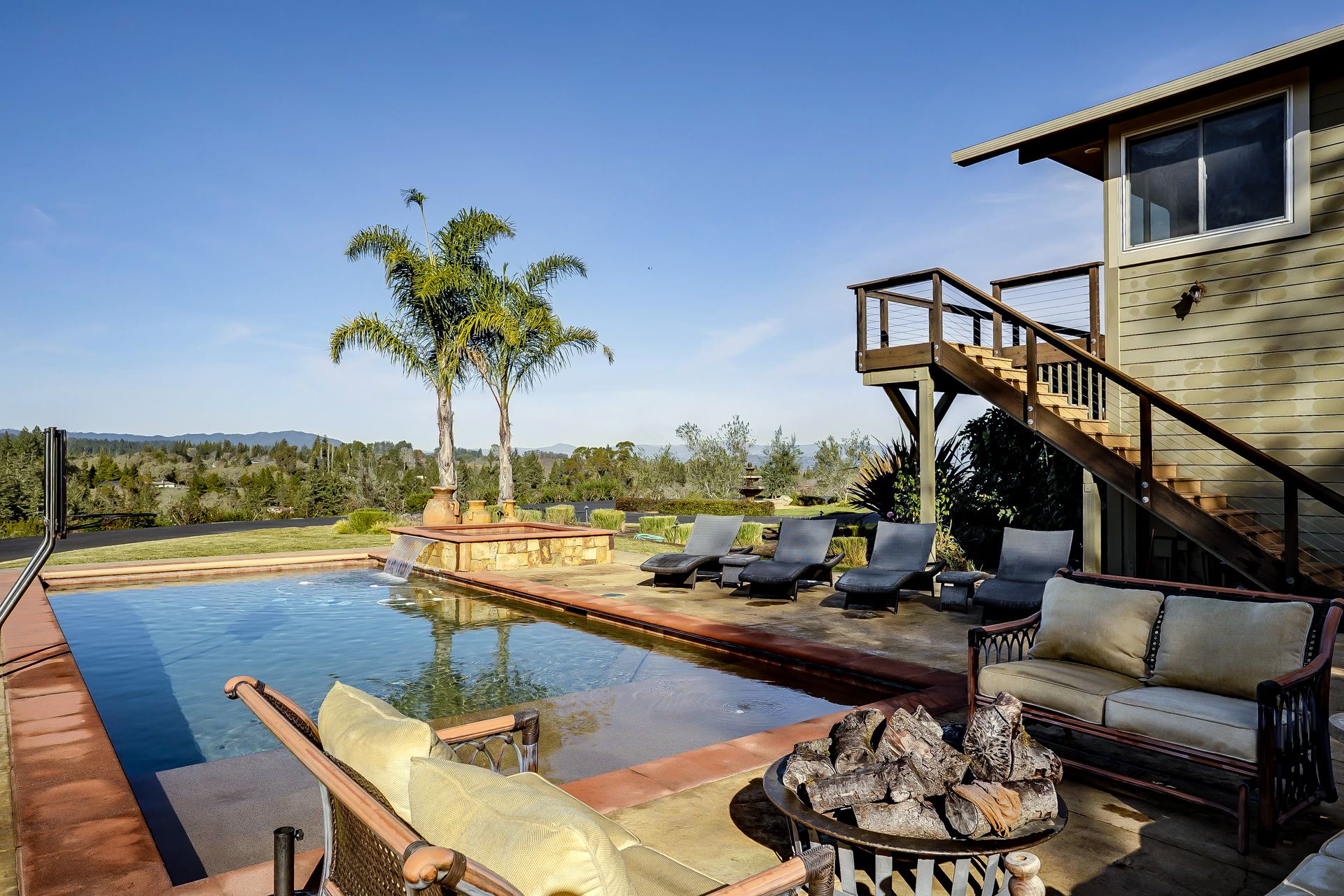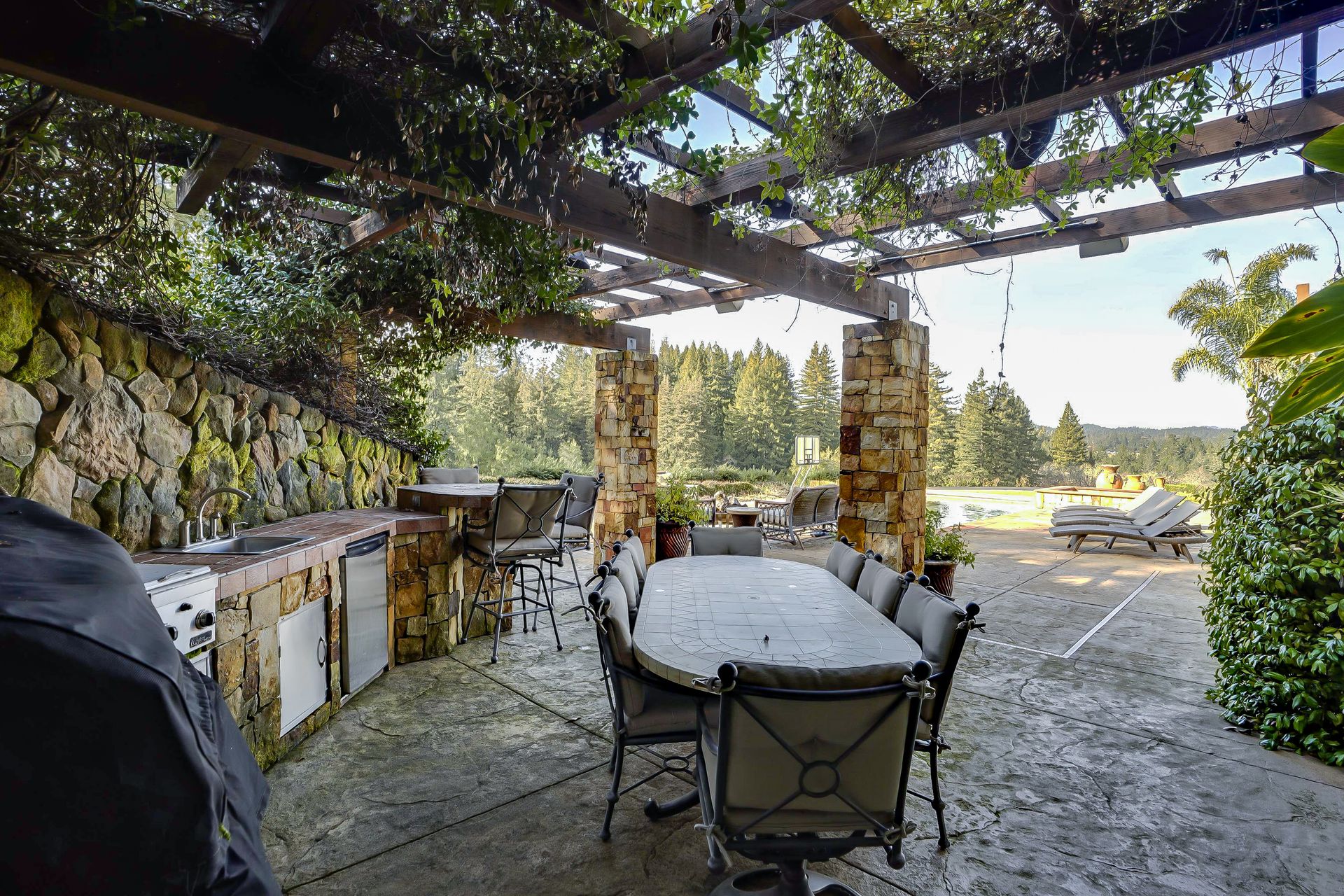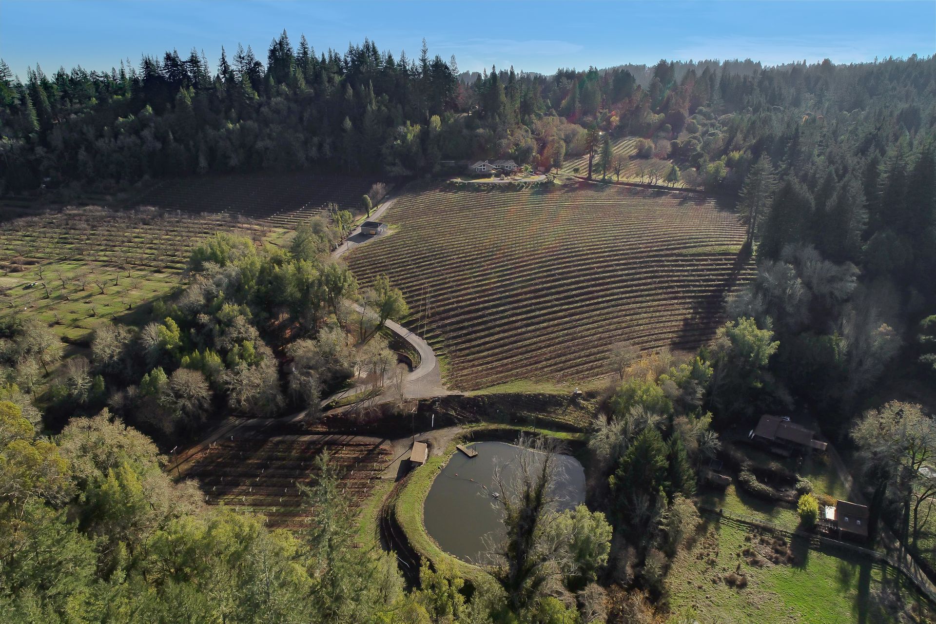 This approximately 18 acre, hilltop gated vineyard estate captures the ultimate Sonoma County dream. With breathtaking views, this stunning retreat features a roughly 6,089 square foot main residence with a two bedroom, one bath guest house, a solar heated pool and hot tub, an outdoor kitchen, cave-style wine cellar, large carport, barn and custom tree fort. The impressive foyer displays the chandelier lit grand staircase to the main level and a seven plus car garage. The lower level offers a large coat closet, office, one-half bath, a guest suite with heated floors and a walk-in closet. Enjoy the main level boasting a great room with vaulted ceilings, glass Nana walls, dining for 12 plus people, a laundry and hobby room, two bedrooms for guests and a master suite with a master closet built for the most discerning and a sun deck with pool access. The kitchen is made for entertaining with a supersized island, prep sink and large seating, three dishwashers, two microwaves, a warming drawer, an eight-burner Wolf range, three ovens, a refrigerator and a wet bar with a wine fridge. Enjoy alfresco dining on the terrace overlooking the approximately 10 acre world class Chardonnay vineyard.