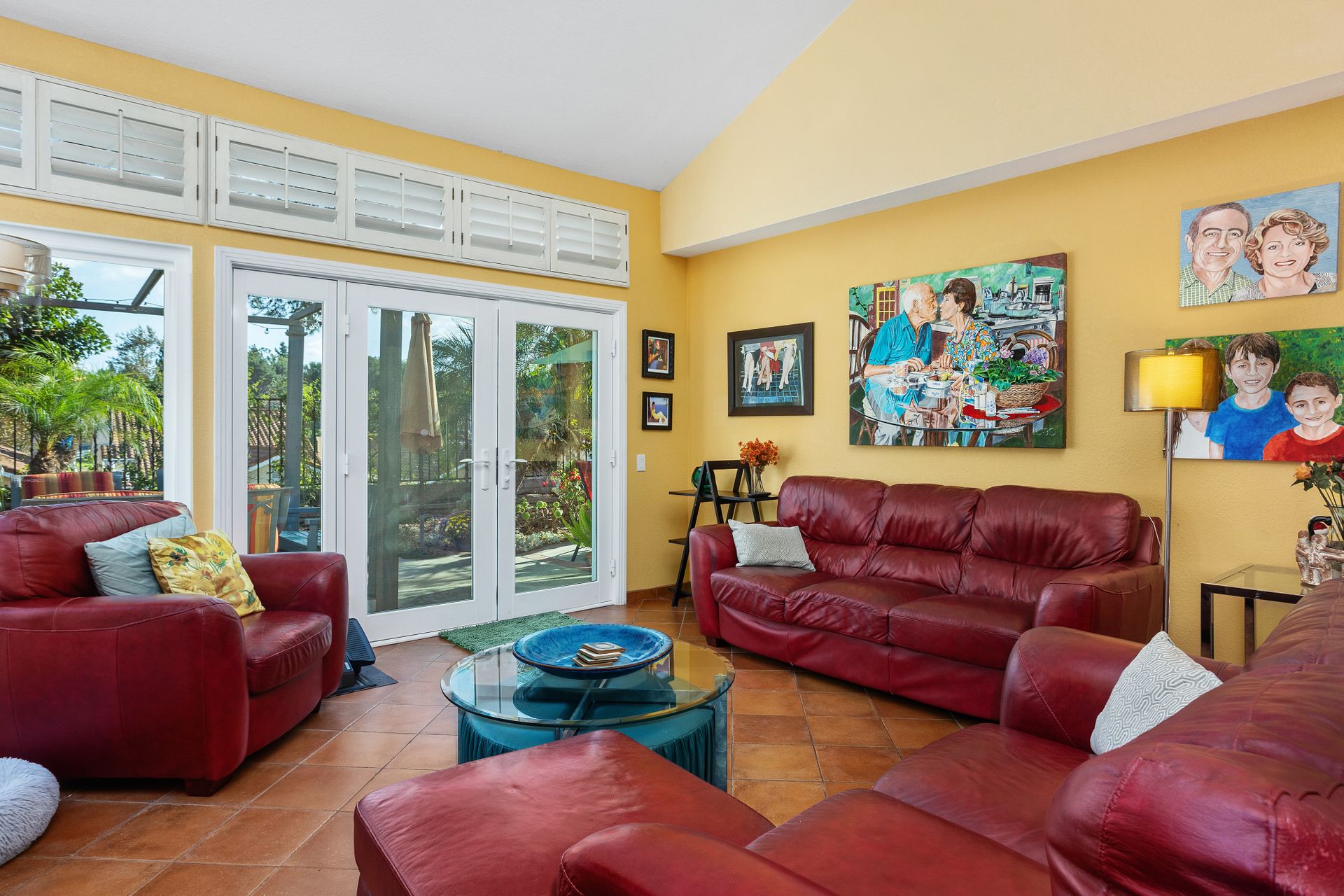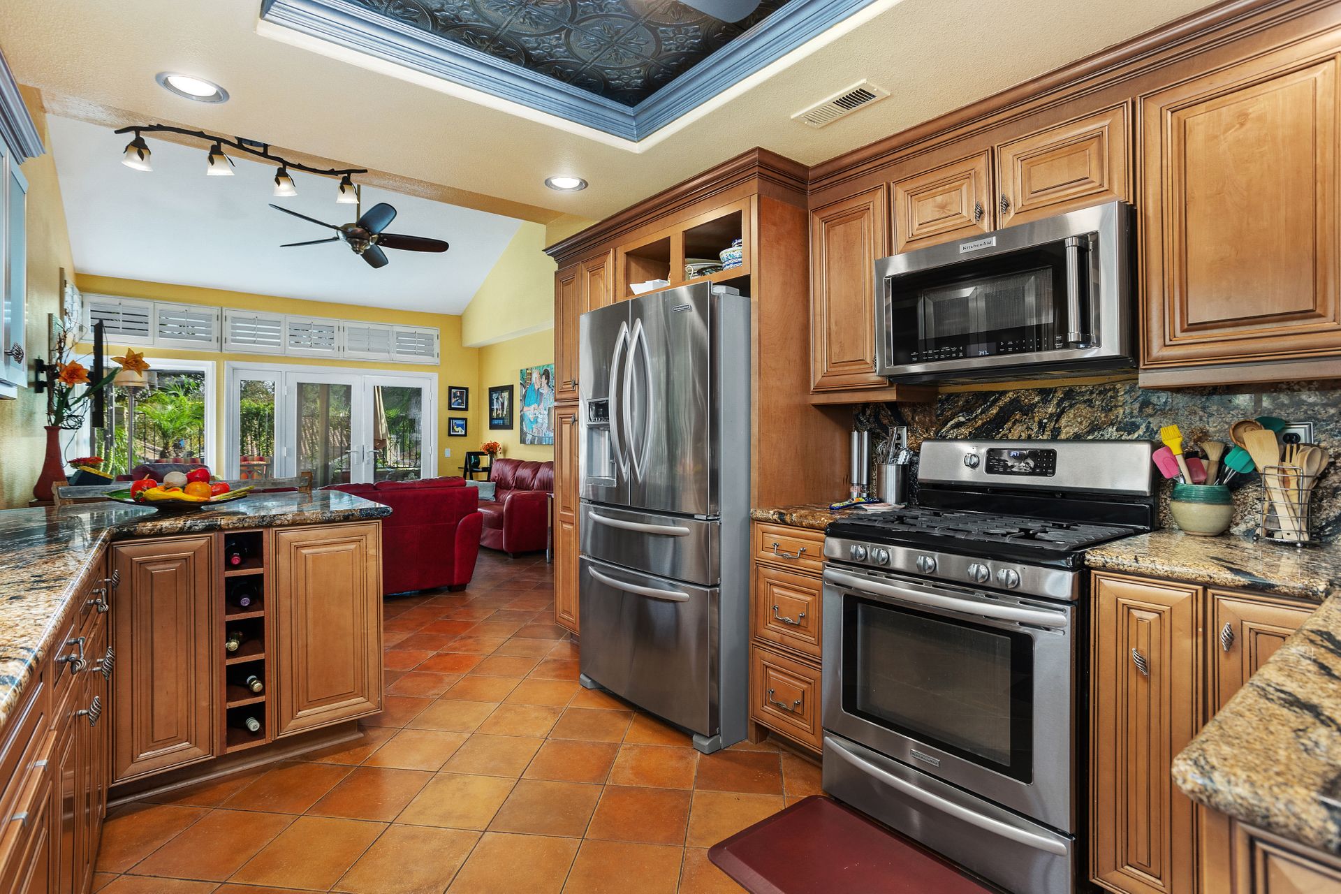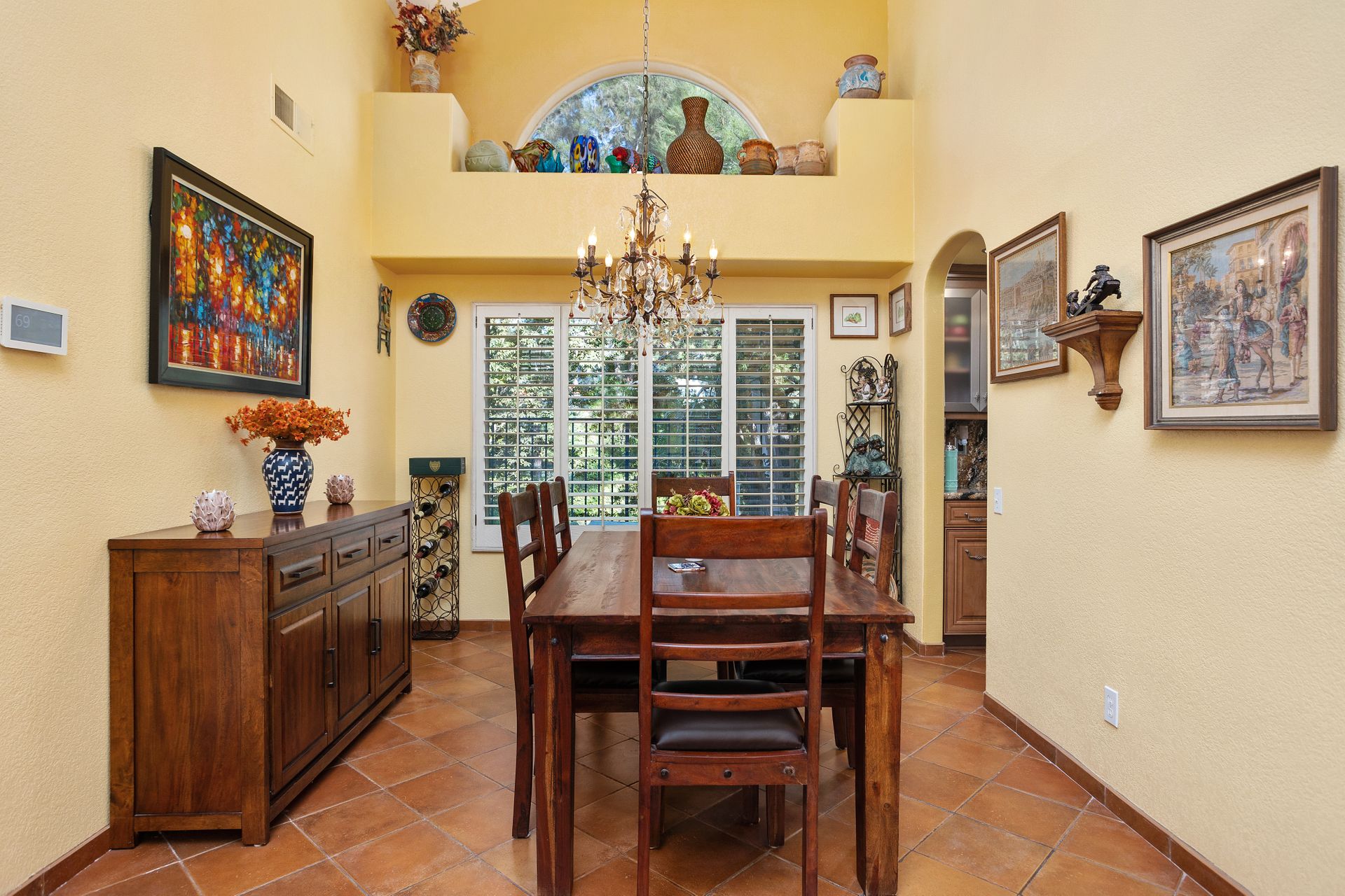 The living room features a cozy fireplace and impressive volume ceilings, enhancing the sense of space. Entertain graciously in the formal dining room! A custom breakfast bar connects the kitchen to the spacious family room, which is complete with newer windows and French doors. Head outside to the delightful backyard, which wraps around to a private side yard, great for enjoying sunny mornings or tranquil afternoons on the patio with beautiful southern views.