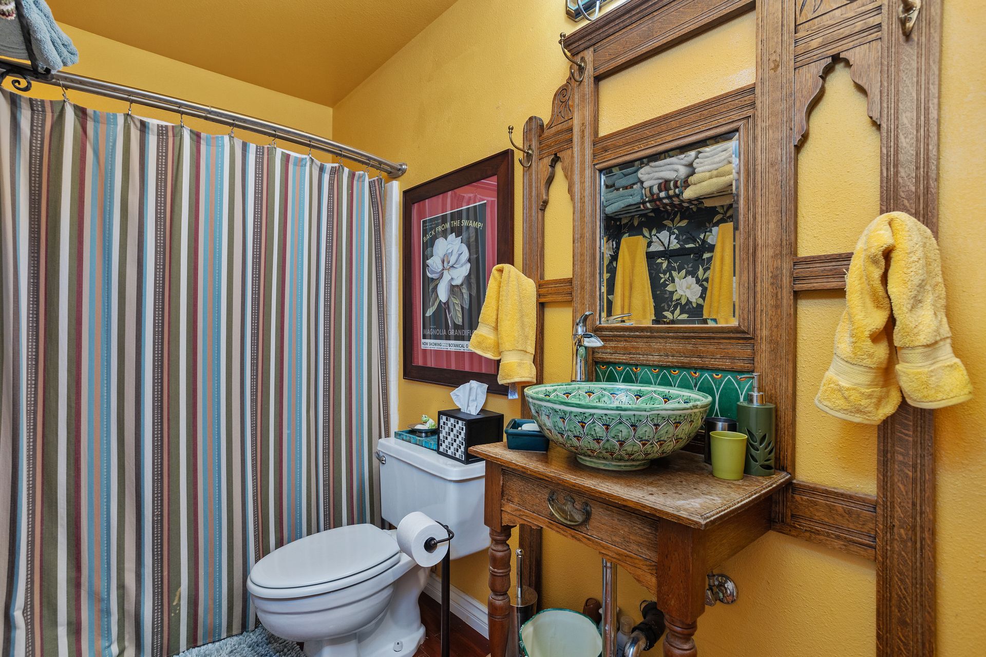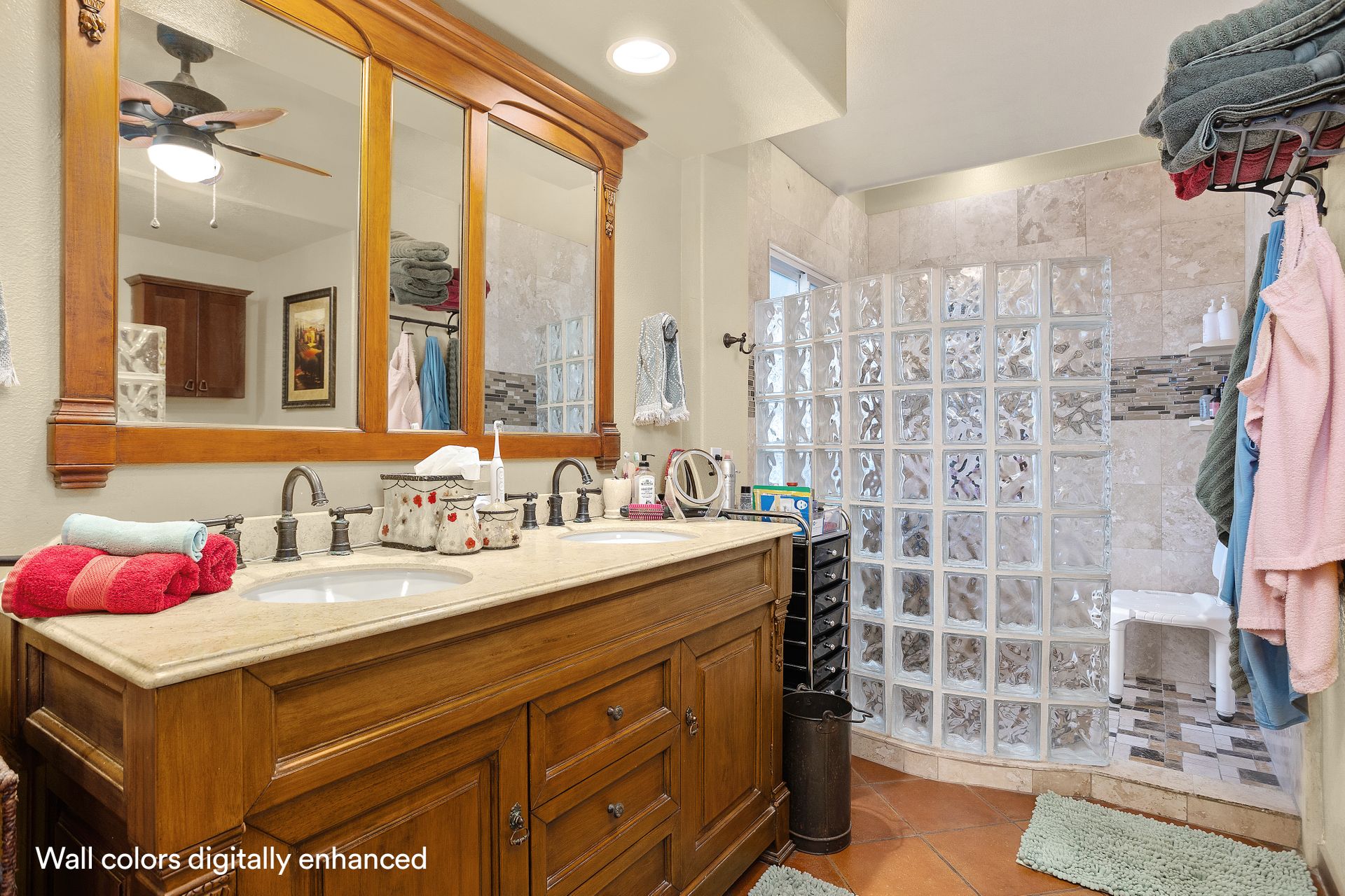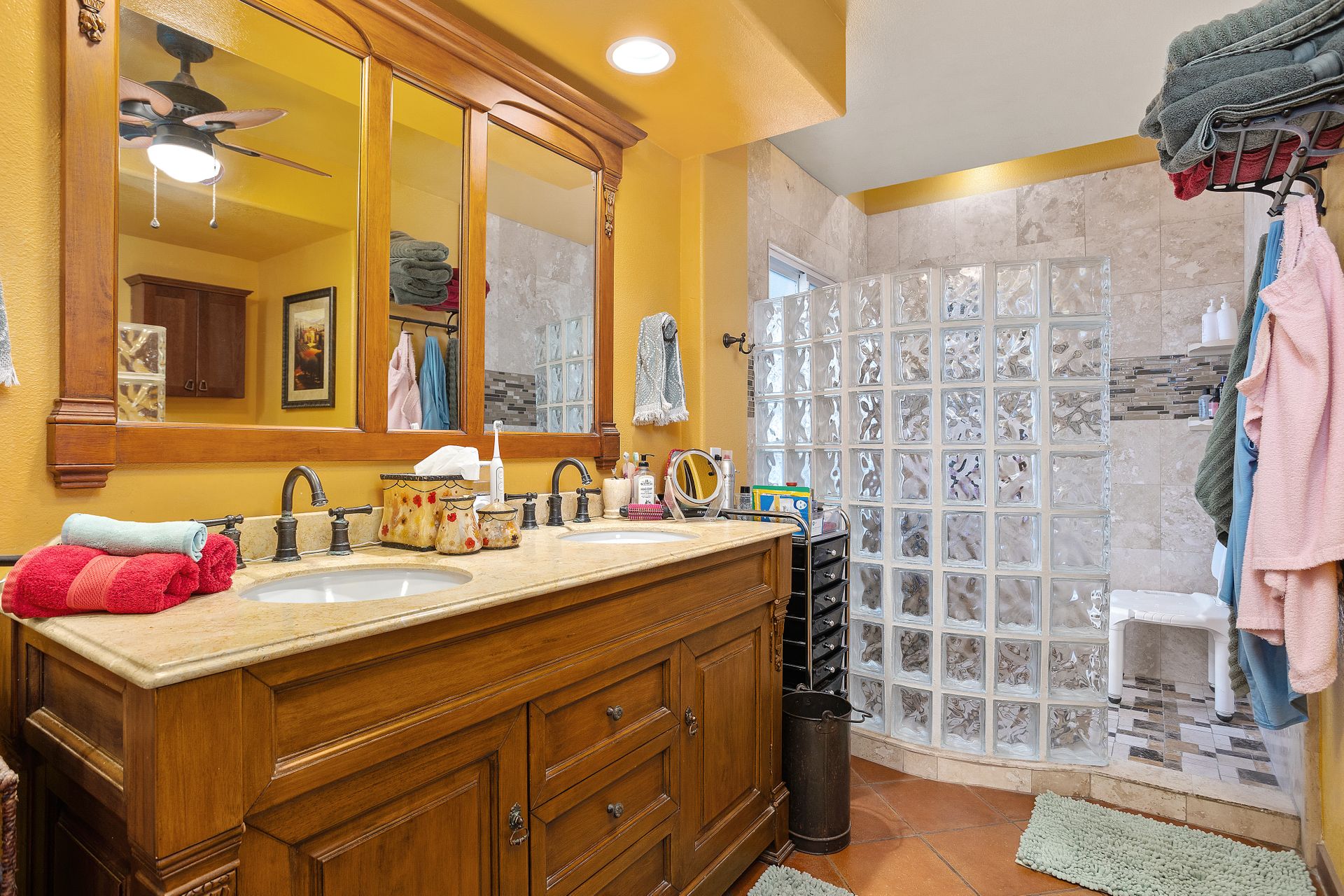 All bathrooms are beautifully appointed with custom cabinetry, hand-painted sinks and updated fixtures. The primary suite features a luxurious walk-in shower with a glass block privacy wall. Downstairs, elegant tile flooring flows seamlessly, while warm wood floors grace the upstairs. Plantation shutters, custom light fixtures and ceiling fans add special touches throughout. Air conditioning ensures year-round comfort.