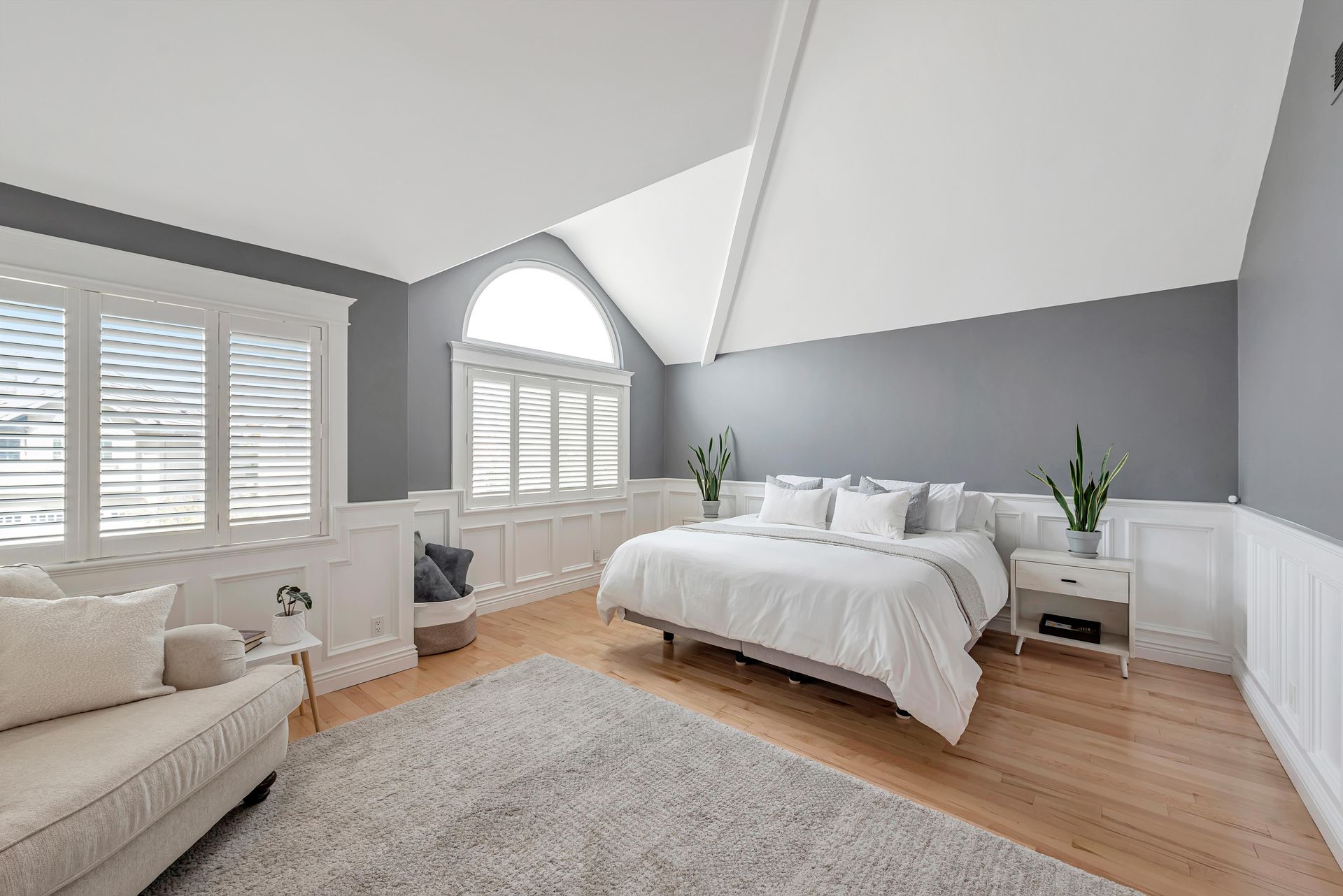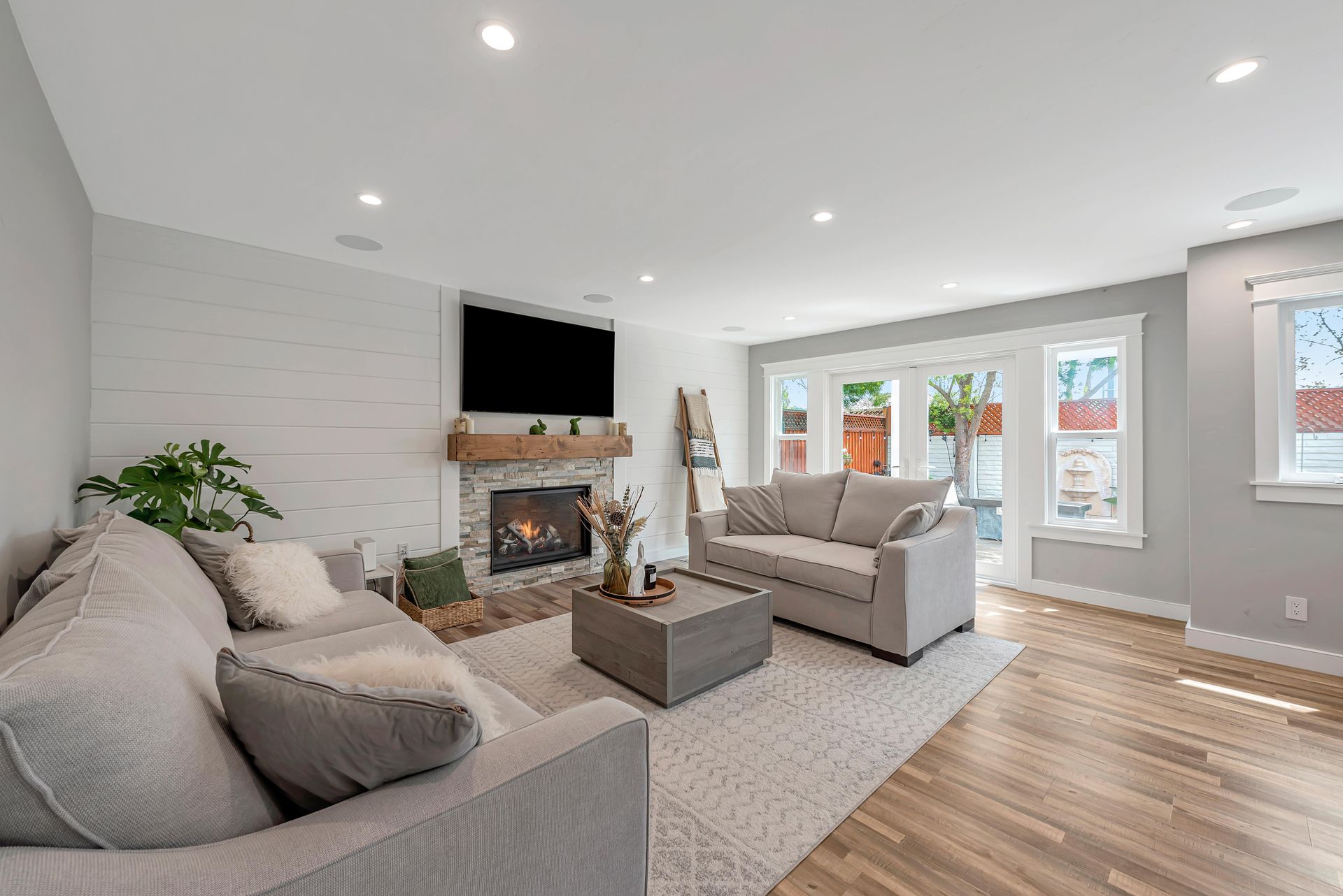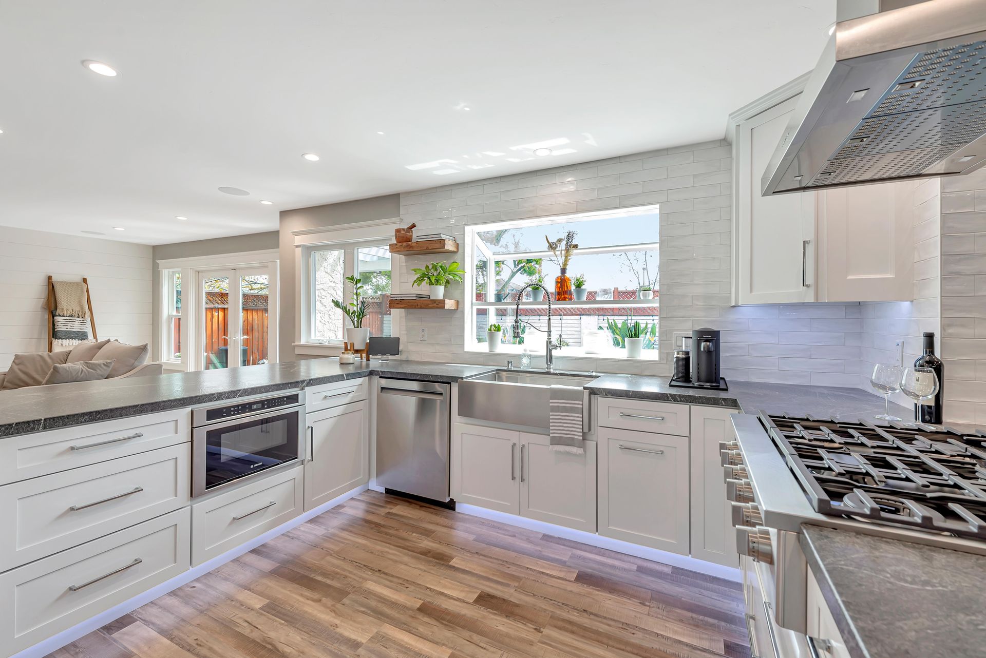 The interior of the house boasts an inviting and custom cedar-lined built-in window seat in the living room with useful storage. The updated Milgard windows, coupled with intelligent skylights that automatically close during rainfall, guarantee a light and airy ambiance. The kitchen has been extensively modernized to include a newly installed quartzite countertop with leathered finish, newer high-end appliances, and high-quality KraftMaid cabinetry. The custom interior Millwork package on doors, windows and stone-surround fireplace in the family and main bedroom exudes a high-end and captivating aesthetic.