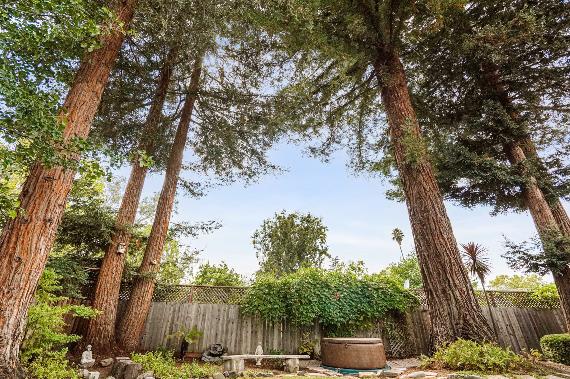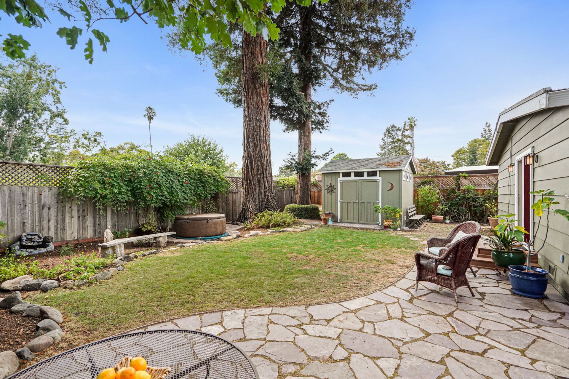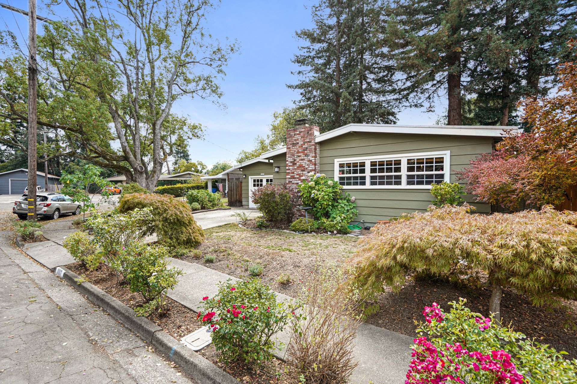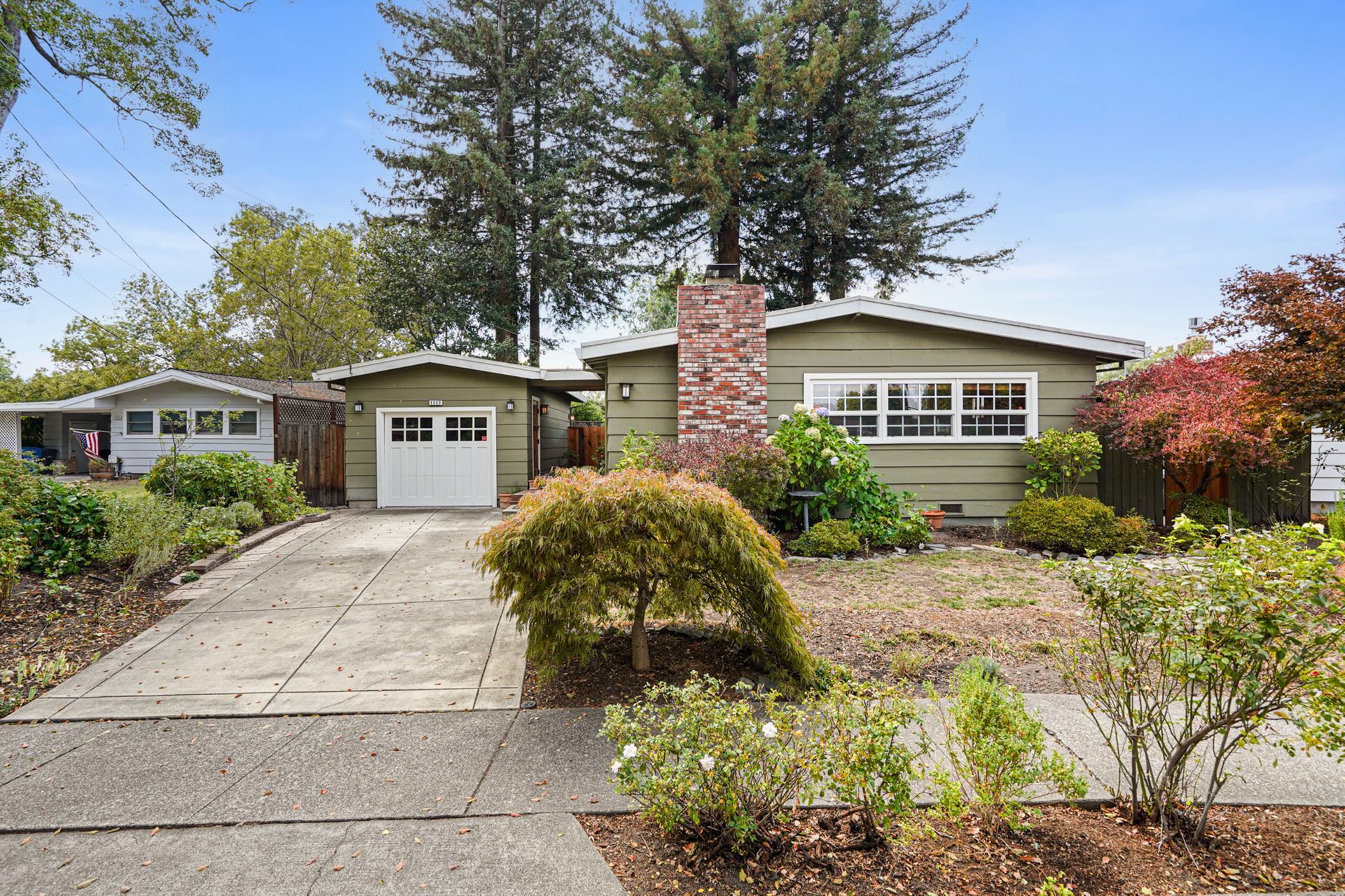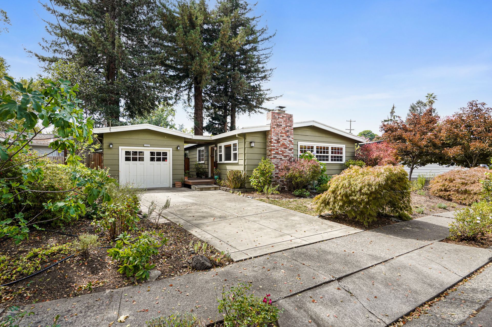 This enchanting home sits on a serene court and has been beautifully updated and maintained. Enter into a spacious yet cozy great room with a fireplace, high ceilings enhanced with natural wood and inset lights. The kitchen has quality wood cabinets, high ceilings and a sitting bar for eating or visiting with the cook. The home has original hardwood floors in the bedrooms, hallway and great room, dual paned windows, central heating and air, as well as an updated electric panel. The private backyard is graced with stately redwoods, a lovely sitting and lawn area, a sunny side area for gardening and a room-sized shed for extra storage or room to play. The detached one-car garage is oversized and incorporates a work bench and sleek built-in cabinets on both sides for organized and accessible storage. Convenient to multiple parks, restaurants and shopping areas. Come see it, this is a truly special property.