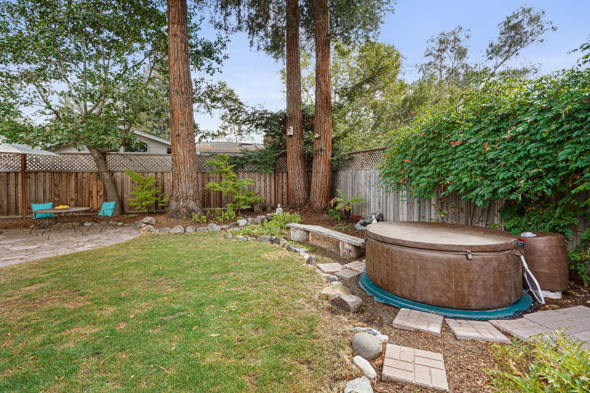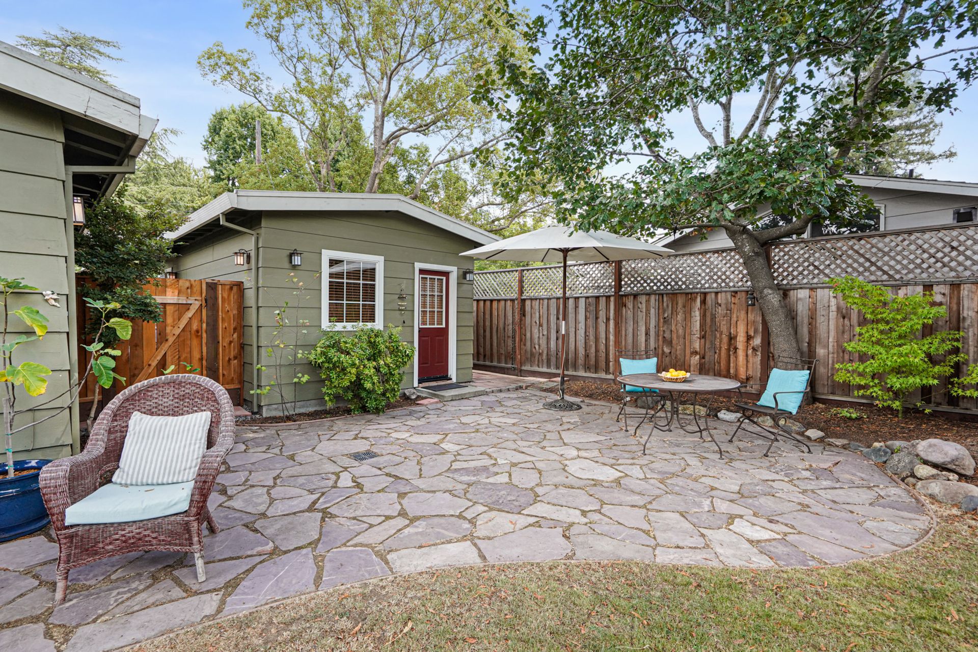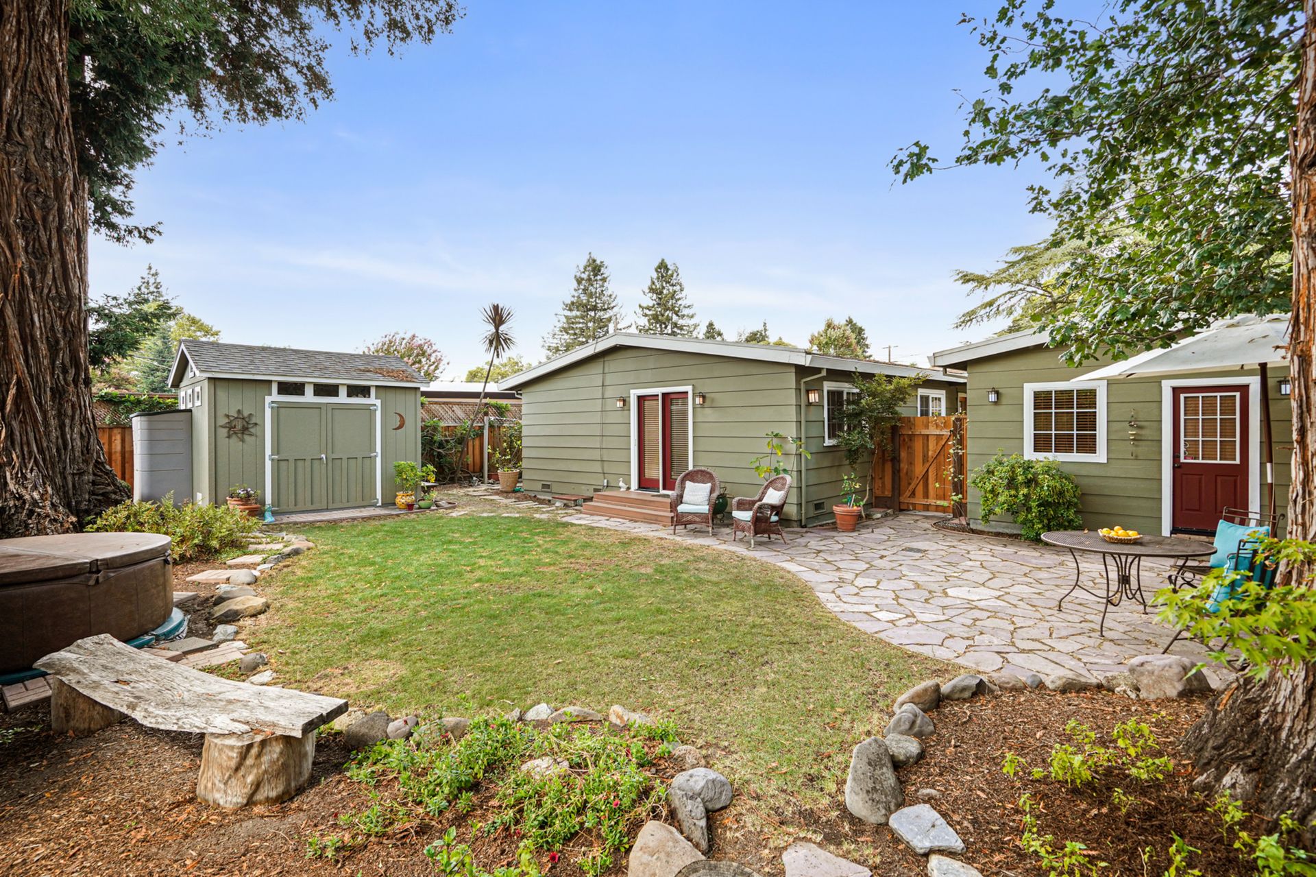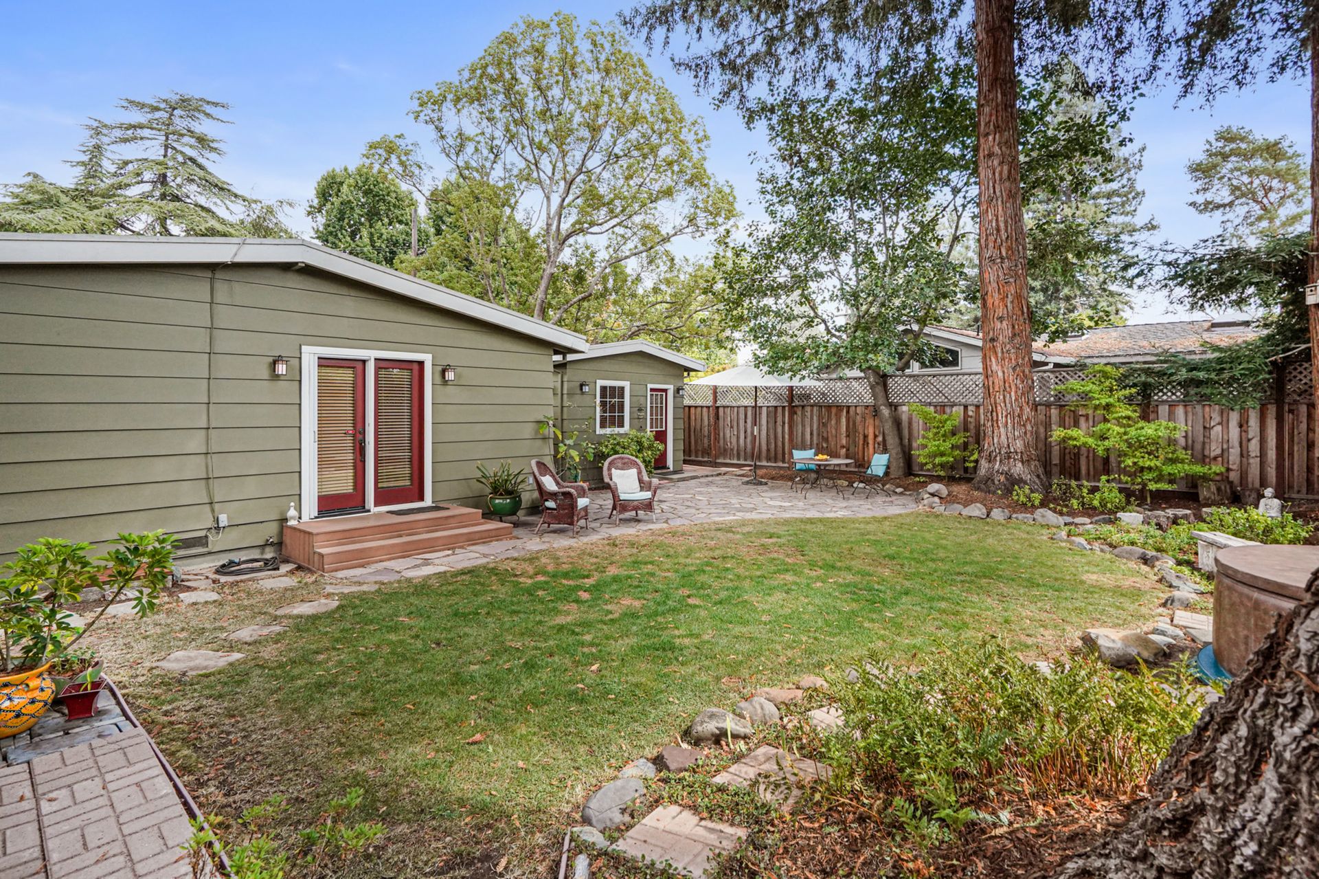 This enchanting home sits on a serene court and has been beautifully updated and maintained. Enter into a spacious yet cozy great room with a fireplace, high ceilings enhanced with natural wood and inset lights. The kitchen has quality wood cabinets, high ceilings and a sitting bar for eating or visiting with the cook. The home has original hardwood floors in the bedrooms, hallway and great room, dual paned windows, central heating and air, as well as an updated electric panel. The private backyard is graced with stately redwoods, a lovely sitting and lawn area, a sunny side area for gardening and a room-sized shed for extra storage or room to play. The detached one-car garage is oversized and incorporates a work bench and sleek built-in cabinets on both sides for organized and accessible storage. Convenient to multiple parks, restaurants and shopping areas. Come see it, this is a truly special property.