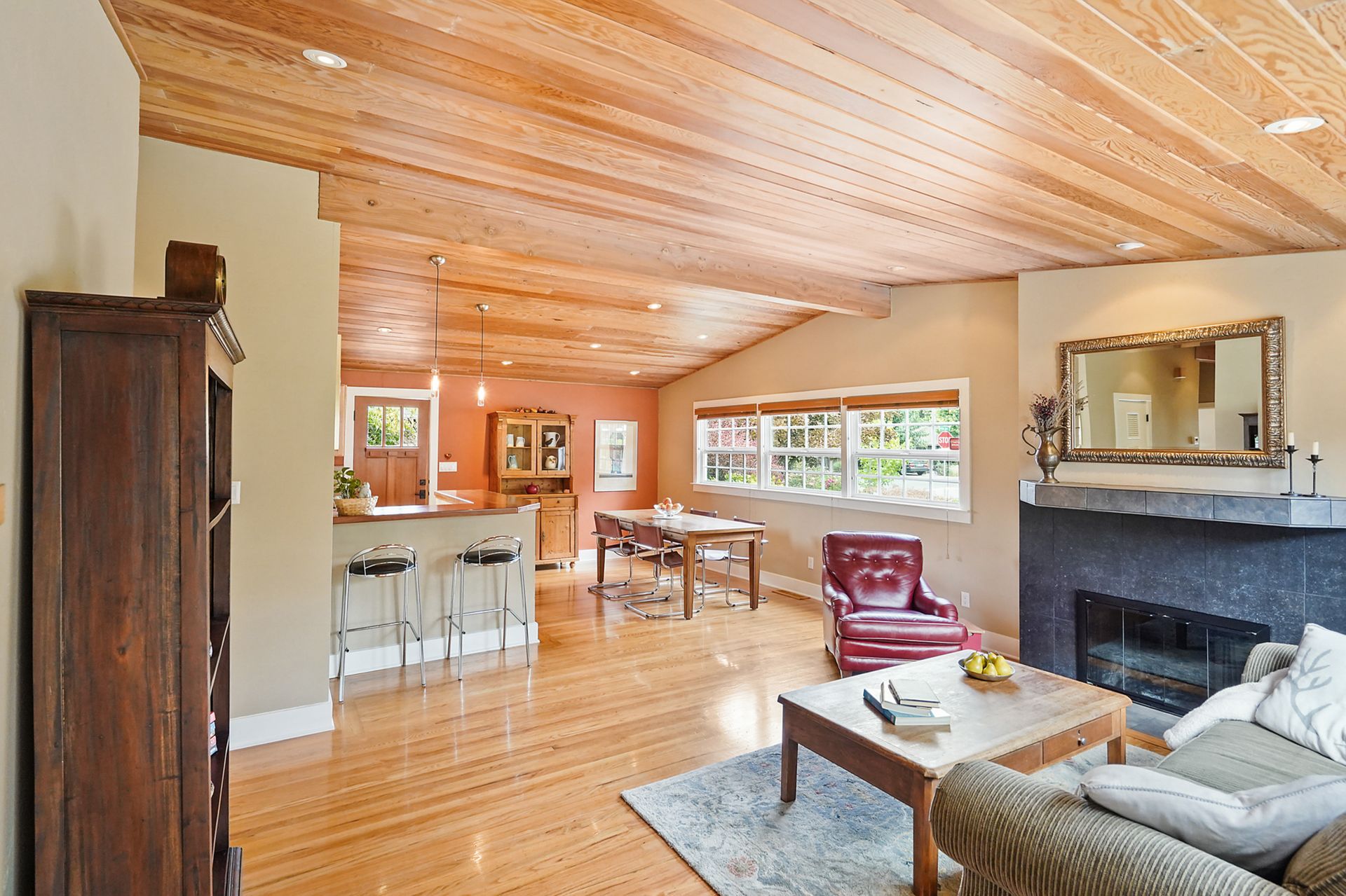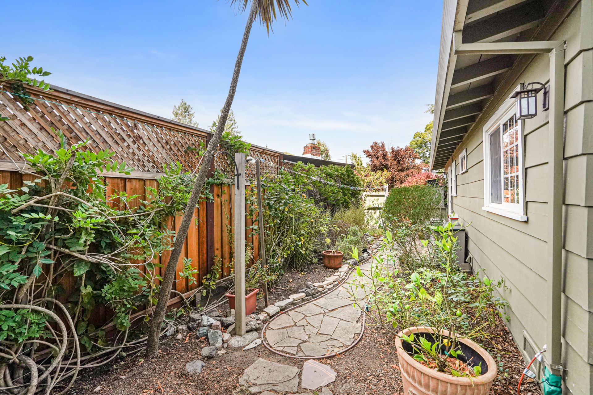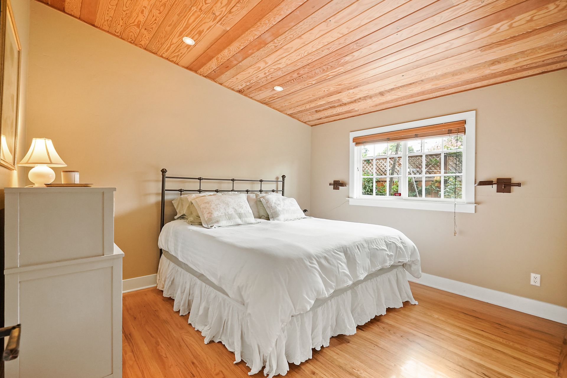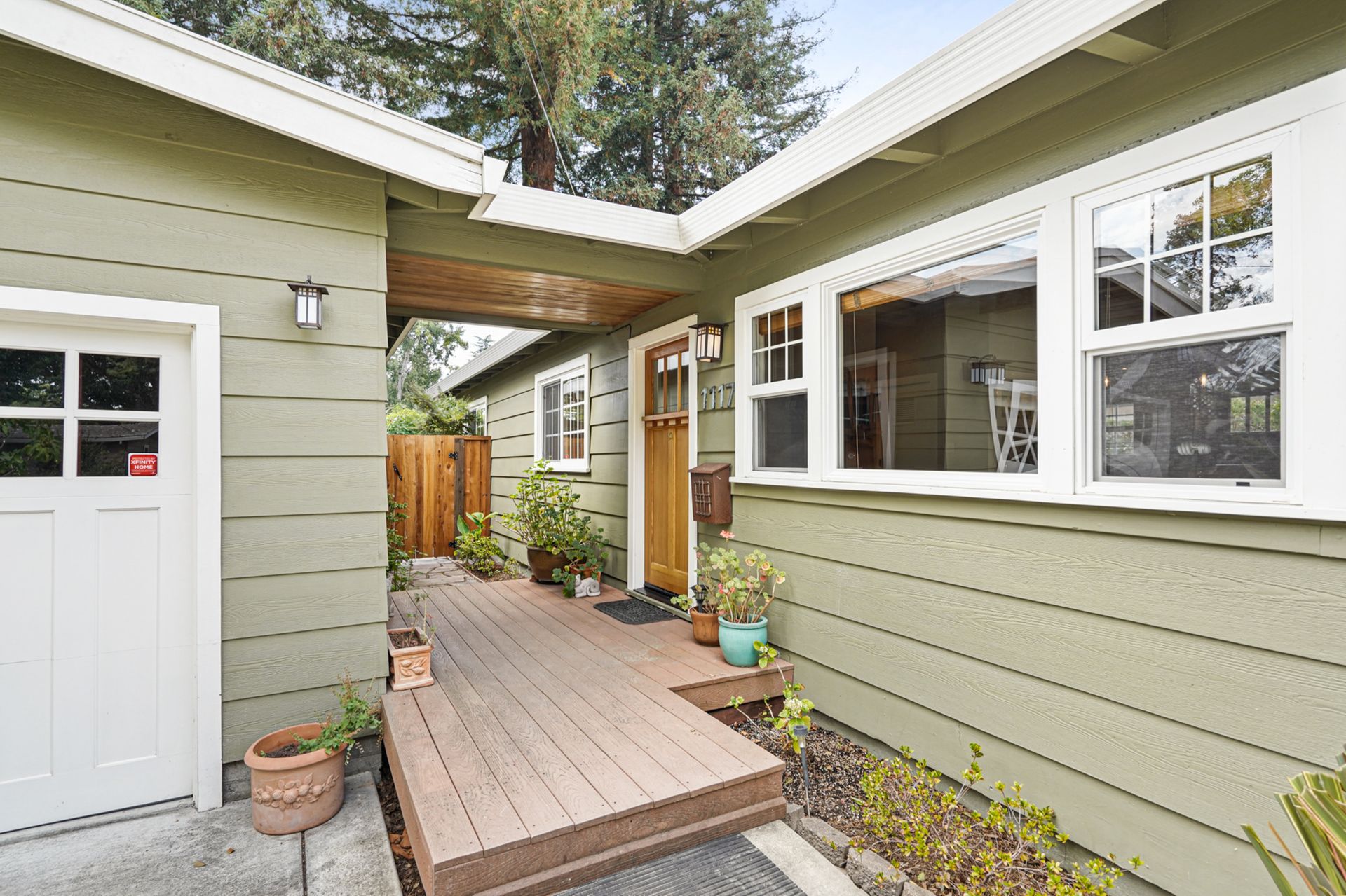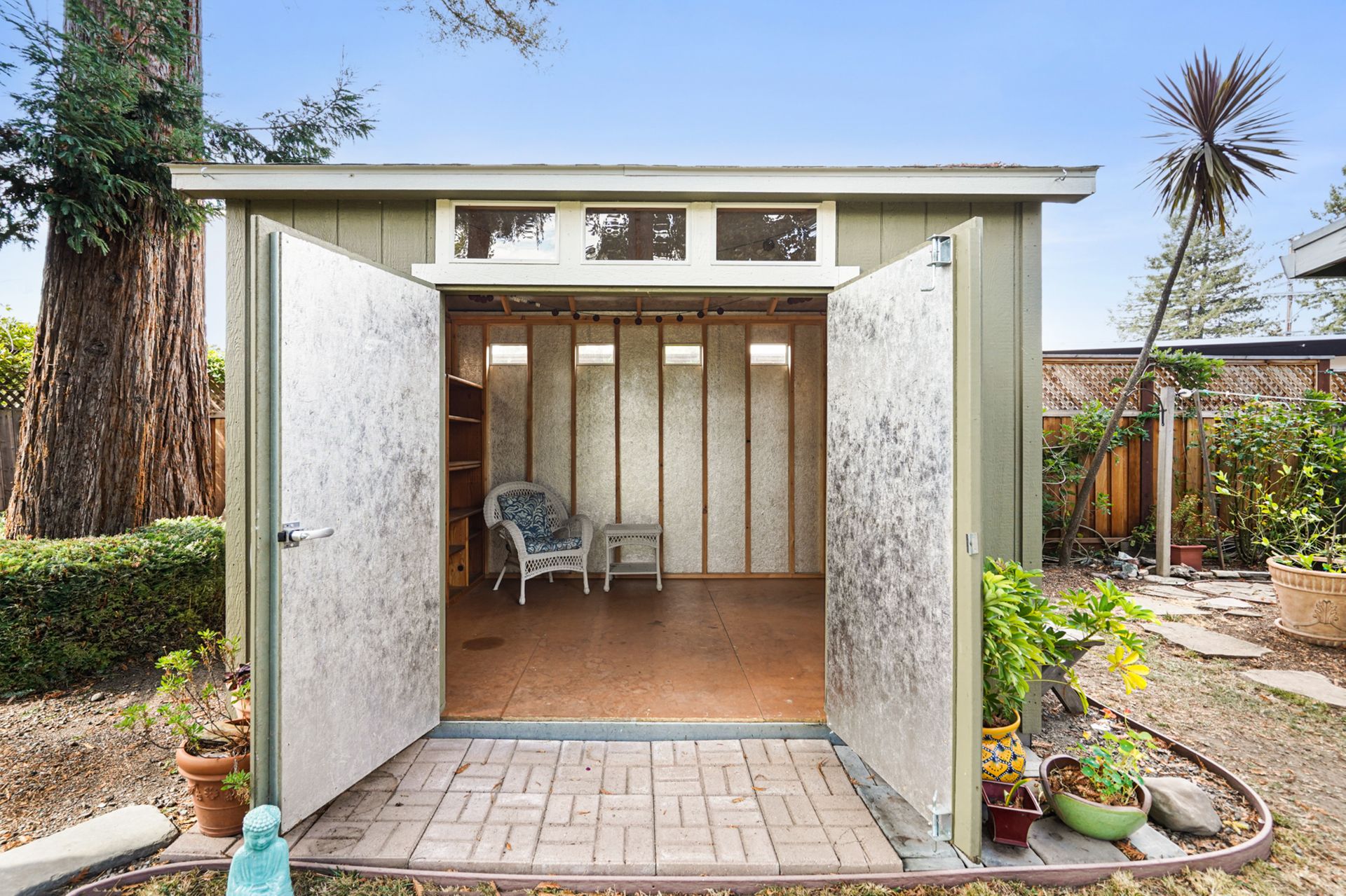 This enchanting home sits on a serene court and has been beautifully updated and maintained. Enter into a spacious yet cozy great room with a fireplace, high ceilings enhanced with natural wood and inset lights. The kitchen has quality wood cabinets, high ceilings and a sitting bar for eating or visiting with the cook. The home has original hardwood floors in the bedrooms, hallway and great room, dual paned windows, central heating and air, as well as an updated electric panel. The private backyard is graced with stately redwoods, a lovely sitting and lawn area, a sunny side area for gardening and a room-sized shed for extra storage or room to play. The detached one-car garage is oversized and incorporates a work bench and sleek built-in cabinets on both sides for organized and accessible storage. Convenient to multiple parks, restaurants and shopping areas. Come see it, this is a truly special property.