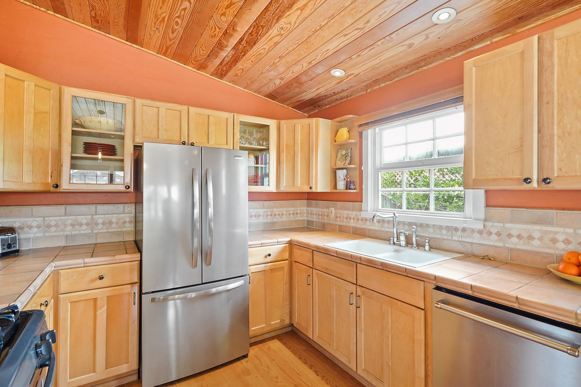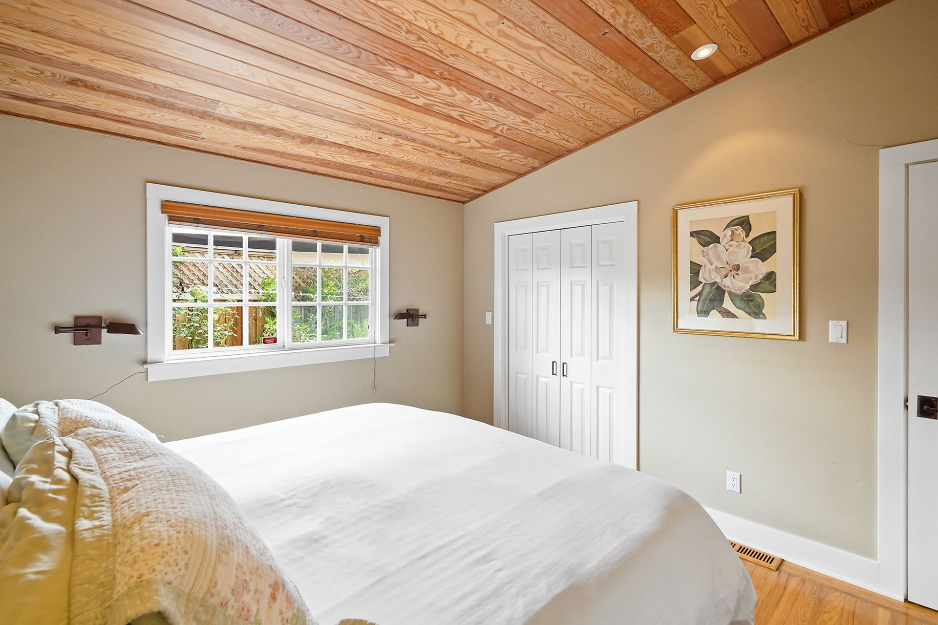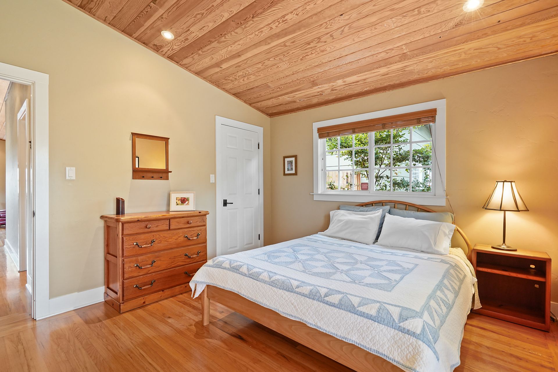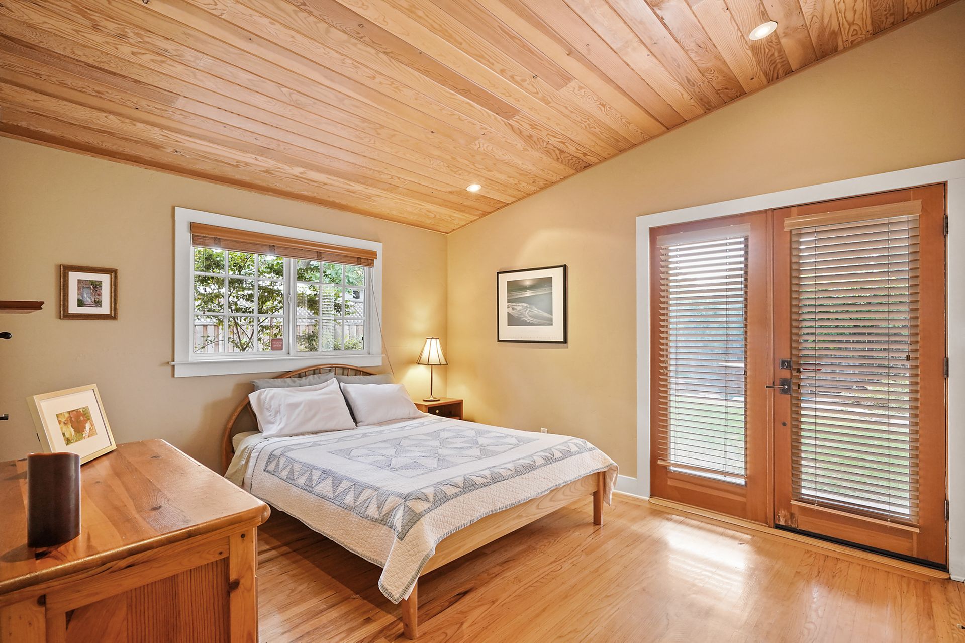 This enchanting home sits on a serene court and has been beautifully updated and maintained. Enter into a spacious yet cozy great room with a fireplace, high ceilings enhanced with natural wood and inset lights. The kitchen has quality wood cabinets, high ceilings and a sitting bar for eating or visiting with the cook. The home has original hardwood floors in the bedrooms, hallway and great room, dual paned windows, central heating and air, as well as an updated electric panel. The private backyard is graced with stately redwoods, a lovely sitting and lawn area, a sunny side area for gardening and a room-sized shed for extra storage or room to play. The detached one-car garage is oversized and incorporates a work bench and sleek built-in cabinets on both sides for organized and accessible storage. Convenient to multiple parks, restaurants and shopping areas. Come see it, this is a truly special property.