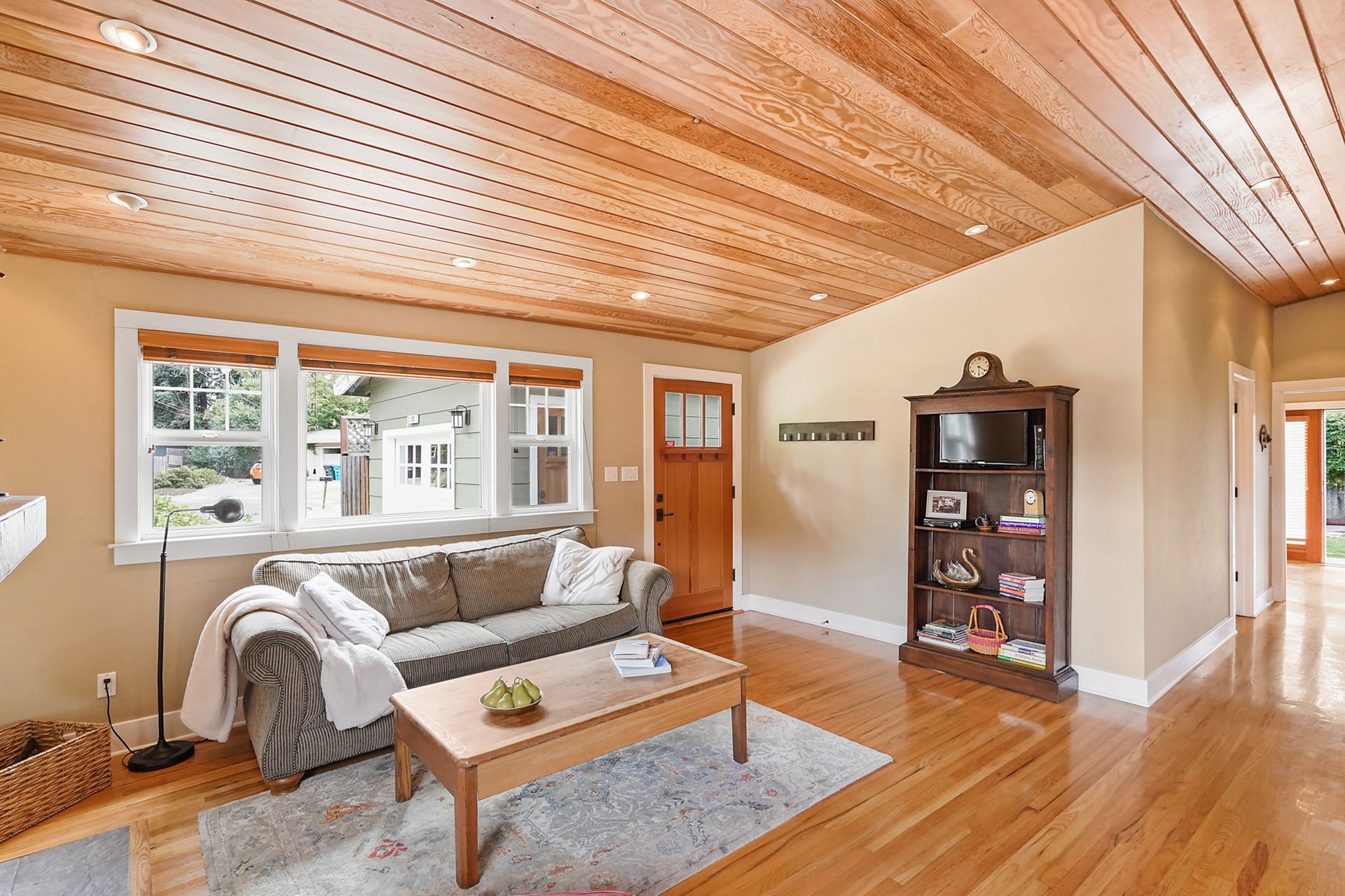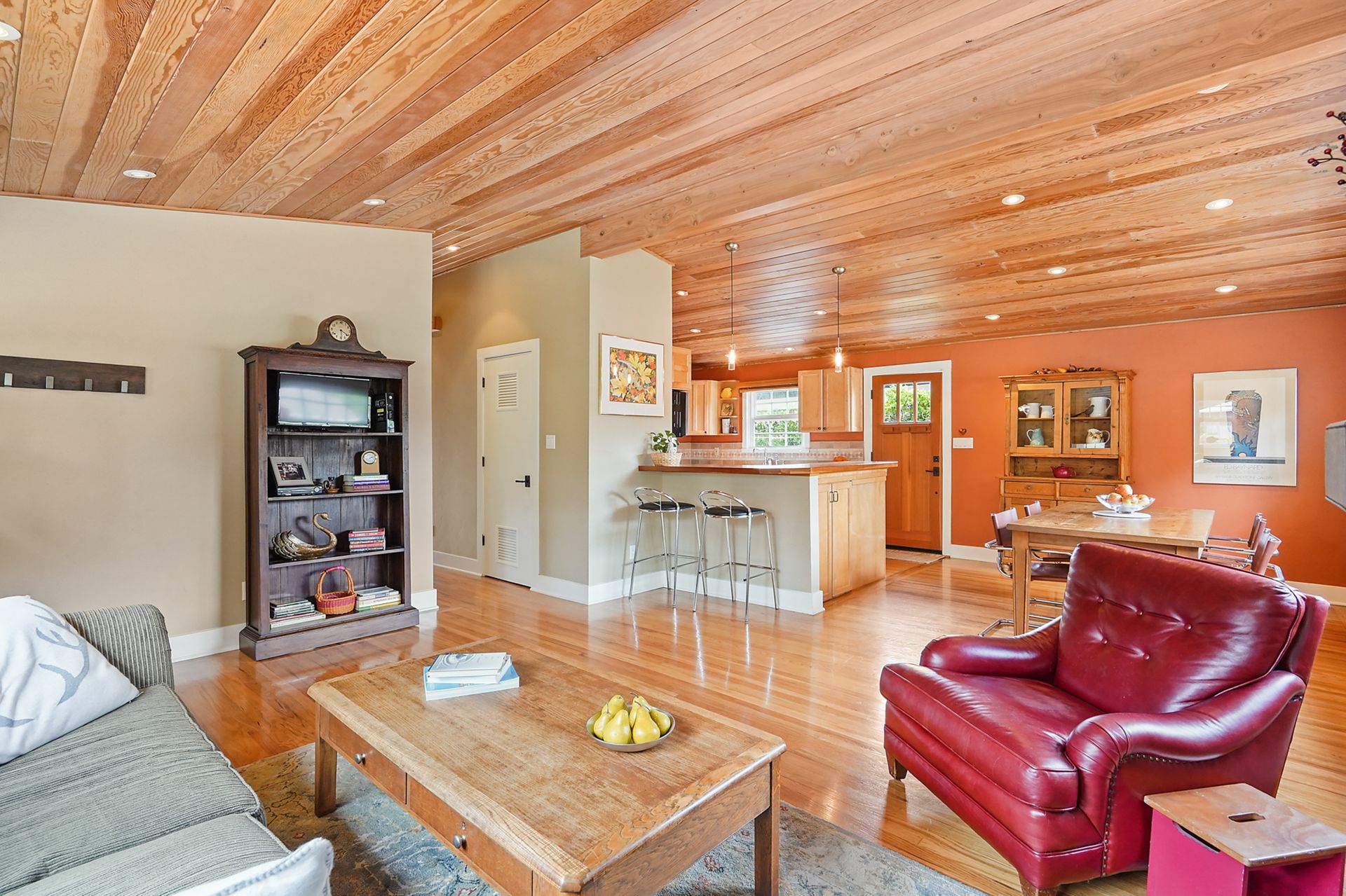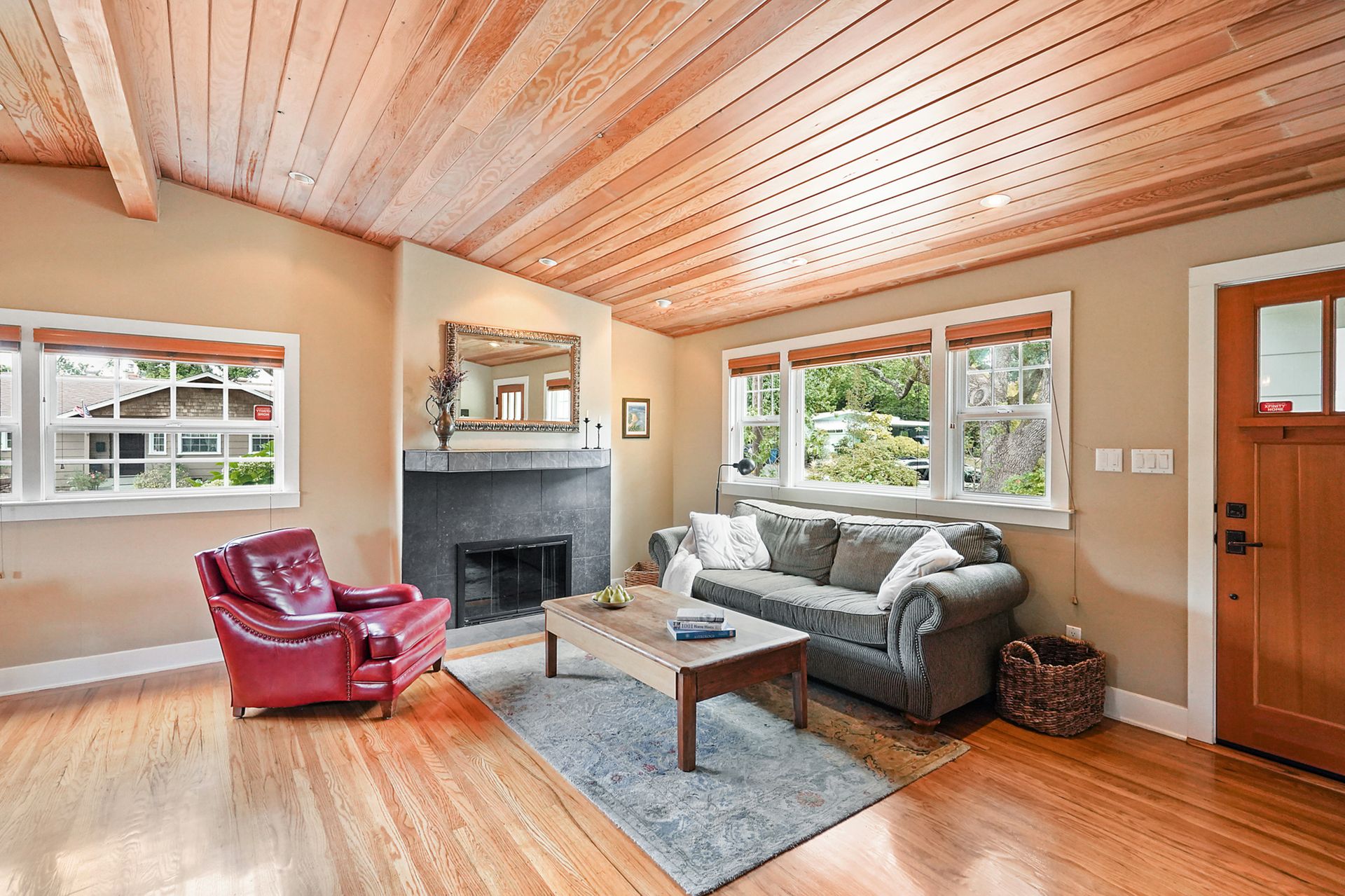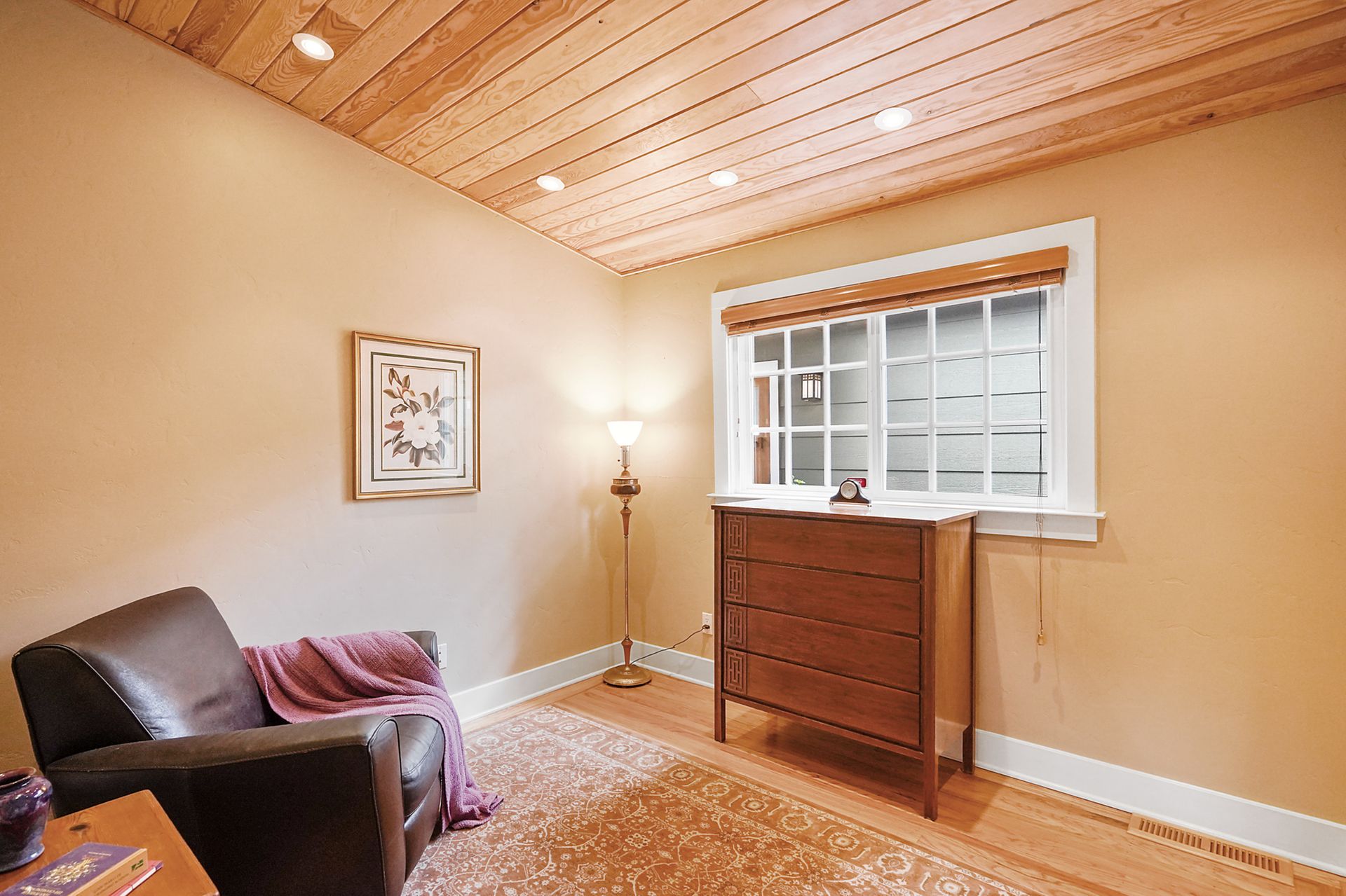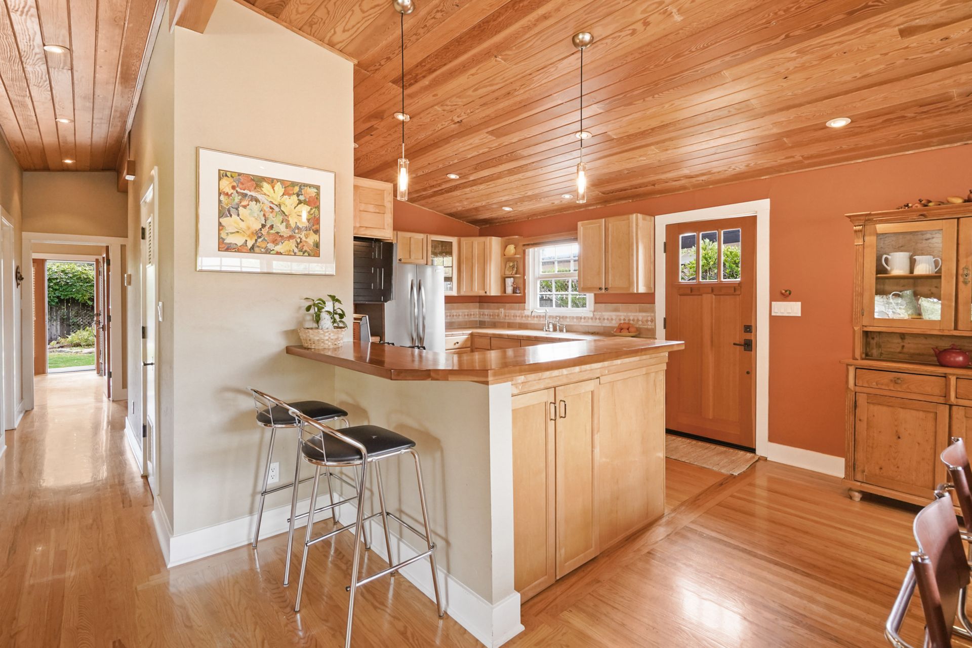 This enchanting home sits on a serene court and has been beautifully updated and maintained. Enter into a spacious yet cozy great room with a fireplace, high ceilings enhanced with natural wood and inset lights. The kitchen has quality wood cabinets, high ceilings and a sitting bar for eating or visiting with the cook. The home has original hardwood floors in the bedrooms, hallway and great room, dual paned windows, central heating and air, as well as an updated electric panel. The private backyard is graced with stately redwoods, a lovely sitting and lawn area, a sunny side area for gardening and a room-sized shed for extra storage or room to play. The detached one-car garage is oversized and incorporates a work bench and sleek built-in cabinets on both sides for organized and accessible storage. Convenient to multiple parks, restaurants and shopping areas. Come see it, this is a truly special property.