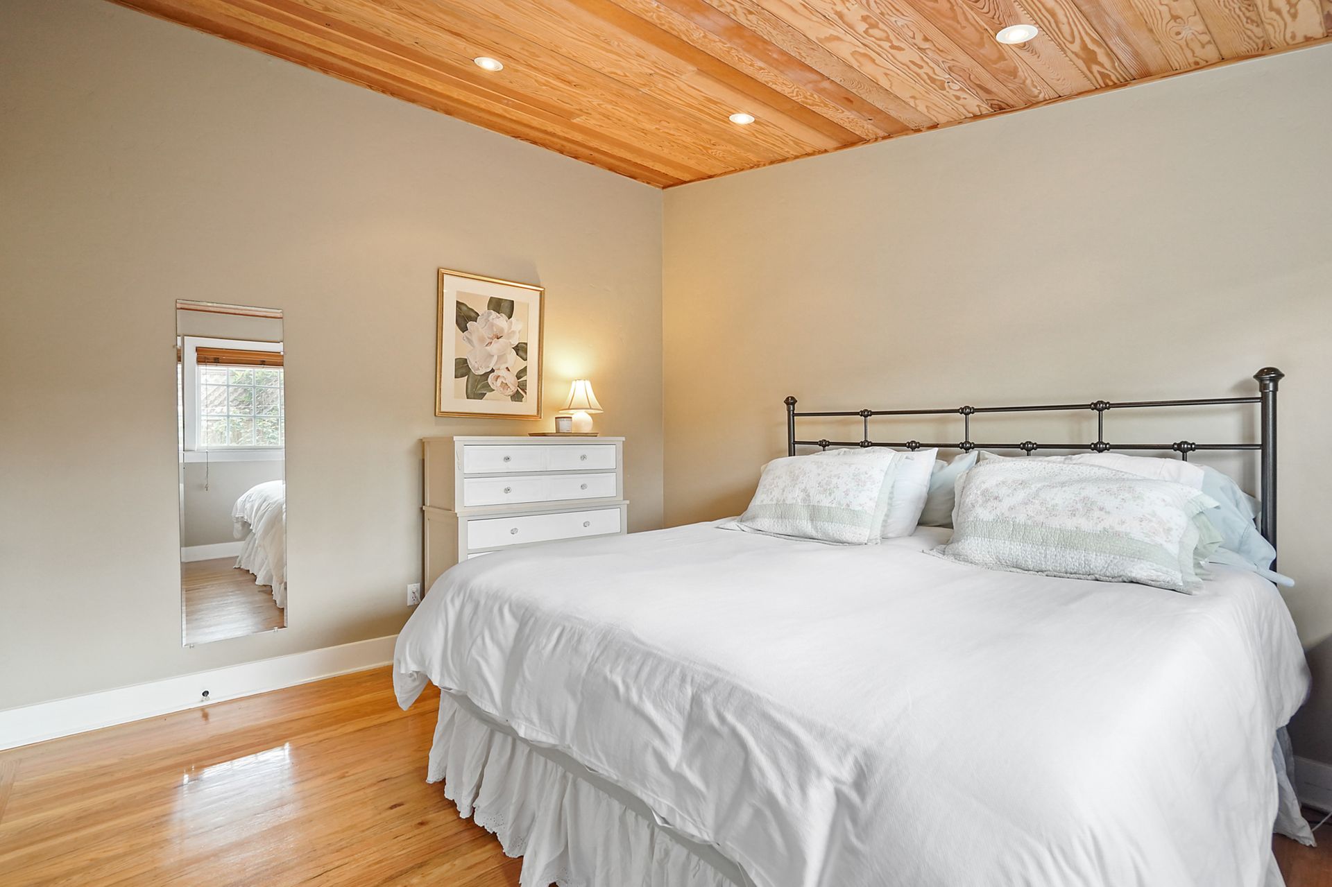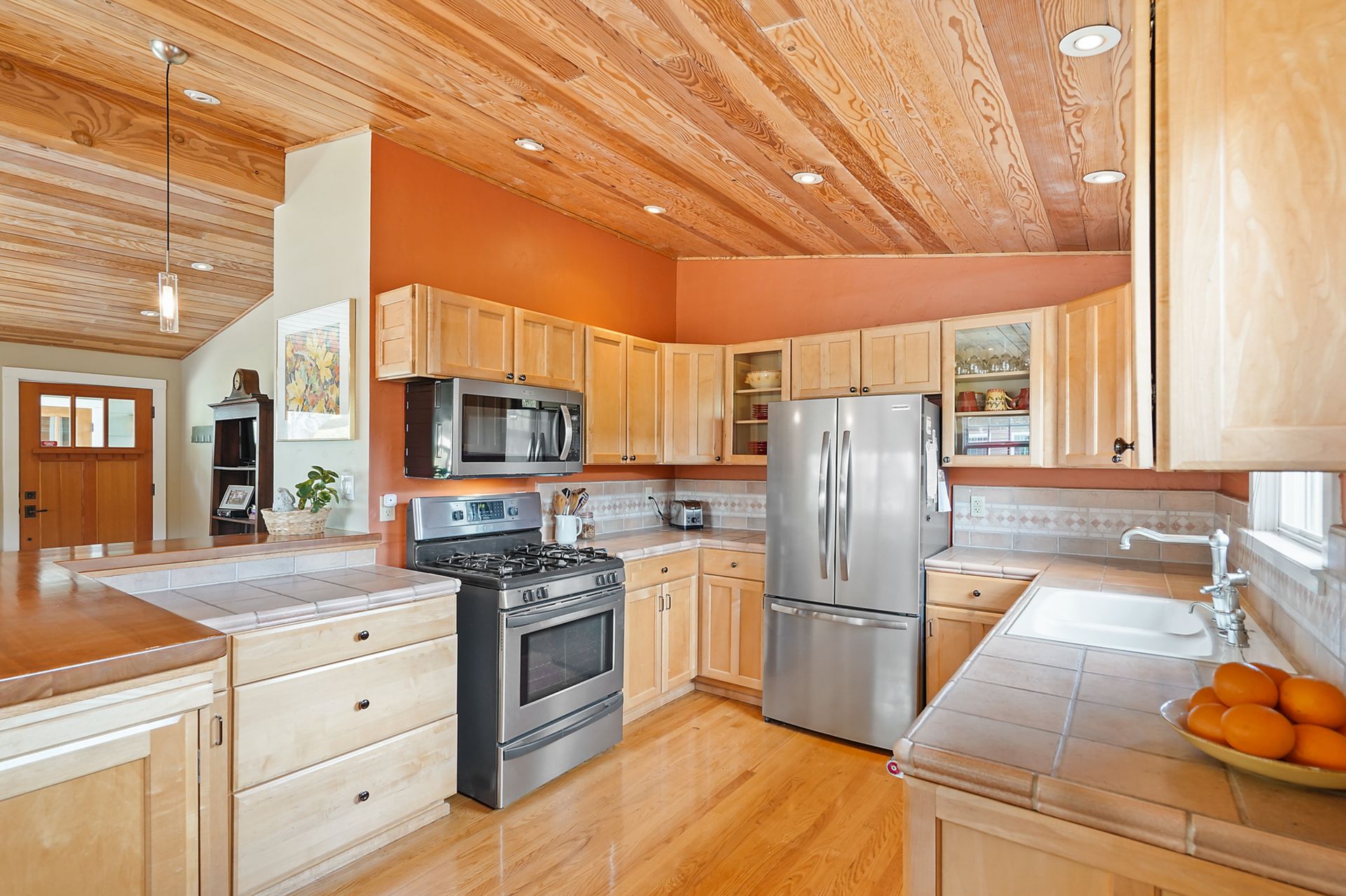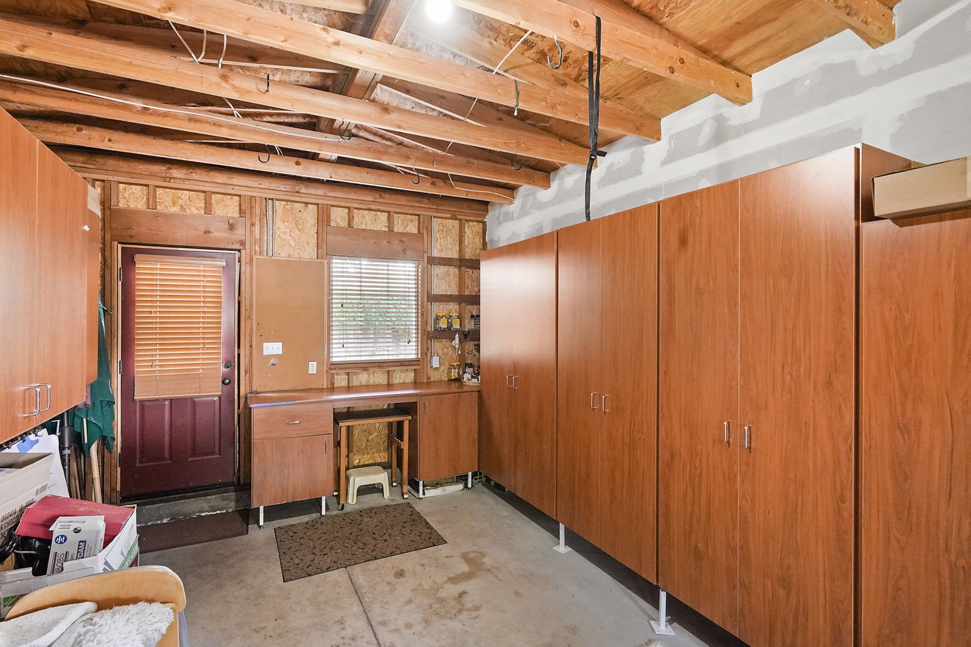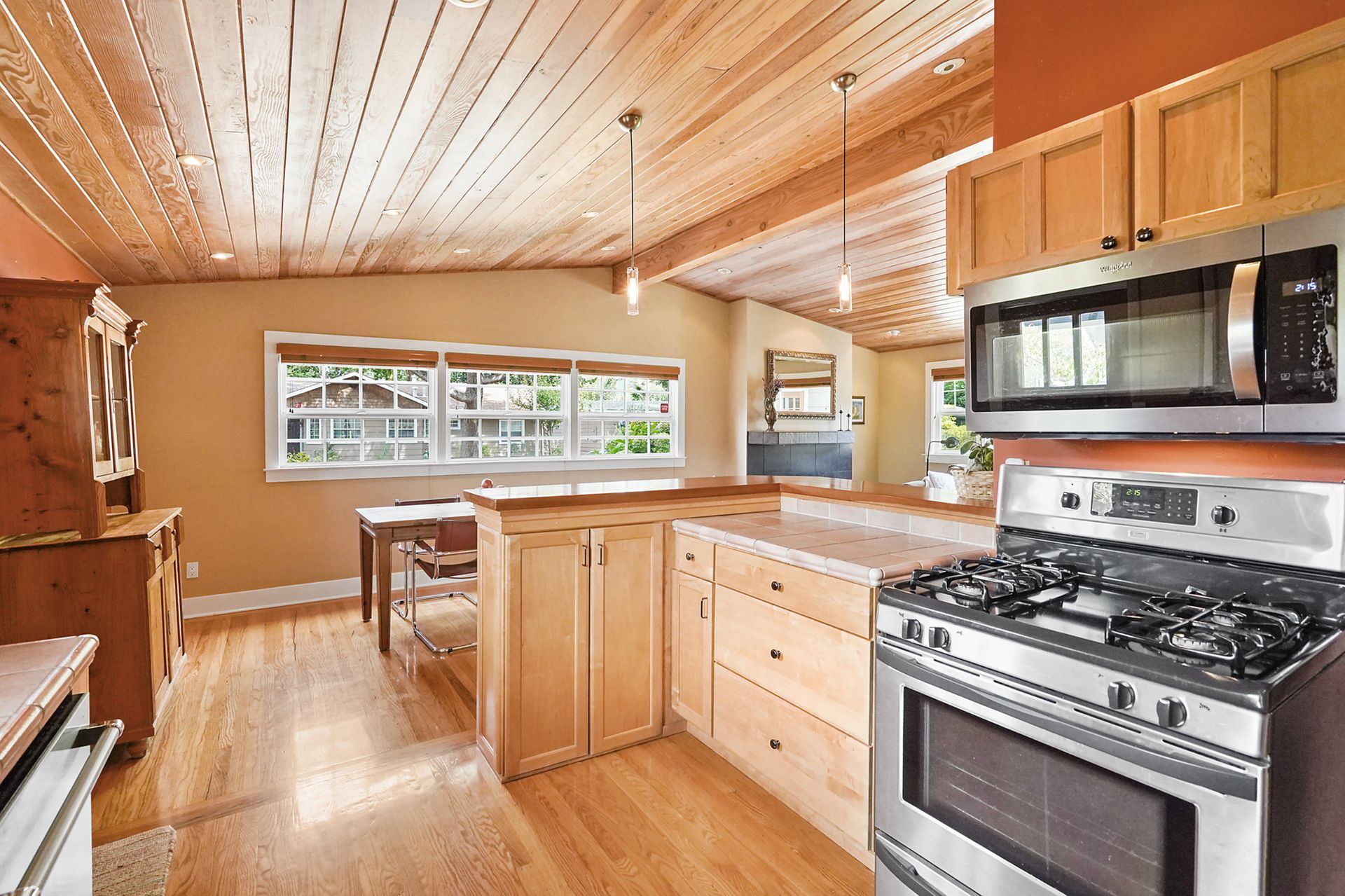 This enchanting home sits on a serene court and has been beautifully updated and maintained. Enter into a spacious yet cozy great room with a fireplace, high ceilings enhanced with natural wood and inset lights. The kitchen has quality wood cabinets, high ceilings and a sitting bar for eating or visiting with the cook. The home has original hardwood floors in the bedrooms, hallway and great room, dual paned windows, central heating and air, as well as an updated electric panel. The private backyard is graced with stately redwoods, a lovely sitting and lawn area, a sunny side area for gardening and a room-sized shed for extra storage or room to play. The detached one-car garage is oversized and incorporates a work bench and sleek built-in cabinets on both sides for organized and accessible storage. Convenient to multiple parks, restaurants and shopping areas. Come see it, this is a truly special property.