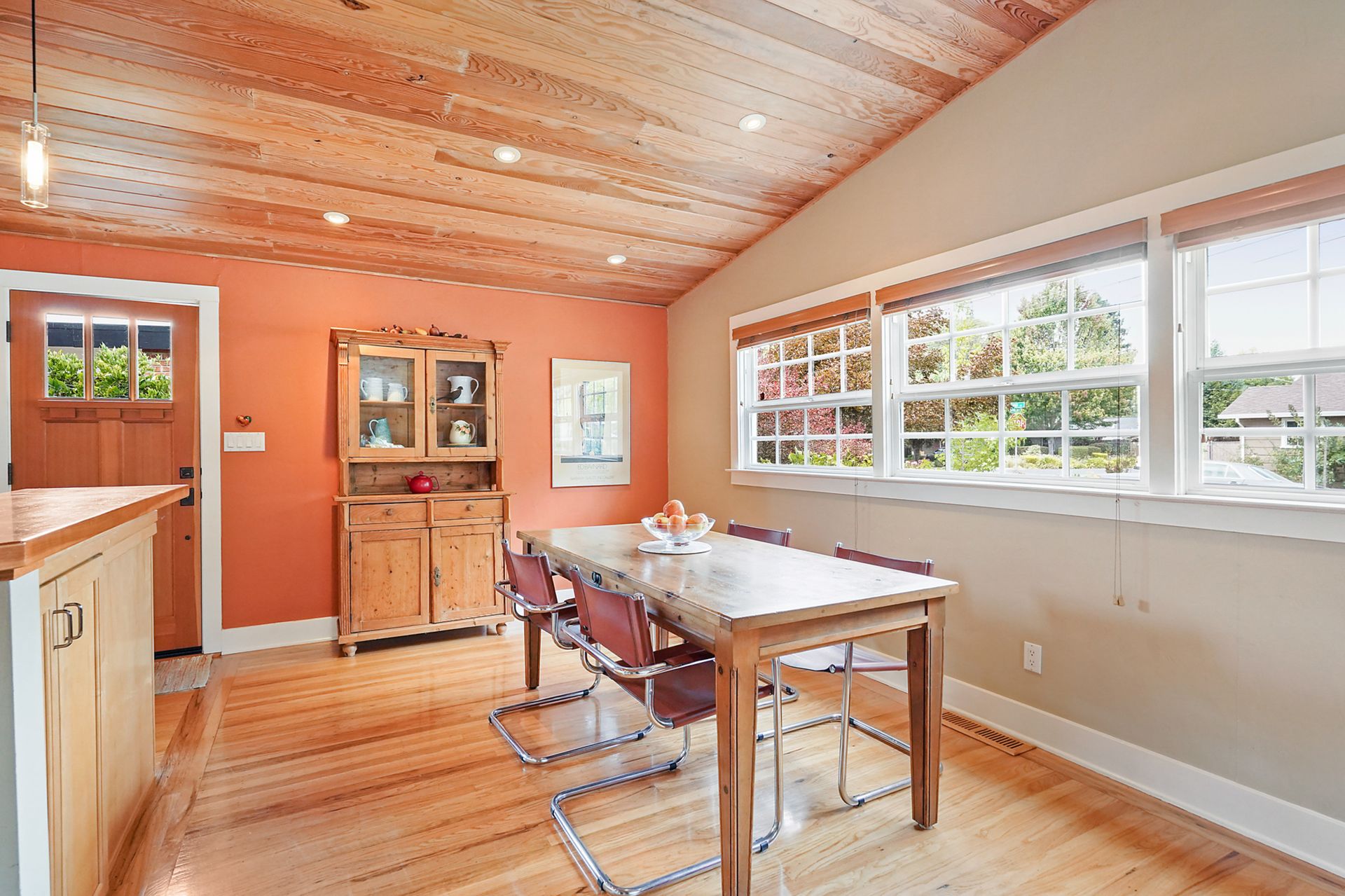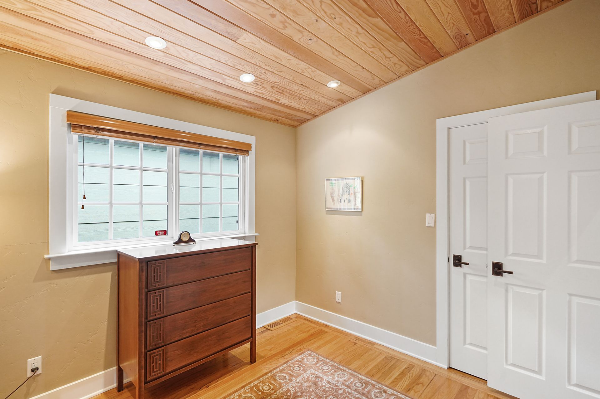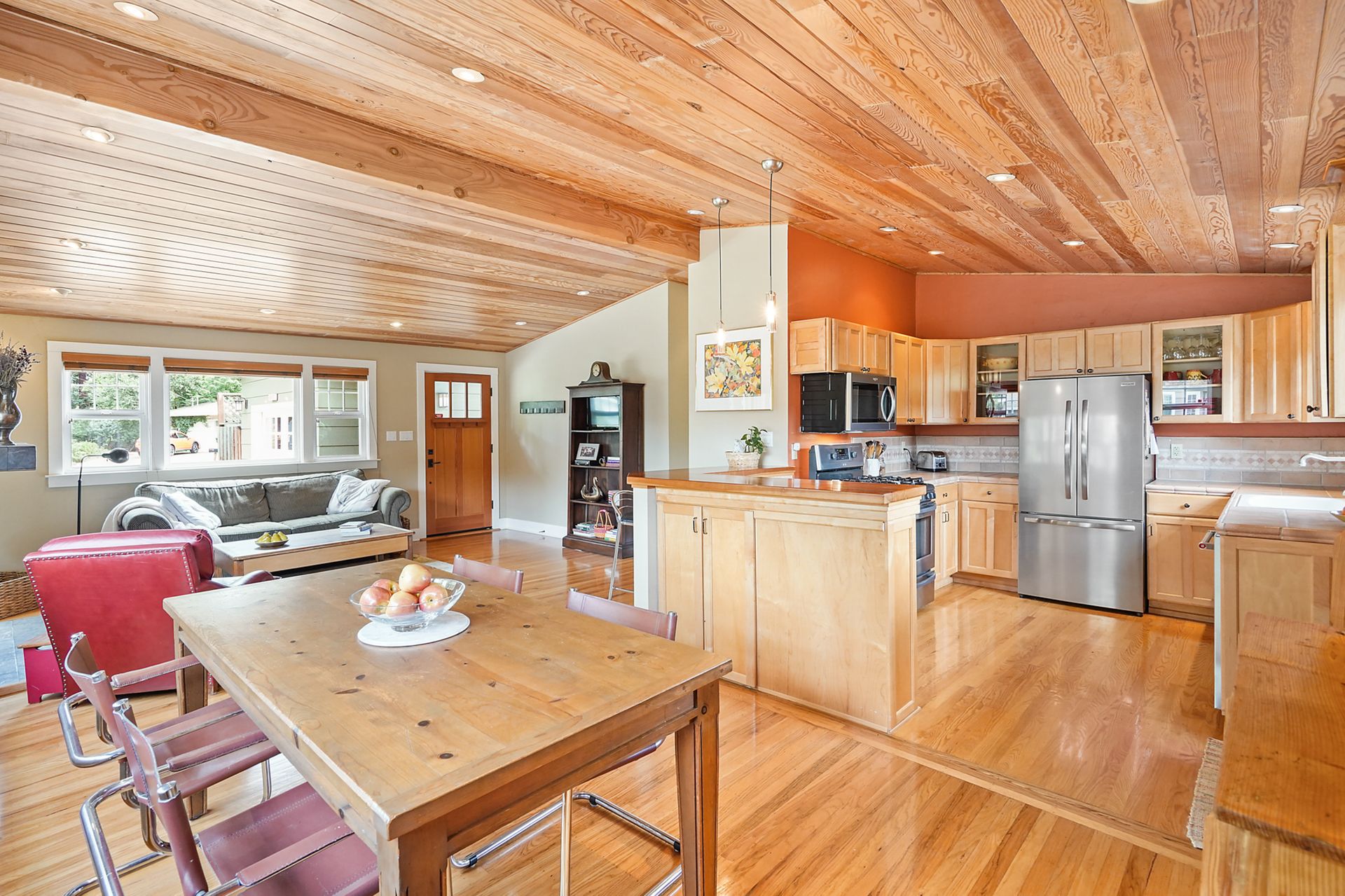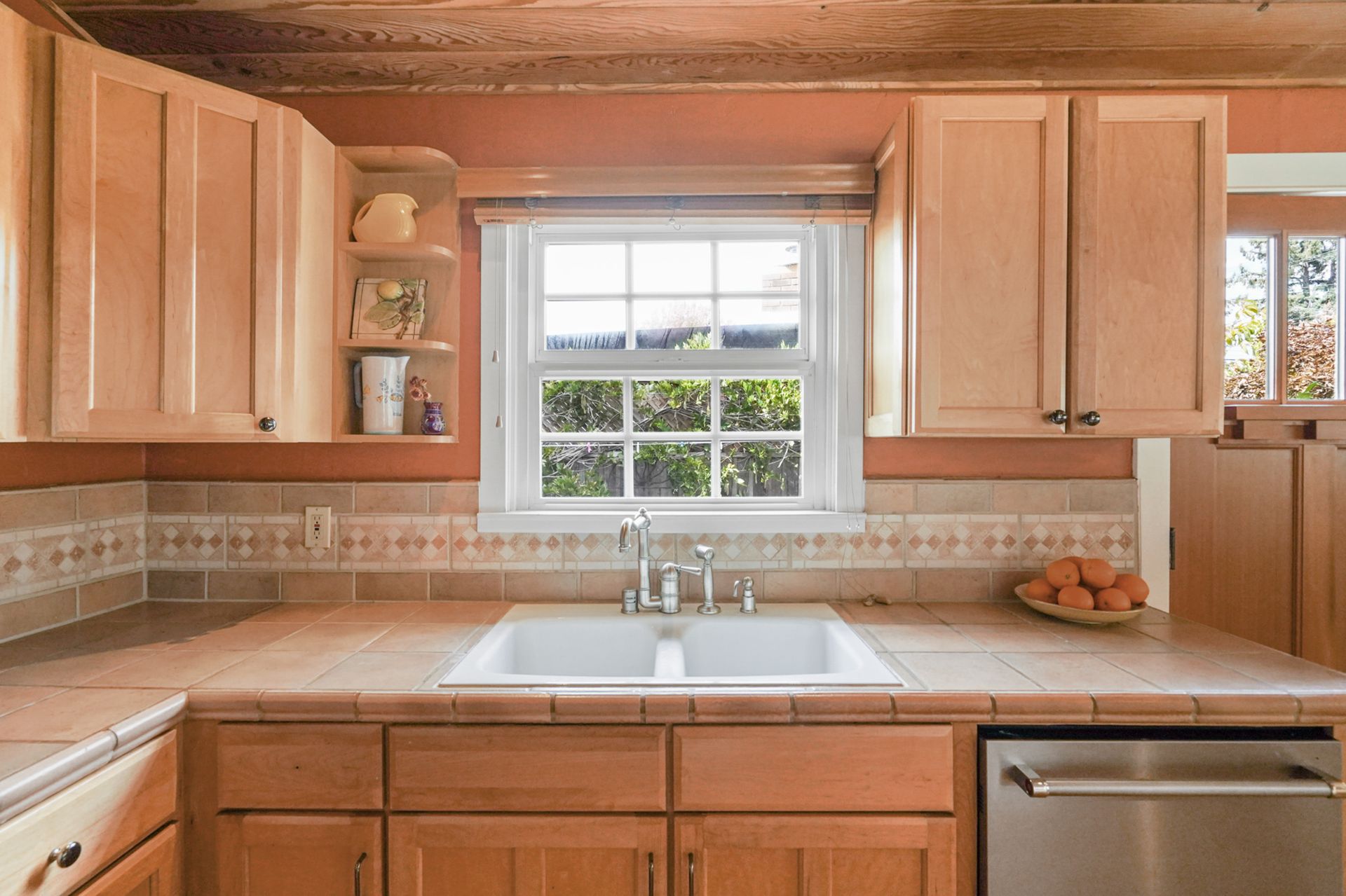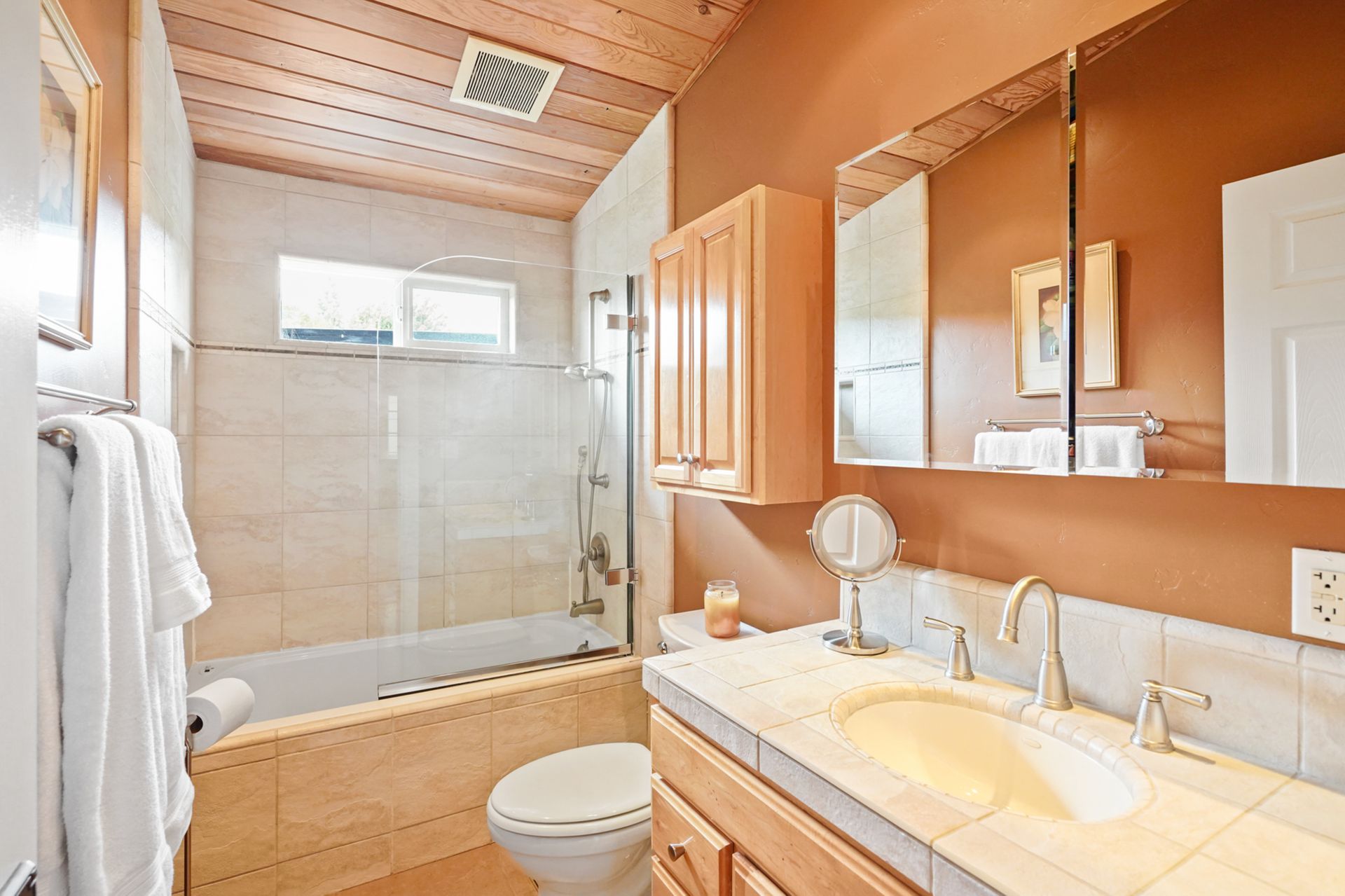 This enchanting home sits on a serene court and has been beautifully updated and maintained. Enter into a spacious yet cozy great room with a fireplace, high ceilings enhanced with natural wood and inset lights. The kitchen has quality wood cabinets, high ceilings and a sitting bar for eating or visiting with the cook. The home has original hardwood floors in the bedrooms, hallway and great room, dual paned windows, central heating and air, as well as an updated electric panel. The private backyard is graced with stately redwoods, a lovely sitting and lawn area, a sunny side area for gardening and a room-sized shed for extra storage or room to play. The detached one-car garage is oversized and incorporates a work bench and sleek built-in cabinets on both sides for organized and accessible storage. Convenient to multiple parks, restaurants and shopping areas. Come see it, this is a truly special property.